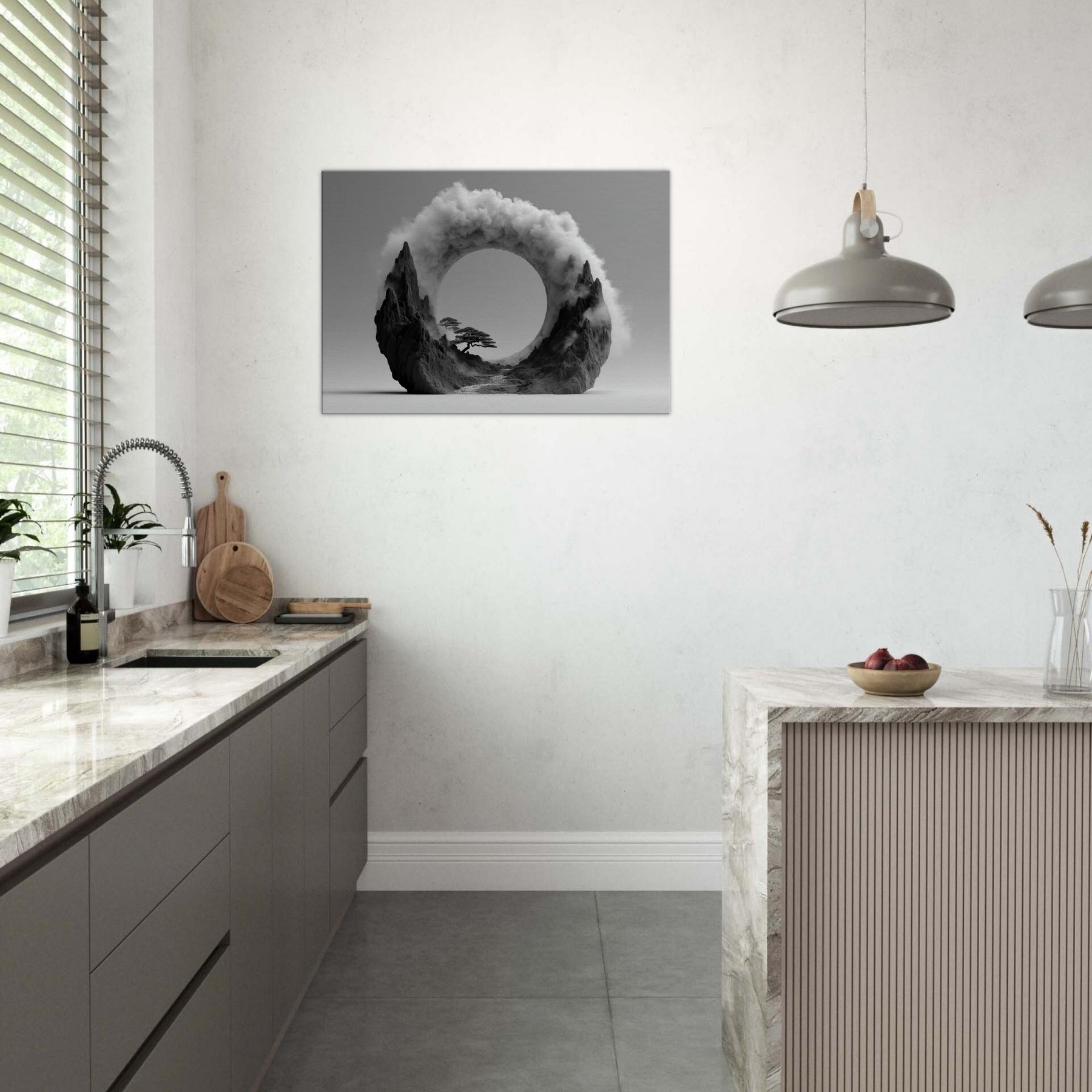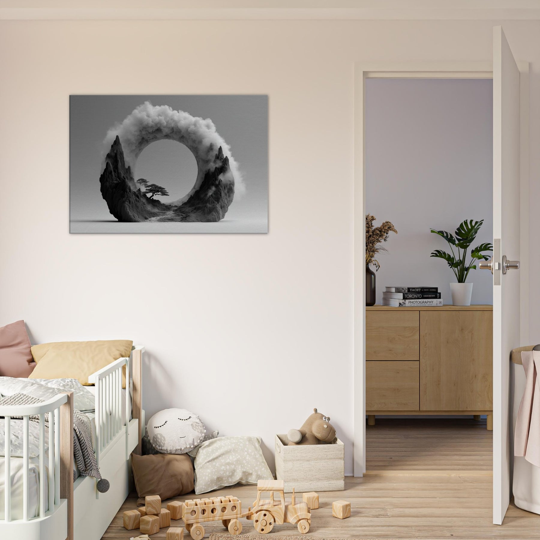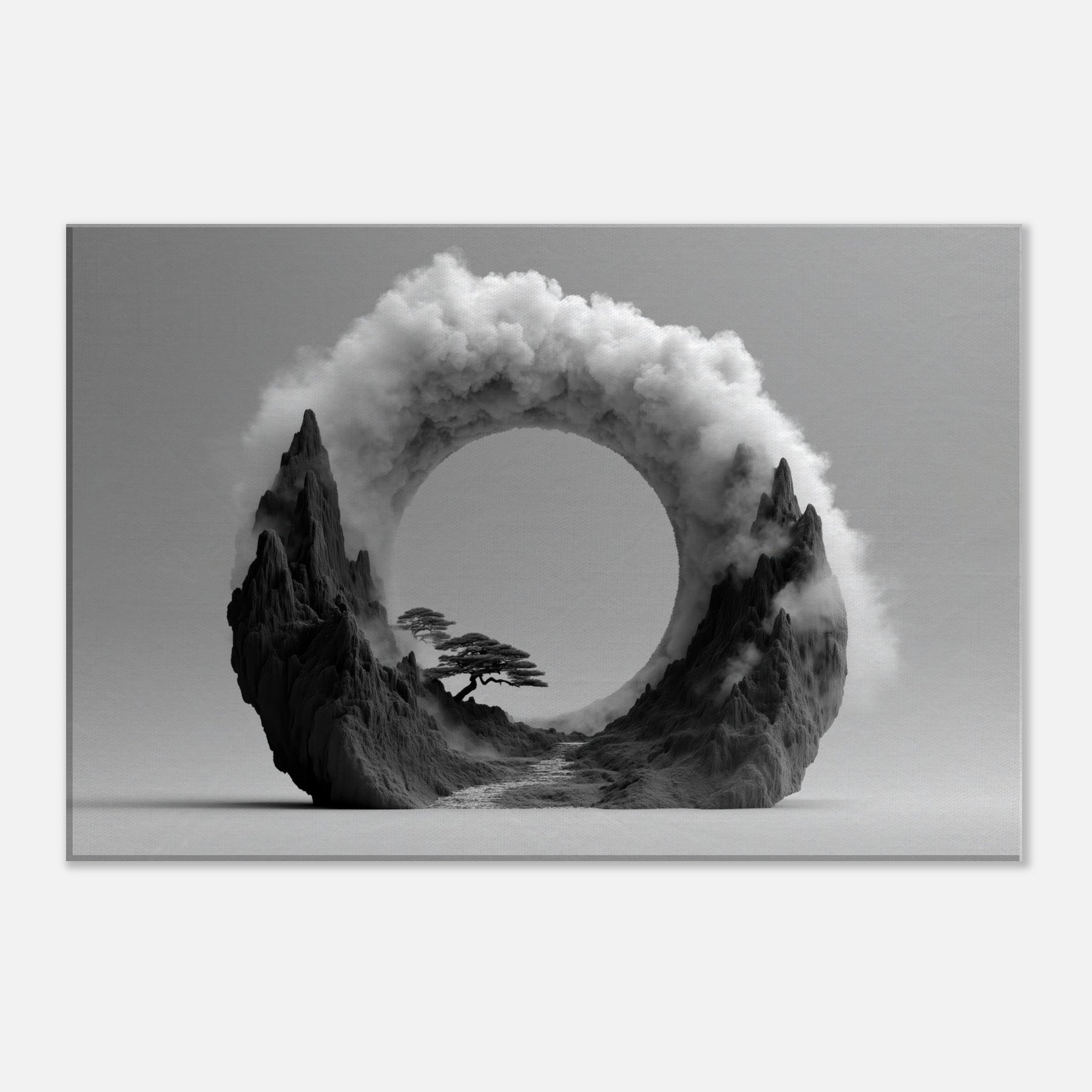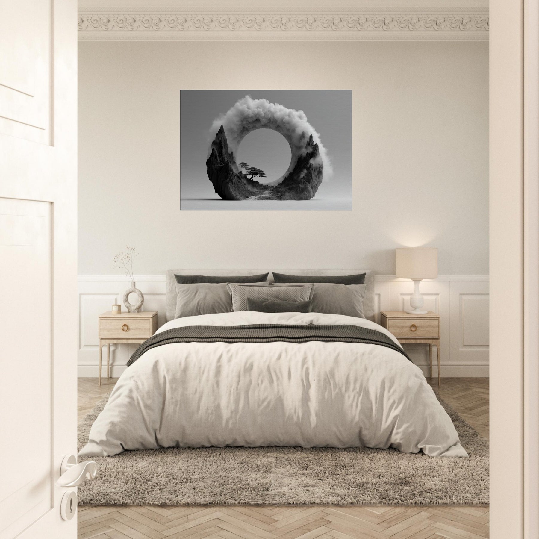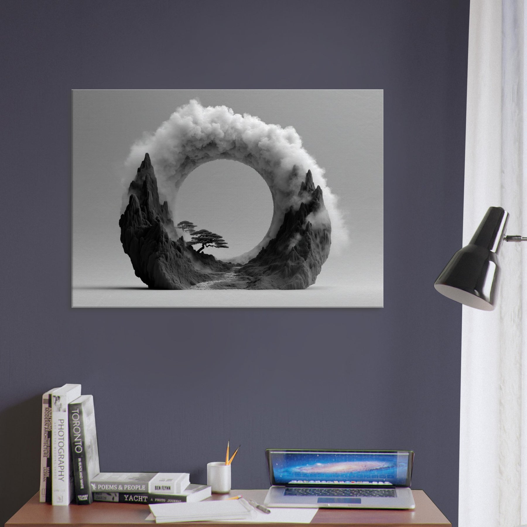 An otherworldly Ensō (Zen Circle) unfolds as a moonlit ring carved from cloud and rock, where surreal mountains cradle a solitary pine along a whispered path. This mystical scene invites stillness into the room, turning walls into a window of contemplation. The monochrome contrast and silken gradations evoke ancient ink landscapes reimagined for modern living, making it a meditative focal point that nourishes calm, balance, and quiet conversation in any space.