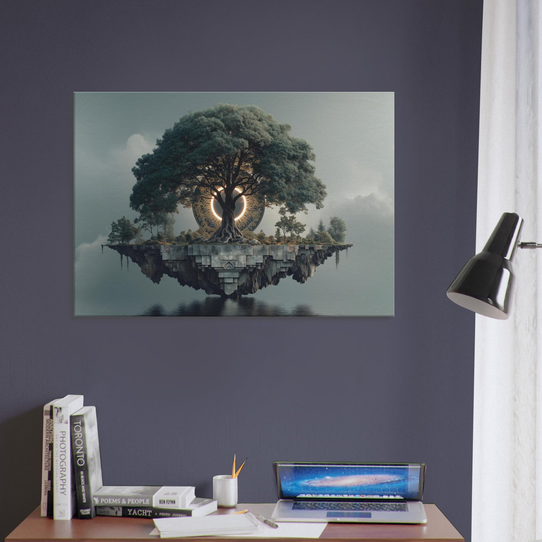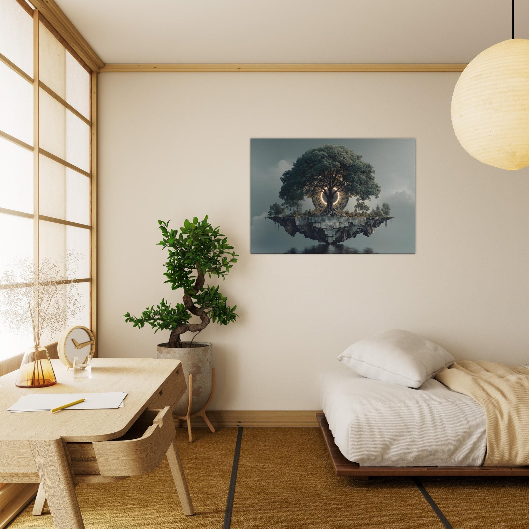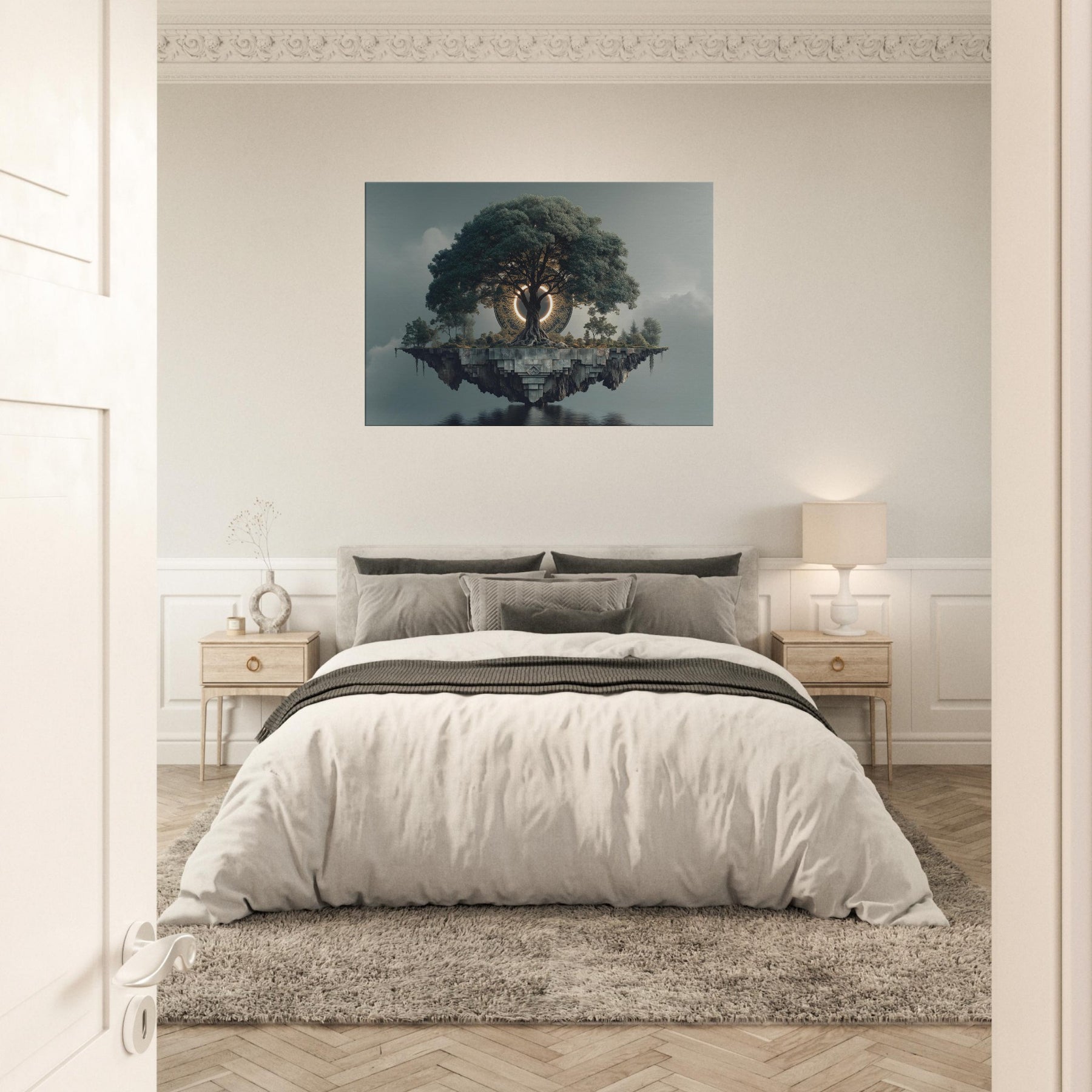 An ambient ode to renewal, this surreal composition centers on a majestic Tree of Life perched upon a floating island. A radiant circle of light frames the roots, lending a quiet, lunar glow to the scene. Mist, moss, and distant trees ripple in a dreamlike breeze, inviting contemplation and calm. Hang it in a living room or study to soften hard corners with mythic presence, turning walls into a doorway to another realm of memory and breath.