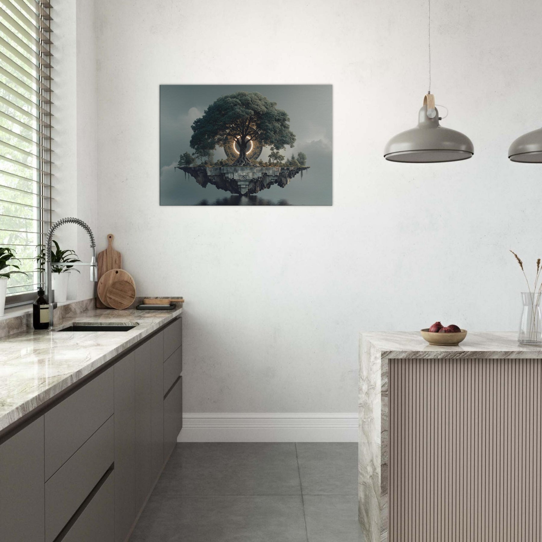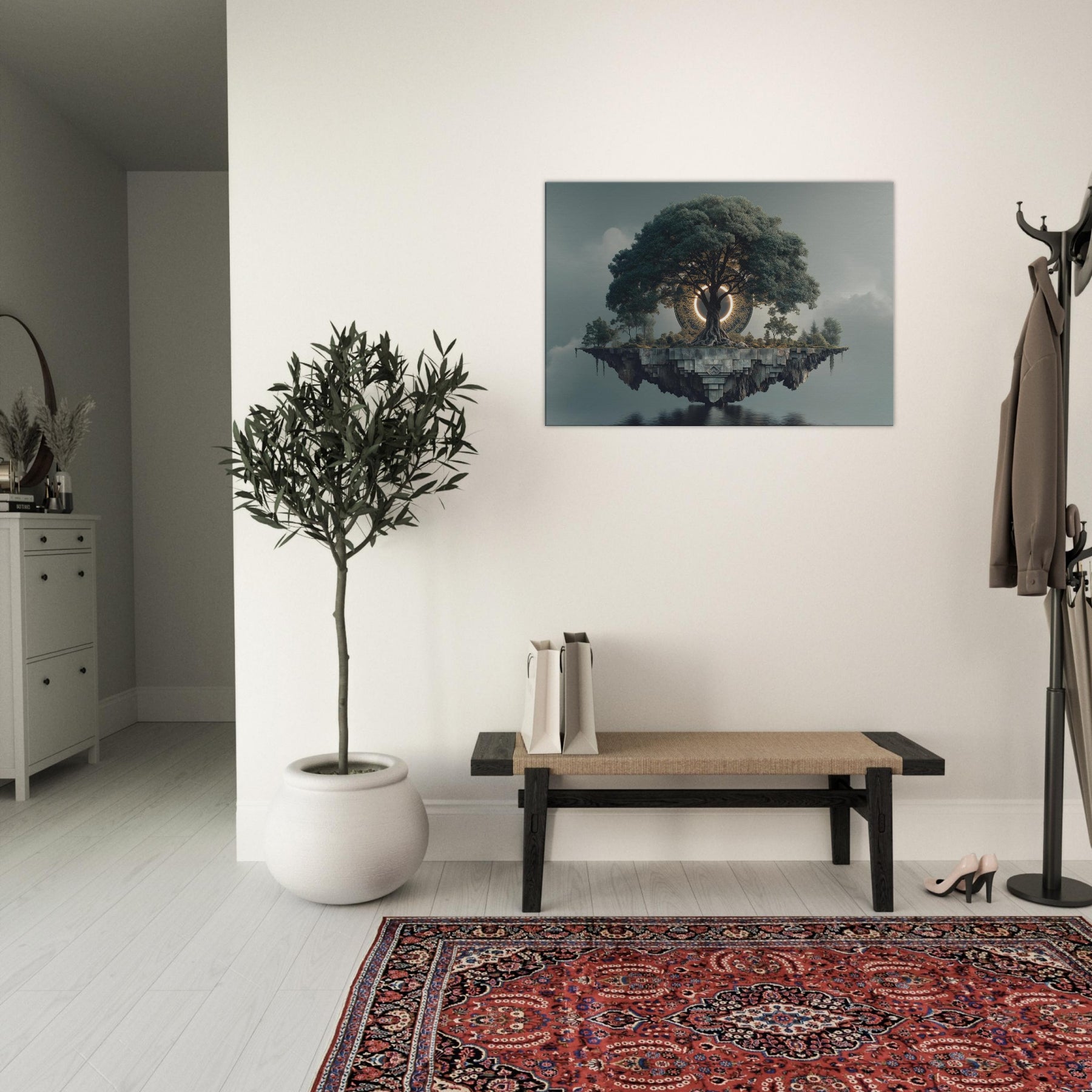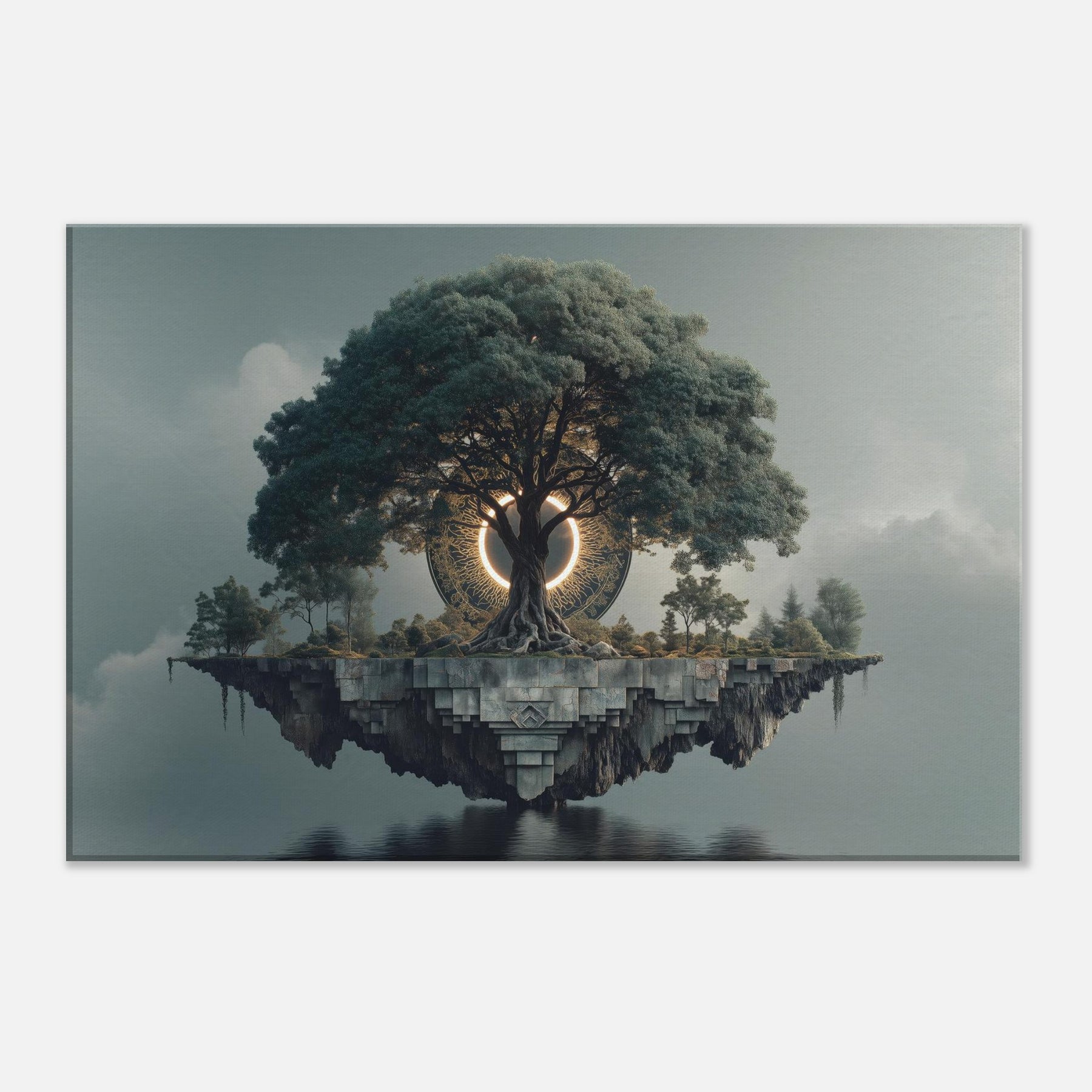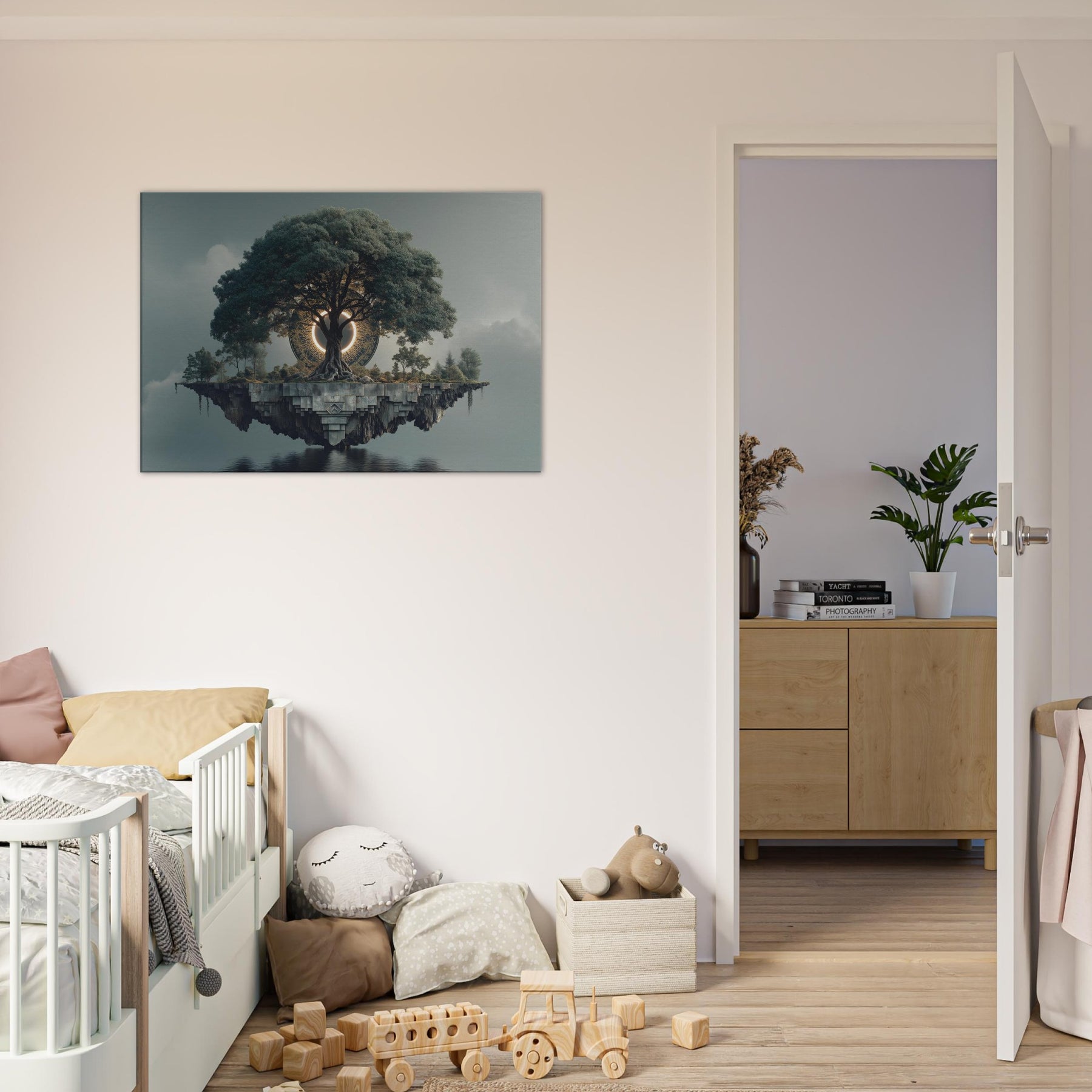 An ambient ode to renewal, this surreal composition centers on a majestic Tree of Life perched upon a floating island. A radiant circle of light frames the roots, lending a quiet, lunar glow to the scene. Mist, moss, and distant trees ripple in a dreamlike breeze, inviting contemplation and calm. Hang it in a living room or study to soften hard corners with mythic presence, turning walls into a doorway to another realm of memory and breath.