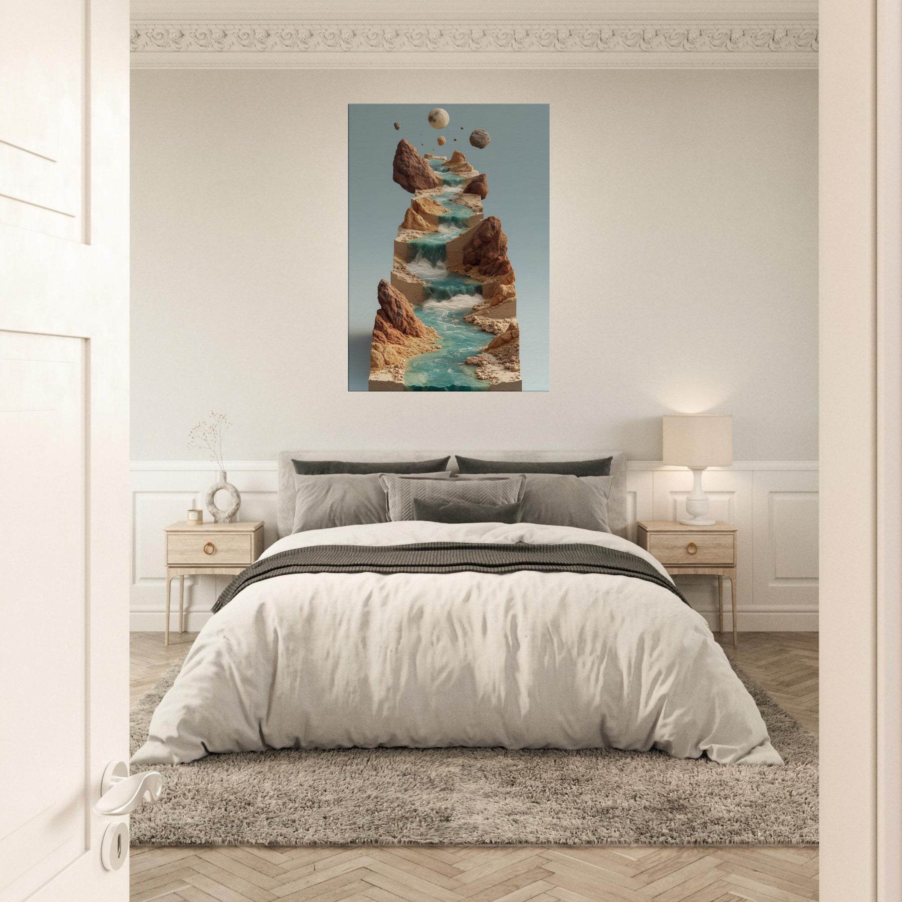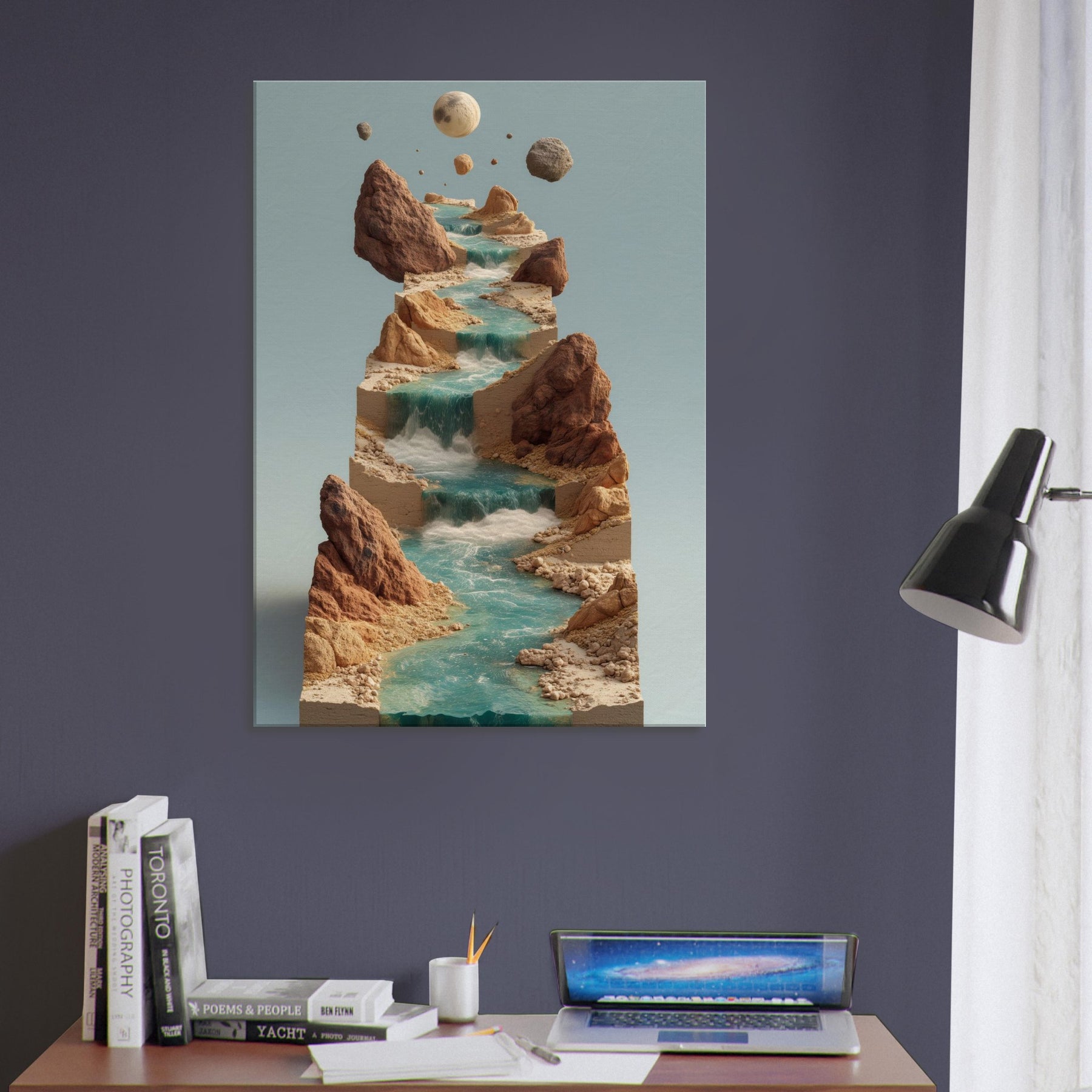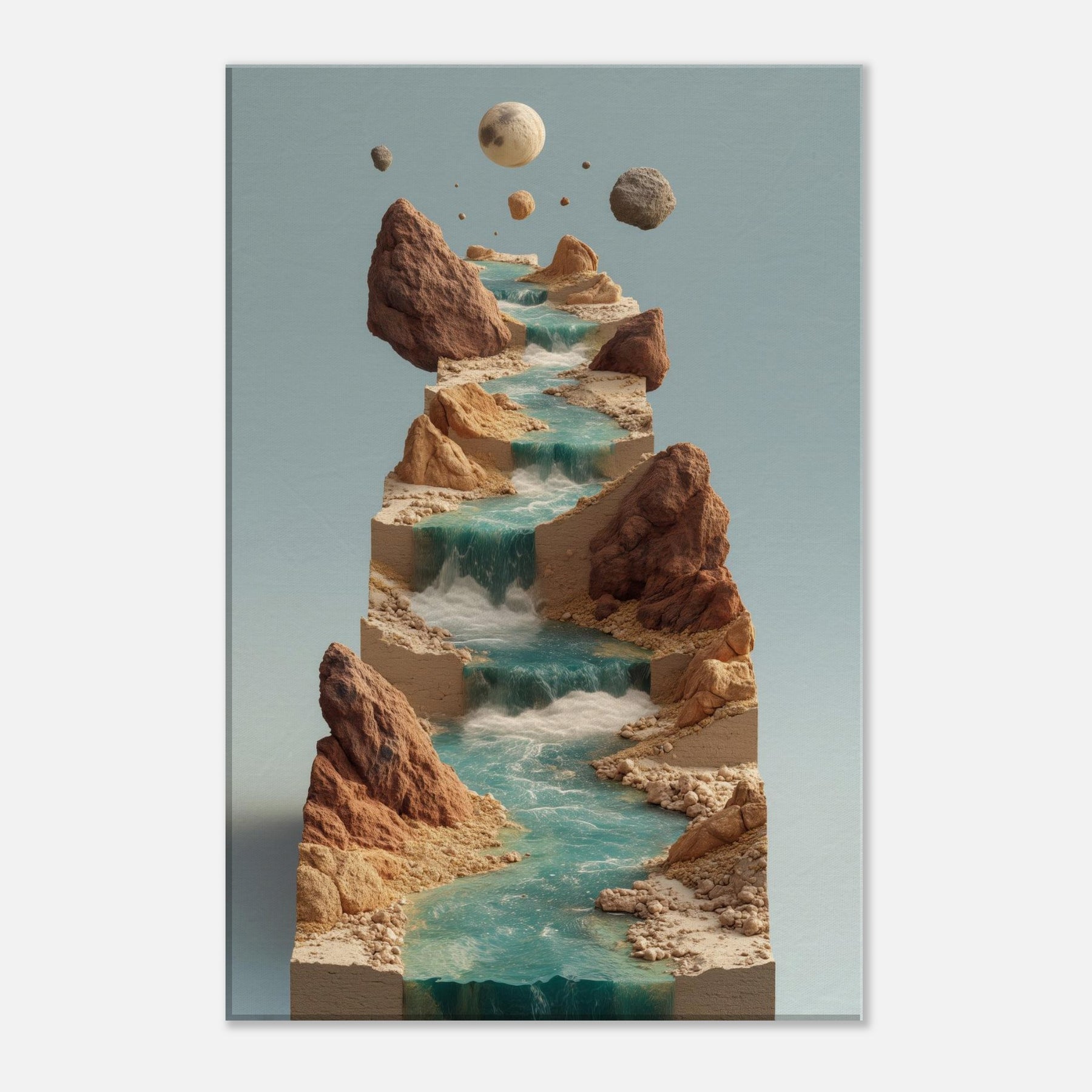 An otherworldly vision of the River, this piece threads a surreal cascade of water across stacked, earthen terraces. Turquoise streams tumble over sculpted stone, while jagged cliffs hold quiet moons in the air creating a contemplative balance between earth and sky. The atmosphere is serene yet alive, a cool breath of mist, sun warmed rock, and distant thunder of unseen tides. In a living space, it invites slow gaze, transforming walls into a window of dreamlike motion and a sanctuary for imagination.