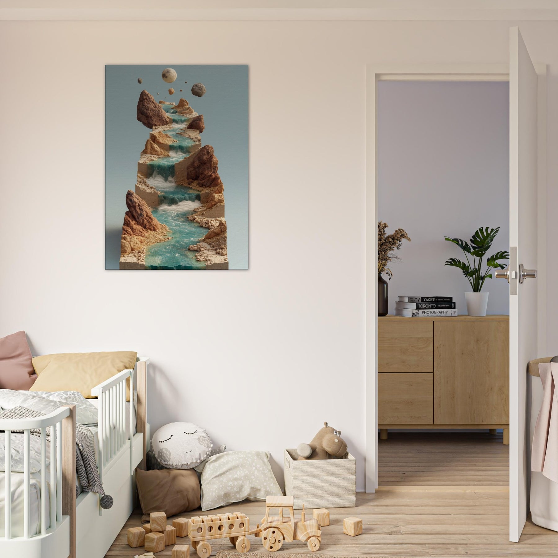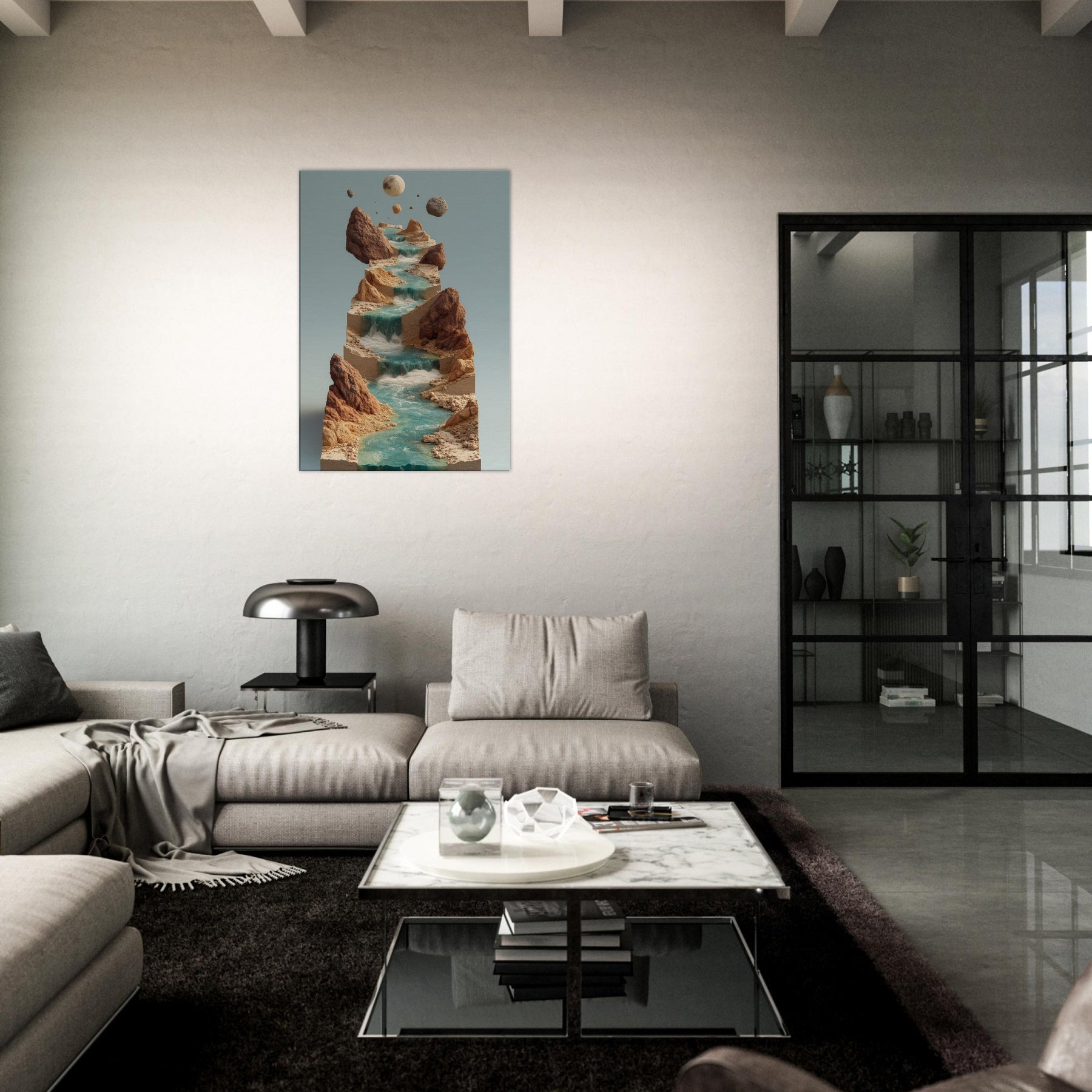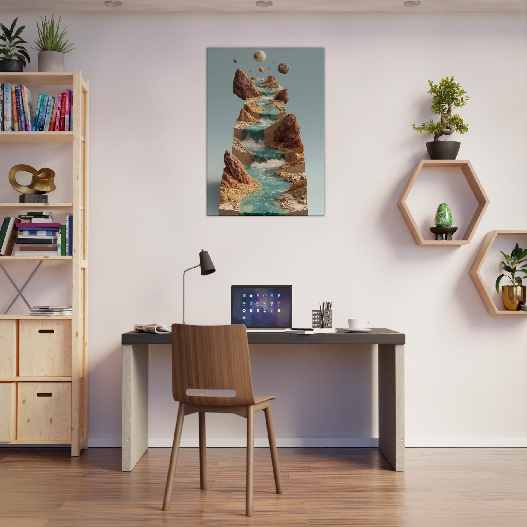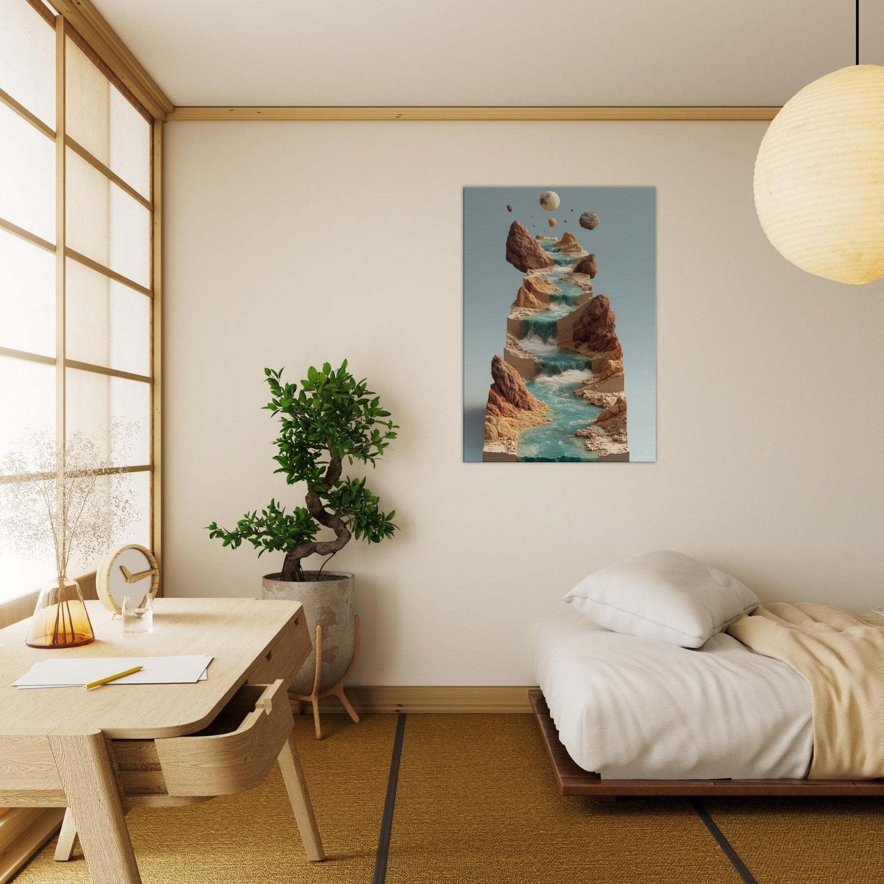 An otherworldly vision of the River, this piece threads a surreal cascade of water across stacked, earthen terraces. Turquoise streams tumble over sculpted stone, while jagged cliffs hold quiet moons in the air creating a contemplative balance between earth and sky. The atmosphere is serene yet alive, a cool breath of mist, sun warmed rock, and distant thunder of unseen tides. In a living space, it invites slow gaze, transforming walls into a window of dreamlike motion and a sanctuary for imagination.