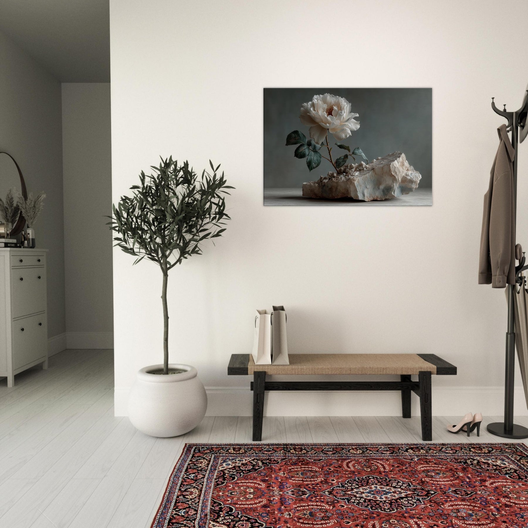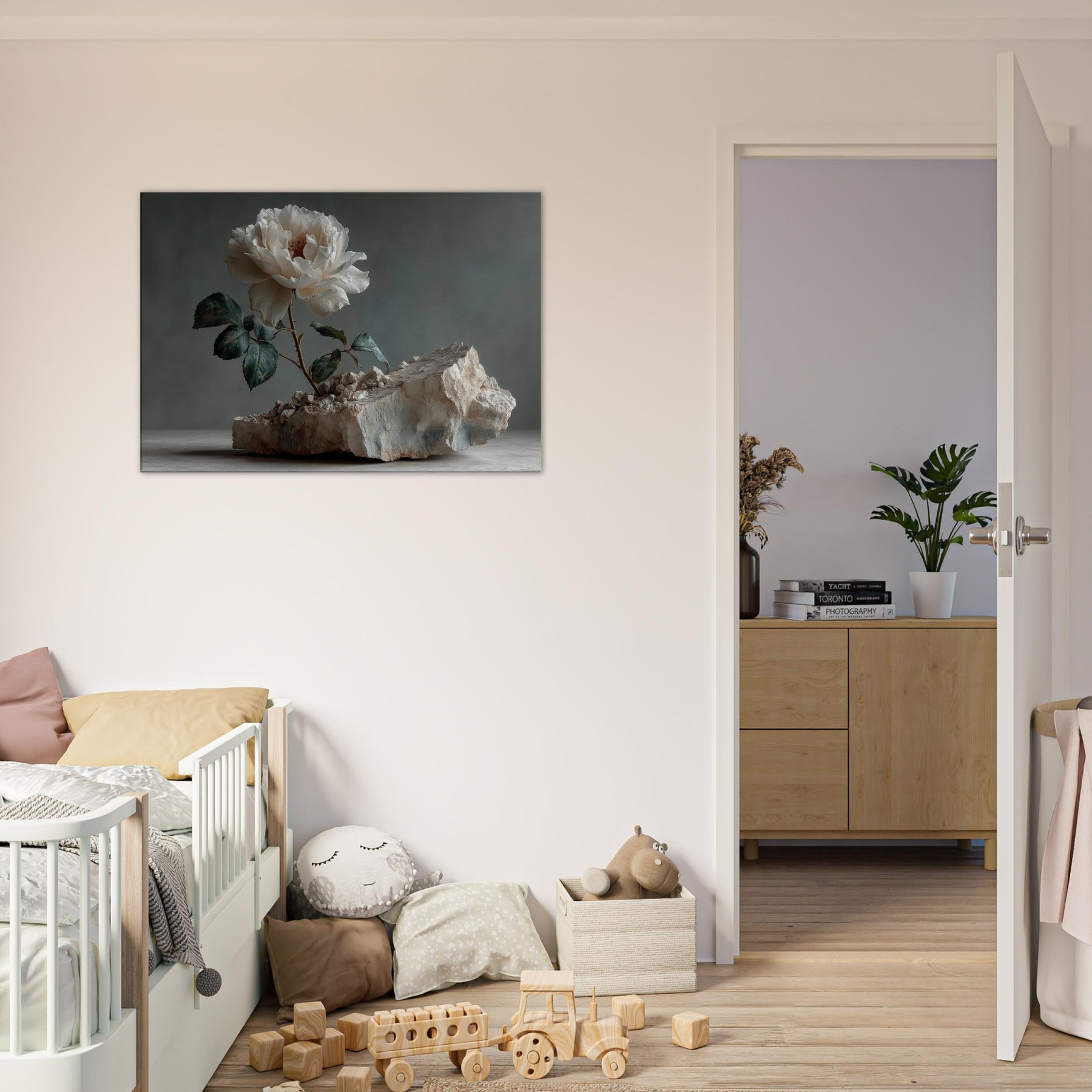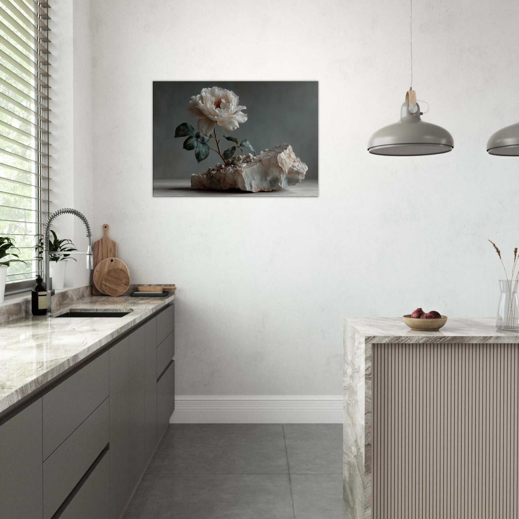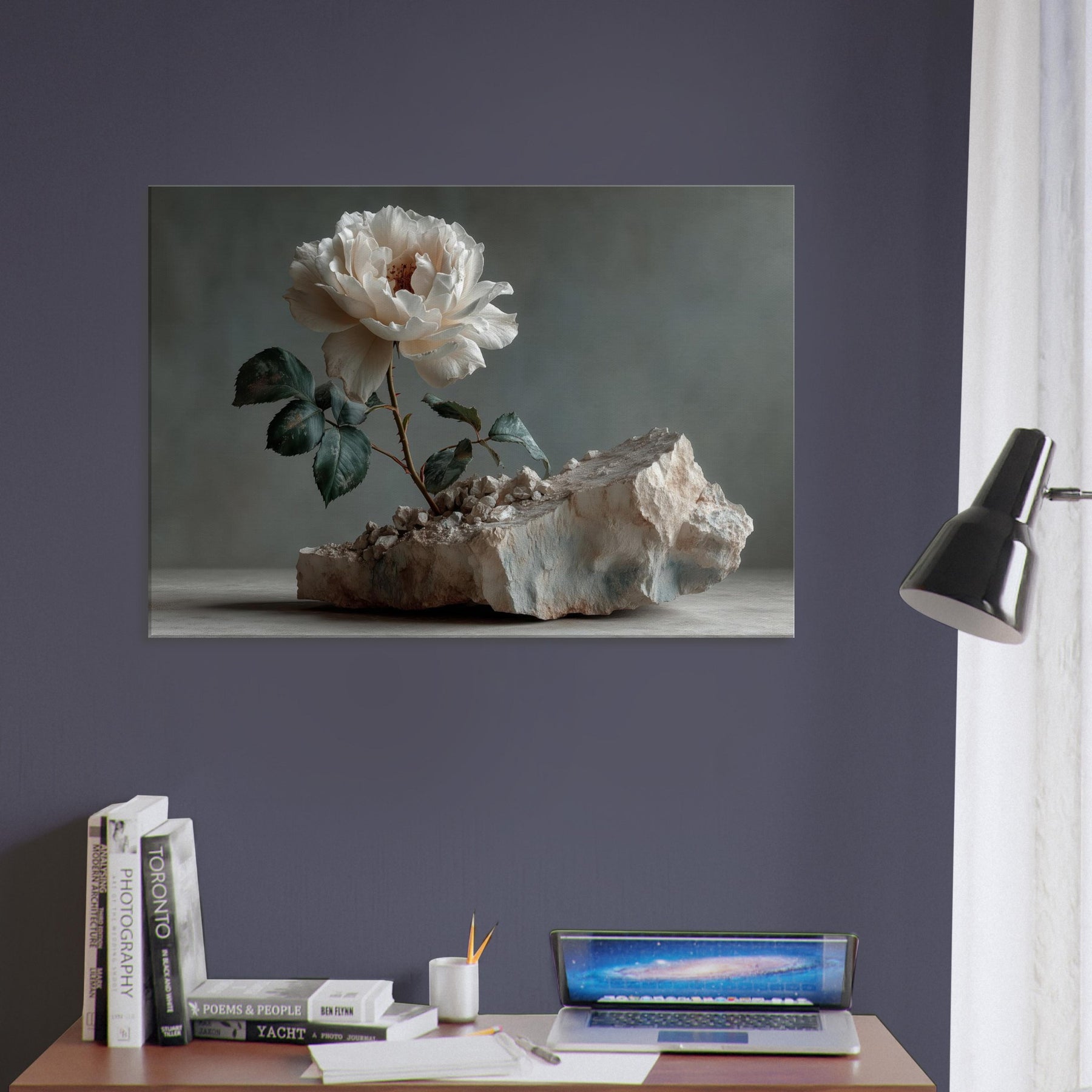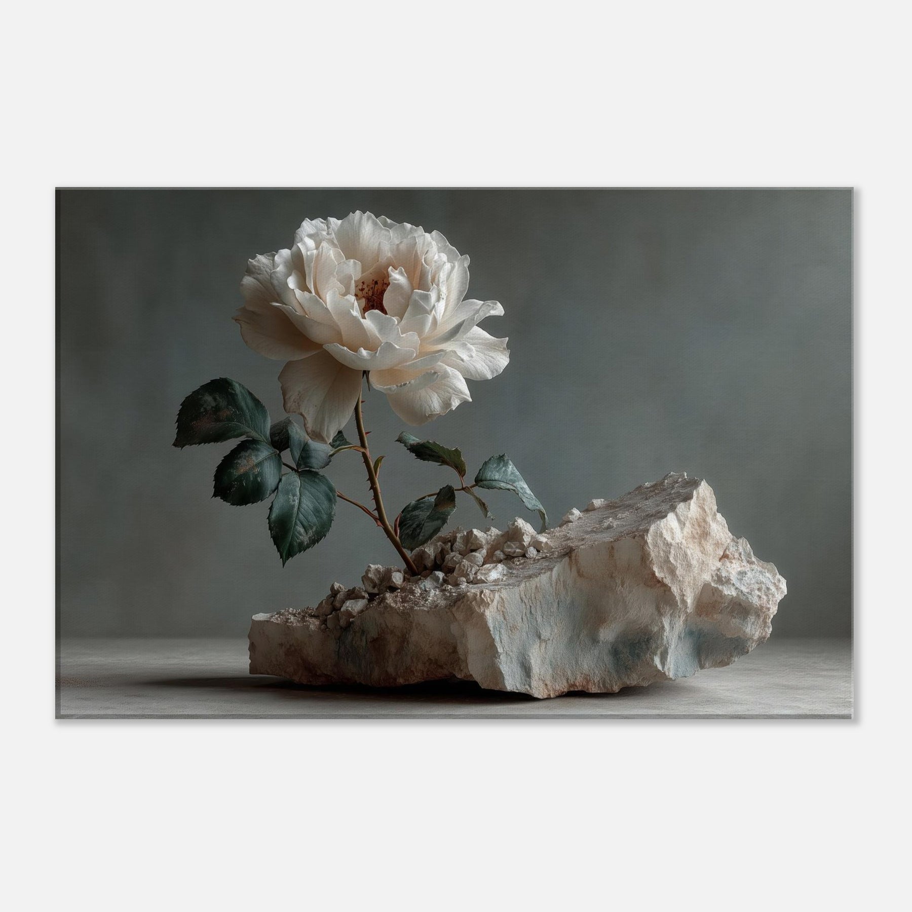 Rose Emerges from Silent Stone invites the eye to linger at the threshold between fragility and resilience. In this surreal still life, a pristine white Rose unfurls from fractured rock, its petals catching light with quiet radiance. The moody backdrop and the tactile texture of stone intensify the sense of a dream breaking into the ordinary, turning a wall into a window of contemplation. Hang it to soften a living room, spark conversation, and remind your space that beauty can bloom from rough, uneven ground.
