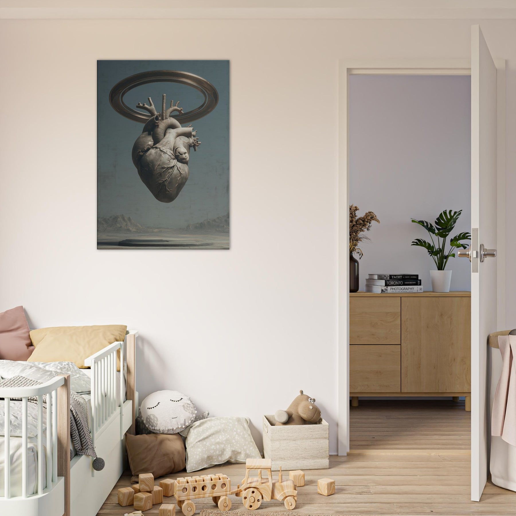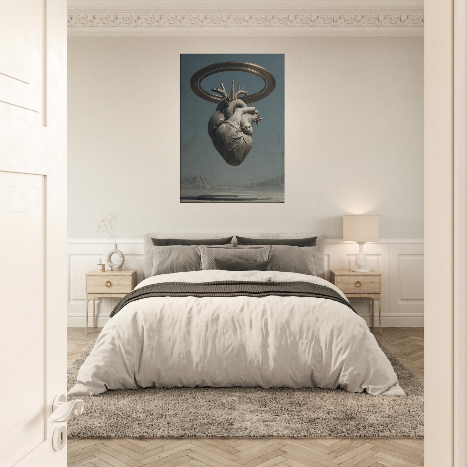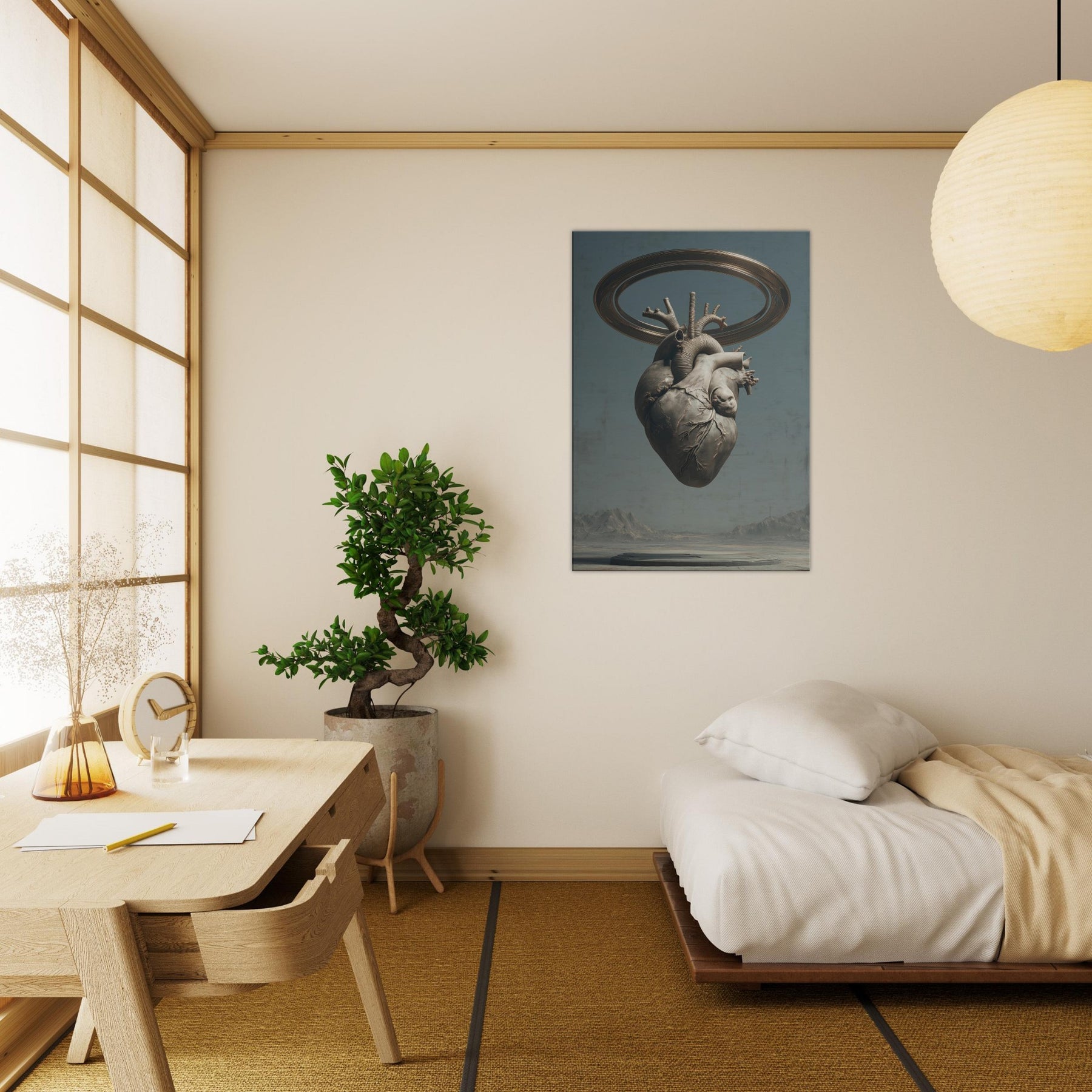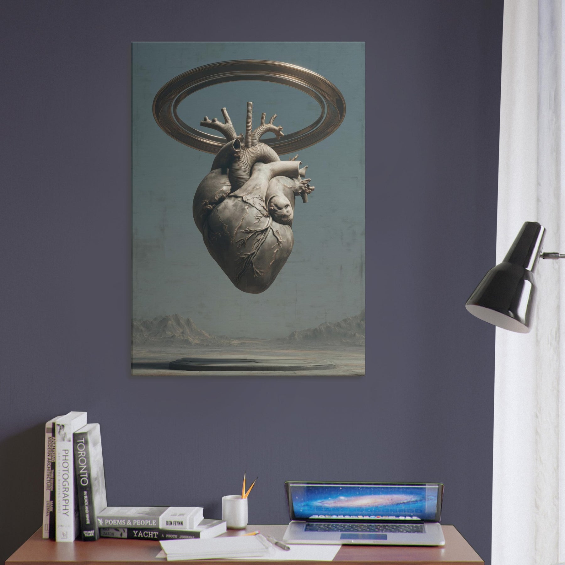 Let the Sacred Heart suspended within a ring of orbiting metal become the quiet heartbeat of your space. This surreal, mystical composition blends anatomical detail with celestial suspension, as if time itself hangs in midair. Bronze tones mingle with a soft, misty backdrop, inviting slow, contemplative moments and a tactile sense of calm. Perfect above a sofa or in a reading corner, it creates a ritual hush, elevating a room with romance, mystery, and refined, modern poetry.