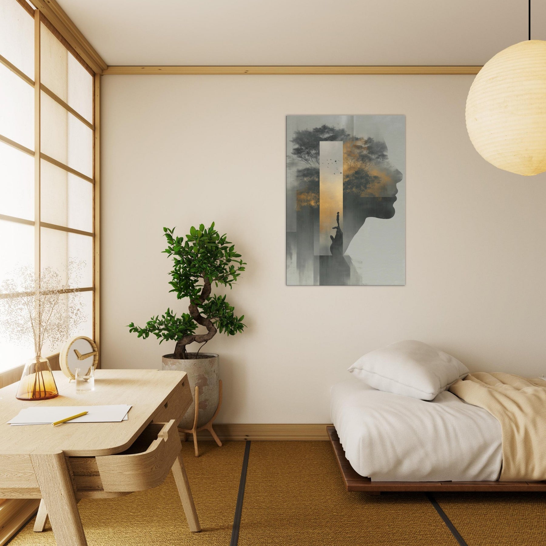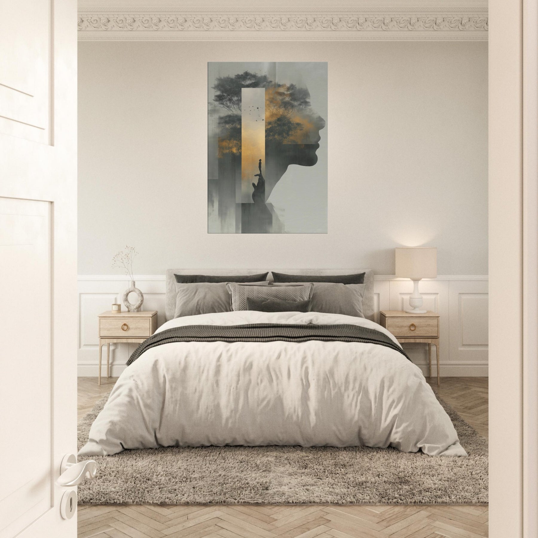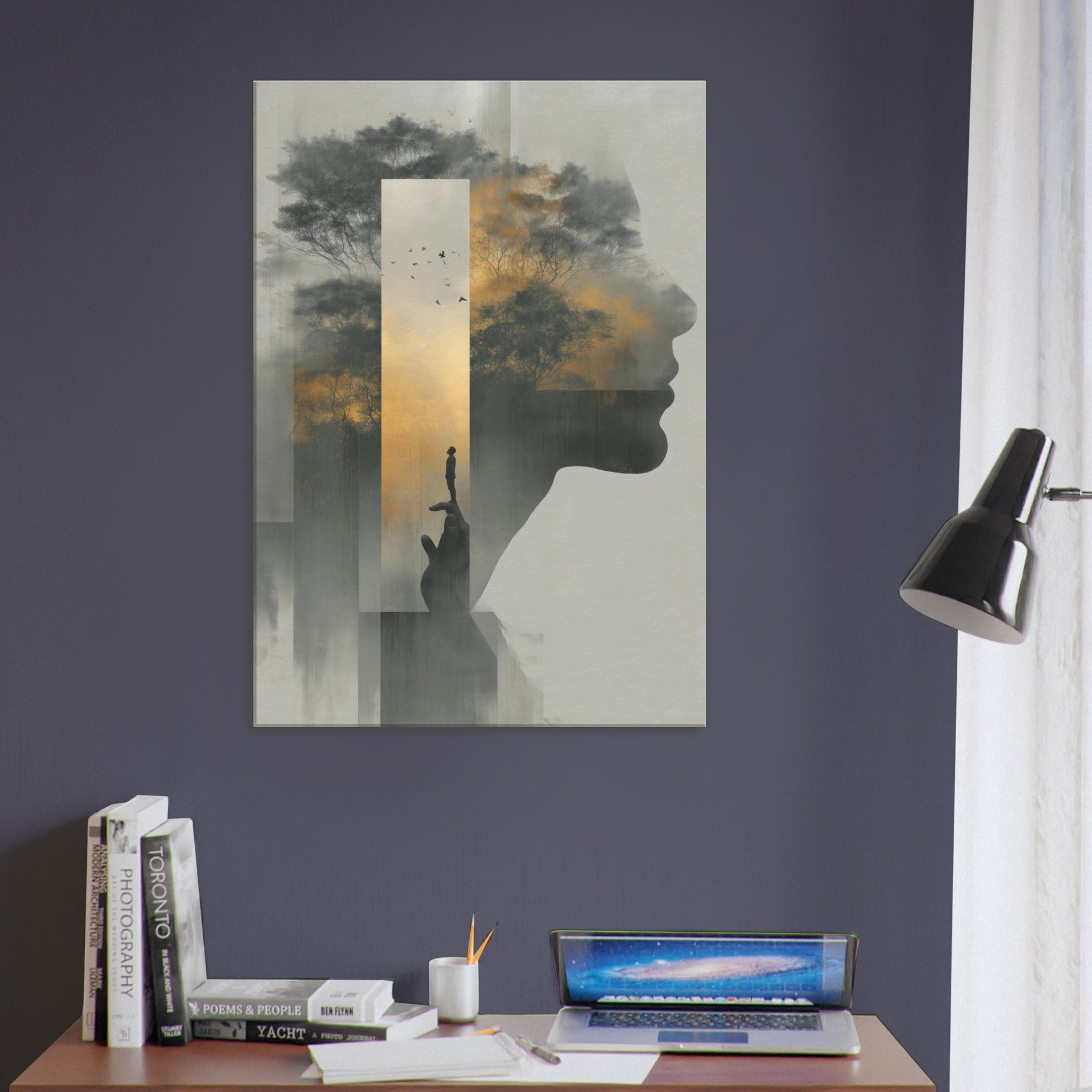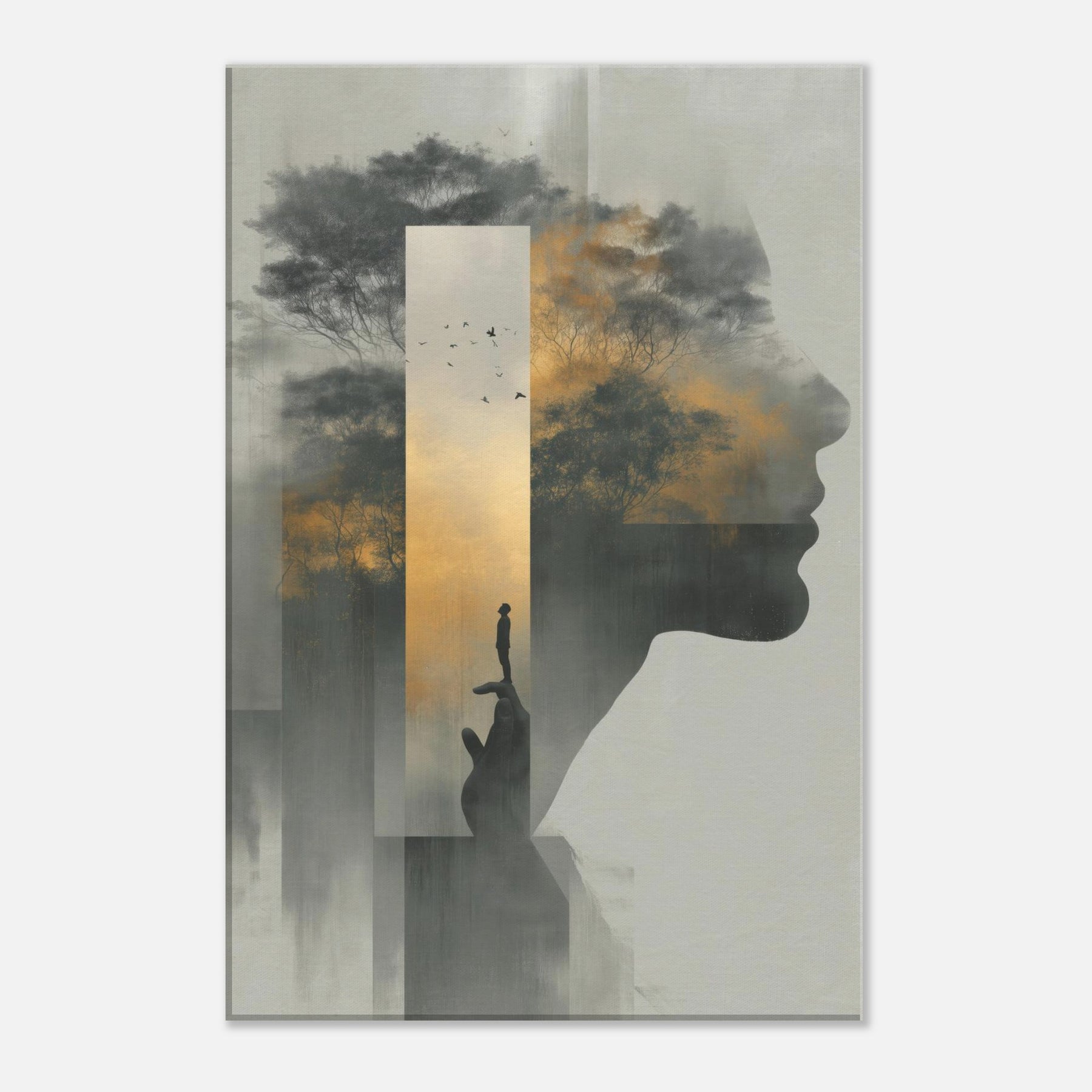 Between the profile's quiet contour and a misty forest, this piece folds Hands Line Art into a dreamscape where memory and shadow mingle. A solitary figure balances on a fingertip, framed by a golden sky and whispering trees, as if the world rests in your palm. Subtle gradients and ghostly silhouettes invite a slow, reflective gaze, turning any living room into a sanctuary of mood and meaning, an artful invitation to pause, breathe, and imagine.