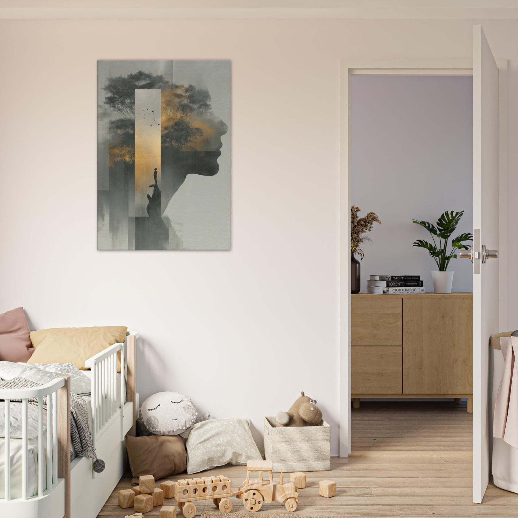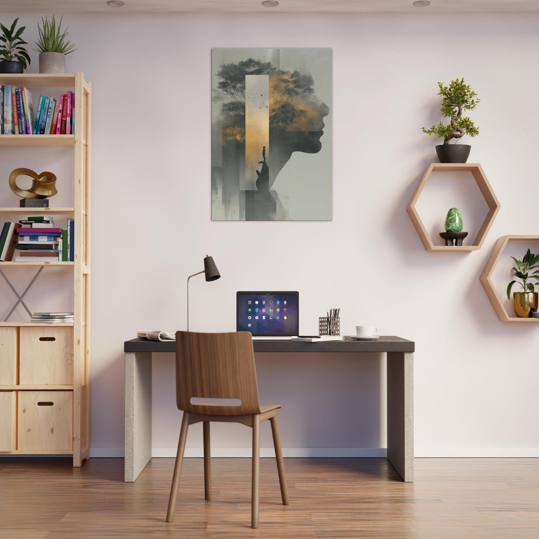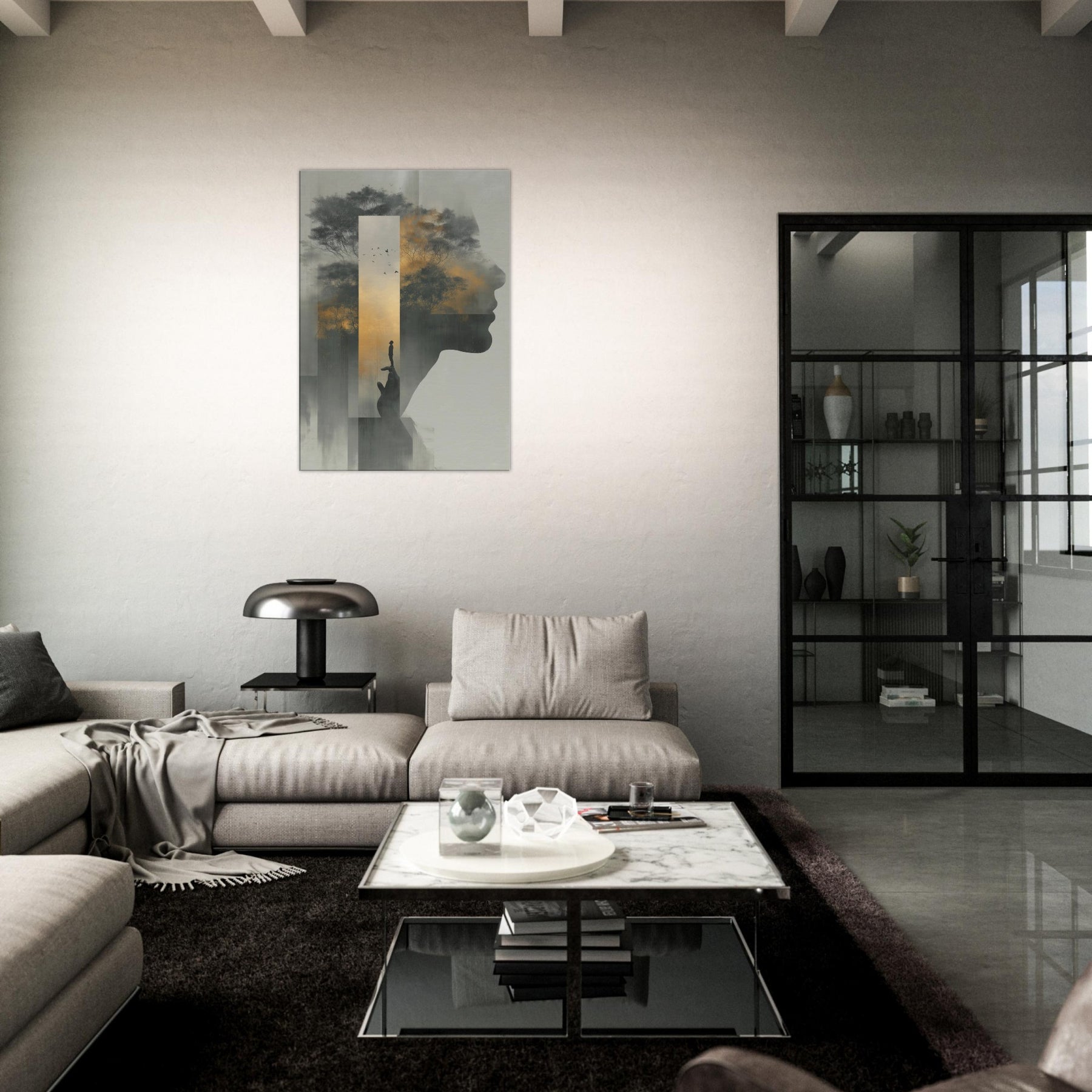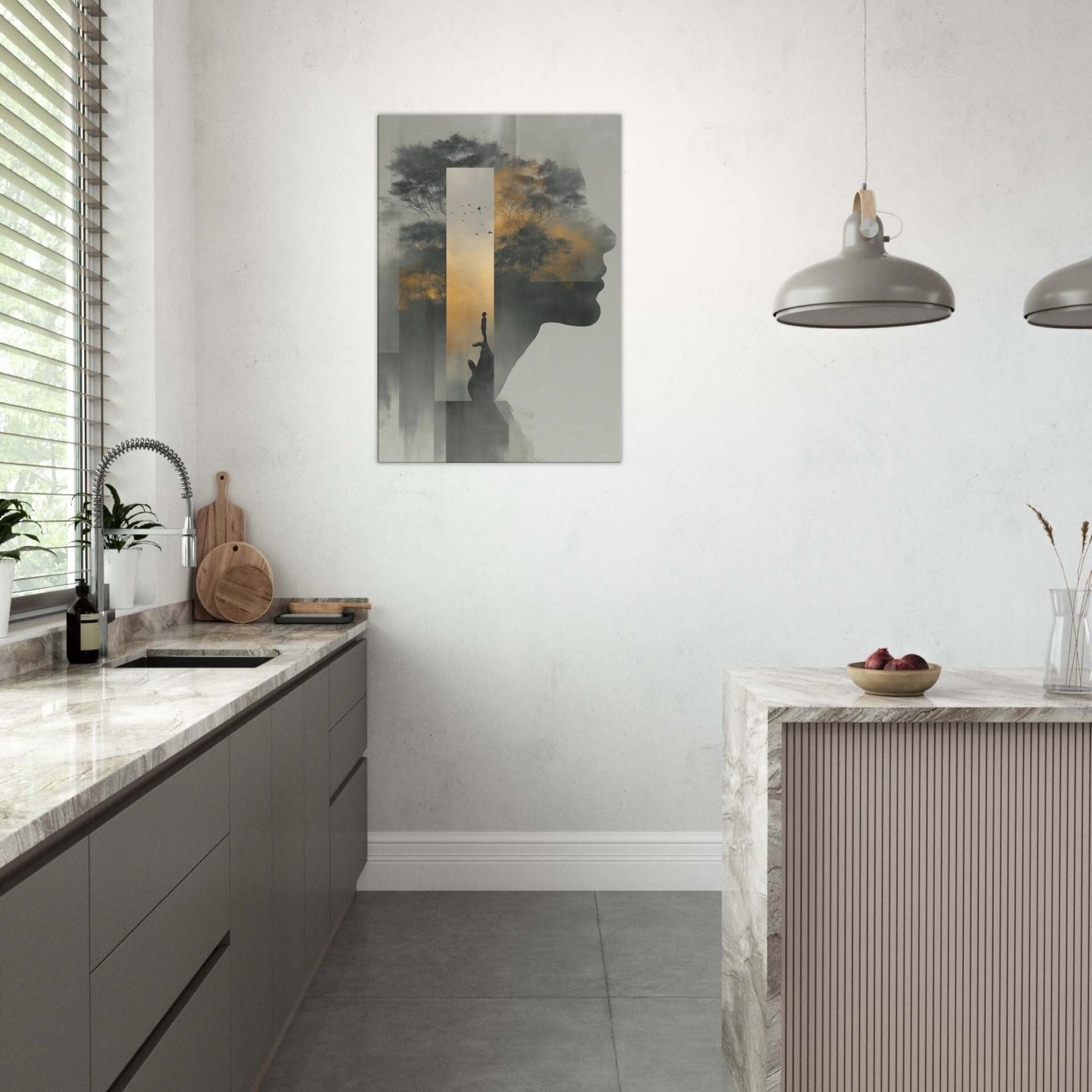 Between the profile's quiet contour and a misty forest, this piece folds Hands Line Art into a dreamscape where memory and shadow mingle. A solitary figure balances on a fingertip, framed by a golden sky and whispering trees, as if the world rests in your palm. Subtle gradients and ghostly silhouettes invite a slow, reflective gaze, turning any living room into a sanctuary of mood and meaning, an artful invitation to pause, breathe, and imagine.
