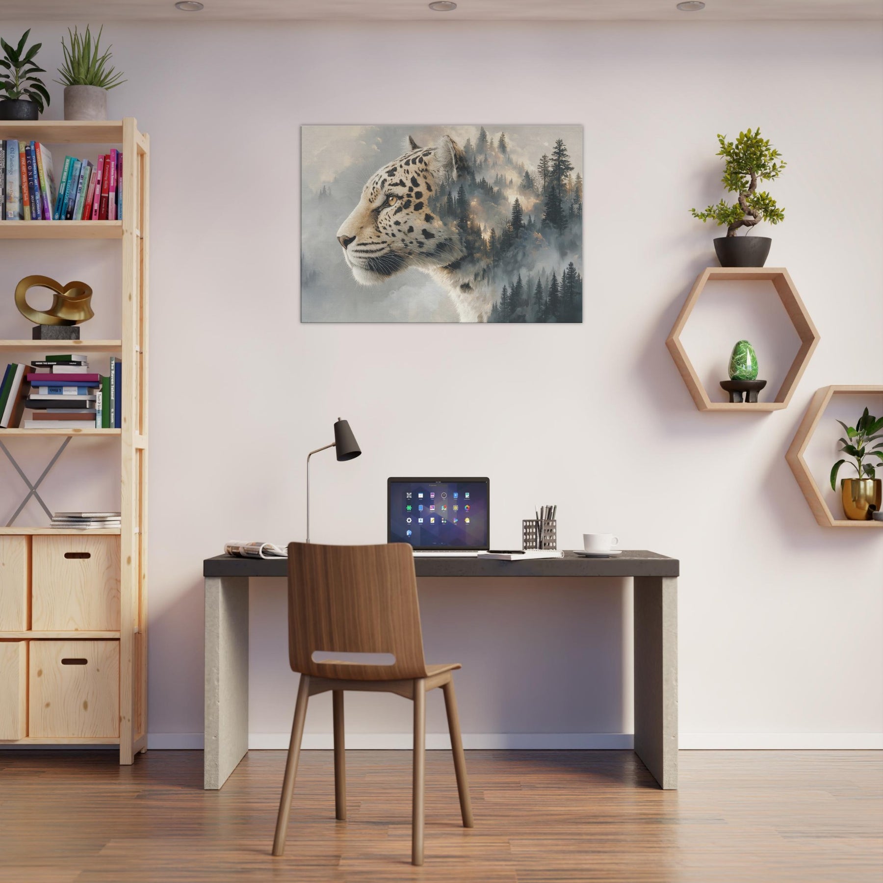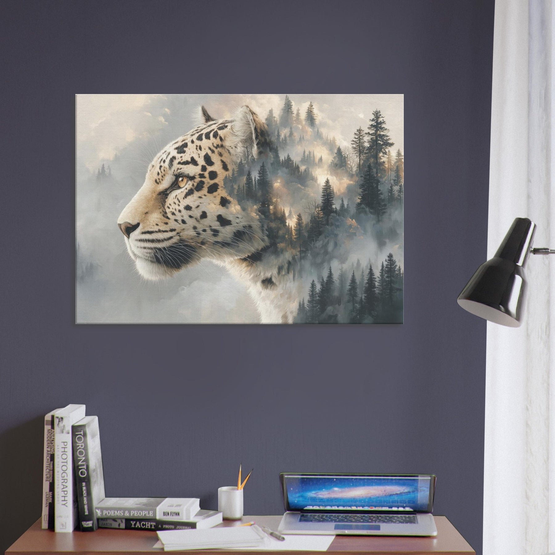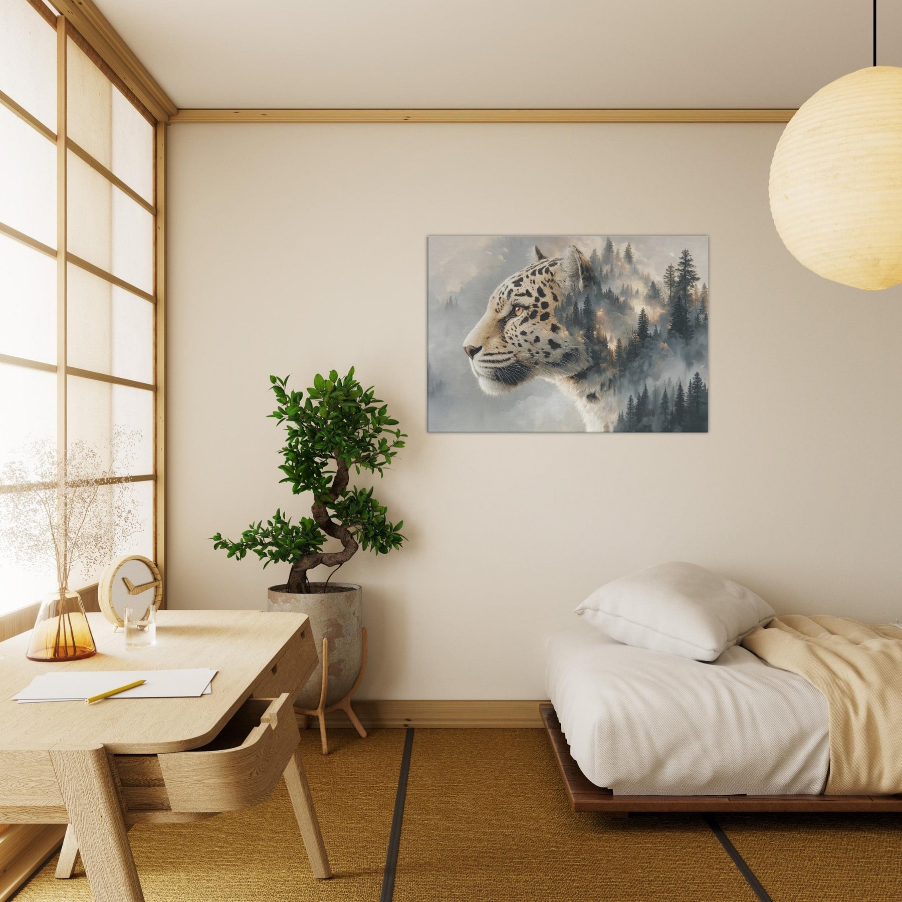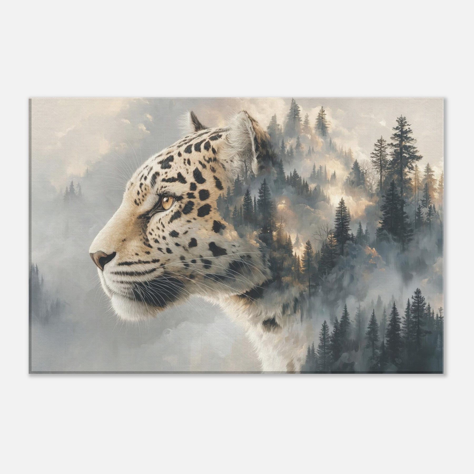 On the wall, this dreamlike tableau unfolds as a solitary, luminous gaze that dissolves into a forest of memory and mist. The Jaguar's head emerges from fog kissed pines, its amber eye holding ancient light, while cedar silhouettes drift like quiet echoes. Layered textures and soft haze invite a meditative mood, turning any living space into a sanctuary of wonder. It pairs beautifully with warm woods and pale fabrics, anchoring the room with surreal depth and a breath of tranquil mystery.