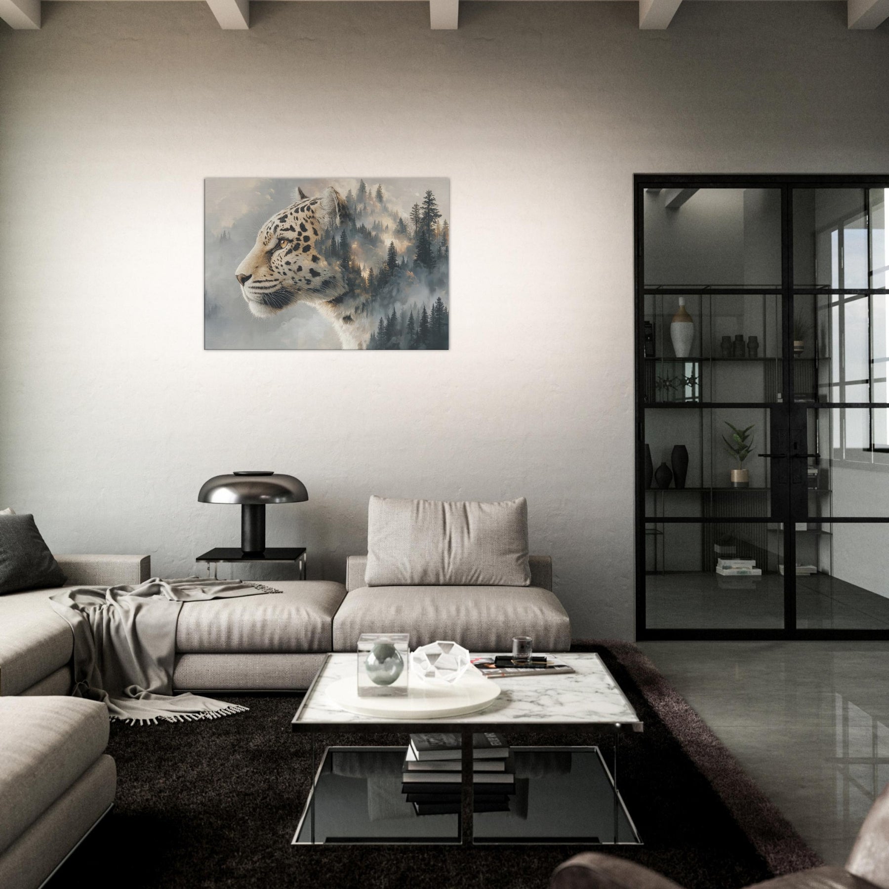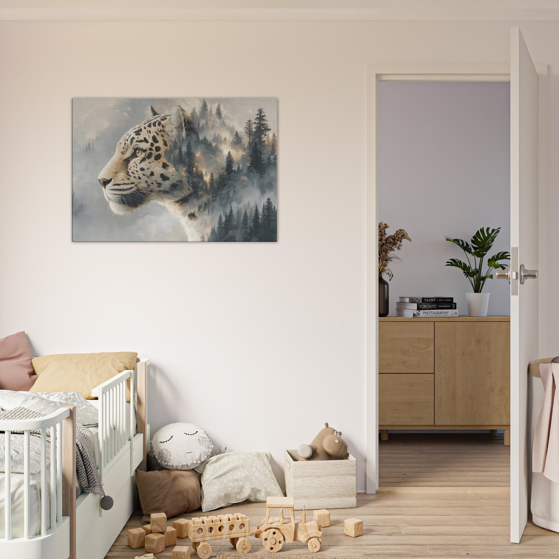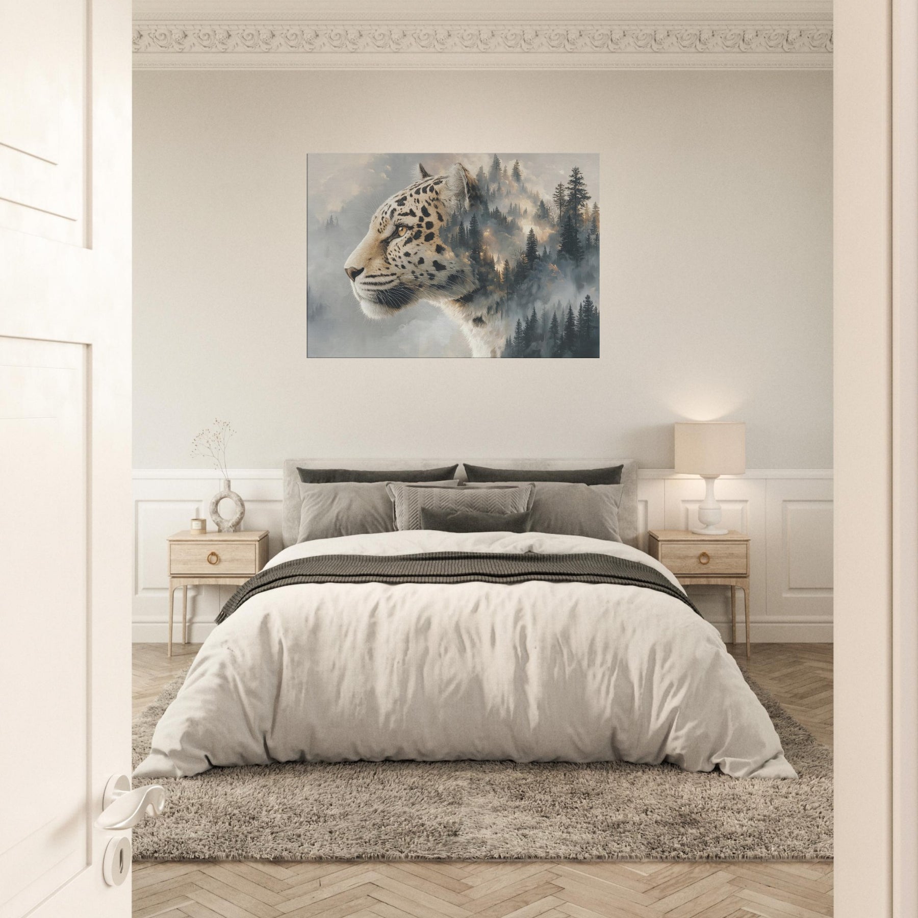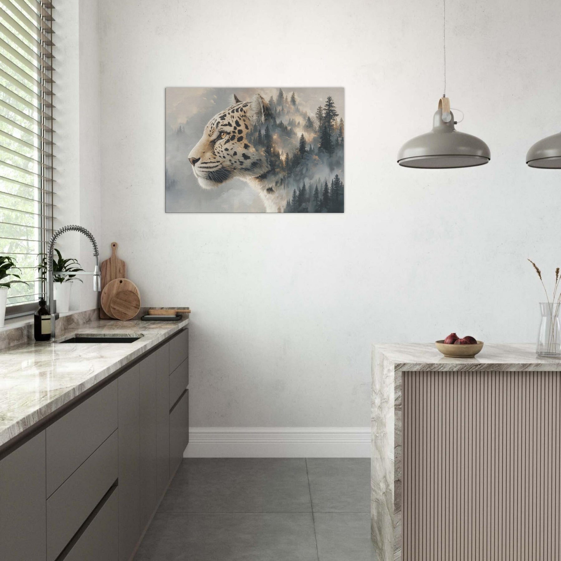 On the wall, this dreamlike tableau unfolds as a solitary, luminous gaze that dissolves into a forest of memory and mist. The Jaguar's head emerges from fog kissed pines, its amber eye holding ancient light, while cedar silhouettes drift like quiet echoes. Layered textures and soft haze invite a meditative mood, turning any living space into a sanctuary of wonder. It pairs beautifully with warm woods and pale fabrics, anchoring the room with surreal depth and a breath of tranquil mystery.
