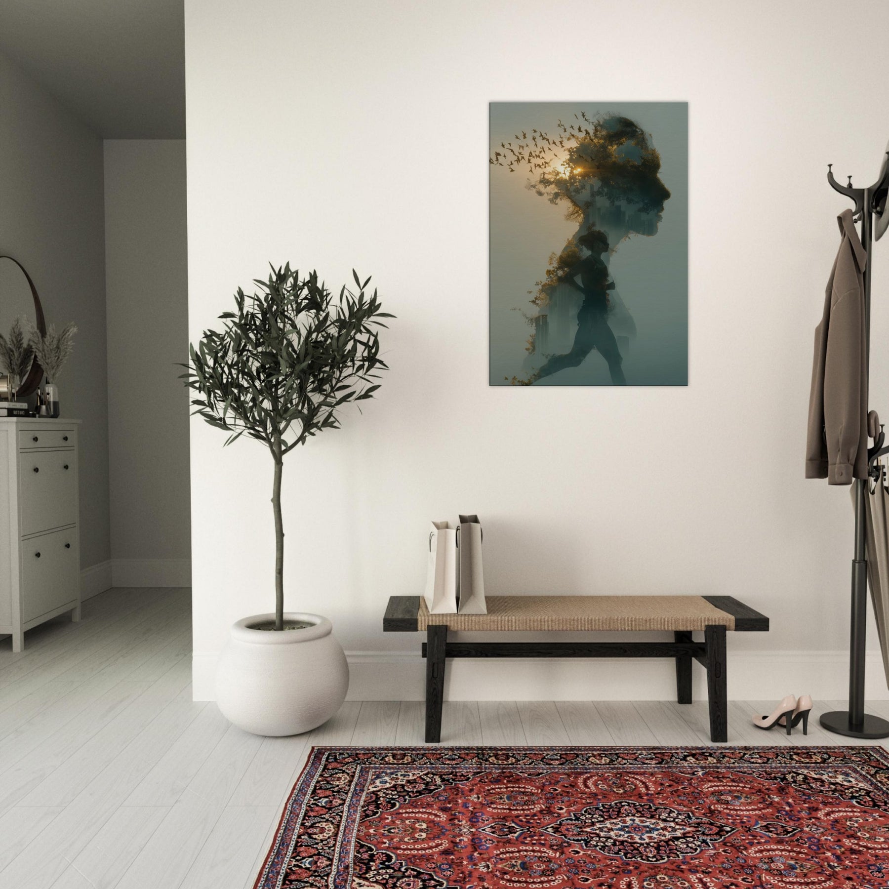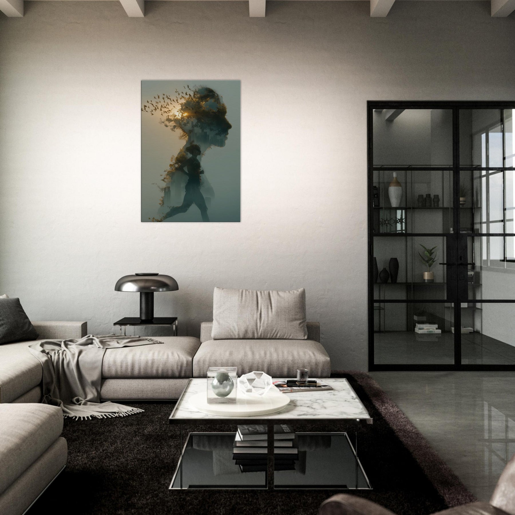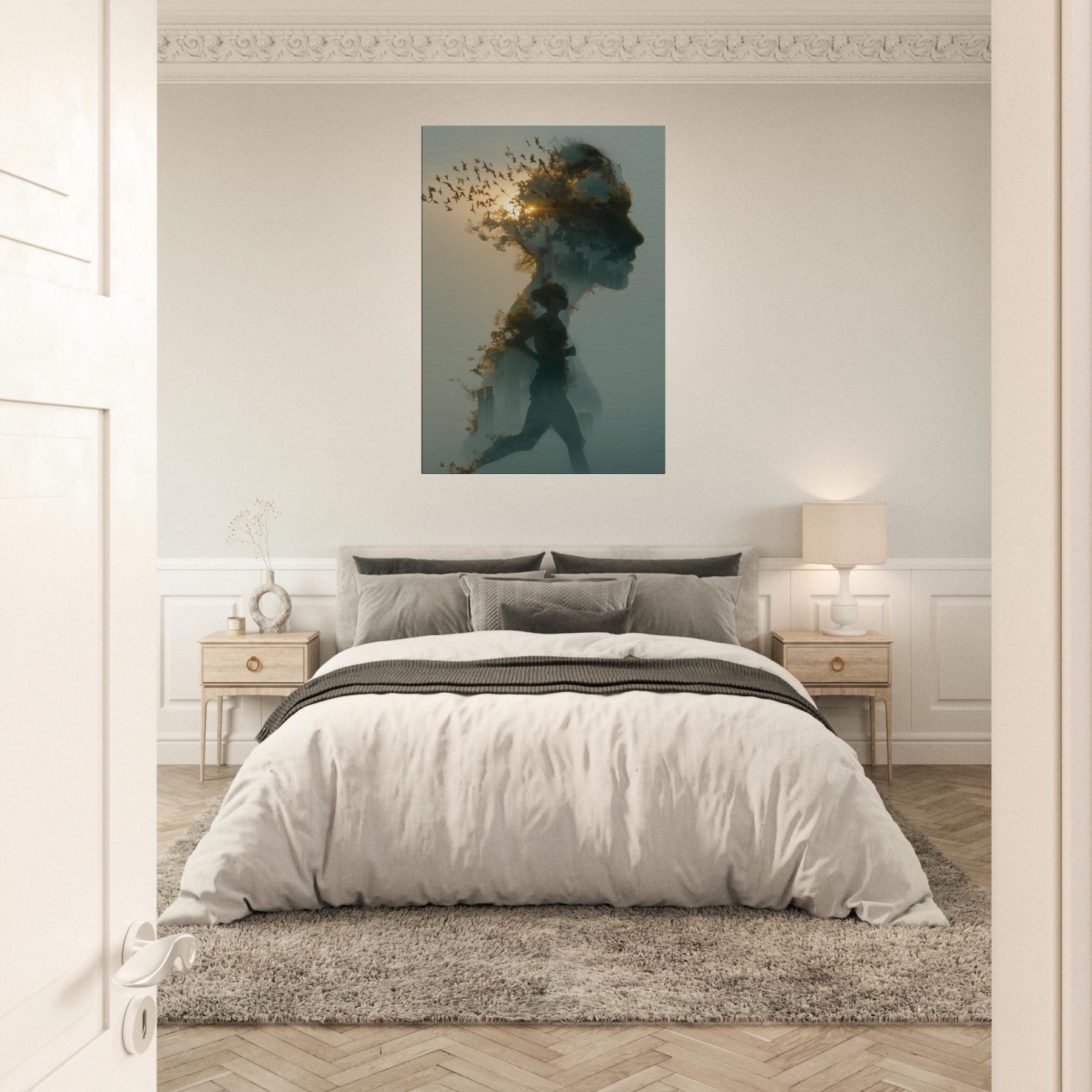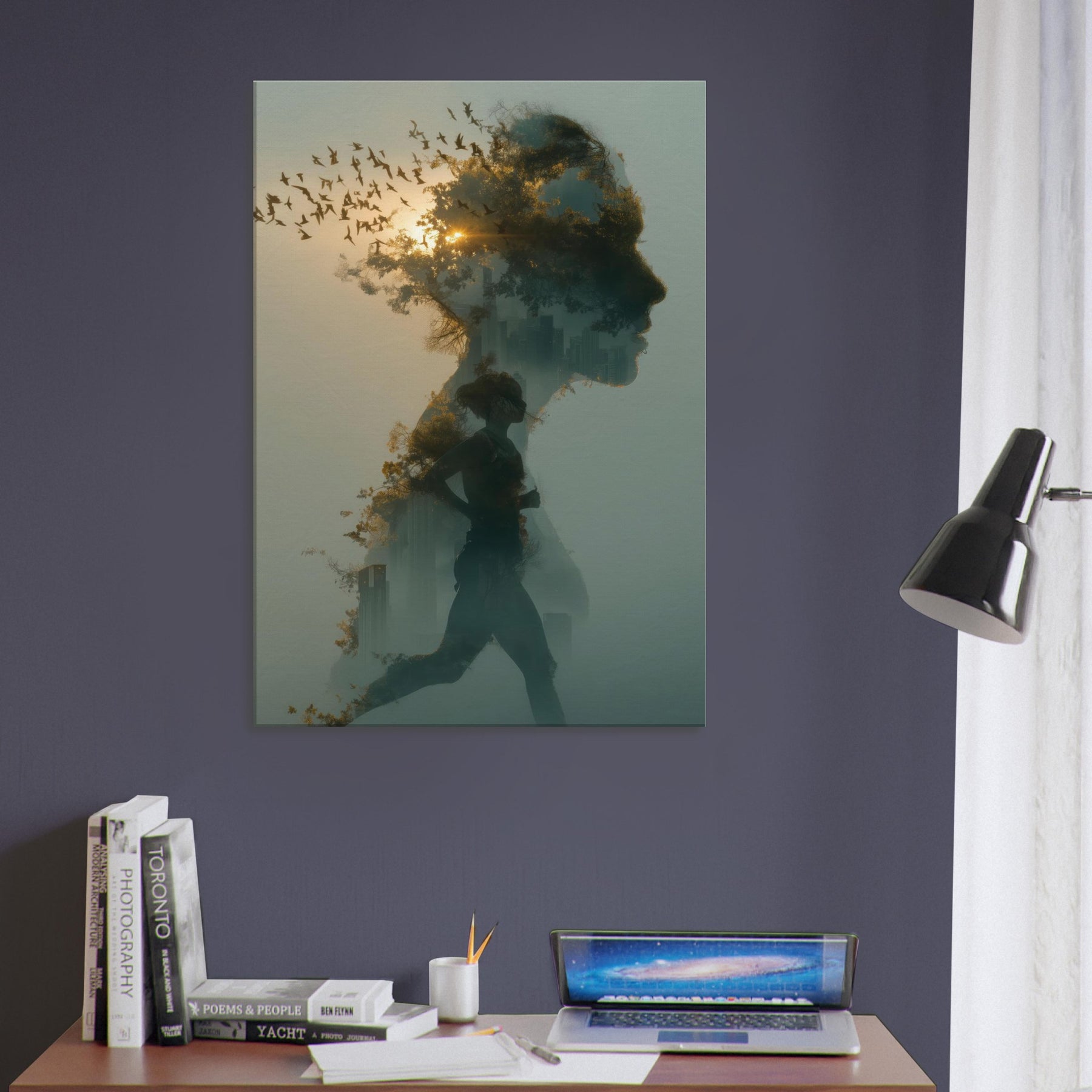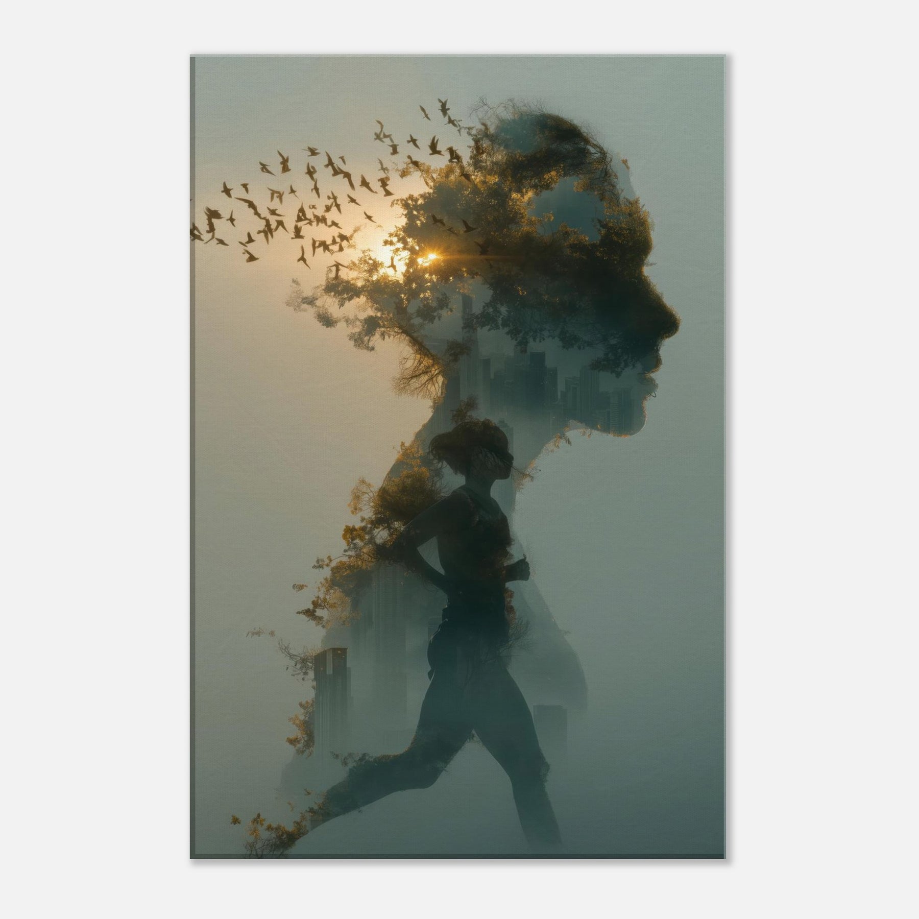 Runner in Motion stands at the heart of this dreamlike composition, a double exposure silhouette weaving a city skyline and a flock of birds through a soft dawn. The sense of momentum is tempered by fog kissed light, inviting calm energy into any room. Hang it in a living room or studio to soften stark corners with warmth, texture, and a whisper of movement. The piece encourages mindful pace an ode to endurance and wonder, captured as atmosphere rather than a single moment.
