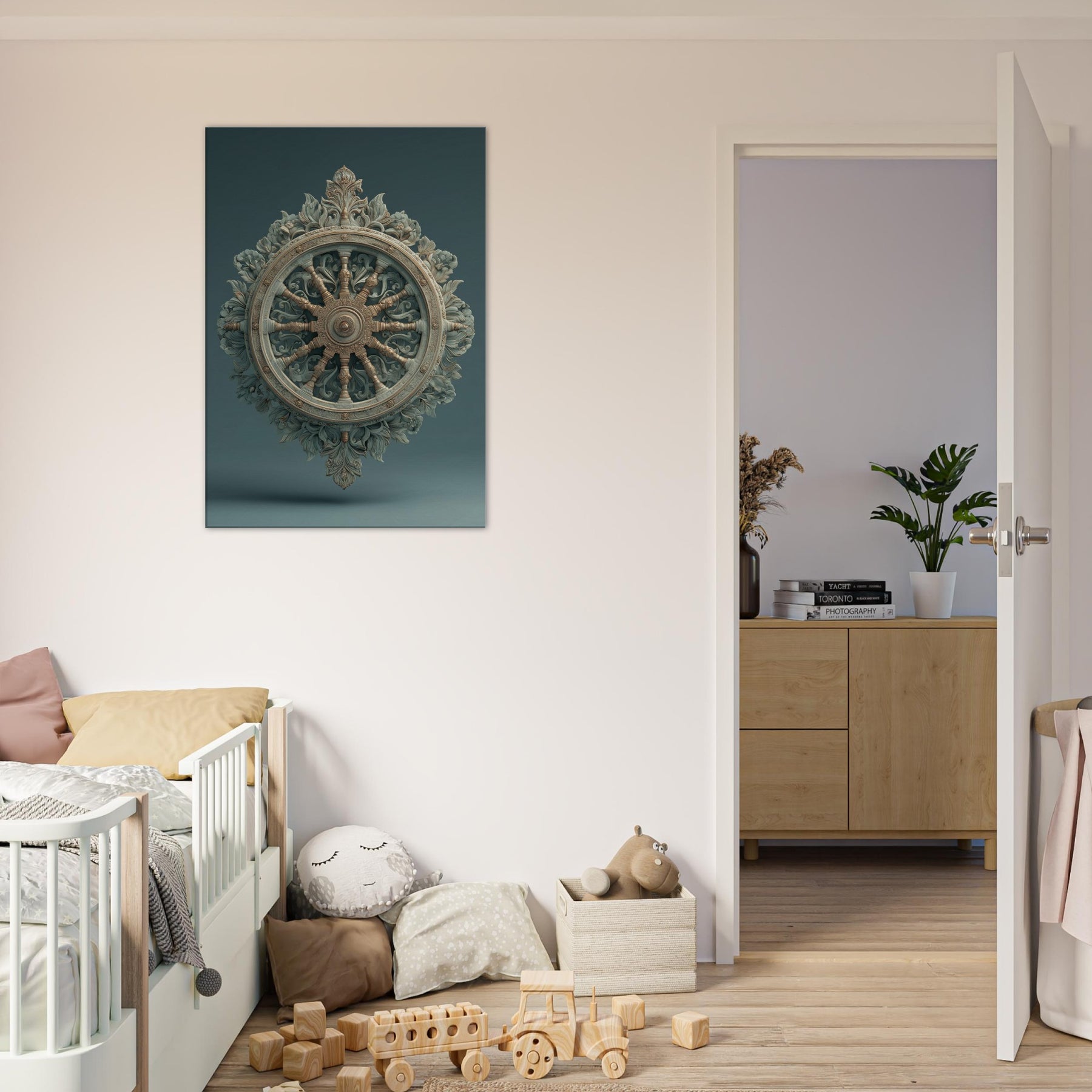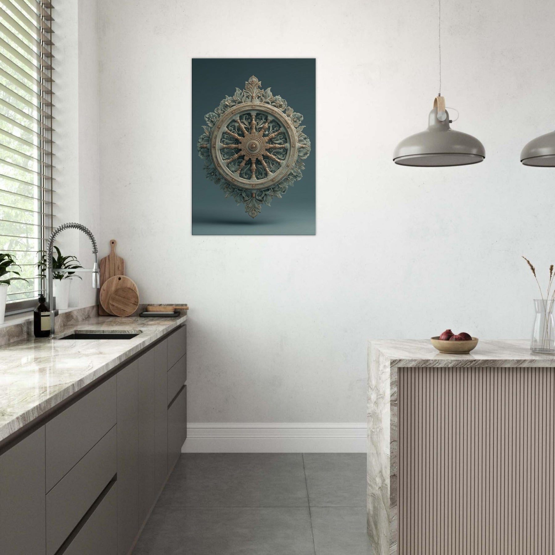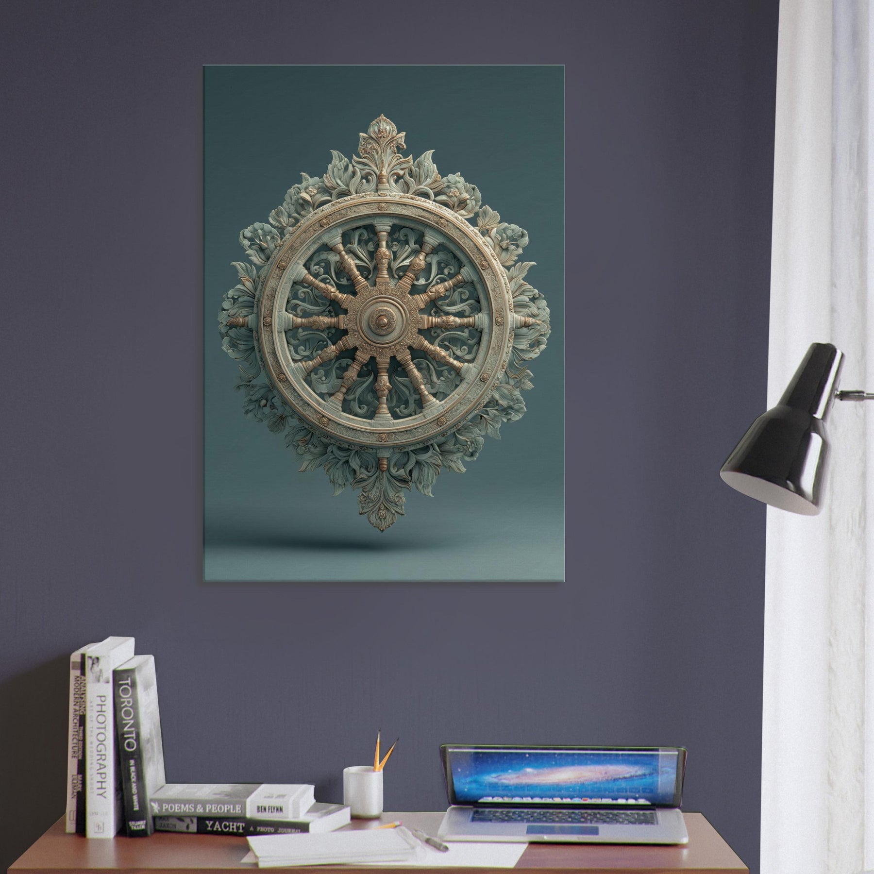 A hypnotic blueprint of motion and stillness, this Dharma Wheel radiates with surreal curvature and sculpted leaves that breathe in and out of the frame. The circular axis becomes a celestial compass, guiding the room with soft bronze reflections and mossy teal shadows. The mystical atmosphere invites quiet contemplation, making a living space feel like a temple of creativity. Hang it where light finds its path across the wheel, and let it slow the pulse of daily life. The central subject is Dharma Wheel (Dharmachakra).