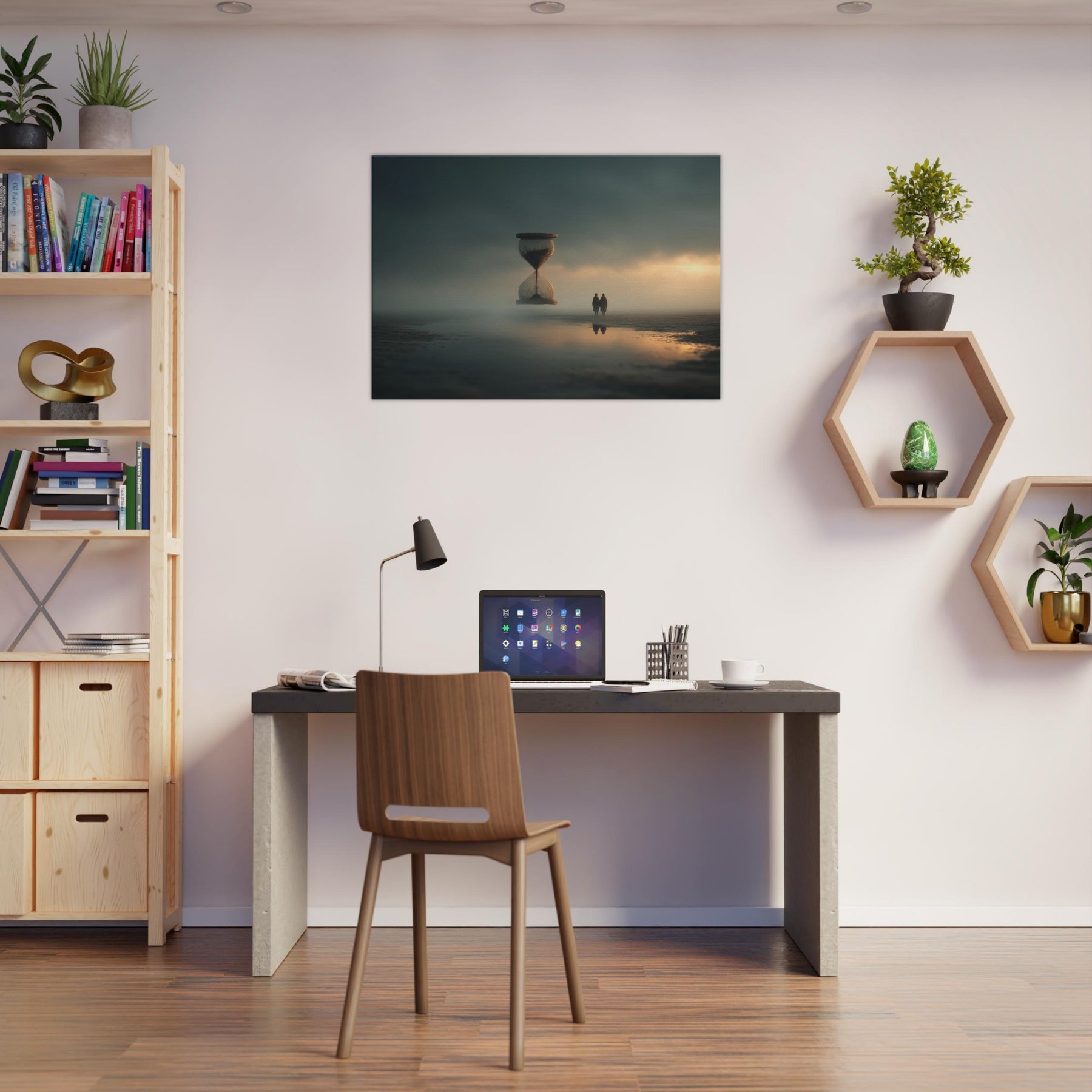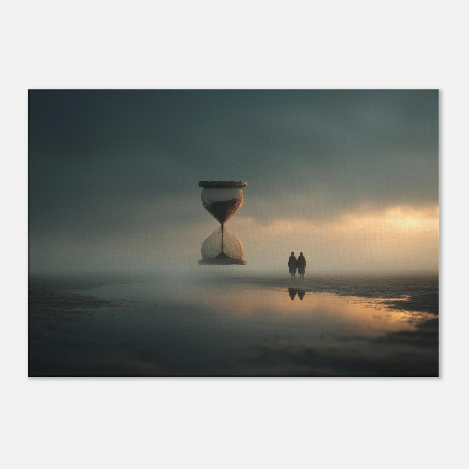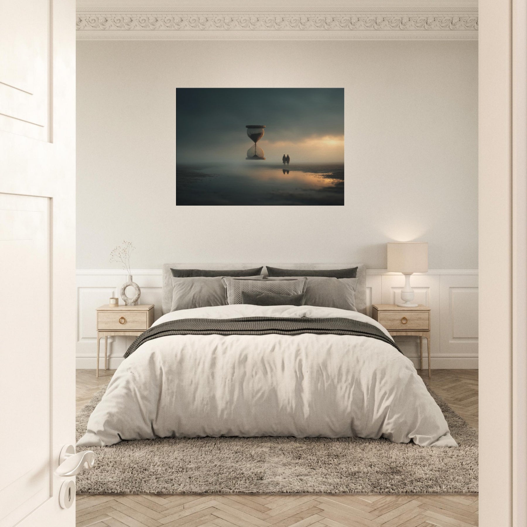 Hourglass, suspended between memory and breath, anchors a quiet dream in this surreal scene. Two solitary figures stand at the horizon as the world slows, the sands of time looping within the glass vessel. Mist, dusk light, and a soft, molten glow cradle the composition, inviting stillness and contemplation. Hang this piece to soften a room’s edges, adding temporal poetry to everyday life. It becomes a luminous focal point that encourages slow, thoughtful moments and a sense of spacious calm in any living space.