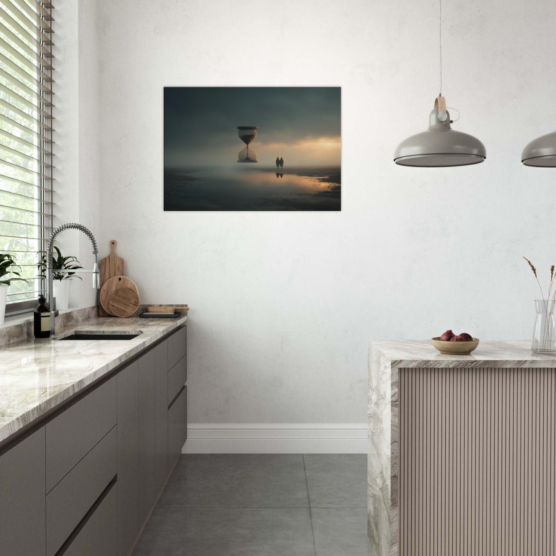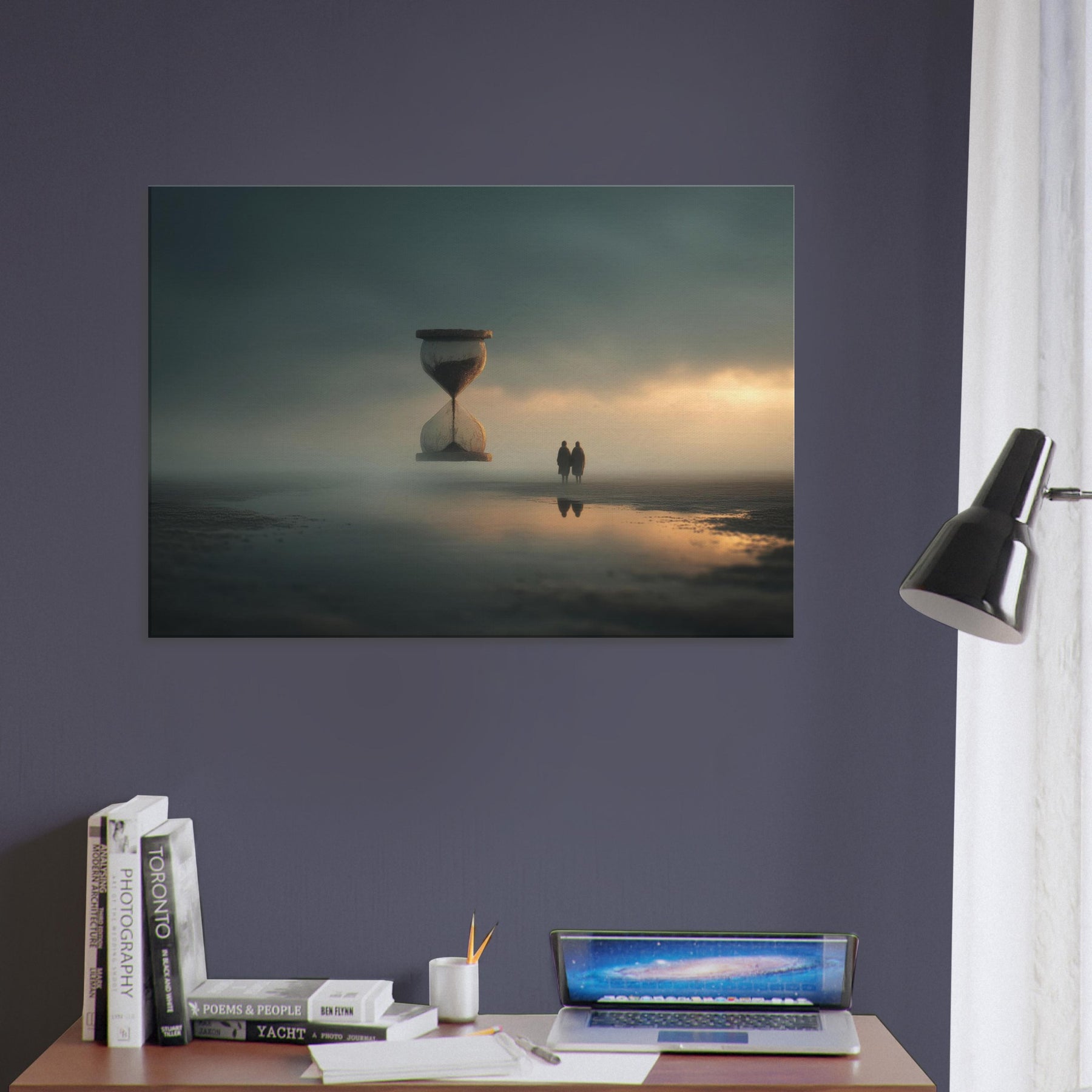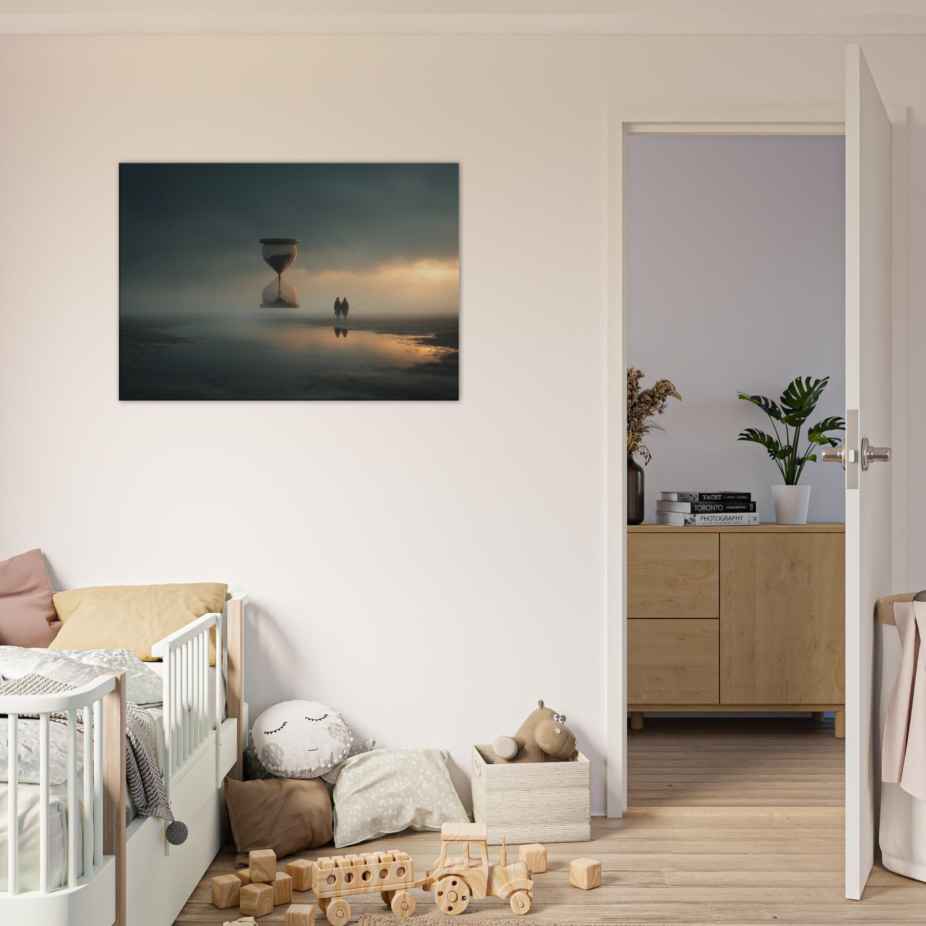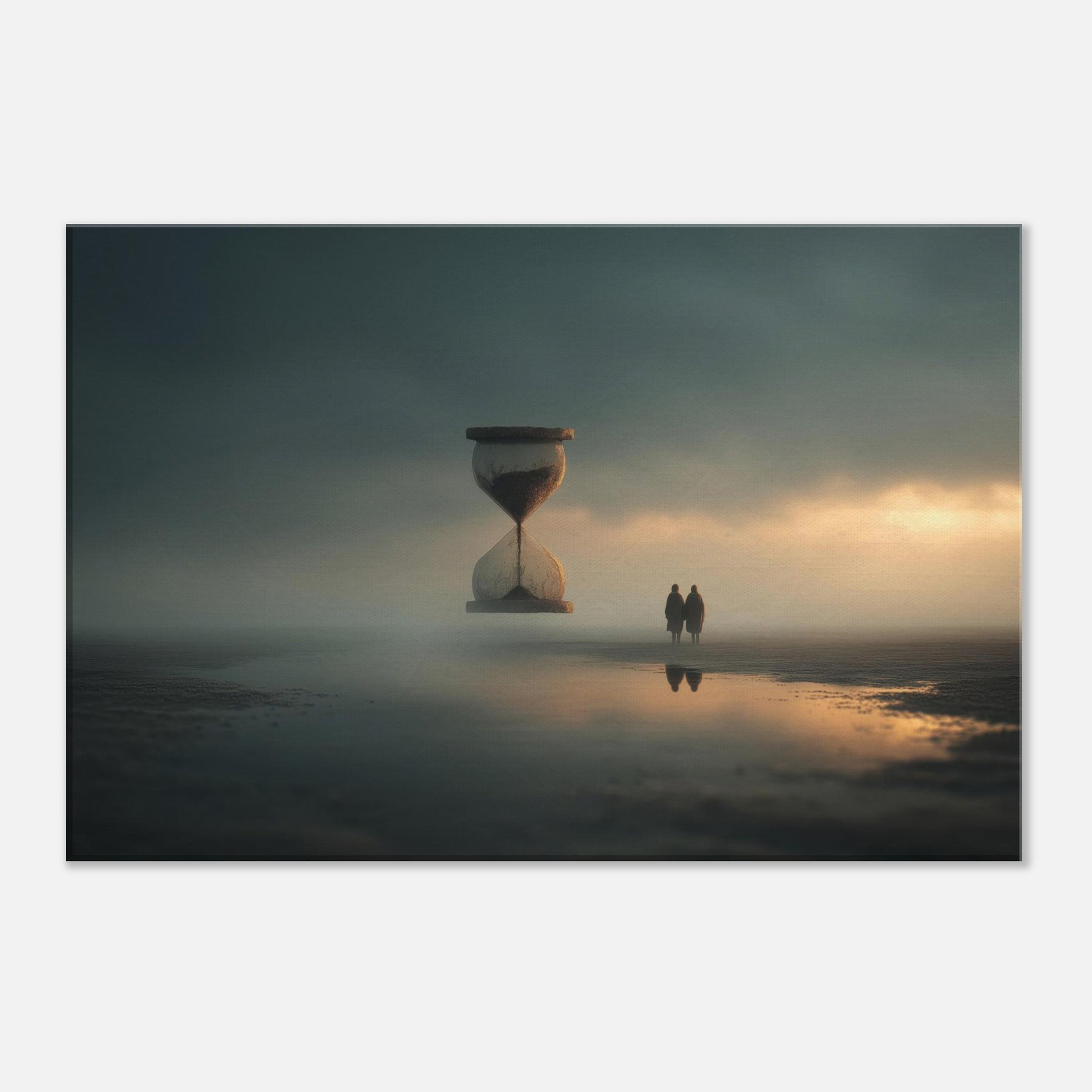 Hourglass, suspended between memory and breath, anchors a quiet dream in this surreal scene. Two solitary figures stand at the horizon as the world slows, the sands of time looping within the glass vessel. Mist, dusk light, and a soft, molten glow cradle the composition, inviting stillness and contemplation. Hang this piece to soften a room’s edges, adding temporal poetry to everyday life. It becomes a luminous focal point that encourages slow, thoughtful moments and a sense of spacious calm in any living space.