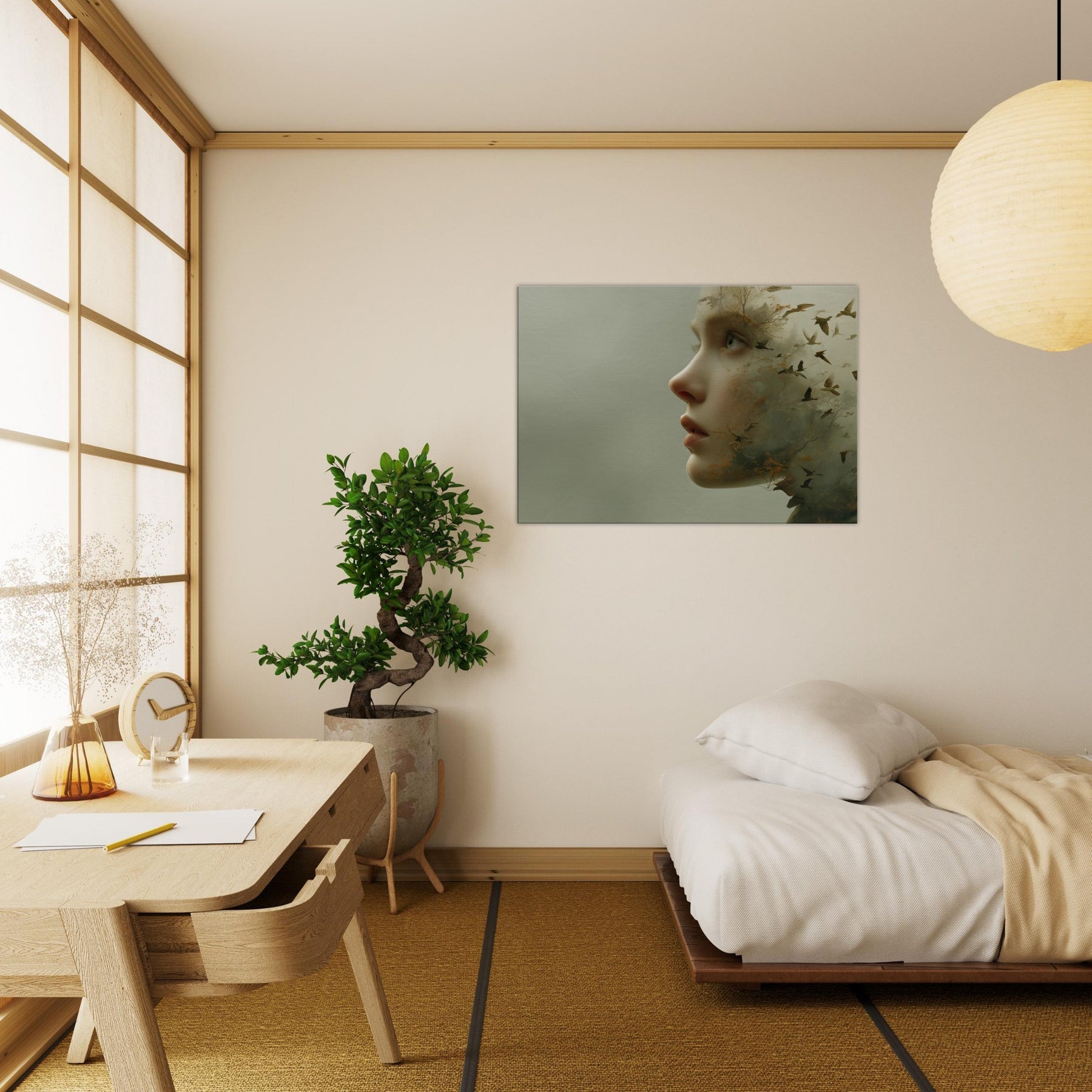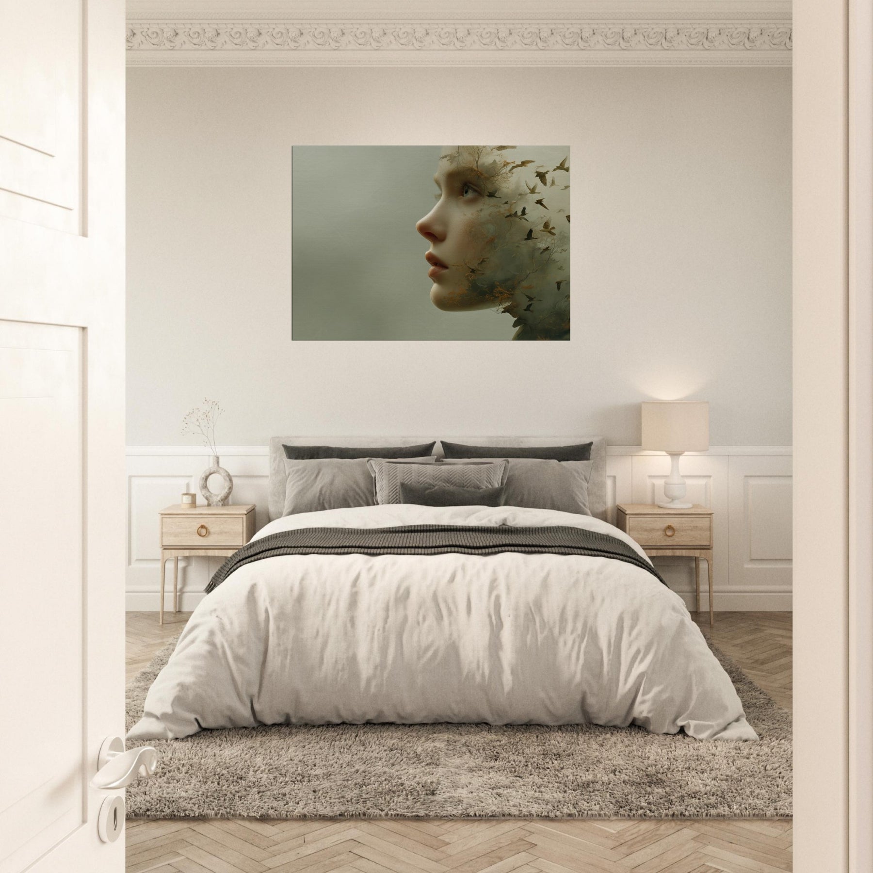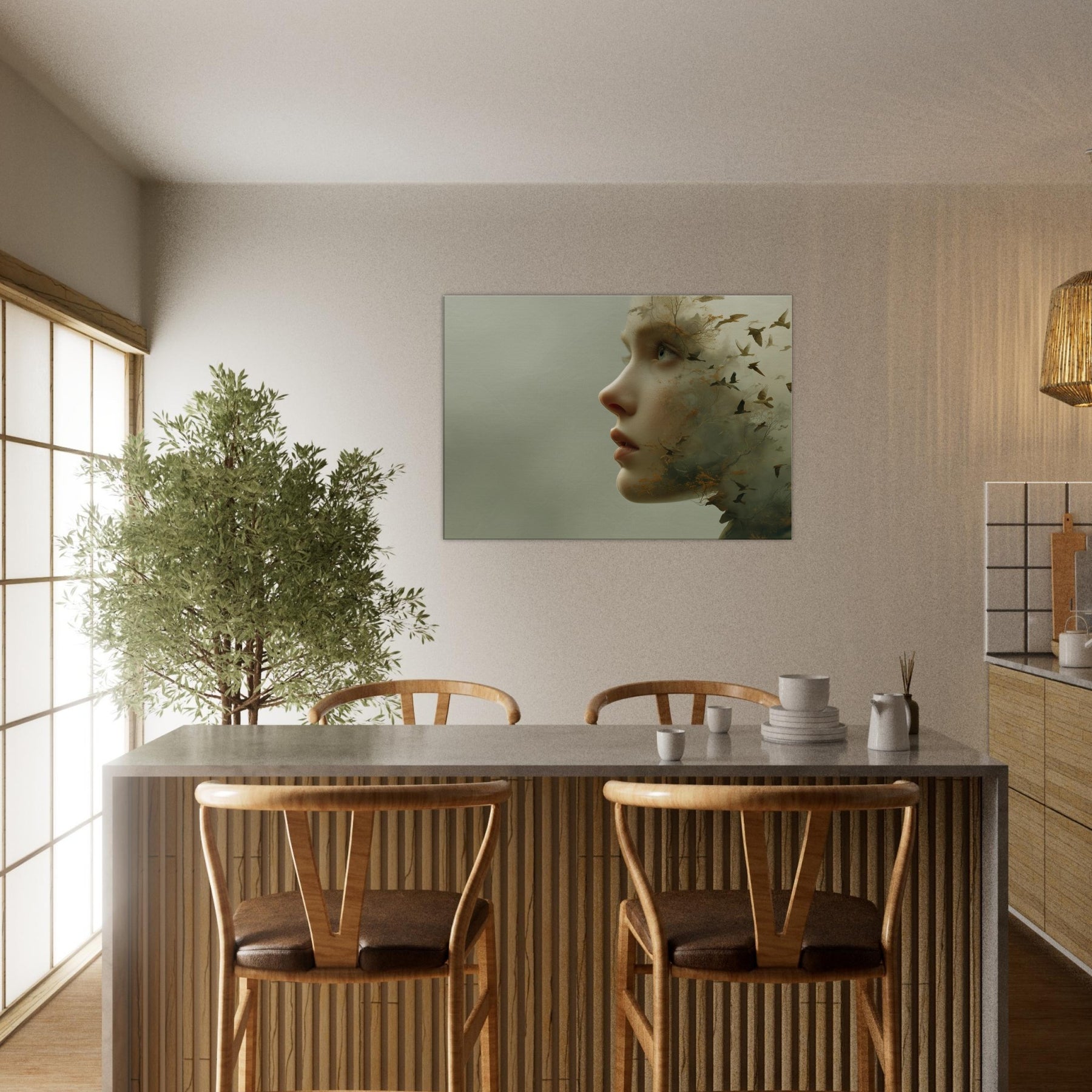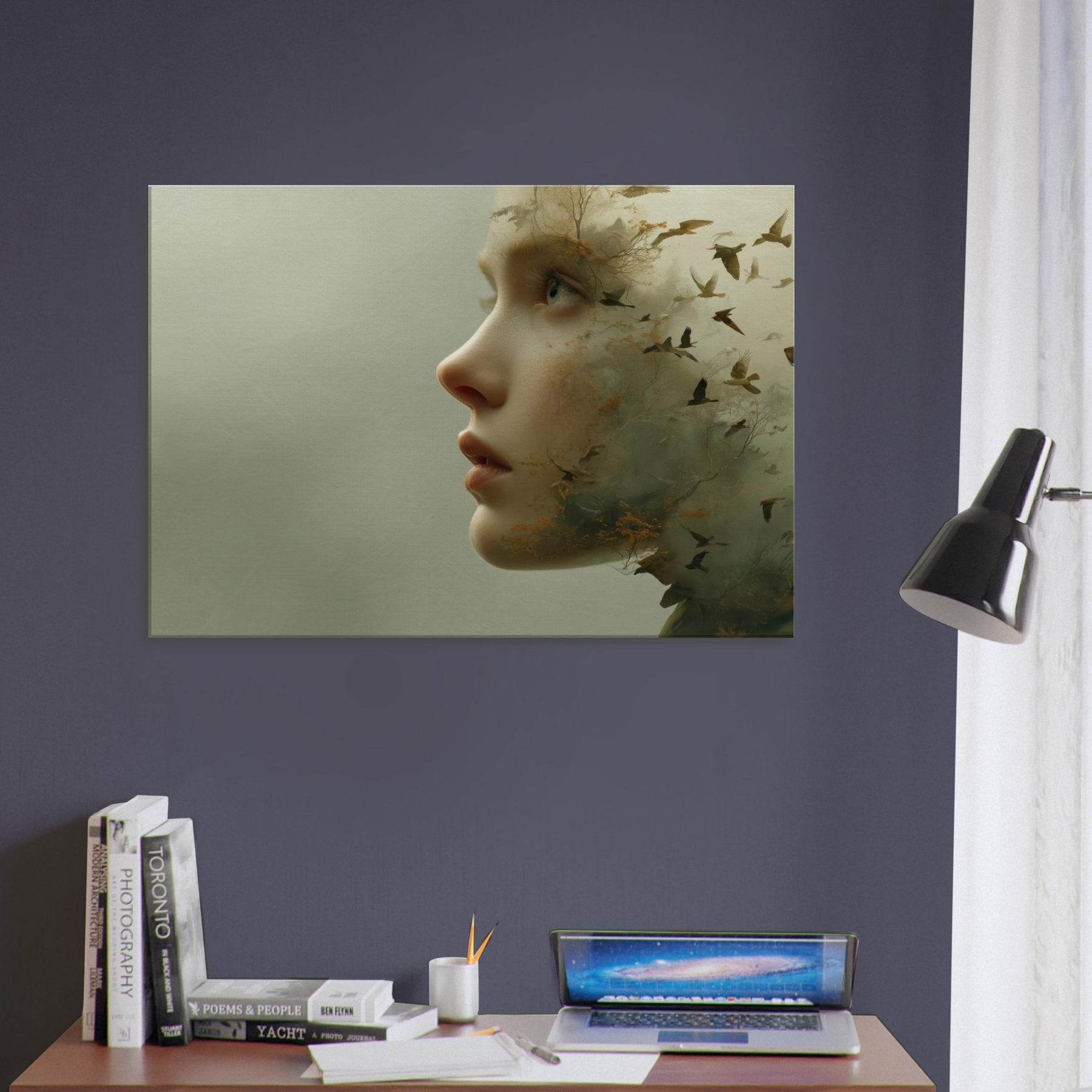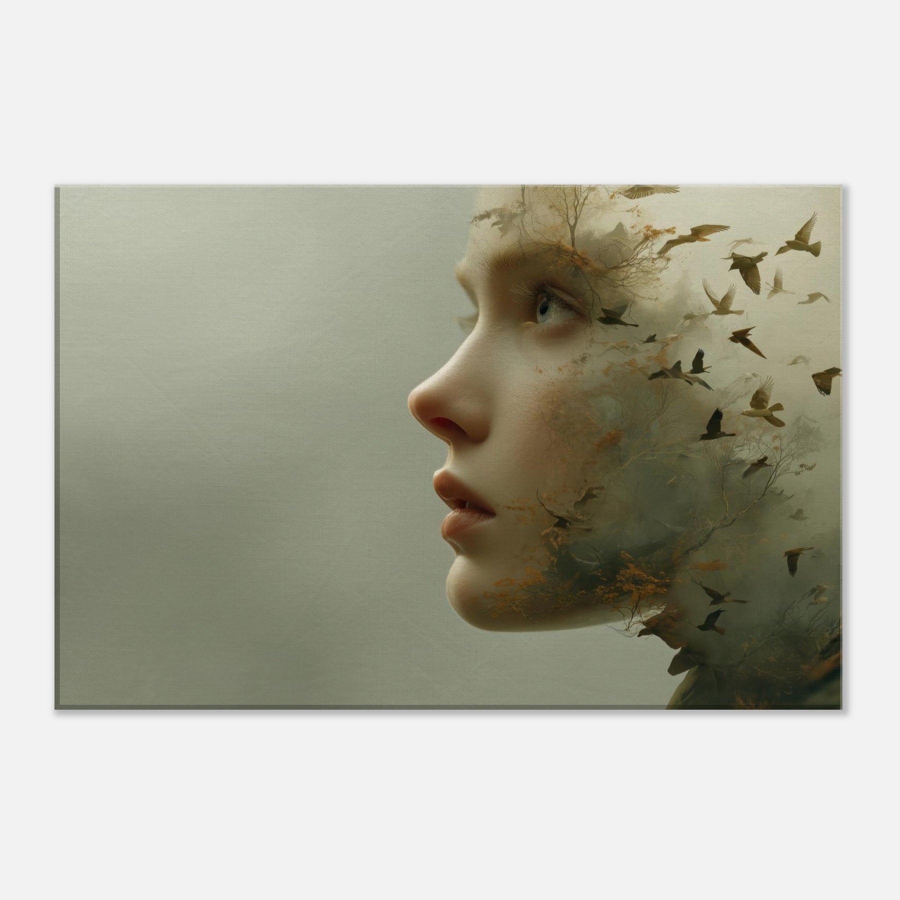 Step into a reverie where an Abstract Female Face dissolves into wind, trees, and sky. This surreal composition blends delicate facial contours with woodland textures and migrating birds, creating a living atmosphere that breathes with your space. The muted greens and warmer undertones glow softly, inviting calm and contemplation. Hang it where light travels through the room above a sofa or bedside chest and let the piece soften edges, spark quiet conversation, and transform the everyday into a fleeting, poetic moment.