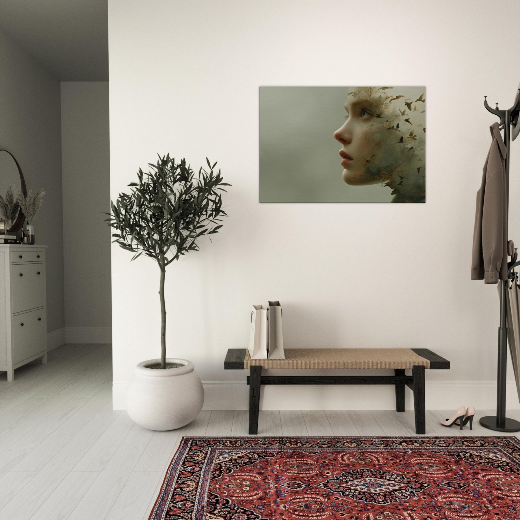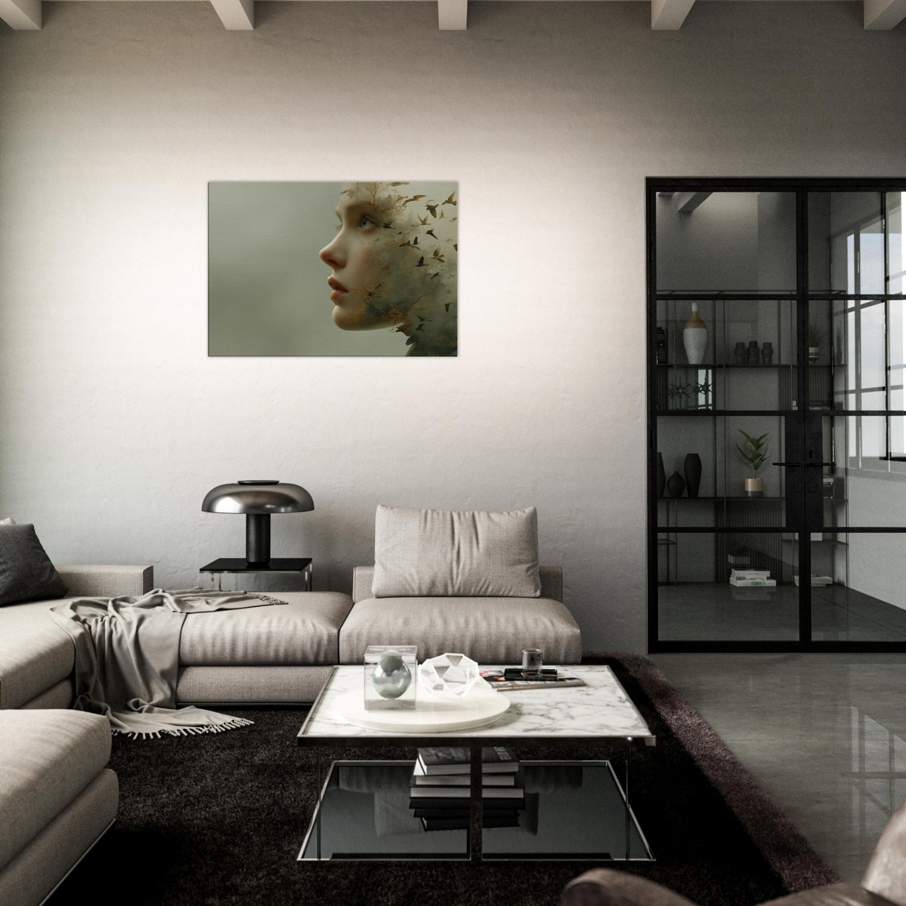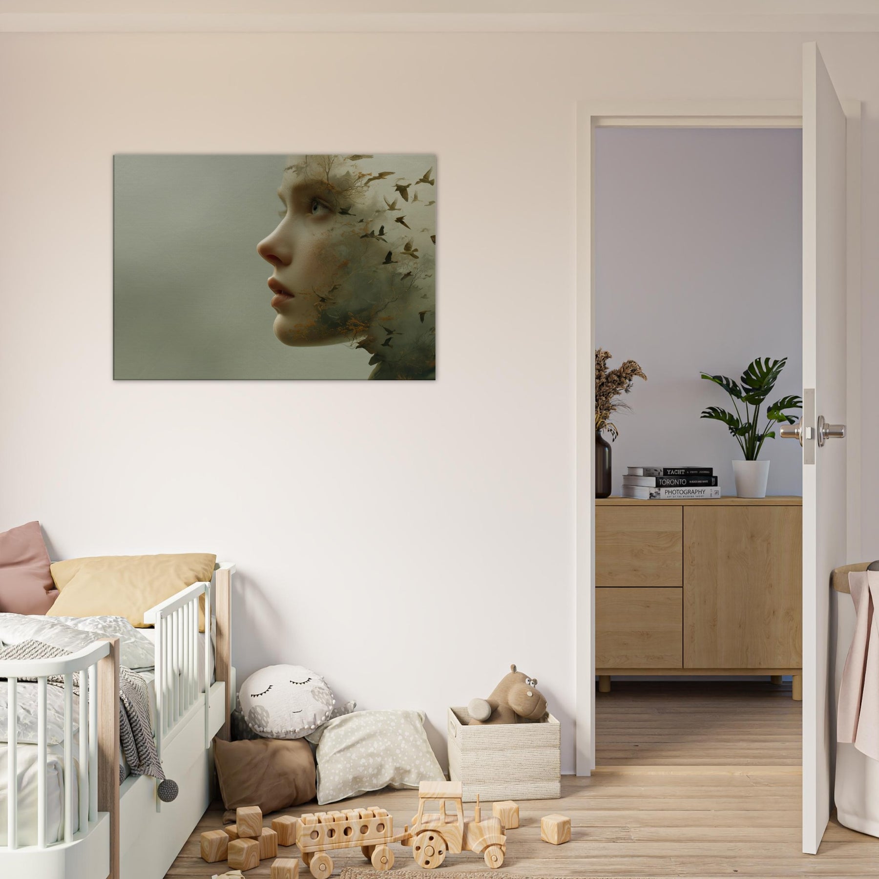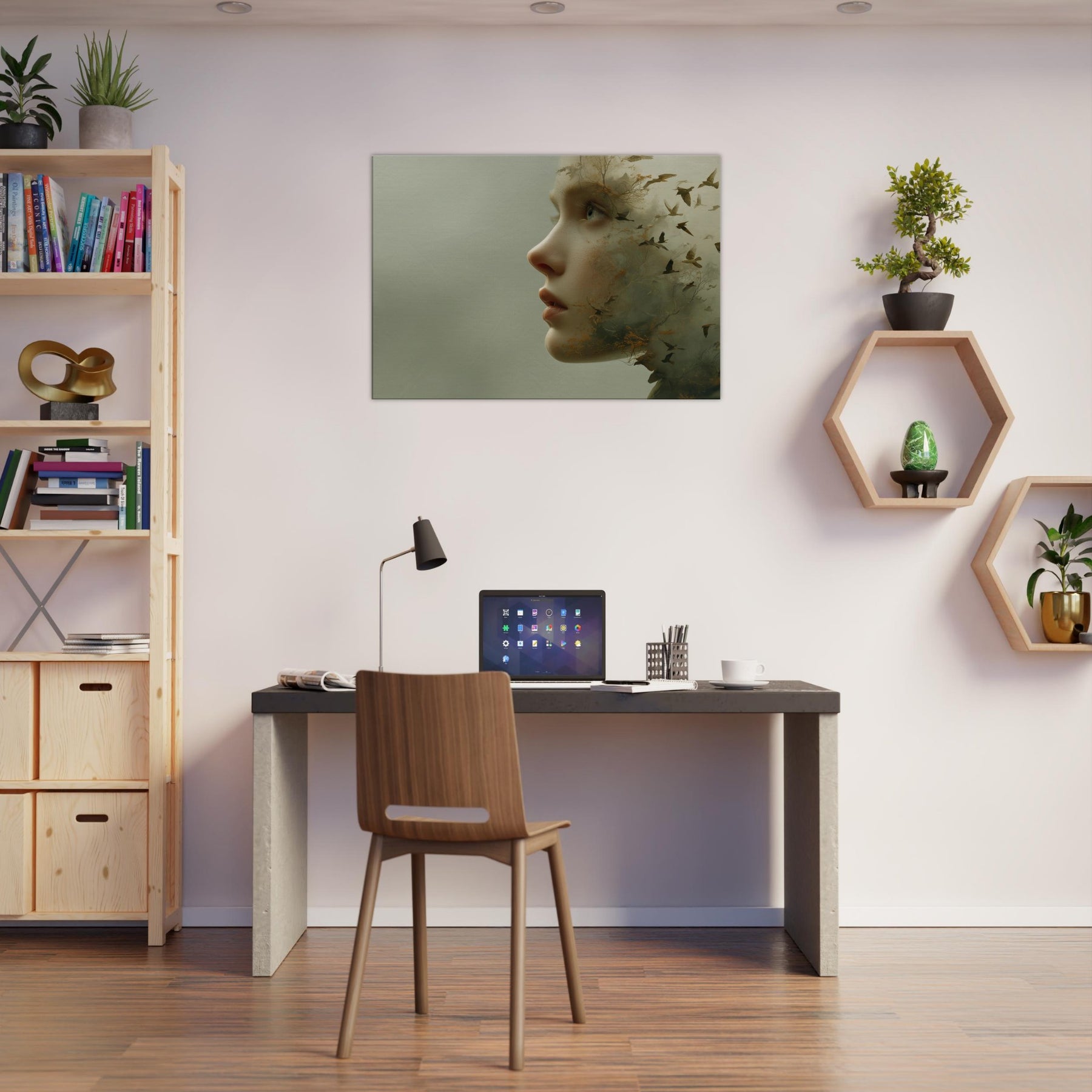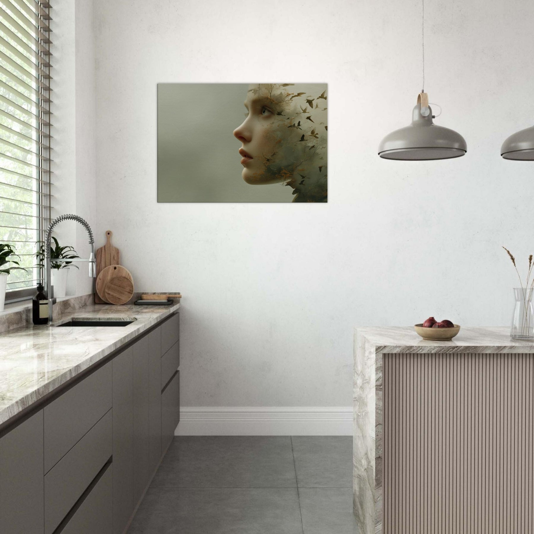 Step into a reverie where an Abstract Female Face dissolves into wind, trees, and sky. This surreal composition blends delicate facial contours with woodland textures and migrating birds, creating a living atmosphere that breathes with your space. The muted greens and warmer undertones glow softly, inviting calm and contemplation. Hang it where light travels through the room above a sofa or bedside chest and let the piece soften edges, spark quiet conversation, and transform the everyday into a fleeting, poetic moment.