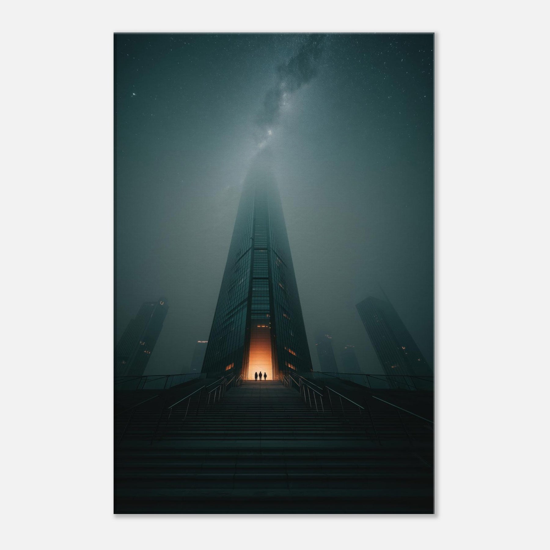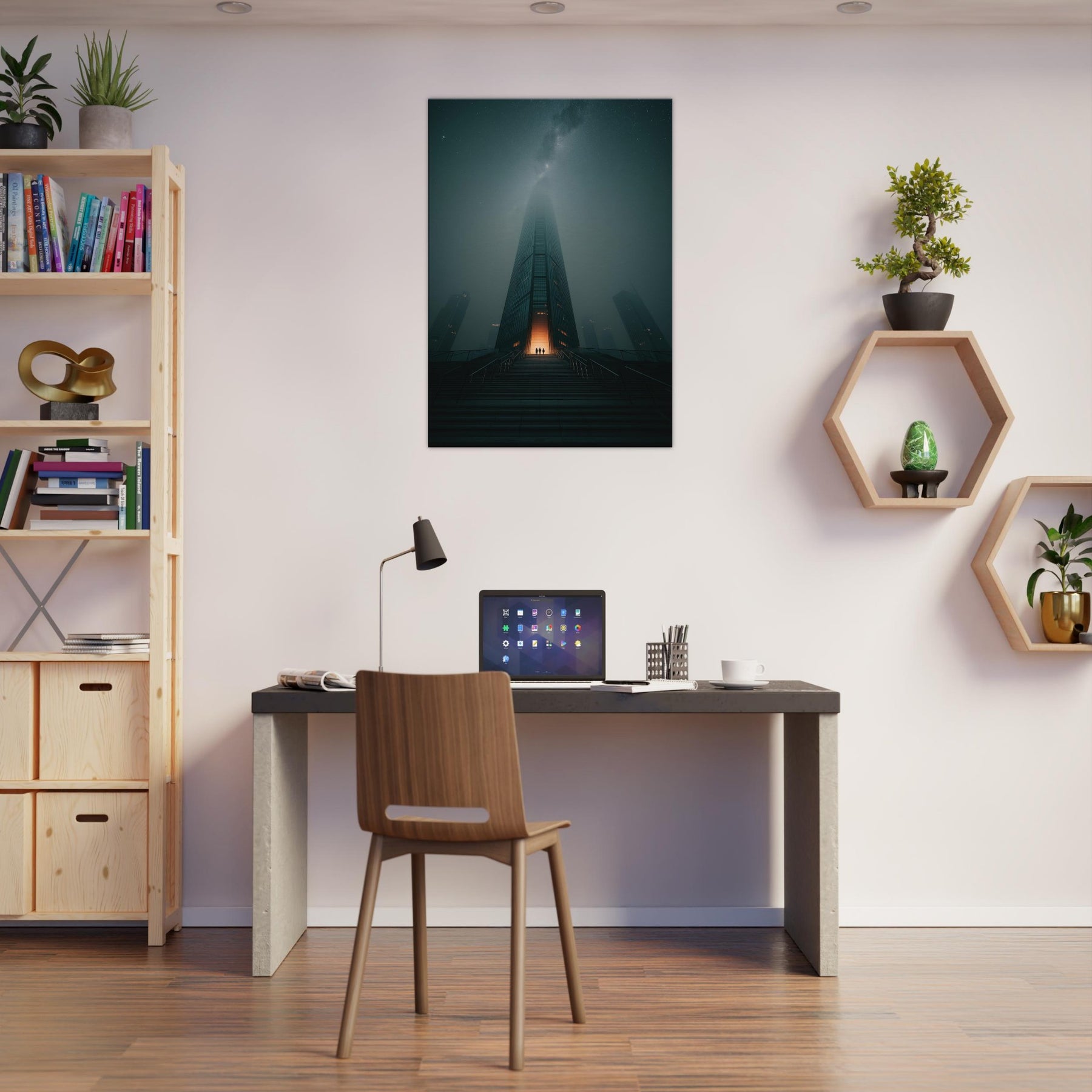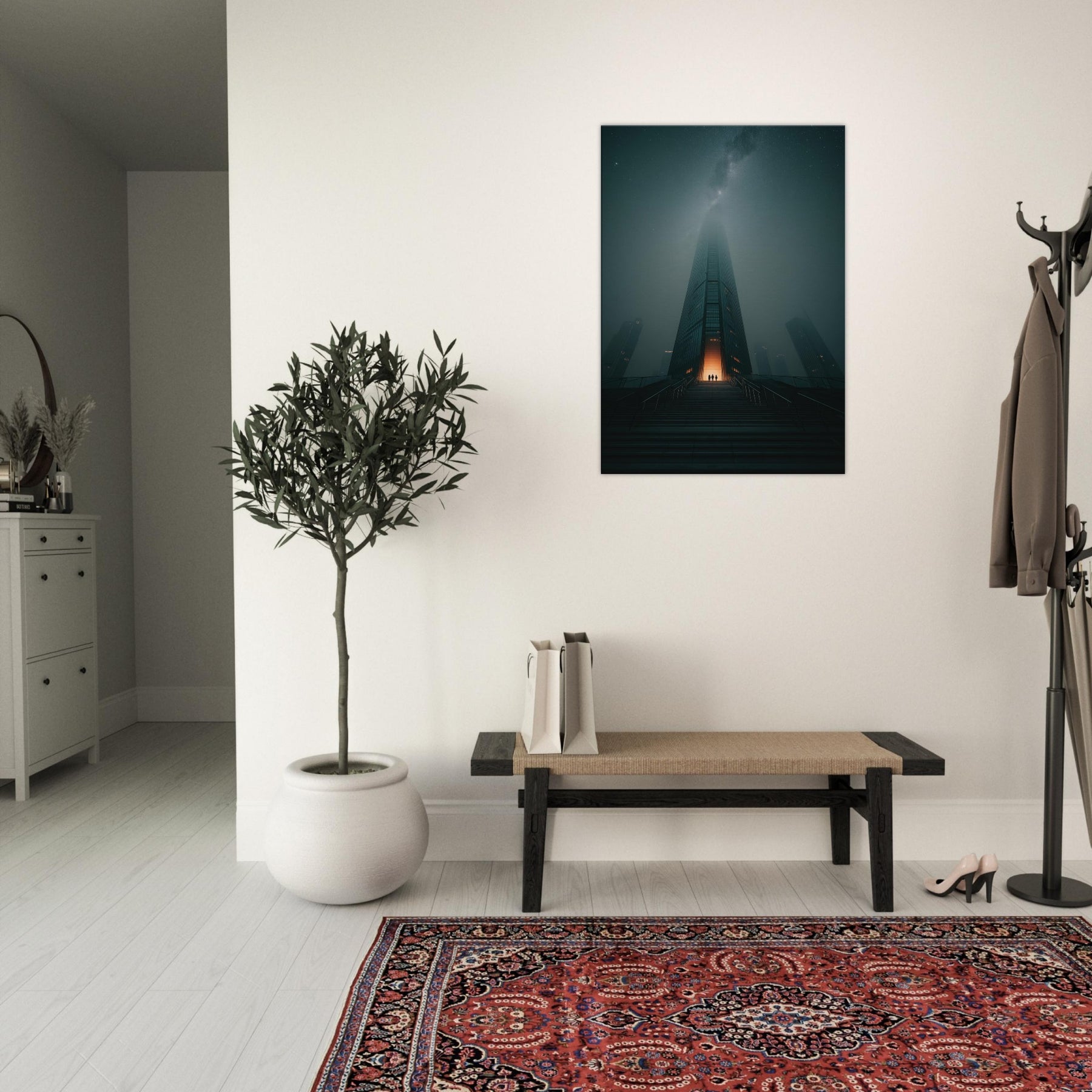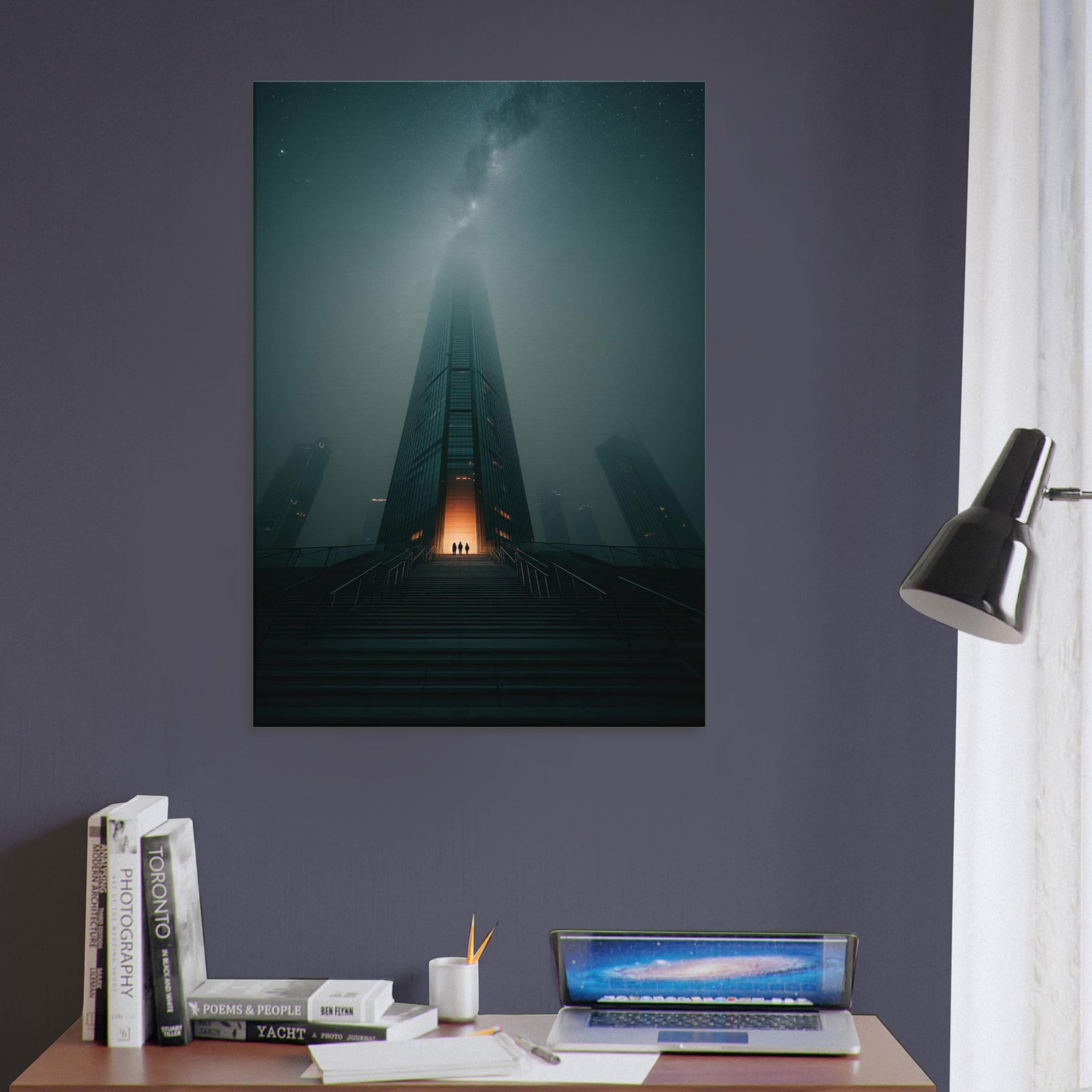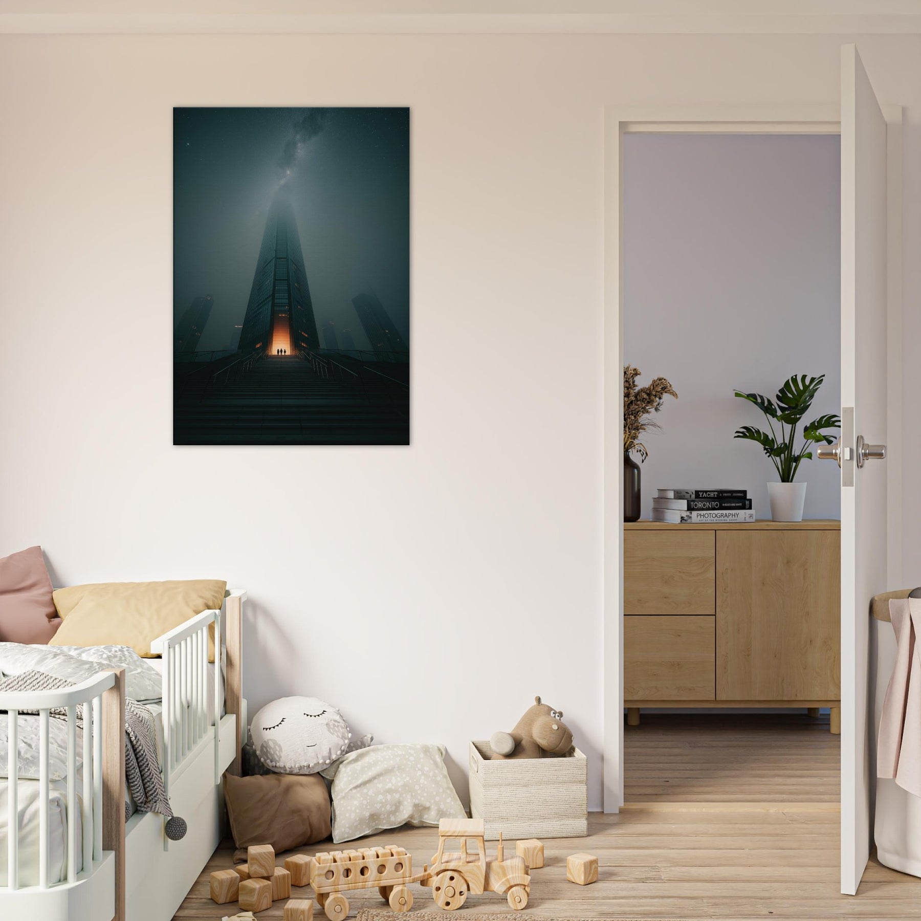 Immerse your space in the enigmatic ascent of Cairo, where a monumental tower dissolves into fog and light. This cityscape folds the skyline into a dreamlike chorus, with steps that vanish and doors that glow with ember bright warmth. The mood is cinematic, with a cool teal hush that invites quiet reflection. Hang it in a living room or entryway to anchor conversations and expand the atmosphere with mystery, scale, and a sense of infinite possibility.