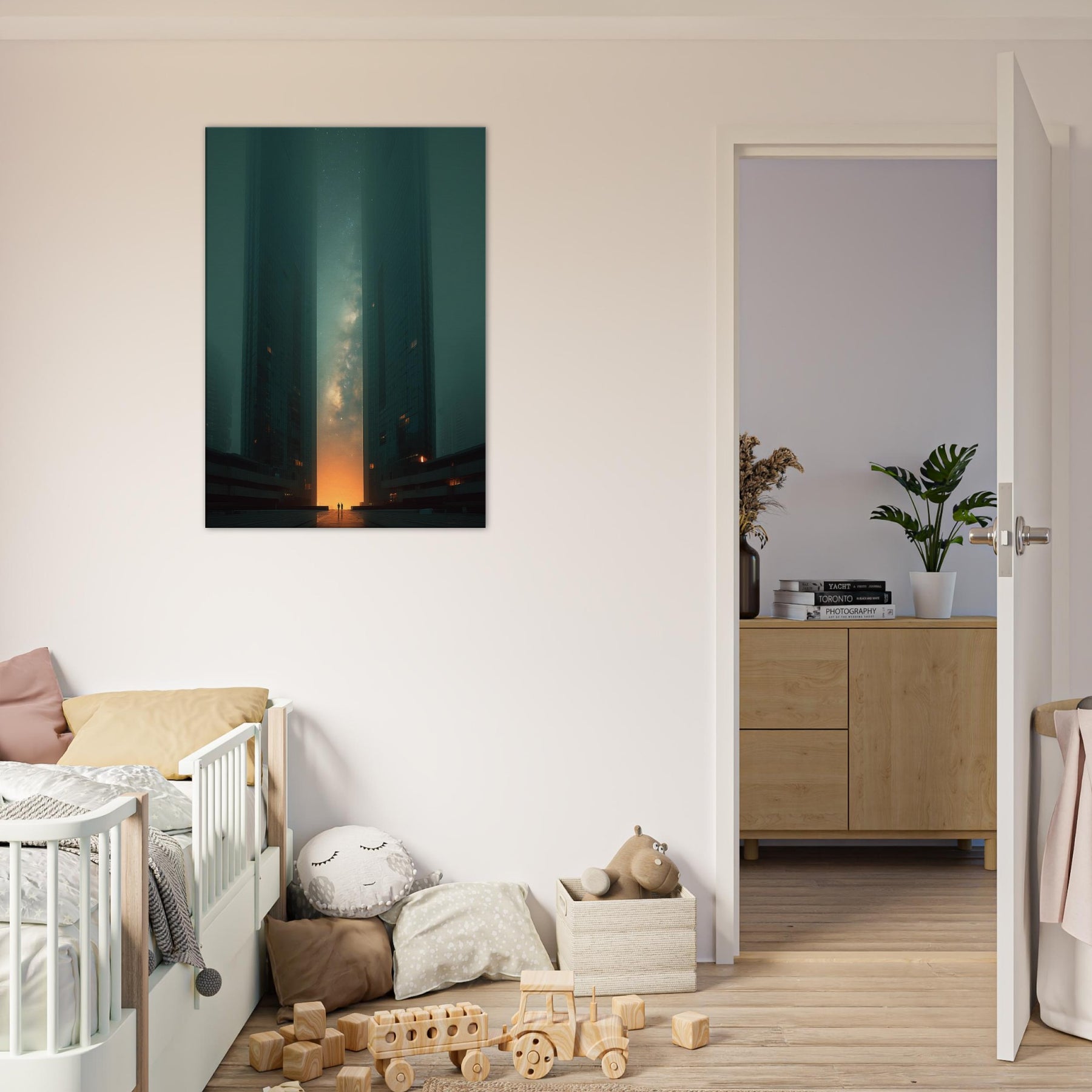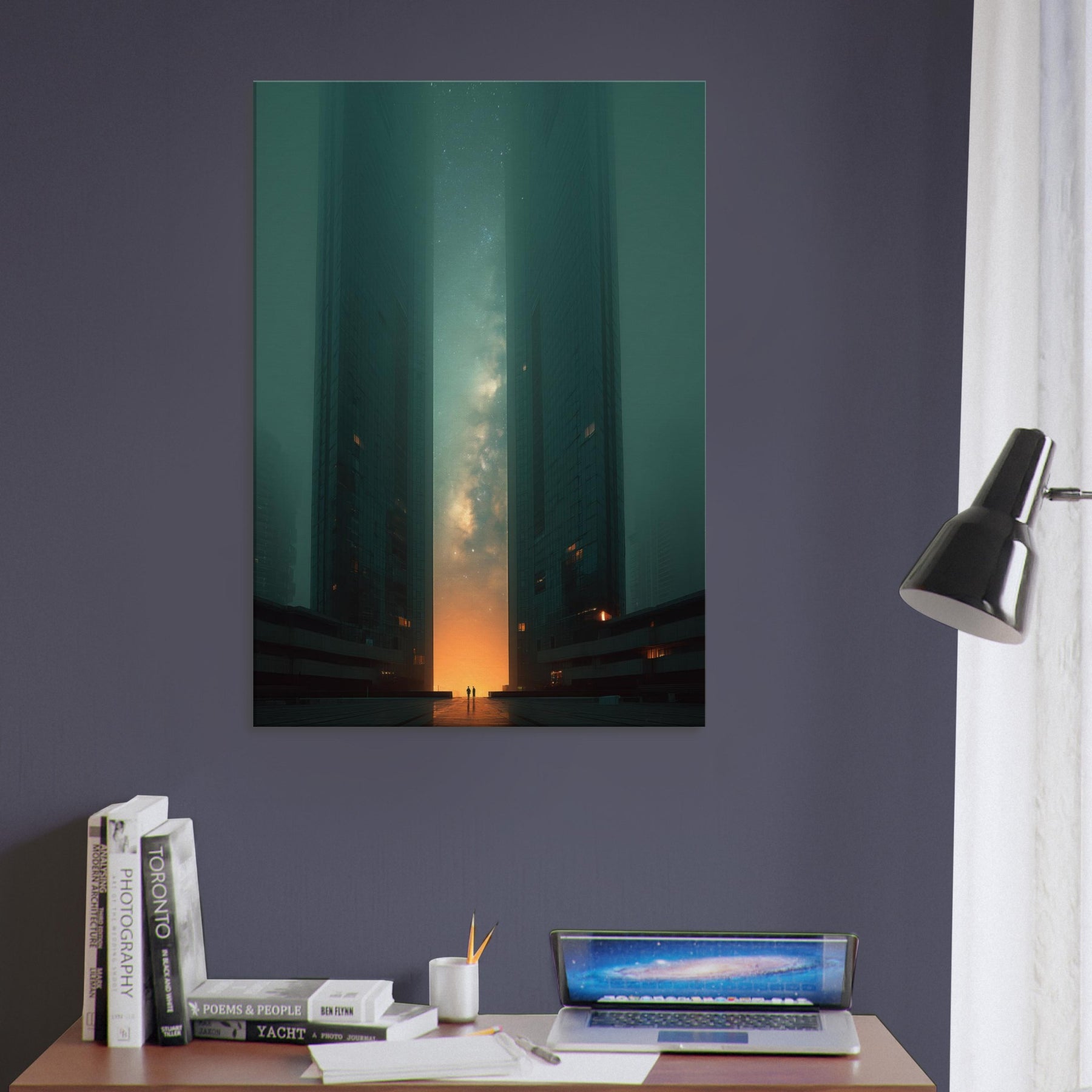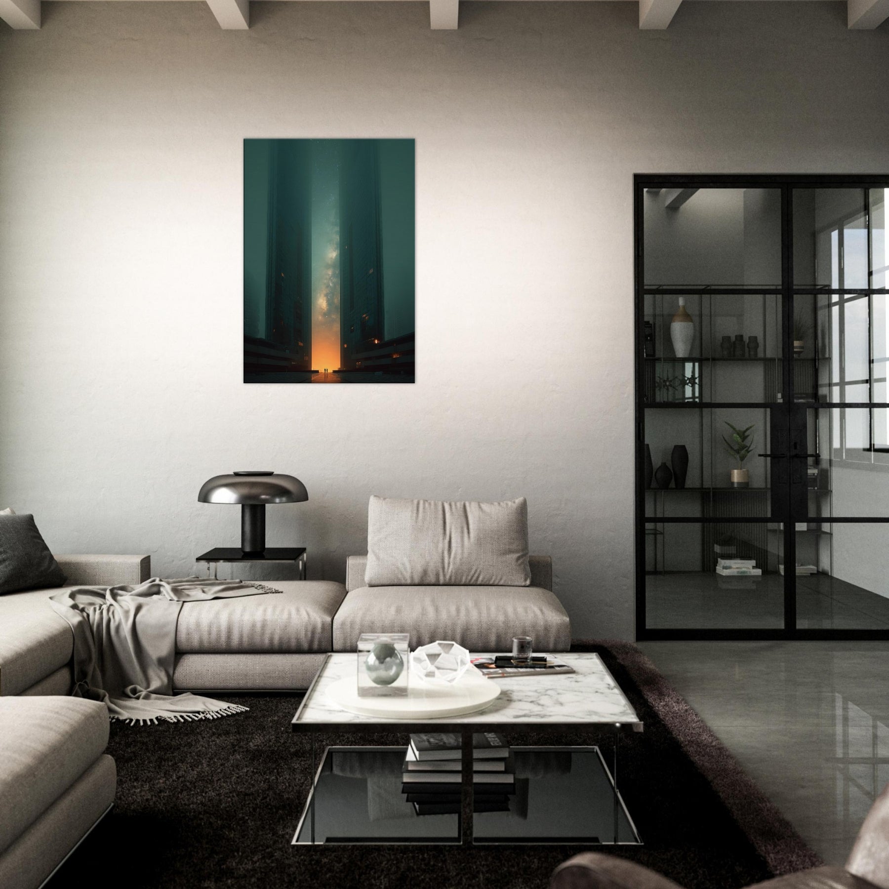 Enter a dreamlike avenue where London becomes a breath between two colossal towers. This surreal composition carves a radiant seam of sunset light through a narrow corridor, inviting the eye to wander beyond the glass and brick into a horizon that feels both intimate and unreal. The atmosphere is hushed, almost cinematic the city momentarily pausing to listen. Perfect for a living room or study, it adds depth, warmth, and a whisper of mystery to everyday interiors.