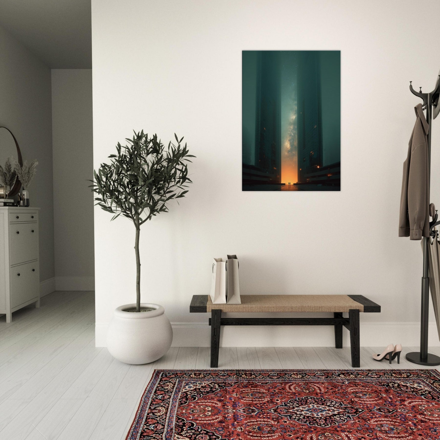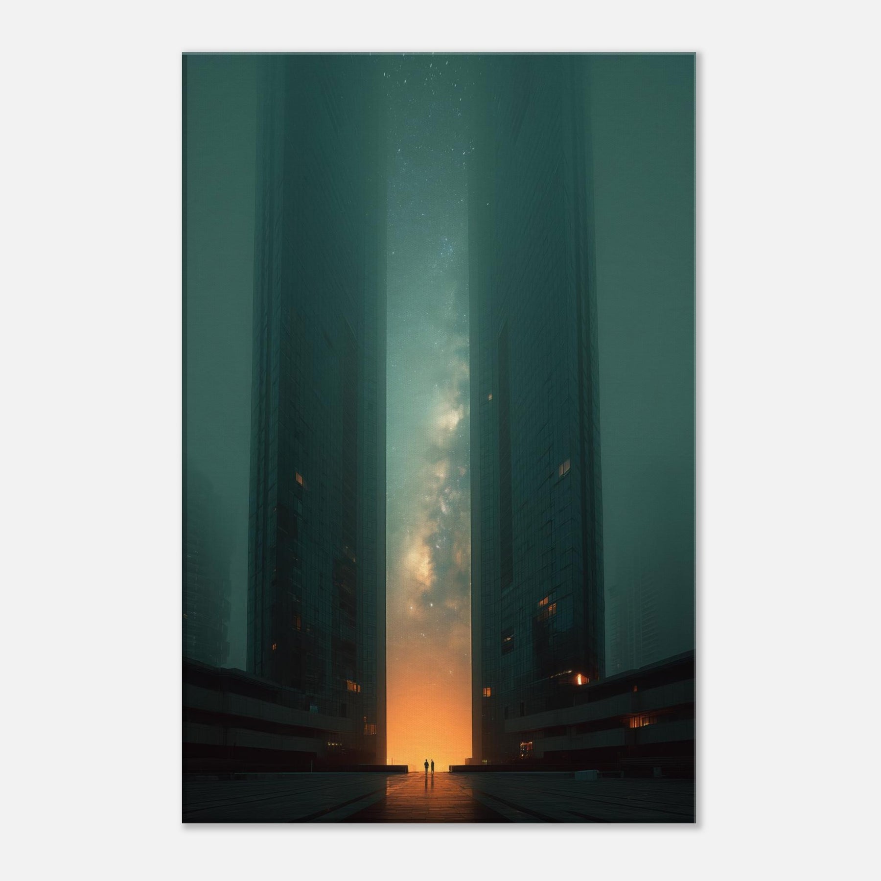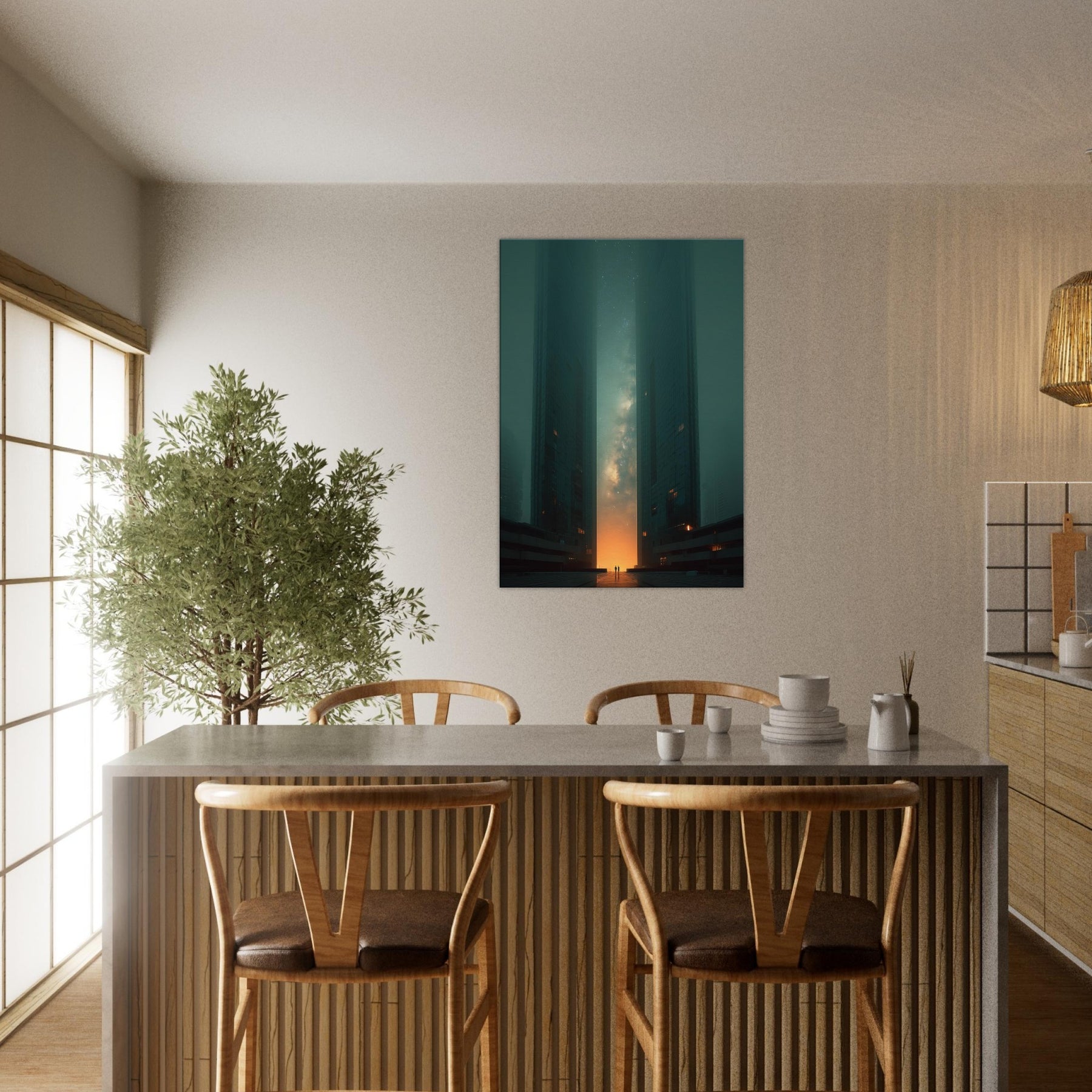 Enter a dreamlike avenue where London becomes a breath between two colossal towers. This surreal composition carves a radiant seam of sunset light through a narrow corridor, inviting the eye to wander beyond the glass and brick into a horizon that feels both intimate and unreal. The atmosphere is hushed, almost cinematic the city momentarily pausing to listen. Perfect for a living room or study, it adds depth, warmth, and a whisper of mystery to everyday interiors.