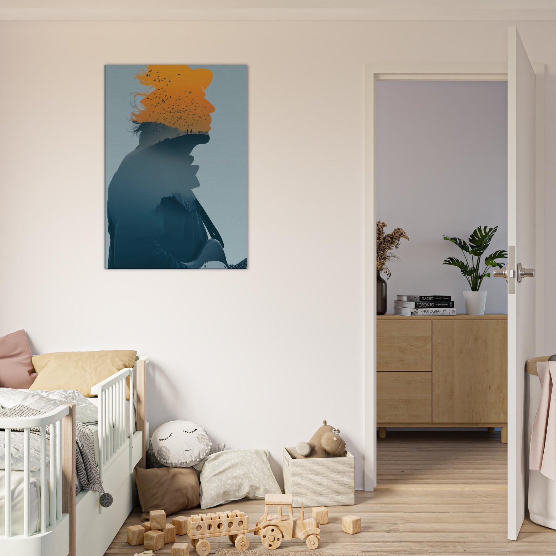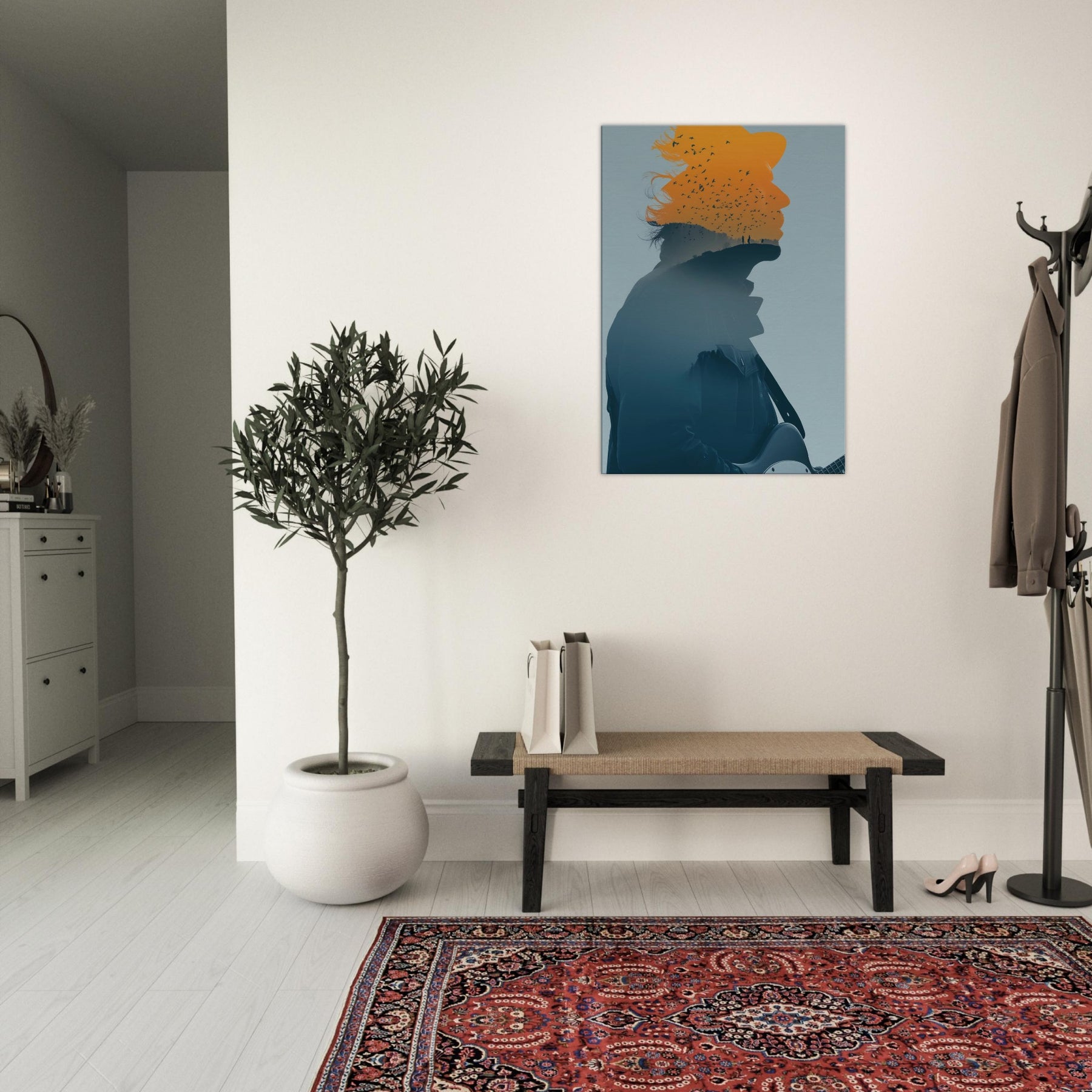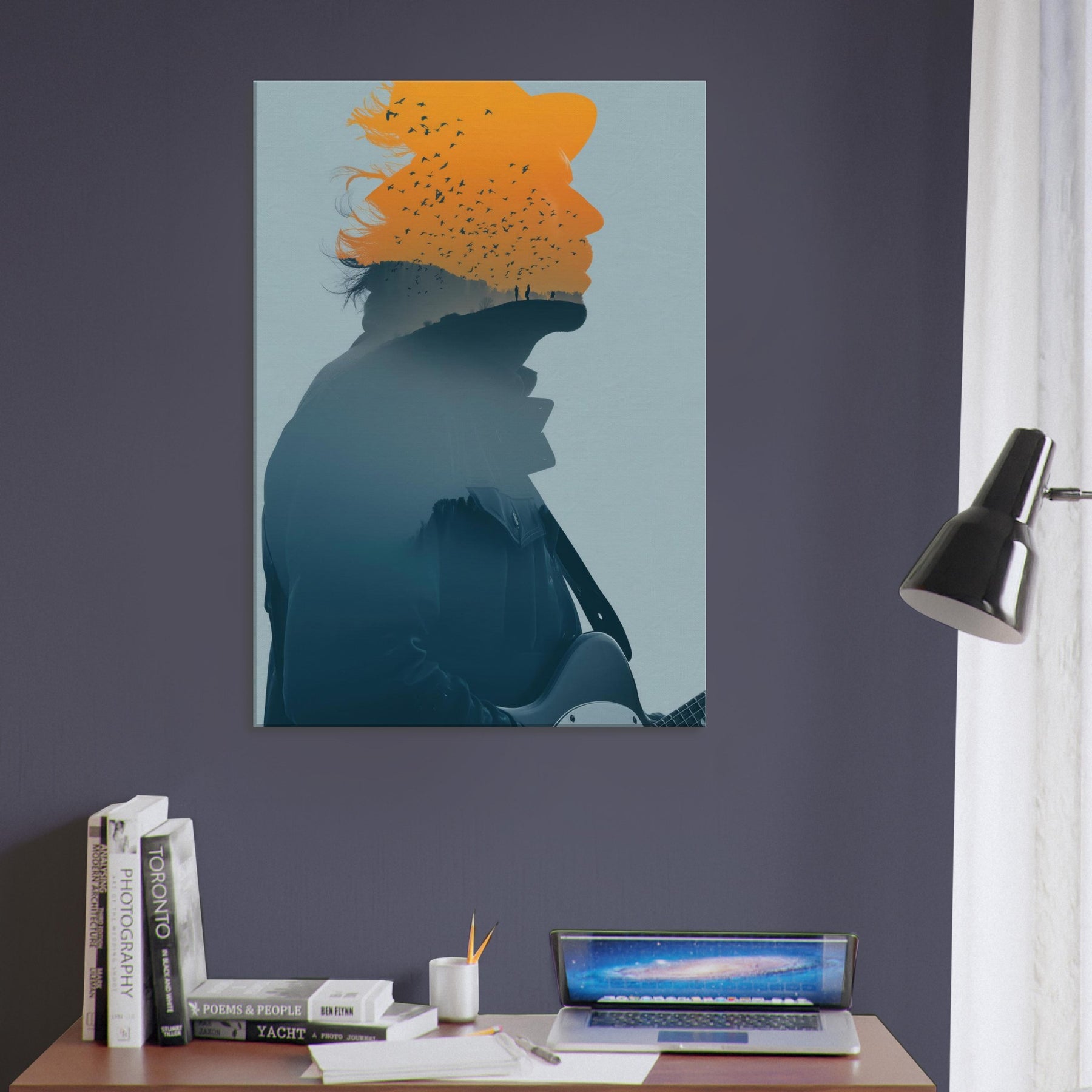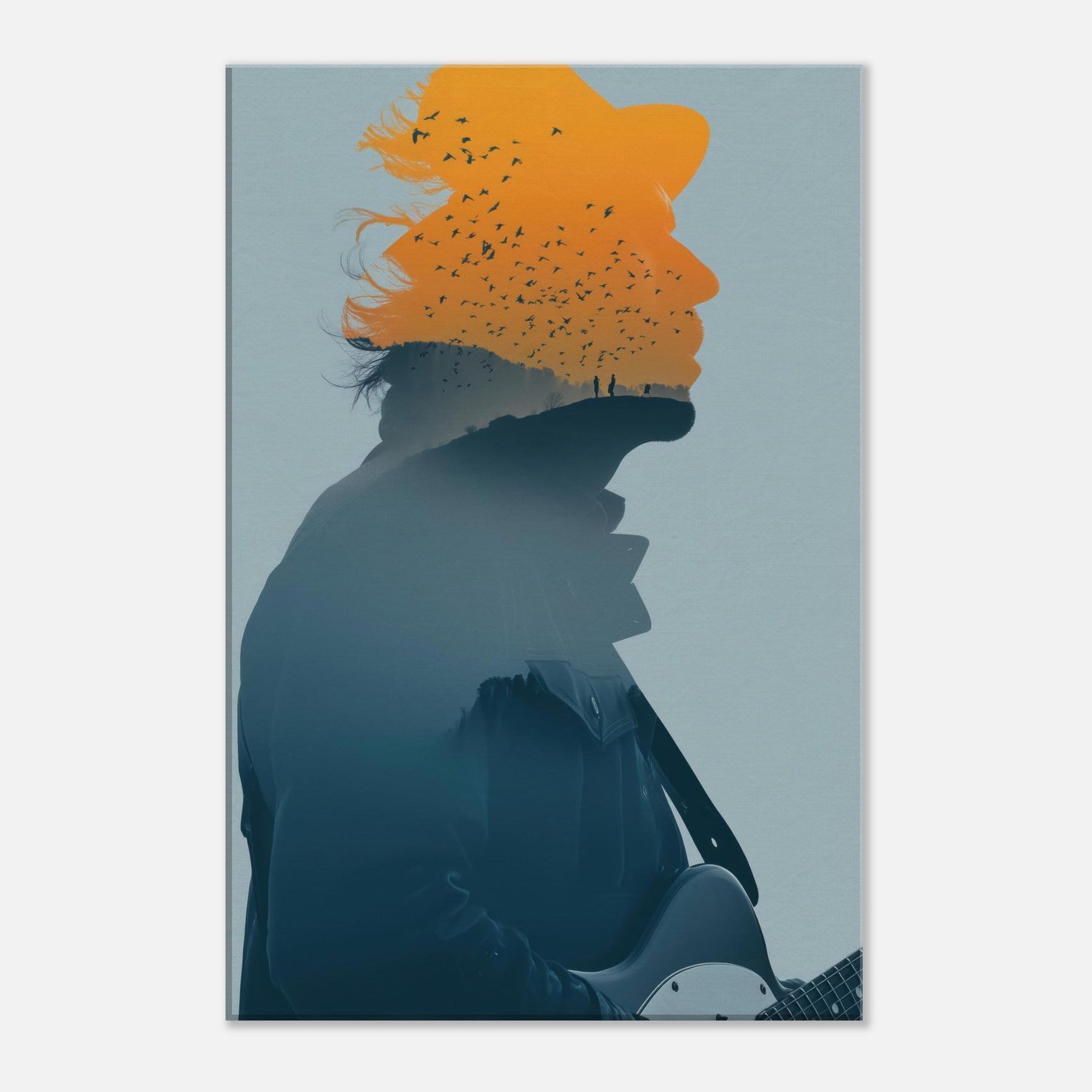 An eerie, melodic dream drapes a Guitarist in a double exposure of color and memory. Orange birds rise like a crown from the head, while the body folds into cool horizon silhouettes, a Surrealist meditation on how music becomes . The atmosphere is intimate and expansive at once, evoking dusk lit rooms and quiet galleries. This artwork lends a poetic gravity to living spaces, inviting conversation, reflection, and a soft cadence of color that enhances lounge or study walls with refined, modern elegance.