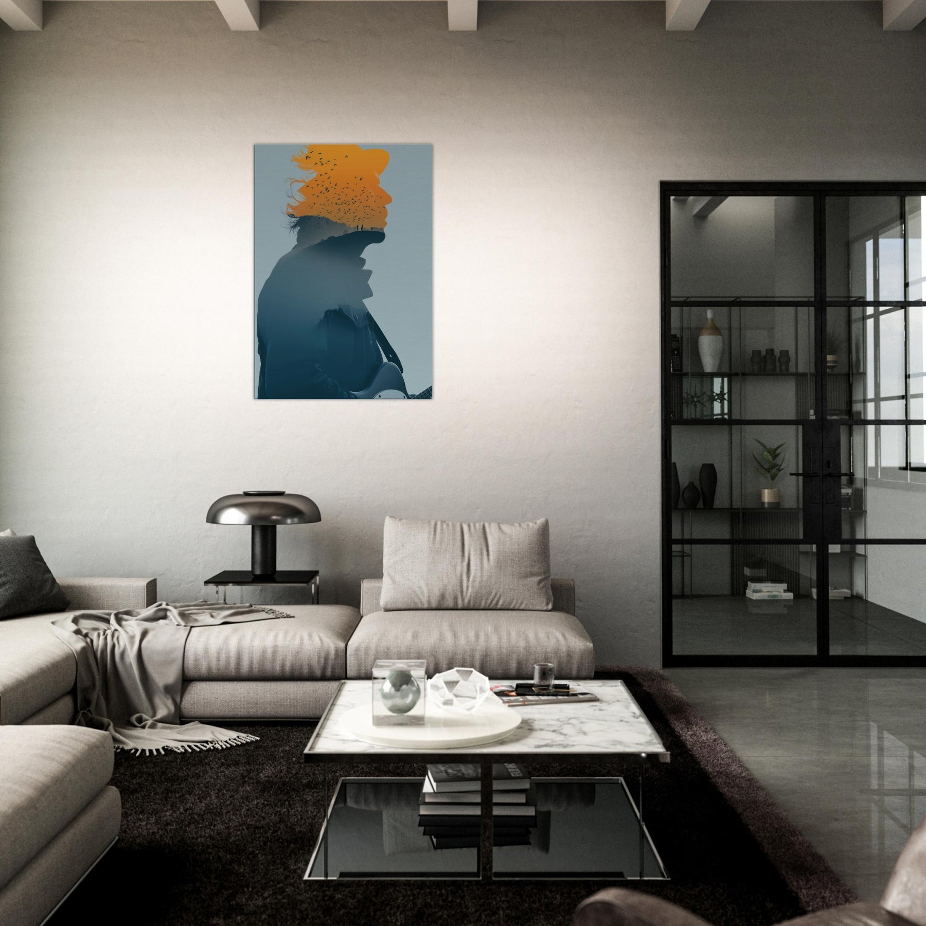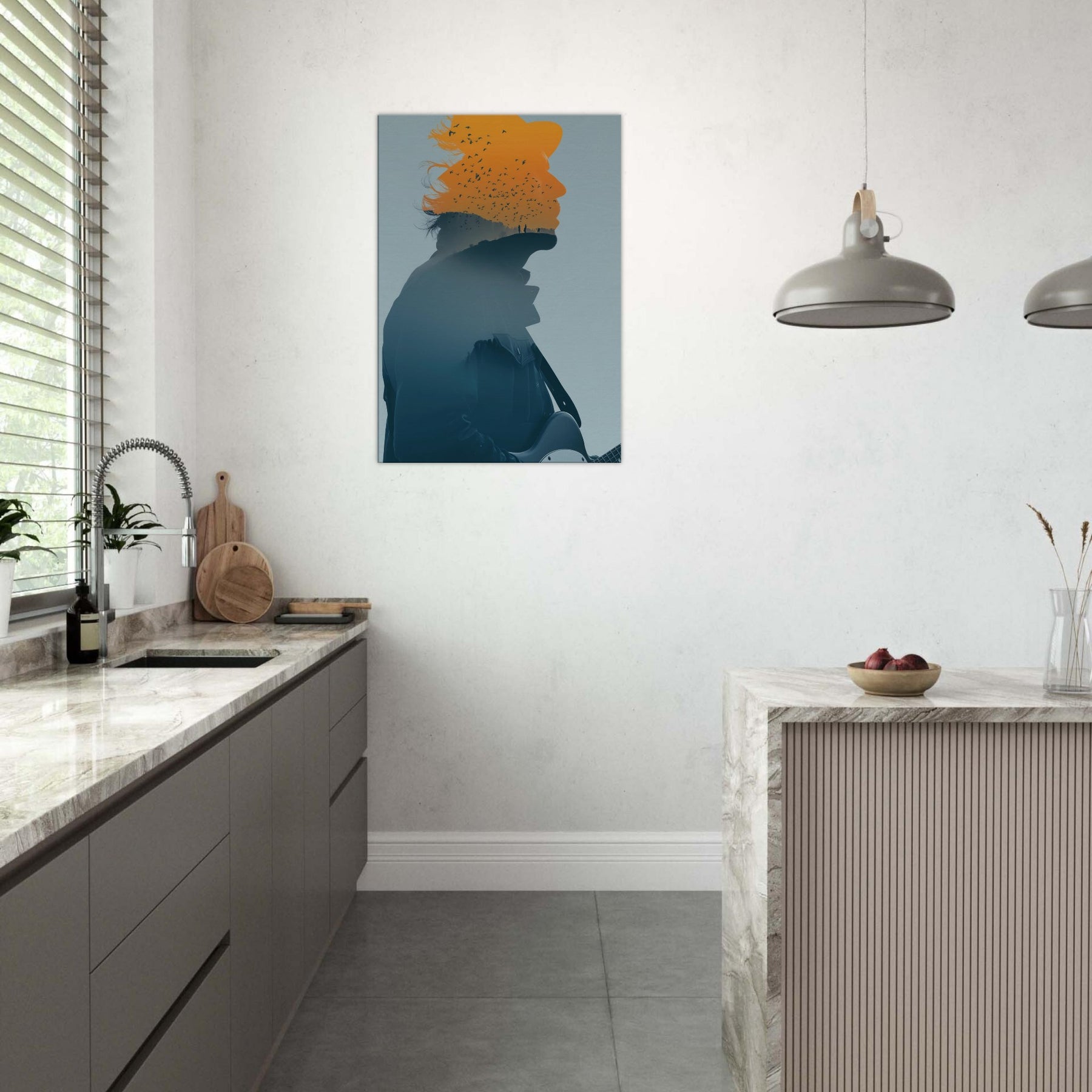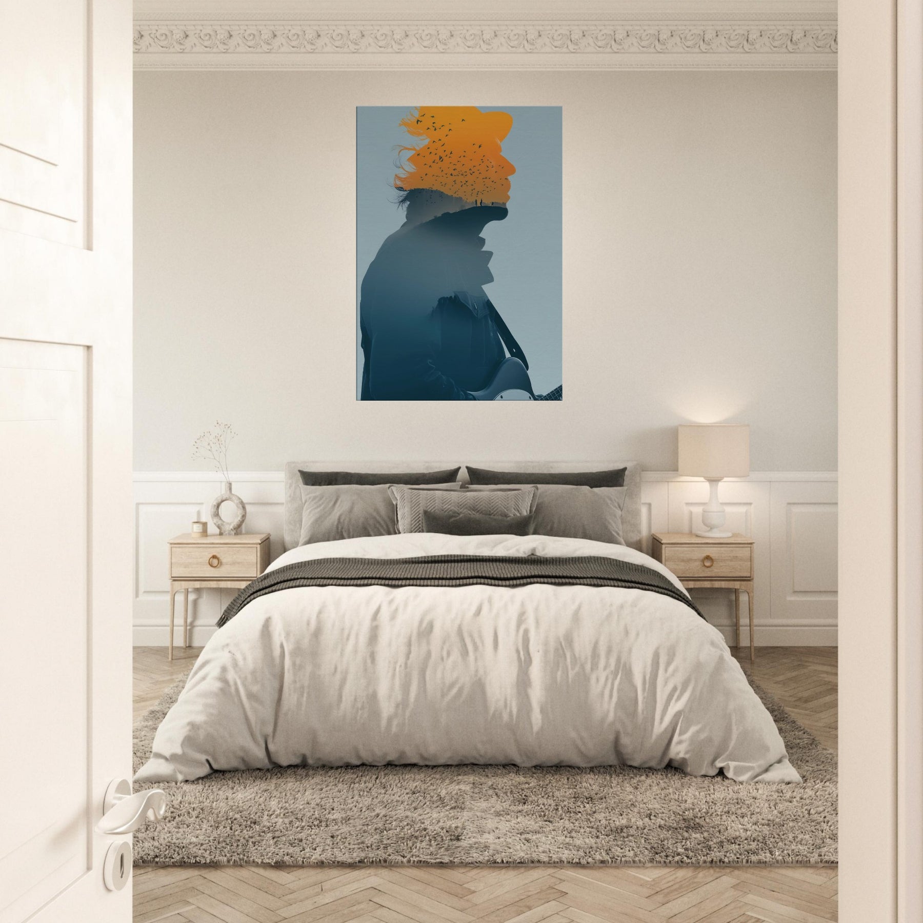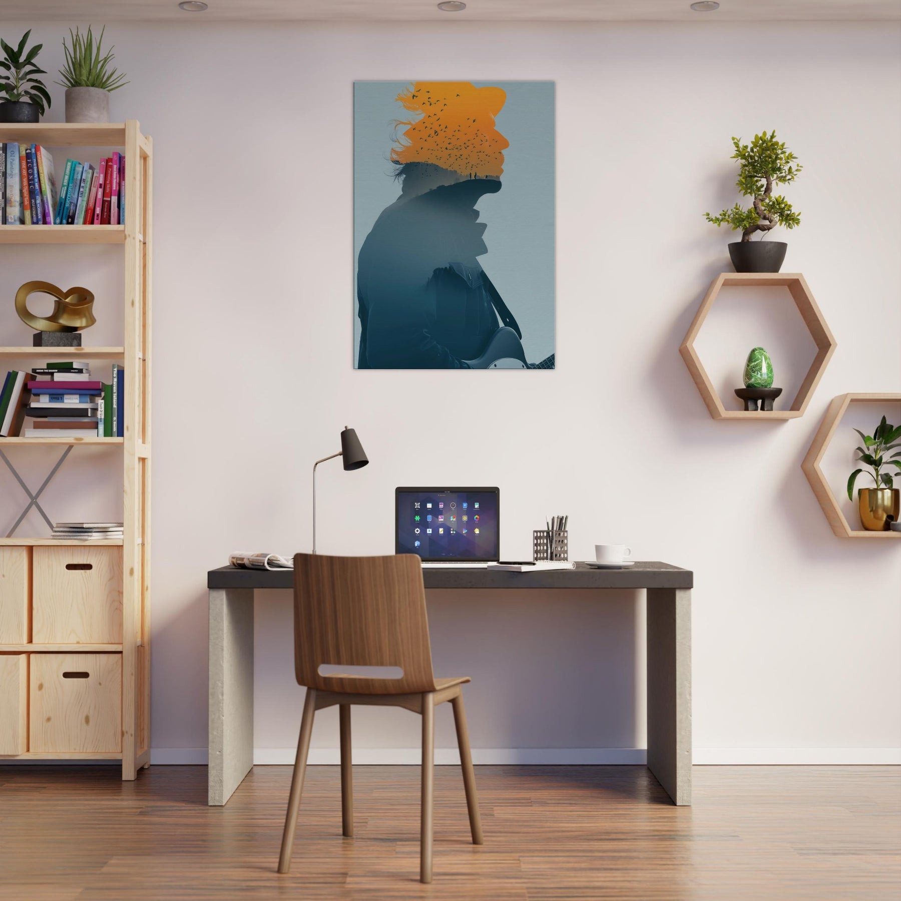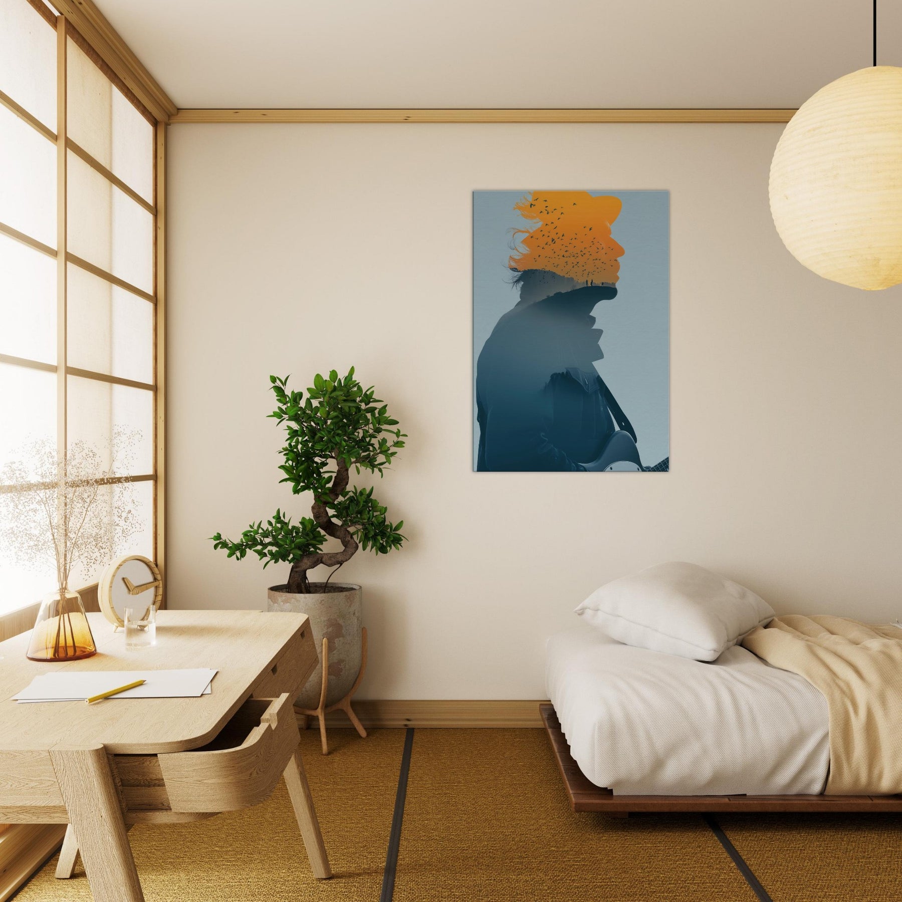 An eerie, melodic dream drapes a Guitarist in a double exposure of color and memory. Orange birds rise like a crown from the head, while the body folds into cool horizon silhouettes, a Surrealist meditation on how music becomes . The atmosphere is intimate and expansive at once, evoking dusk lit rooms and quiet galleries. This artwork lends a poetic gravity to living spaces, inviting conversation, reflection, and a soft cadence of color that enhances lounge or study walls with refined, modern elegance.