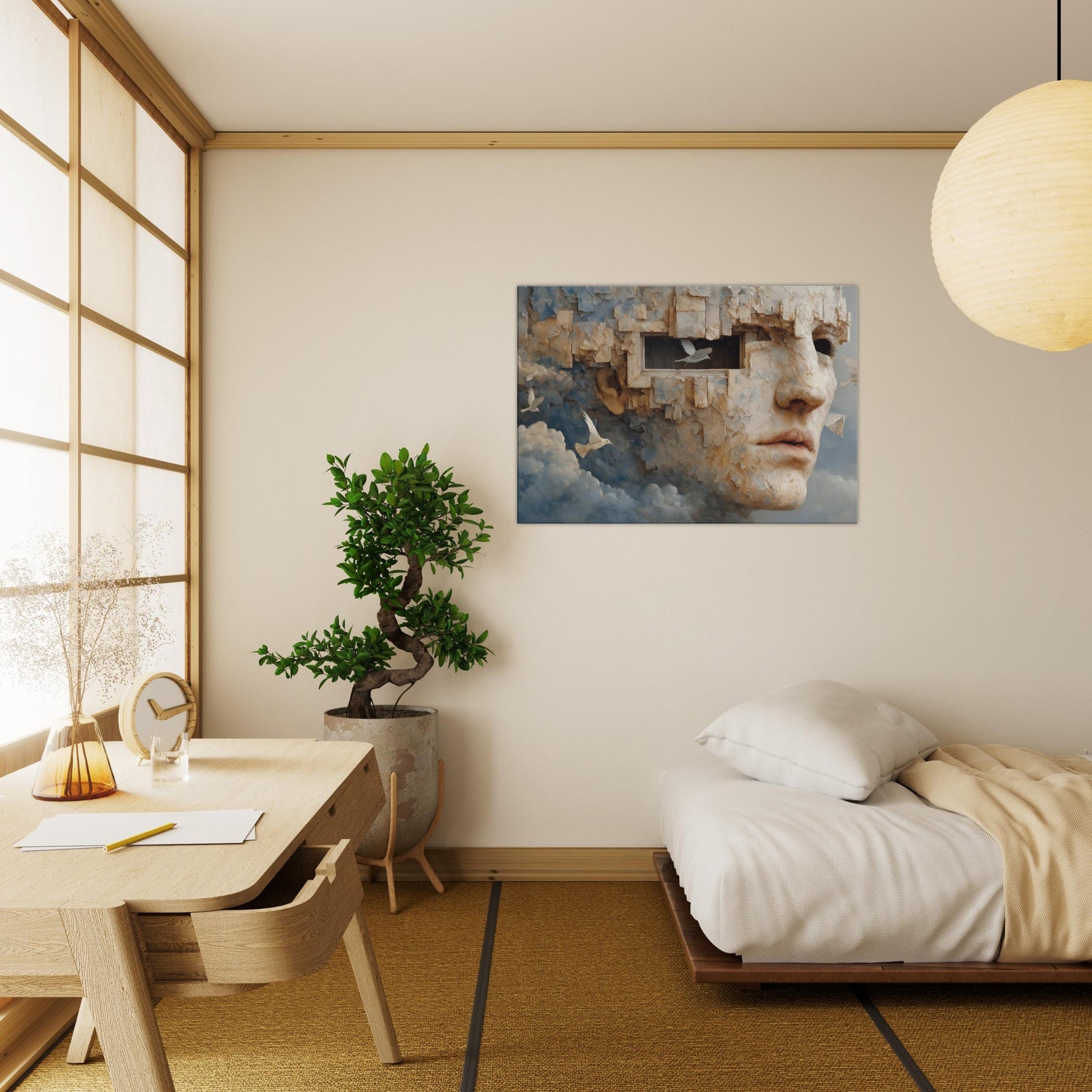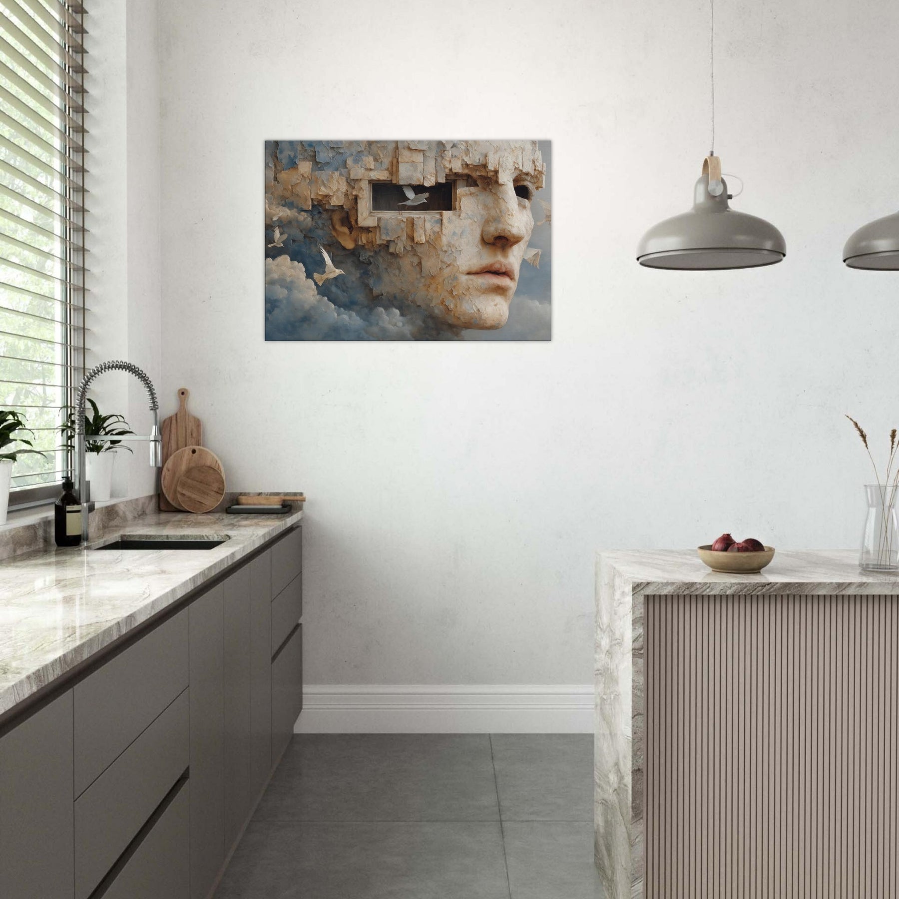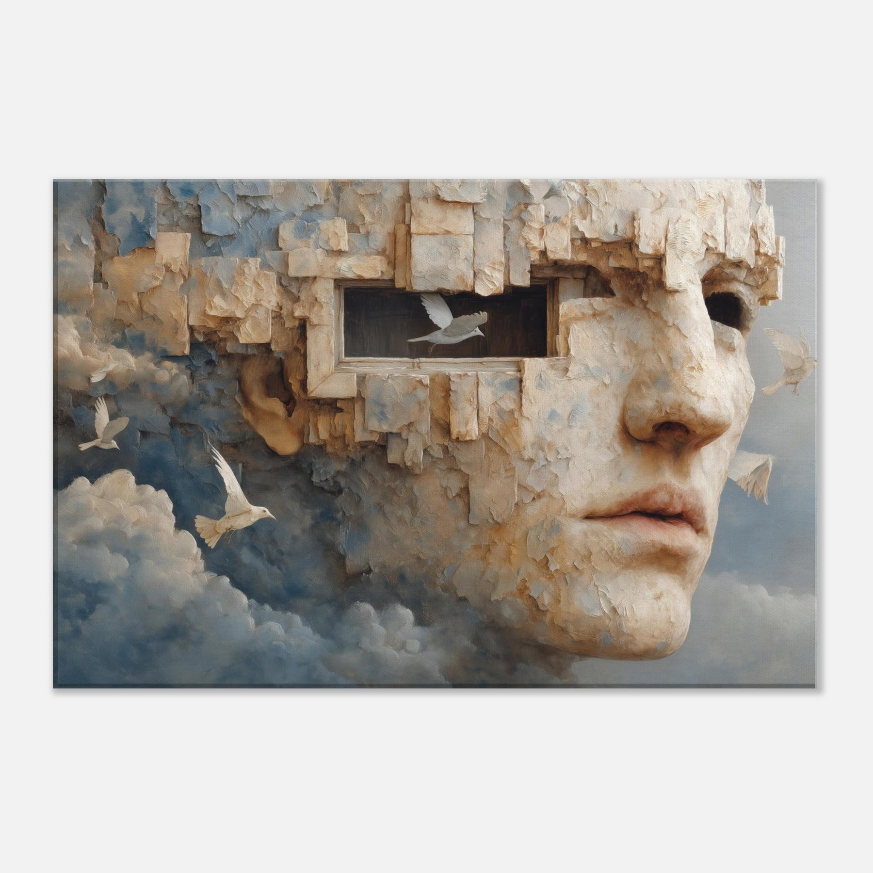 A dreamlike fusion of memory and stone, this piece folds a face into limestone bricks, as if remembering and forgetting breathe together. The Primary Subject, Cubist Face, emerges from cloud and cliff, inviting quiet reflection and a personal dialogue with the room. Light gilds its textured surface, turning gaps into windows and windows into whispers. Placed in a living room or study, it lends a surreal stillness, a warm, contemplative atmosphere that heightens color, texture, and mood, making everyday spaces feel like a quiet, cinematic horizon.