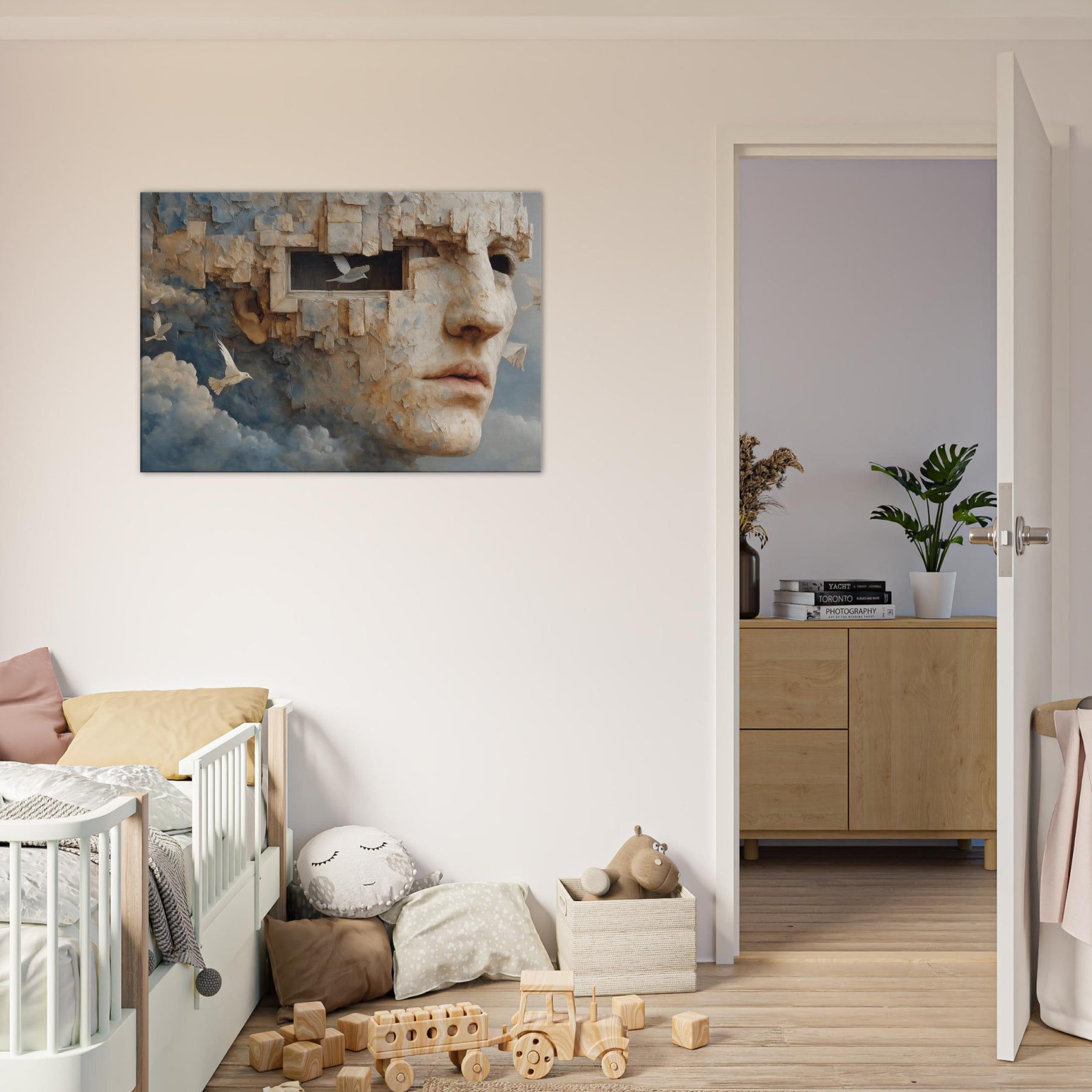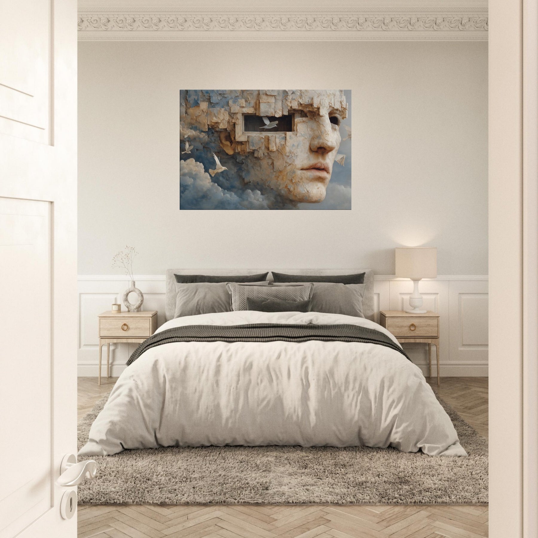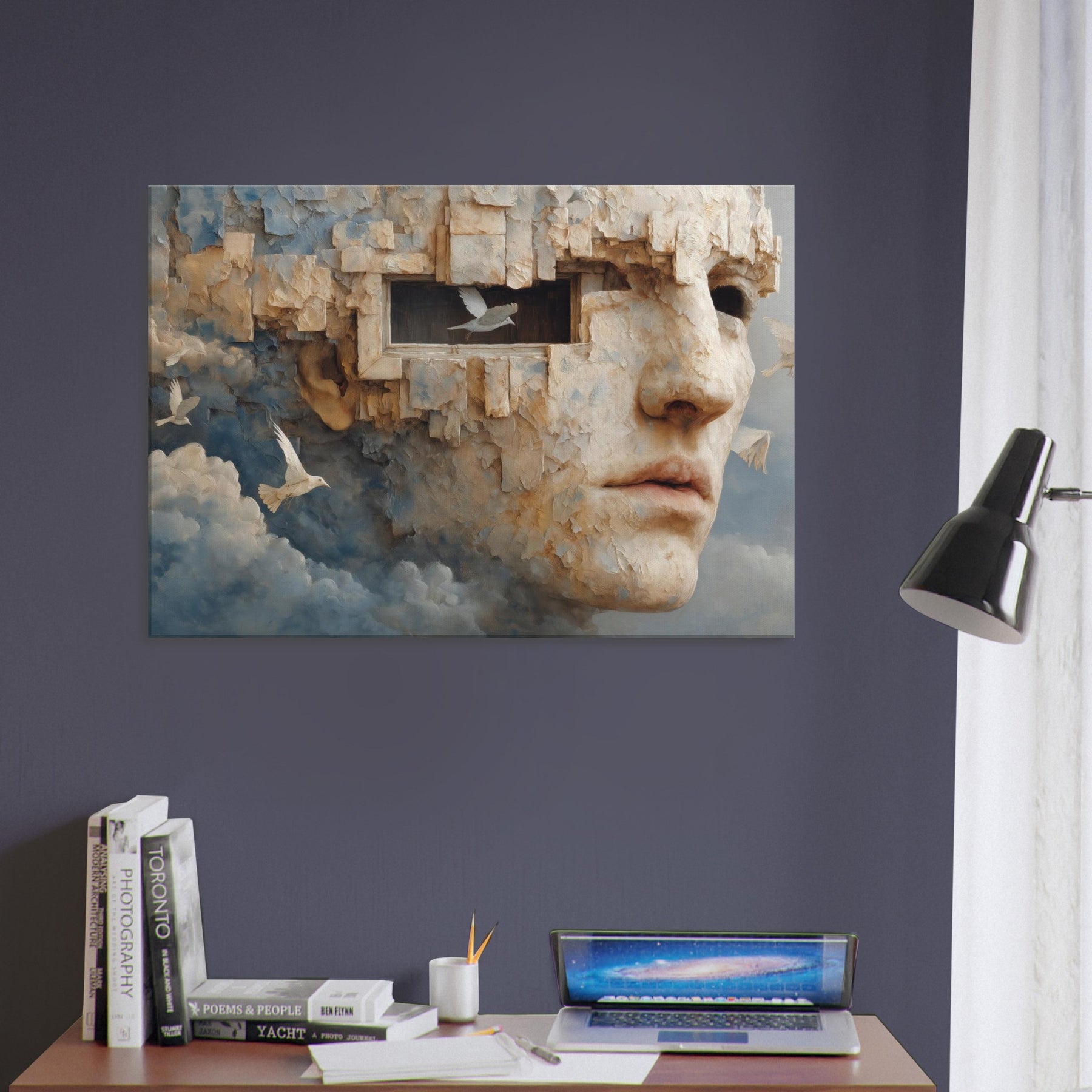 A dreamlike fusion of memory and stone, this piece folds a face into limestone bricks, as if remembering and forgetting breathe together. The Primary Subject, Cubist Face, emerges from cloud and cliff, inviting quiet reflection and a personal dialogue with the room. Light gilds its textured surface, turning gaps into windows and windows into whispers. Placed in a living room or study, it lends a surreal stillness, a warm, contemplative atmosphere that heightens color, texture, and mood, making everyday spaces feel like a quiet, cinematic horizon.
