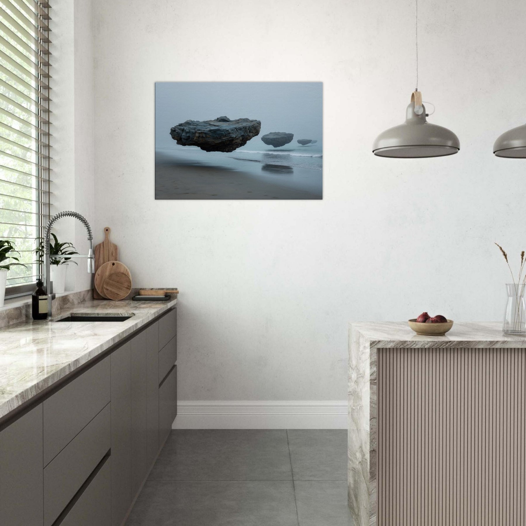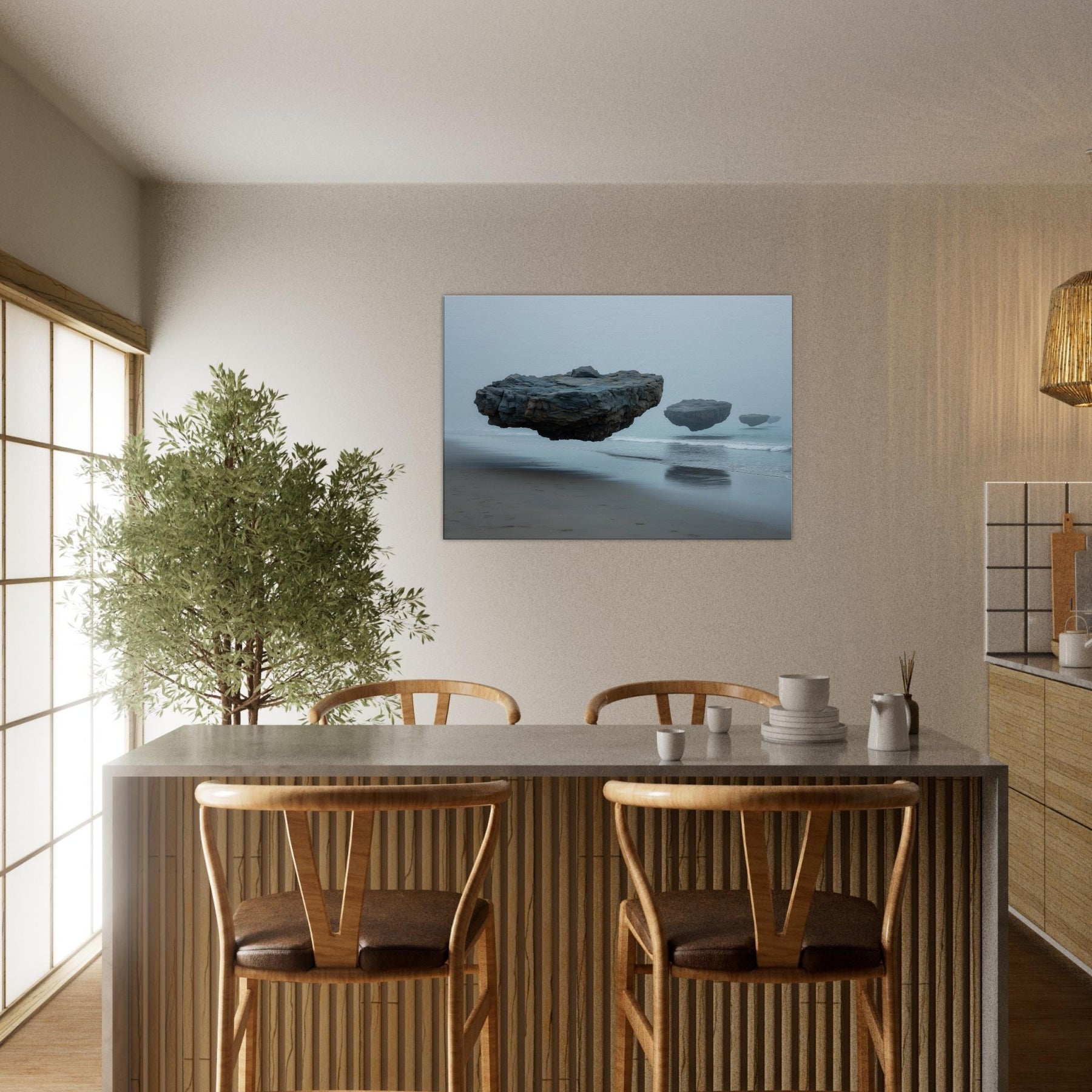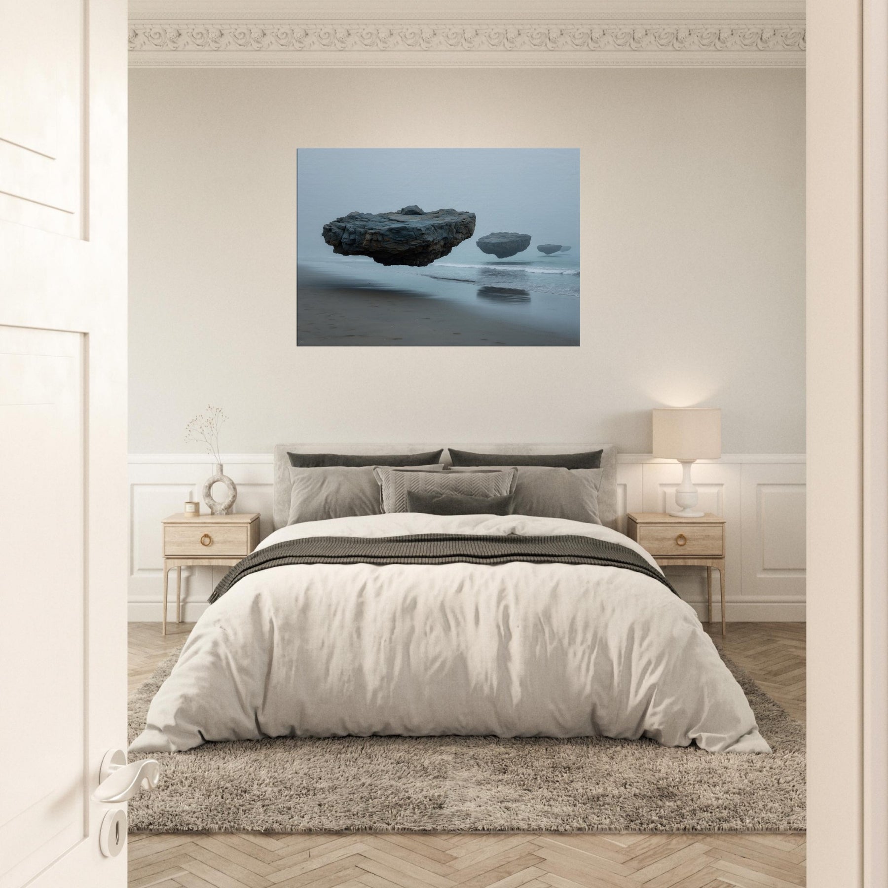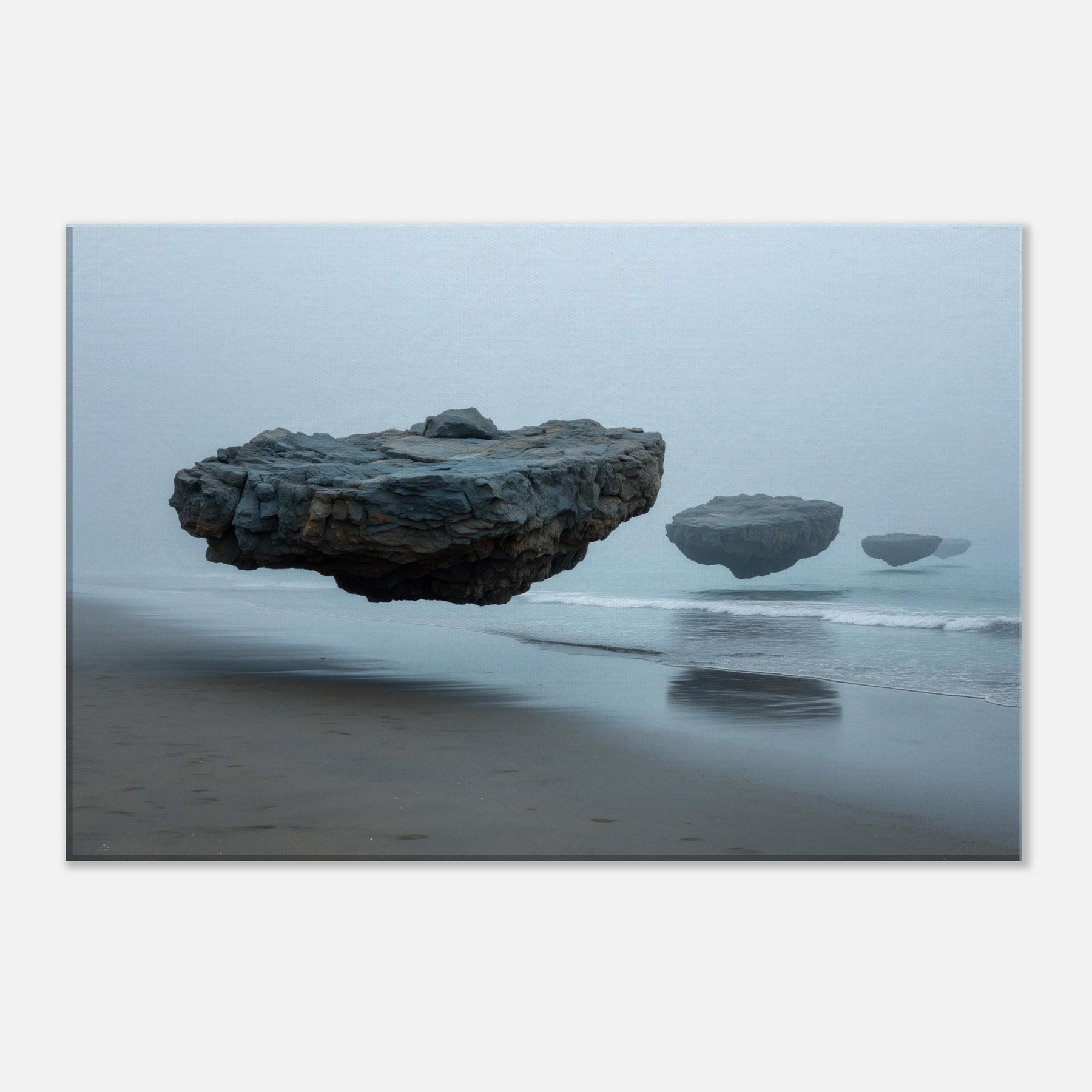 In this dreamlike scene, a quiet shoreline becomes a stage for gravity defying rock forms. Surreal, yet tender, the Beach flickers between memory and omen as colossal stones hover above the foaming edges, casting soft reflections on wet sand. The cool, misty palette invites contemplation, turning your living space into a harbor of calm where conversations drift like tide pools. Perfect for a serene corner or gallery wall that needs a breath of otherworldly nature.