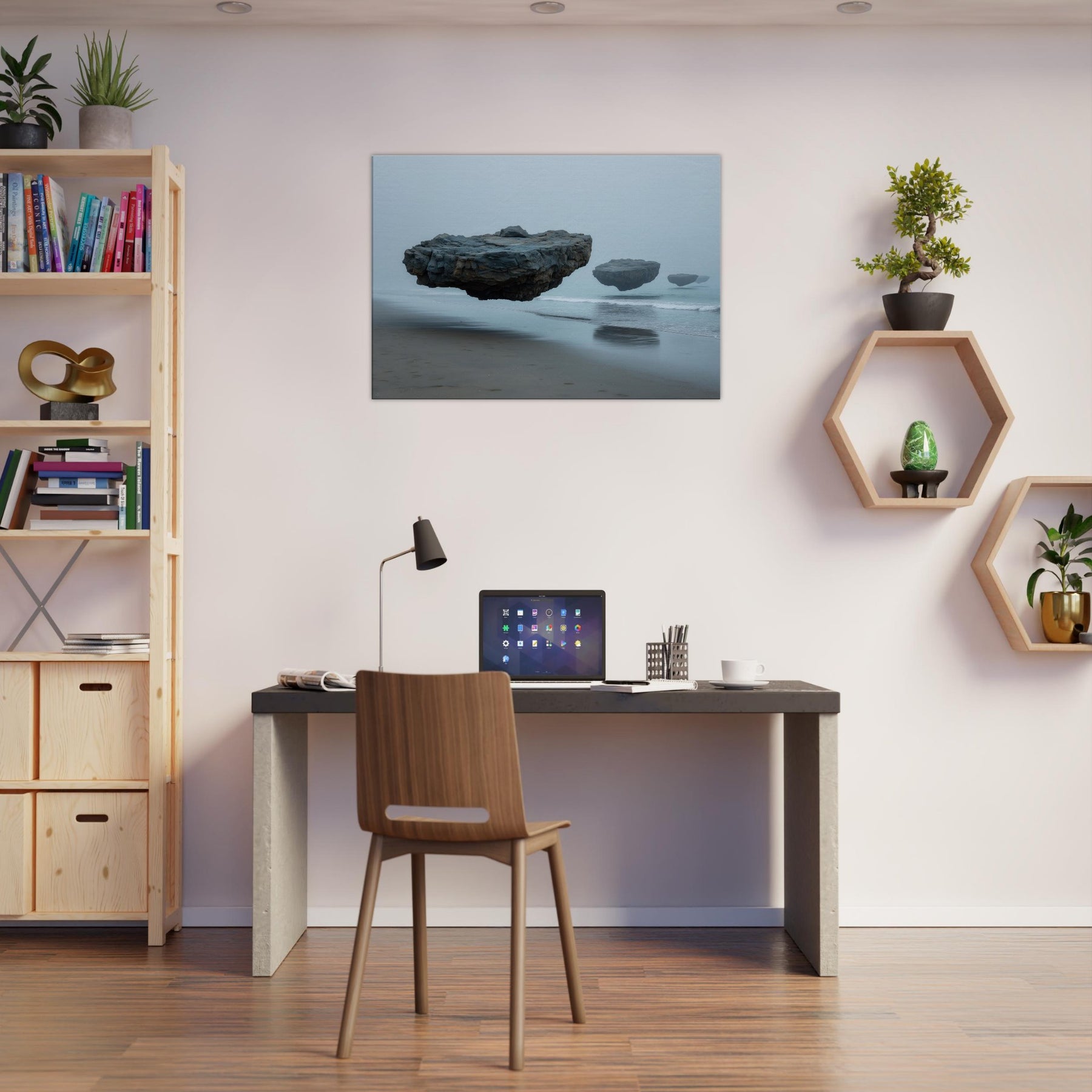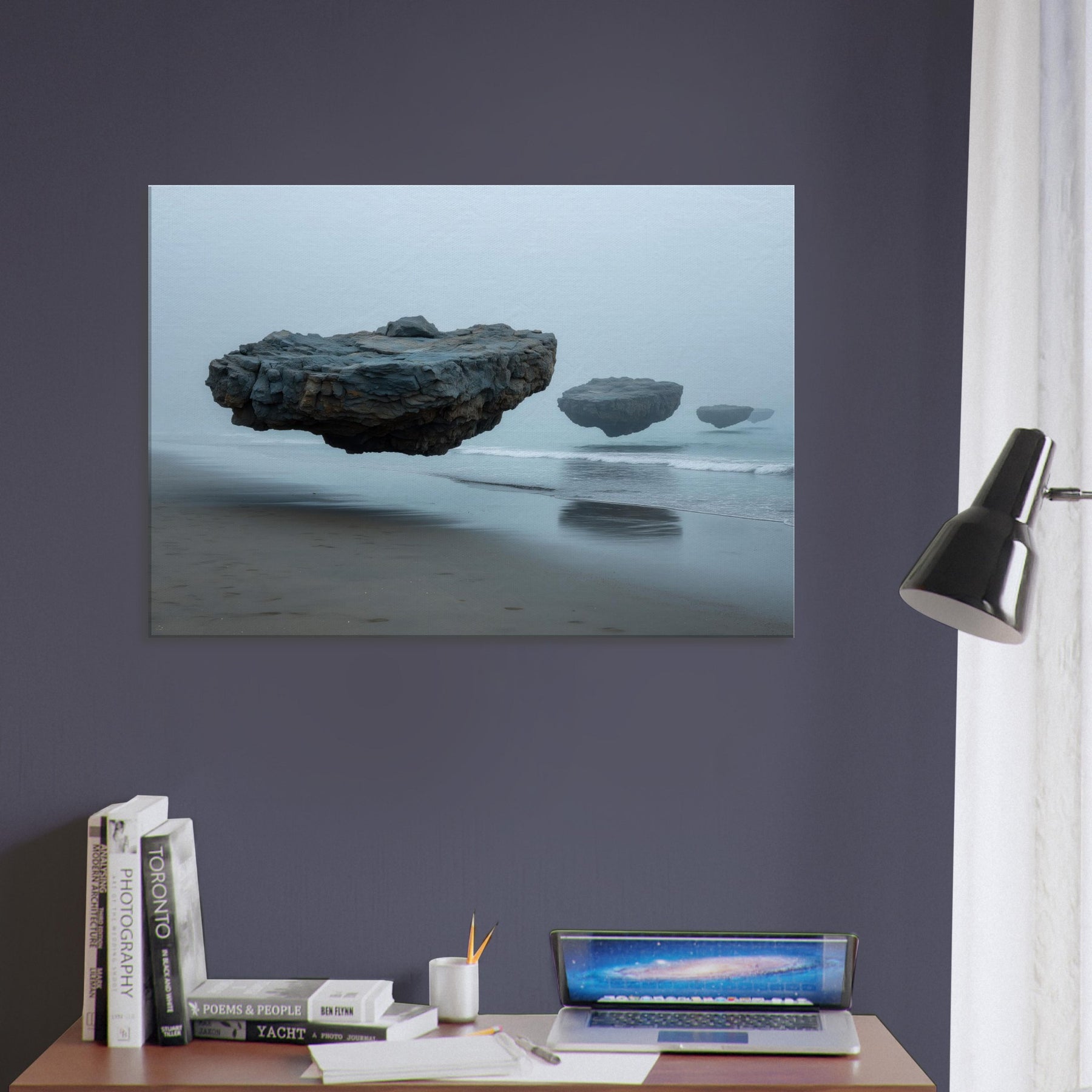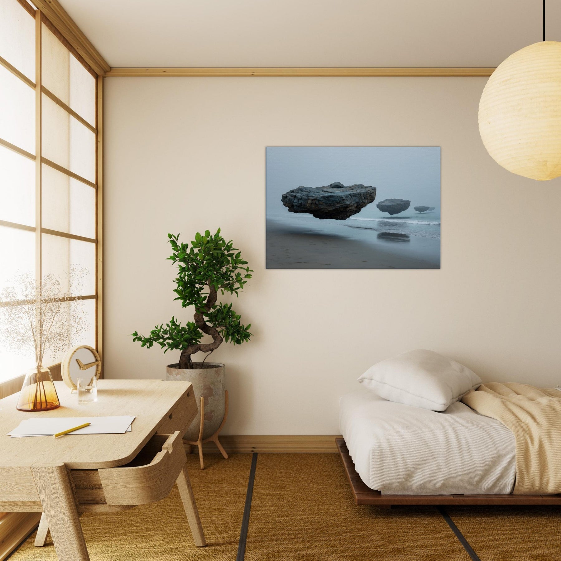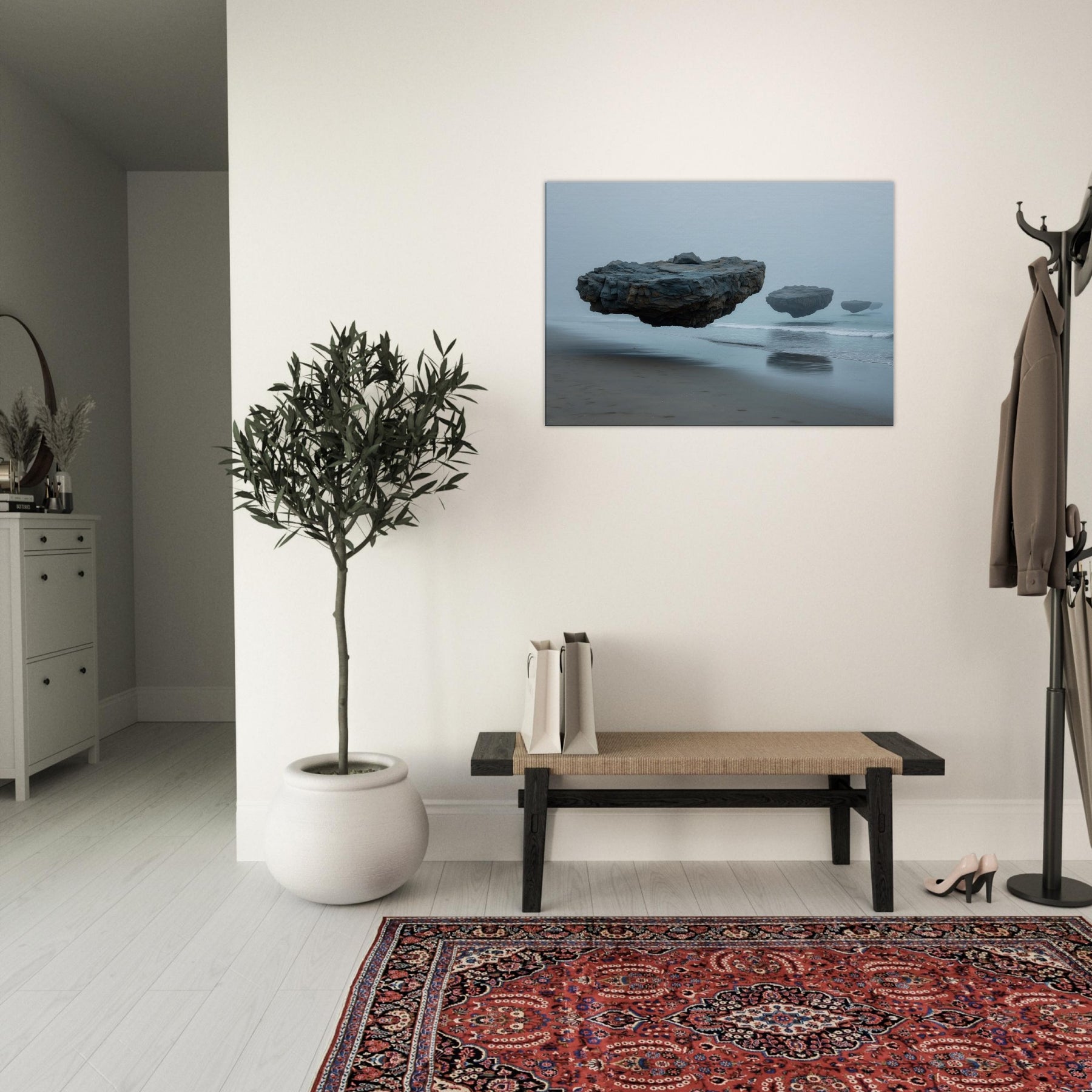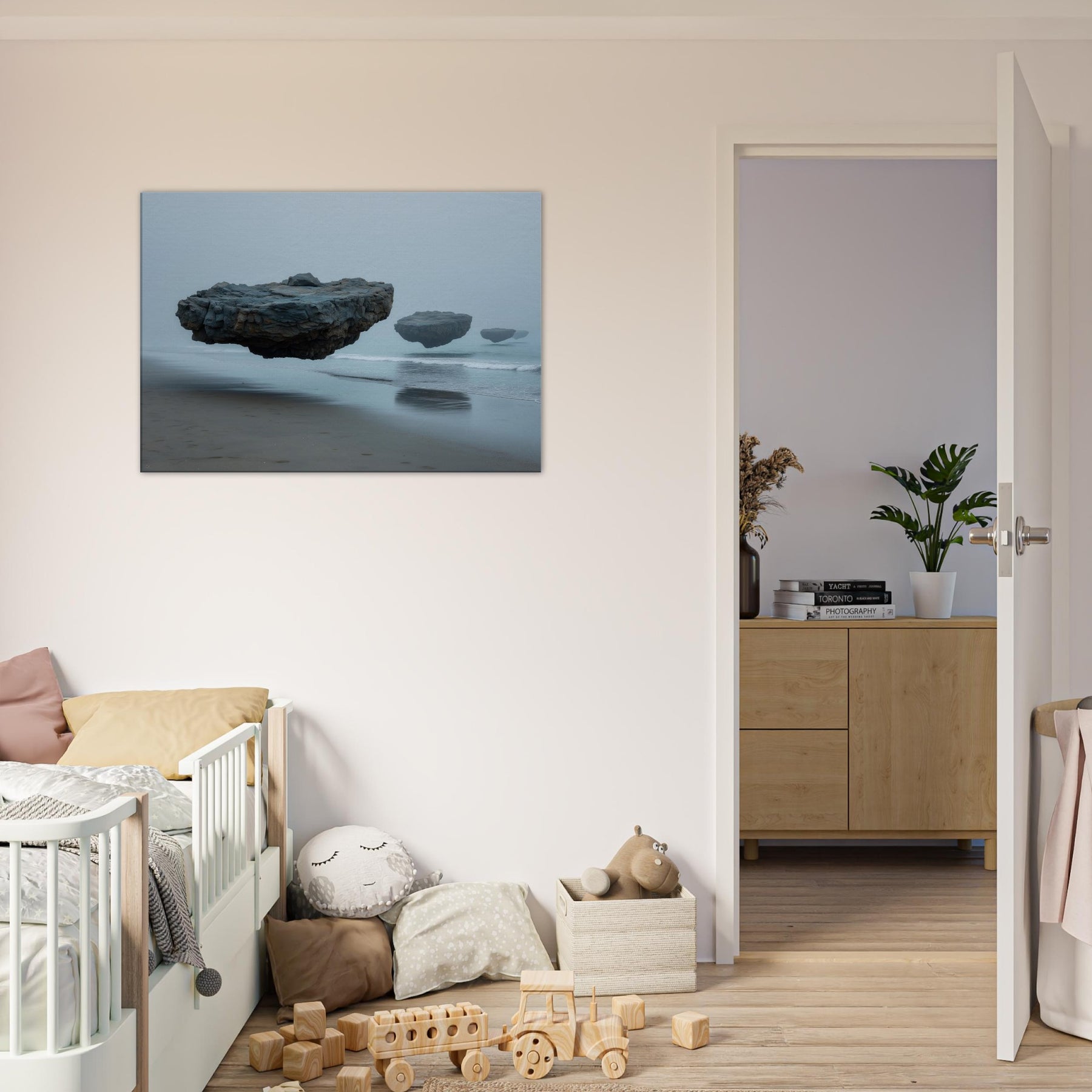 In this dreamlike scene, a quiet shoreline becomes a stage for gravity defying rock forms. Surreal, yet tender, the Beach flickers between memory and omen as colossal stones hover above the foaming edges, casting soft reflections on wet sand. The cool, misty palette invites contemplation, turning your living space into a harbor of calm where conversations drift like tide pools. Perfect for a serene corner or gallery wall that needs a breath of otherworldly nature.