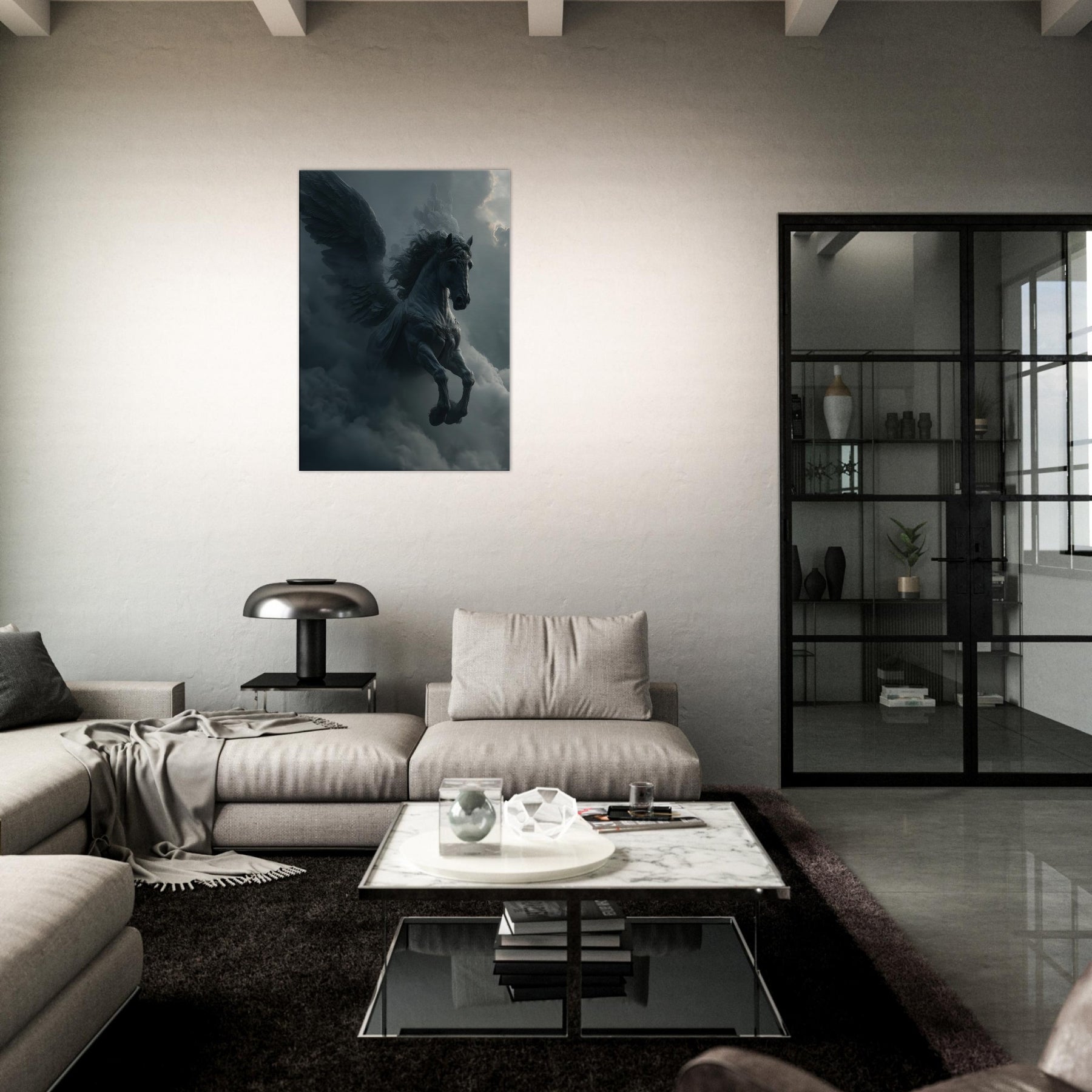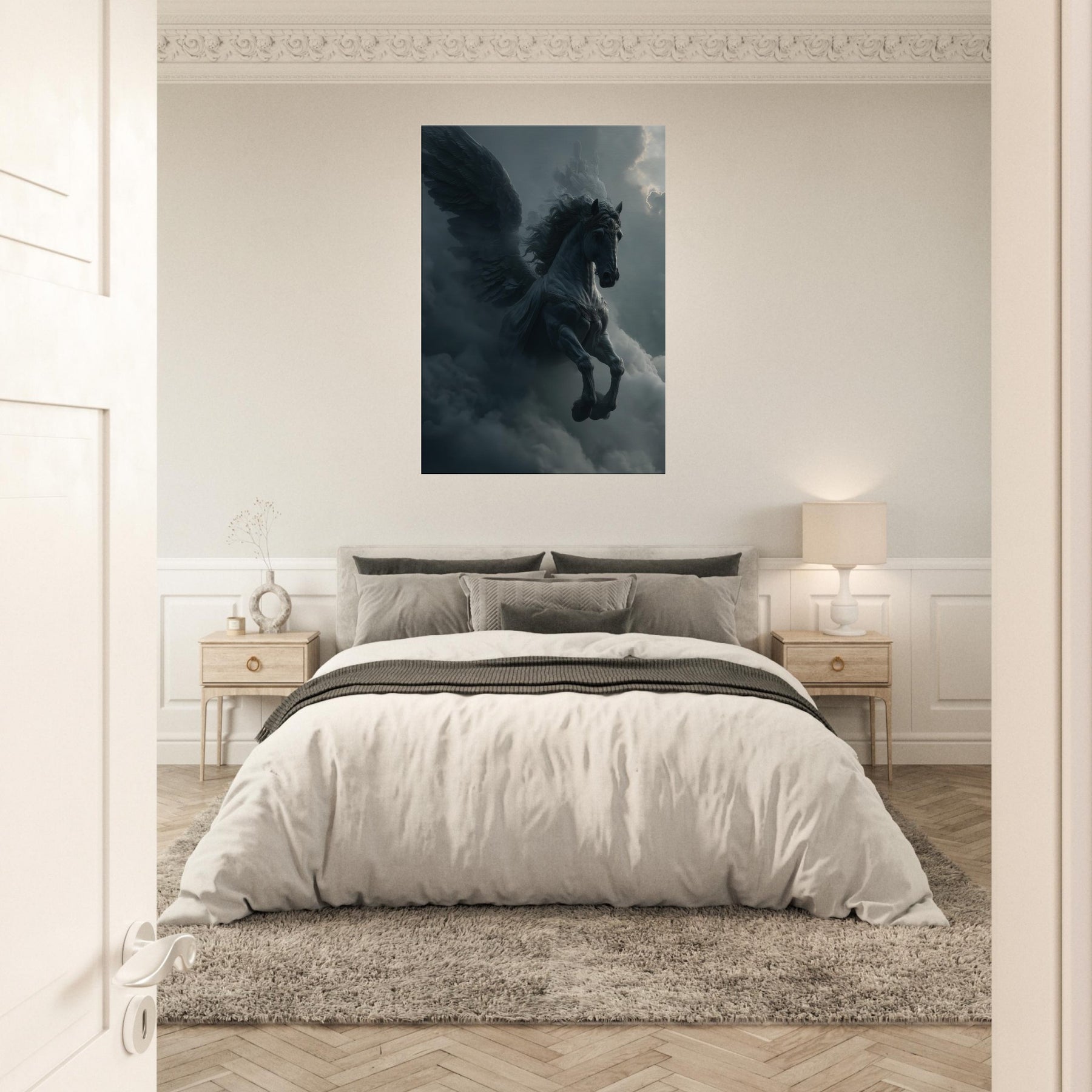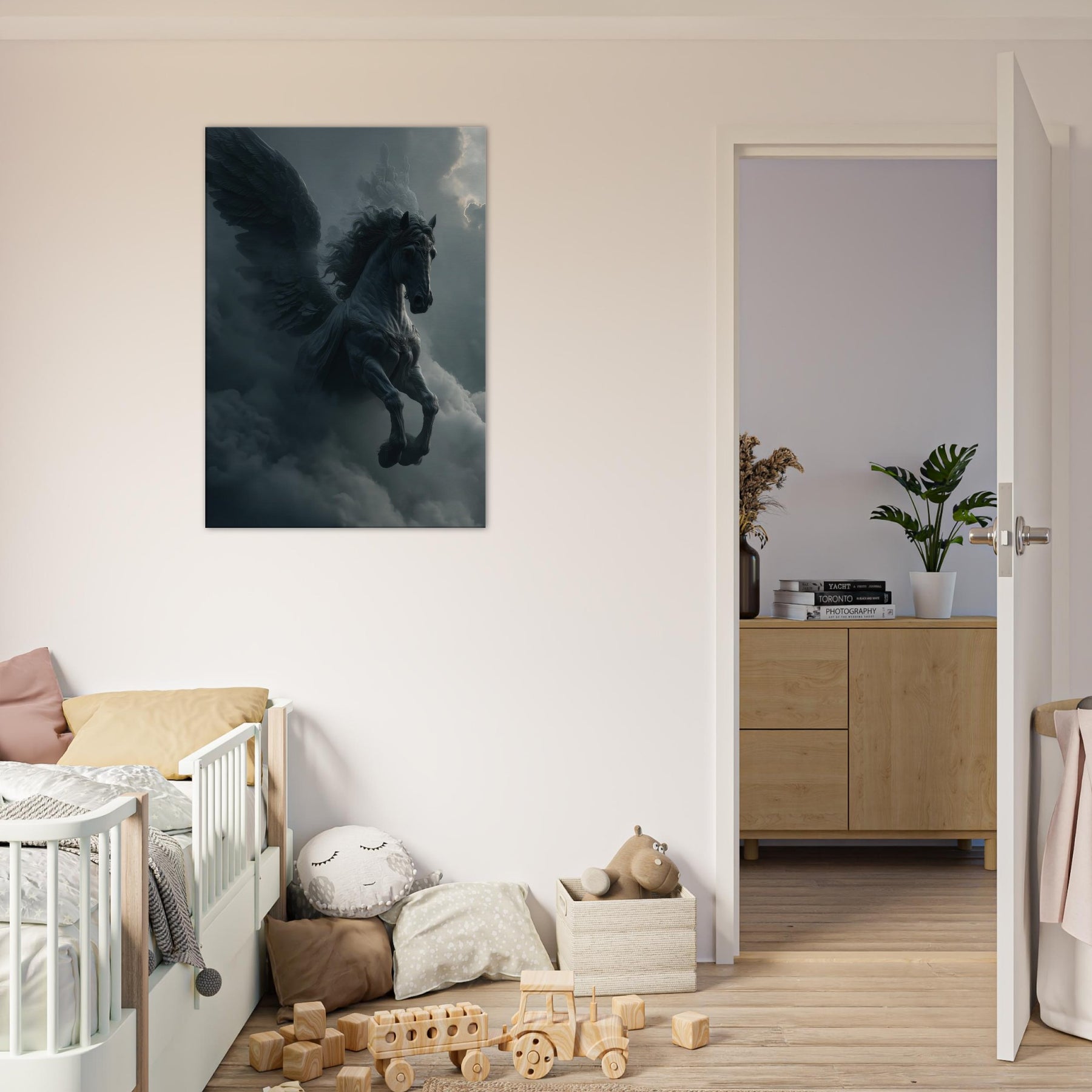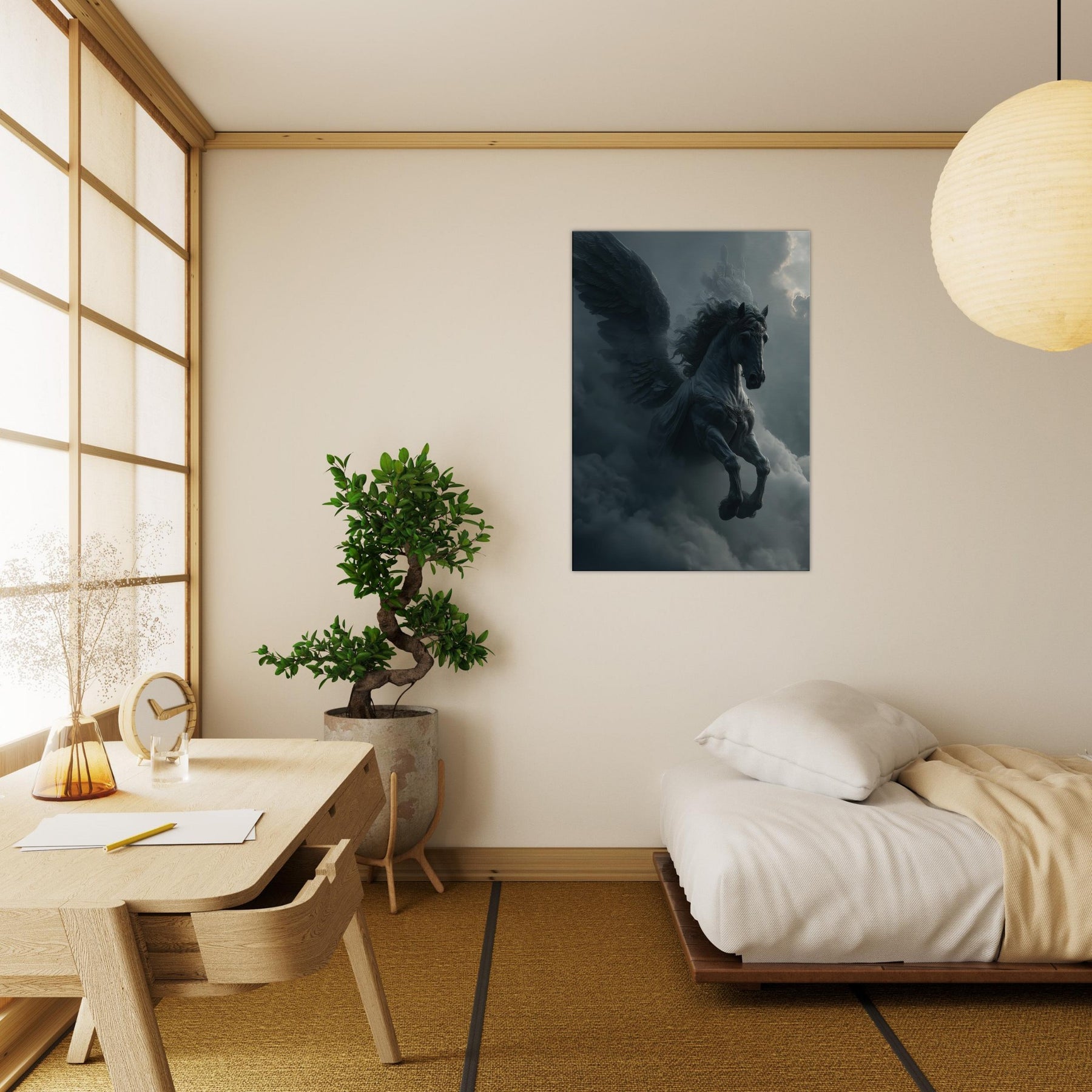 Let your wall greet a dreamlike ascent: a Celestial Pegasus Flying Through Clouds, wings spread through a mist of silver and cobalt as if weightless between thunder and starlight. This surreal scene blends myth with quiet airiness, inviting calm, wonder, and imaginative conversation. It elevates a living space with mood an ever present horizon that shifts from dusk to dawn. A striking focal point for a modern room, it breathes motion, luminosity, and myth into daily life.