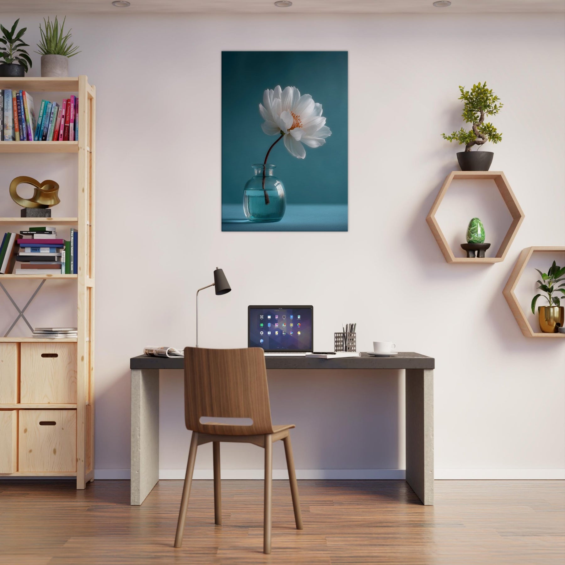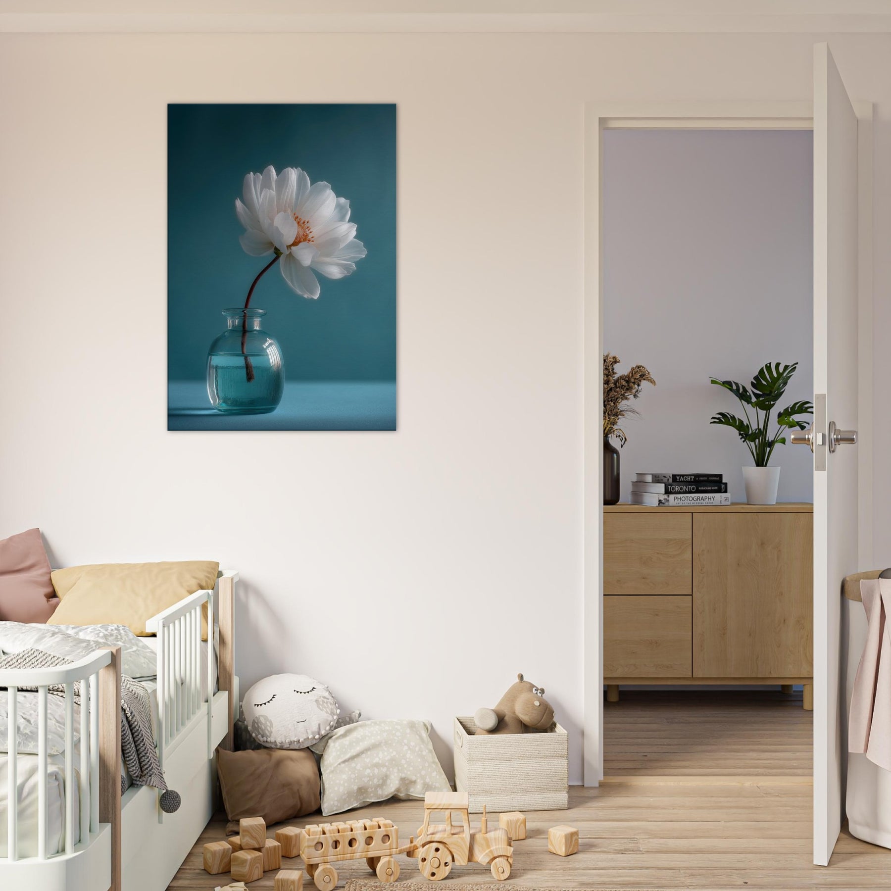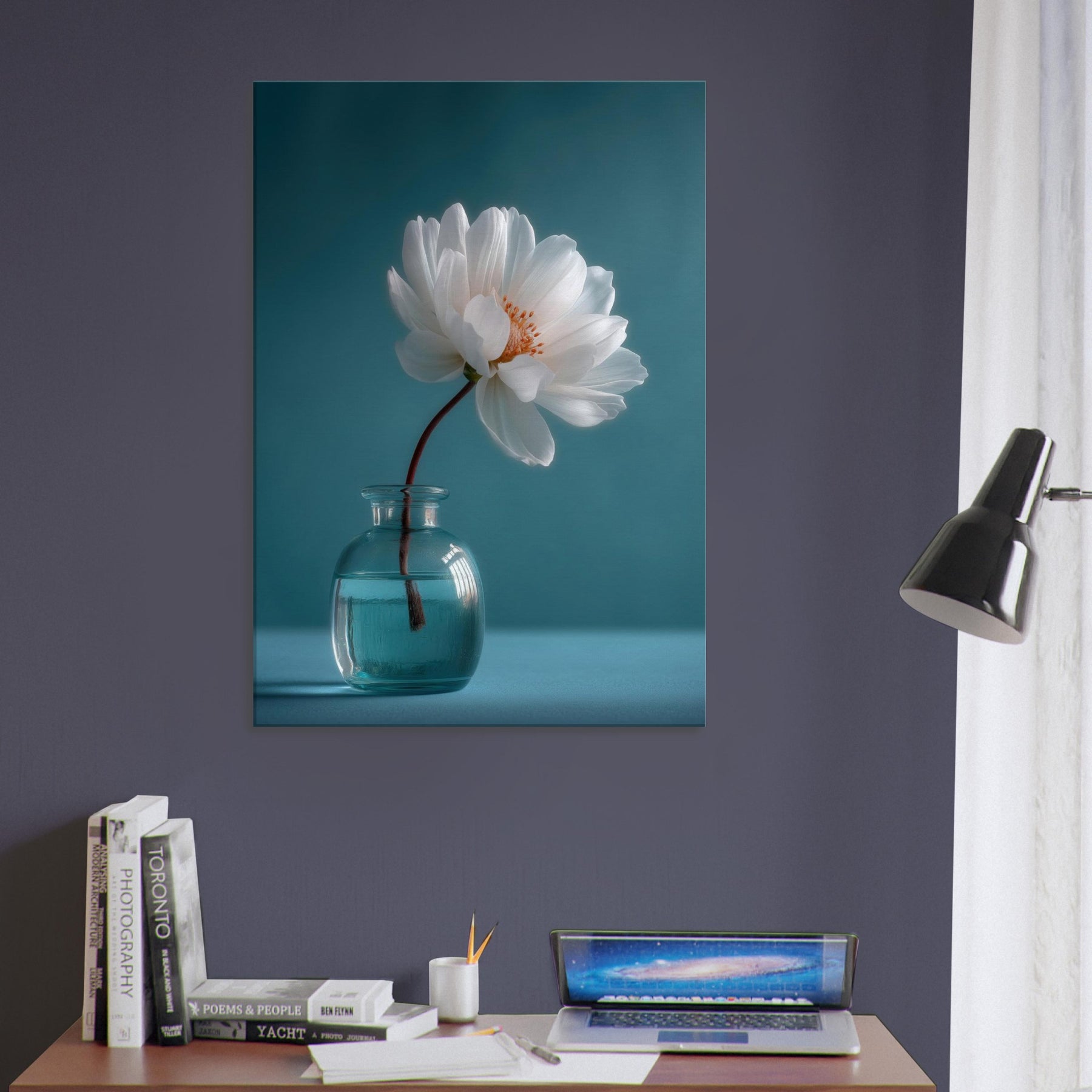 An intimate, dreamlike icon emerges from a quiet teal background: a Single Flower in Vase suspended between memory and imagination. This Surrealism inflected image invites stillness into the room, where the pale petals glow like moonlight and the slender stem curves with a playful gravity. The scene feels both fragile and confident, a reminder that interior spaces can hold wonder without shouting. Hang it to transform walls into a gallery of calm, elegant contemplation.