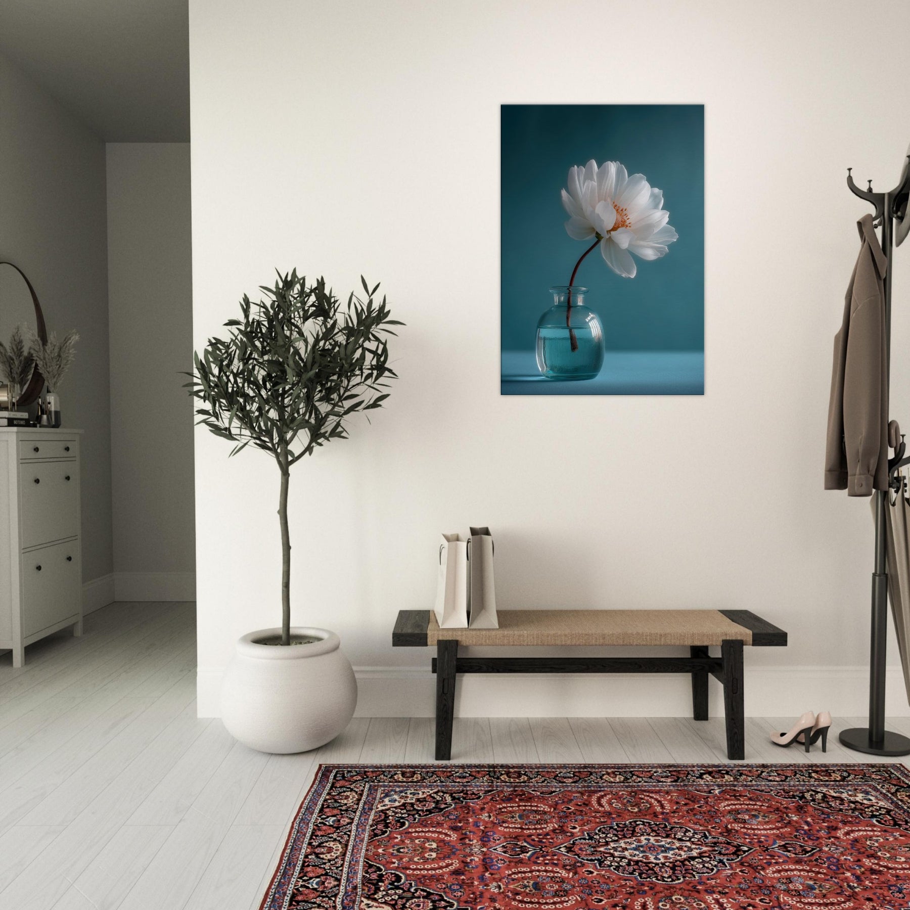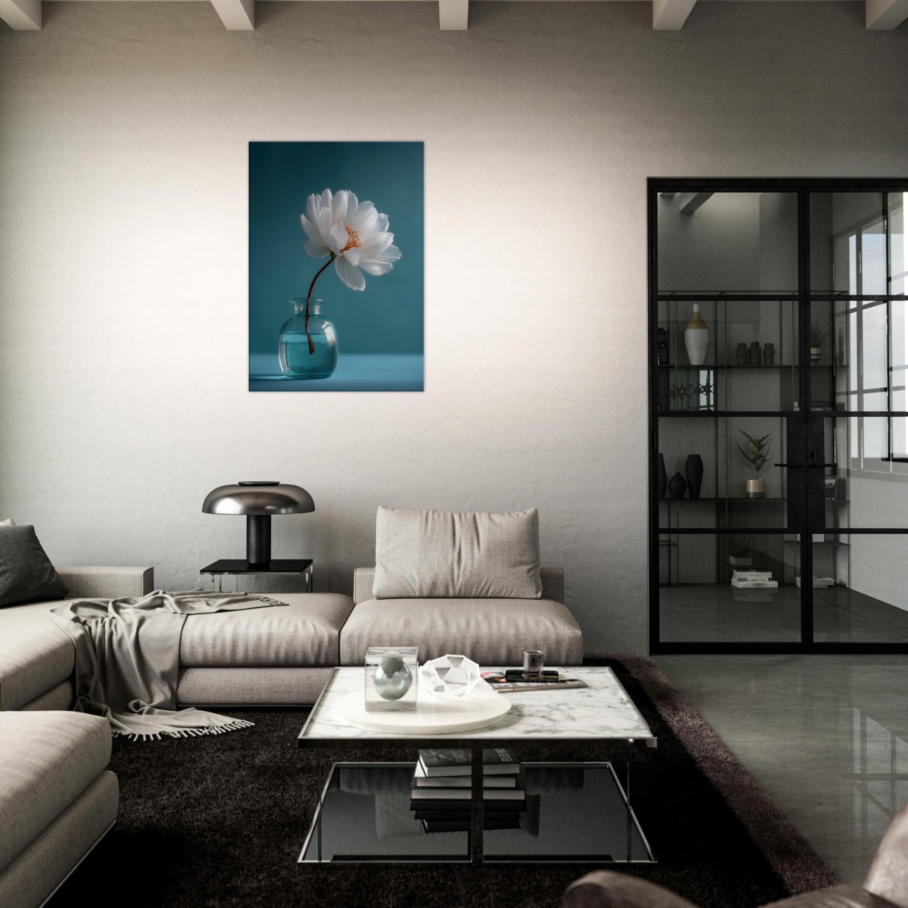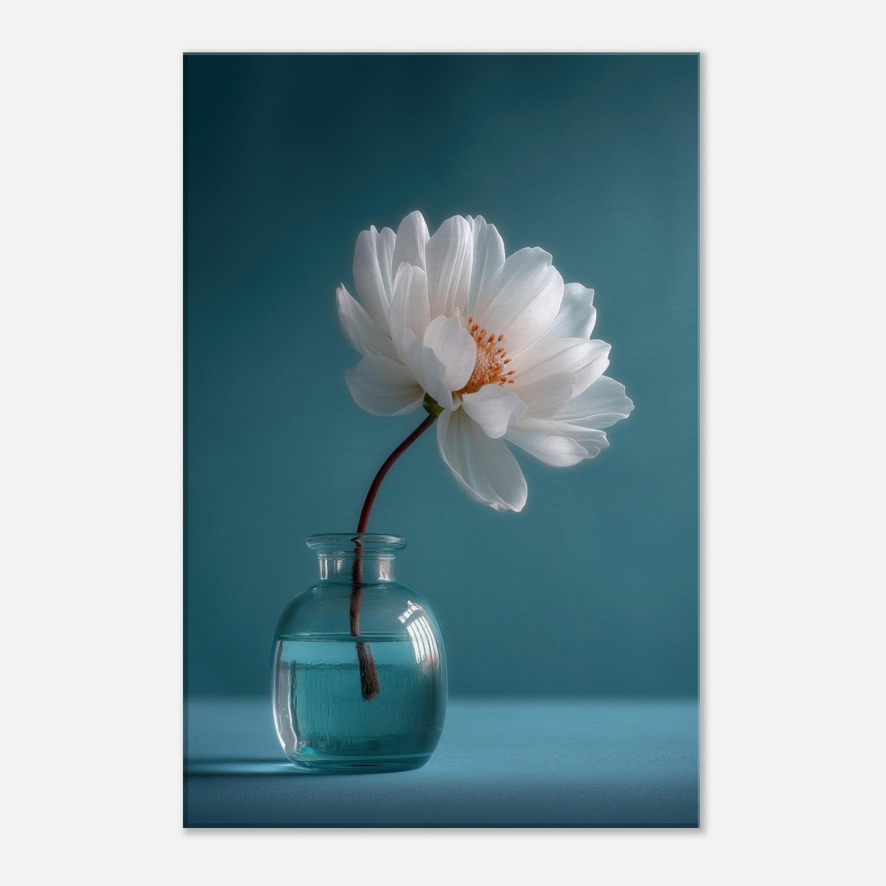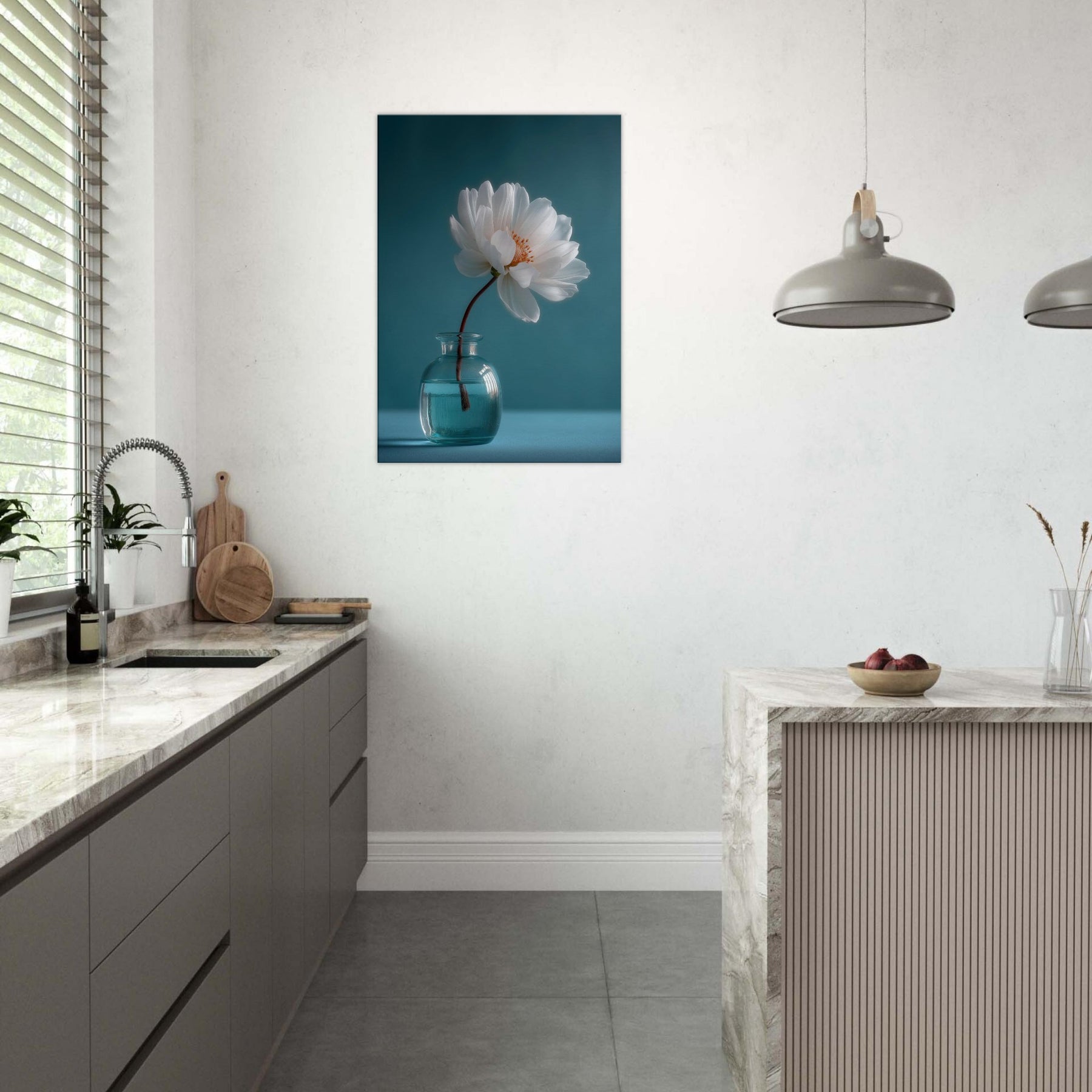 An intimate, dreamlike icon emerges from a quiet teal background: a Single Flower in Vase suspended between memory and imagination. This Surrealism inflected image invites stillness into the room, where the pale petals glow like moonlight and the slender stem curves with a playful gravity. The scene feels both fragile and confident, a reminder that interior spaces can hold wonder without shouting. Hang it to transform walls into a gallery of calm, elegant contemplation.