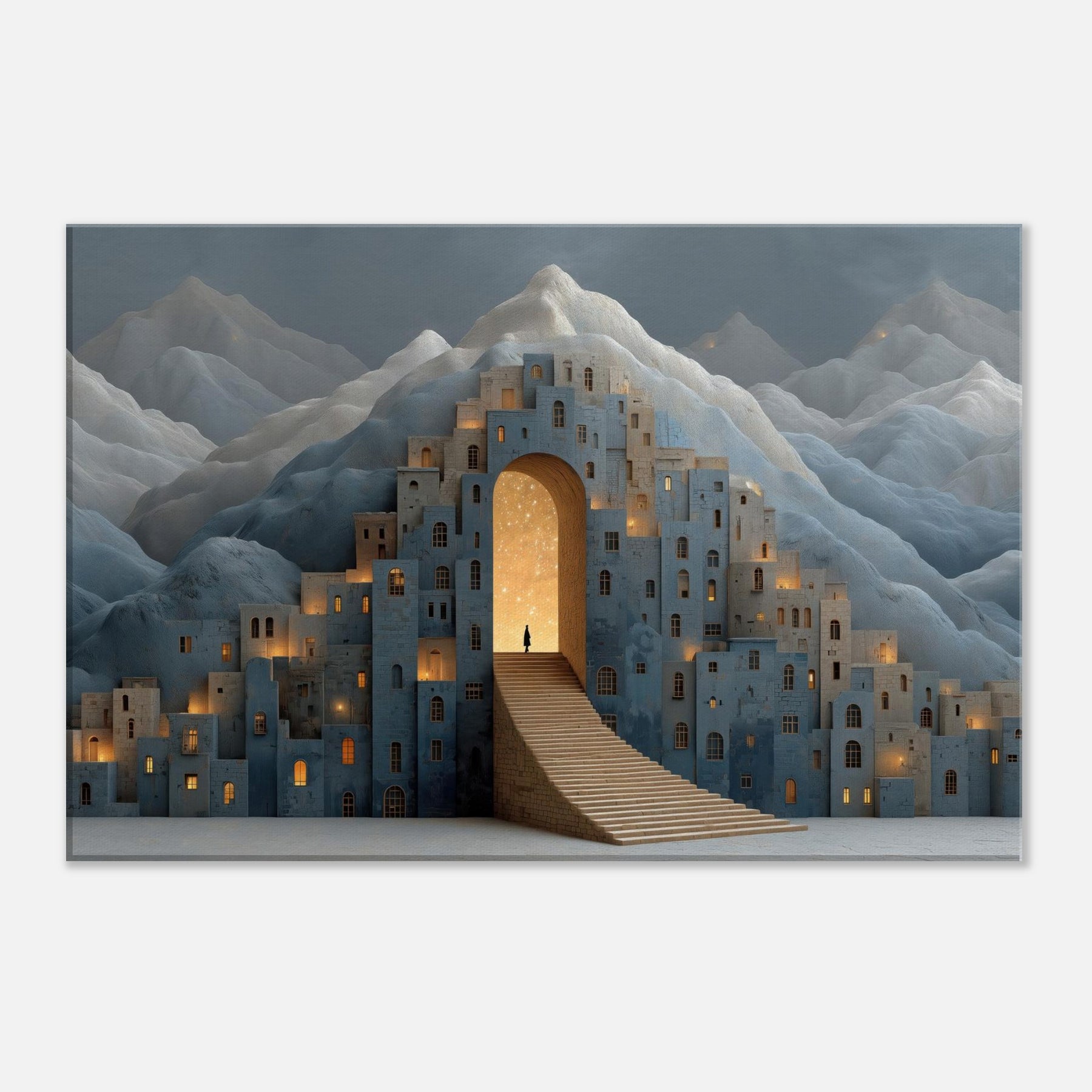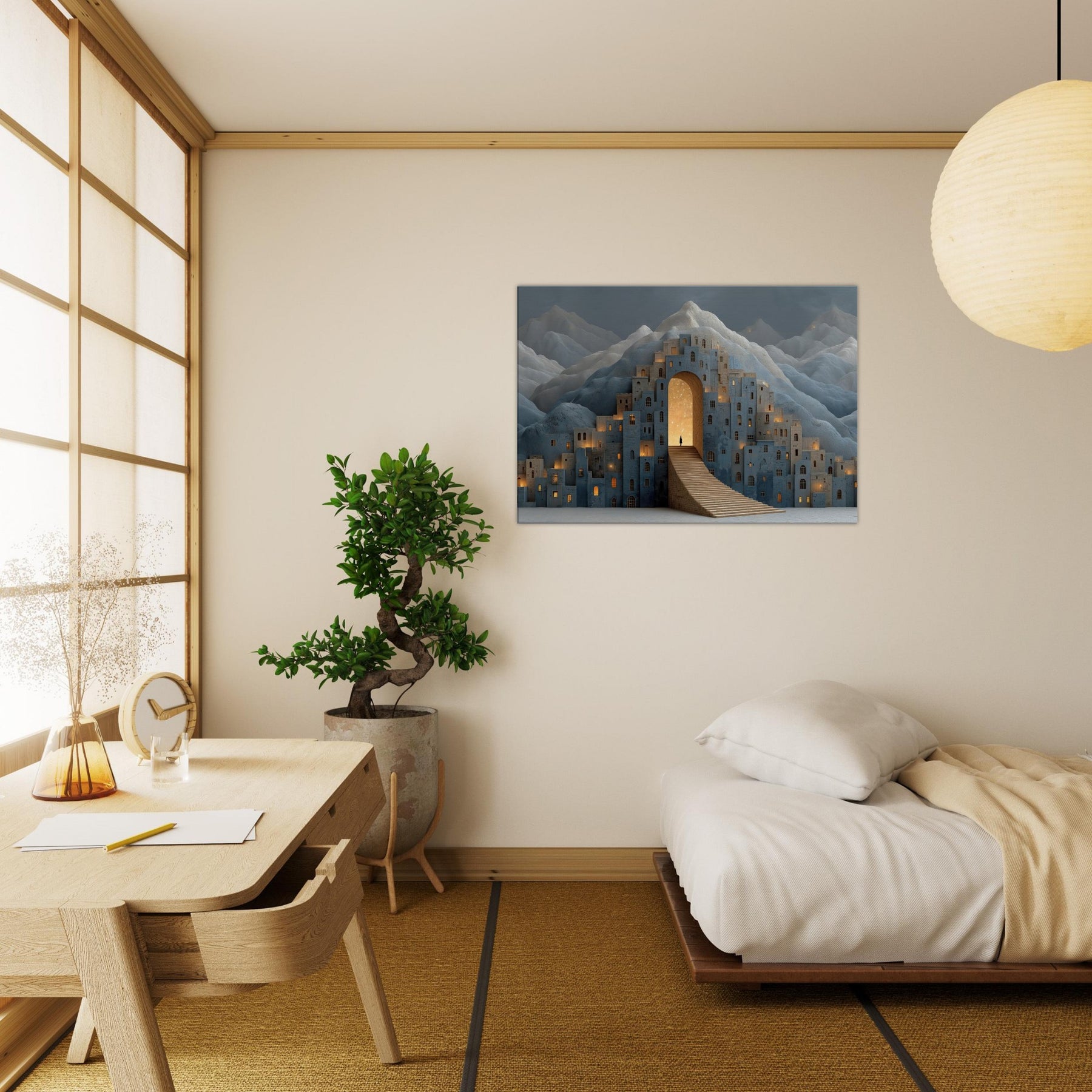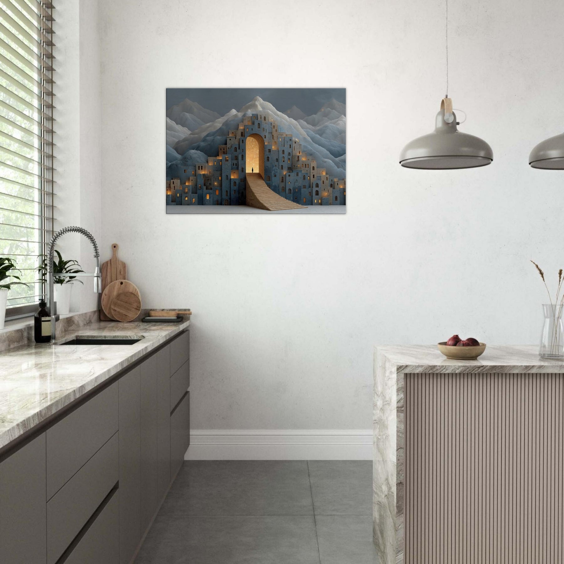 In a dreamscape of blue peaks, a Mountain Village rises as if carved from twilight itself. An arched doorway spills gold light into a chill, stair stepped ascent, inviting quiet reveries and conversations with distant horizons. The surreal composition balances architectural intimacy with sublime scale, turning a living space into a horizon tethered sanctuary. This artwork swells with warmth amid cool tones, its glow echoing candlelit evenings, while the misty mountains cradle the scene like a whispered memory, elevating any room.