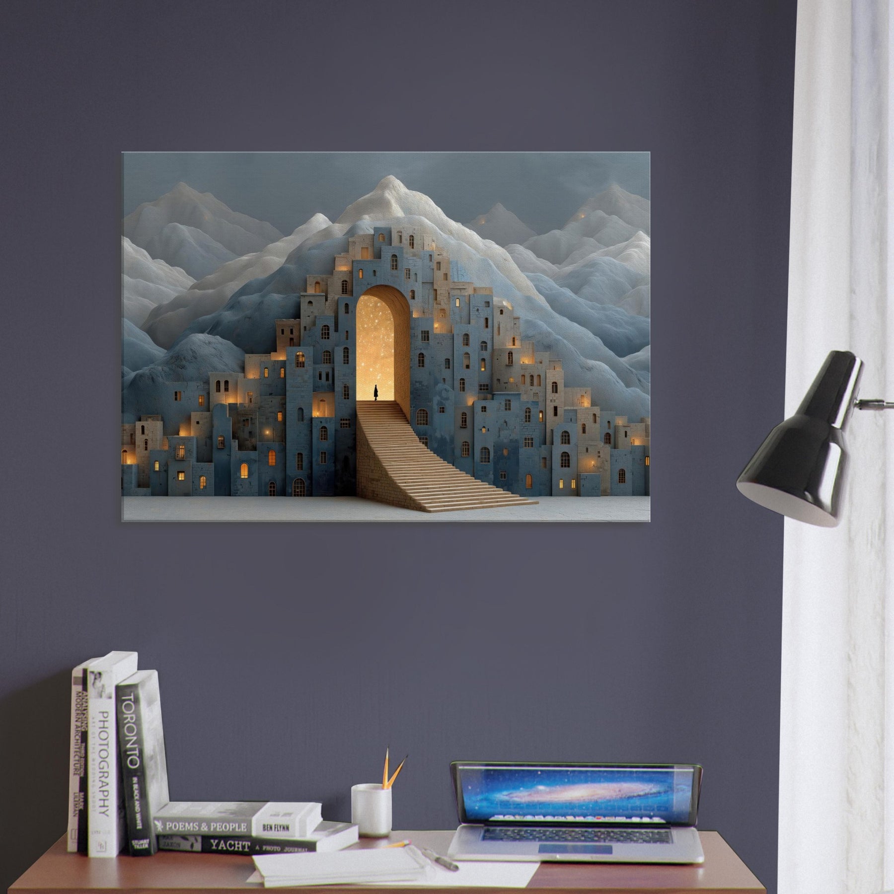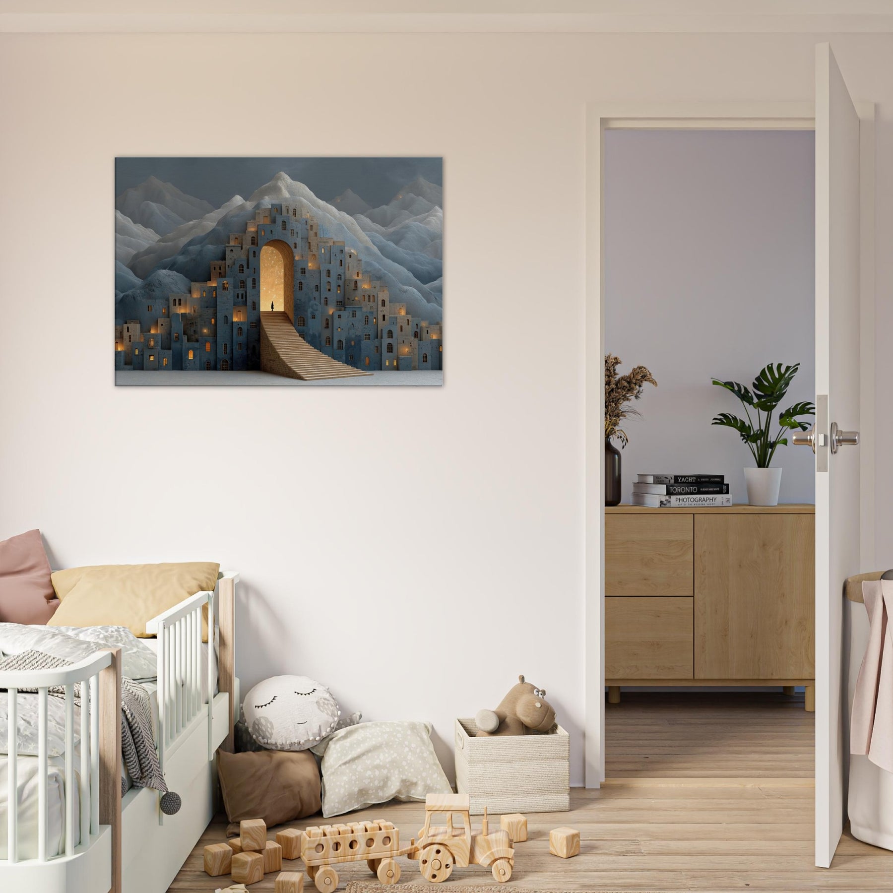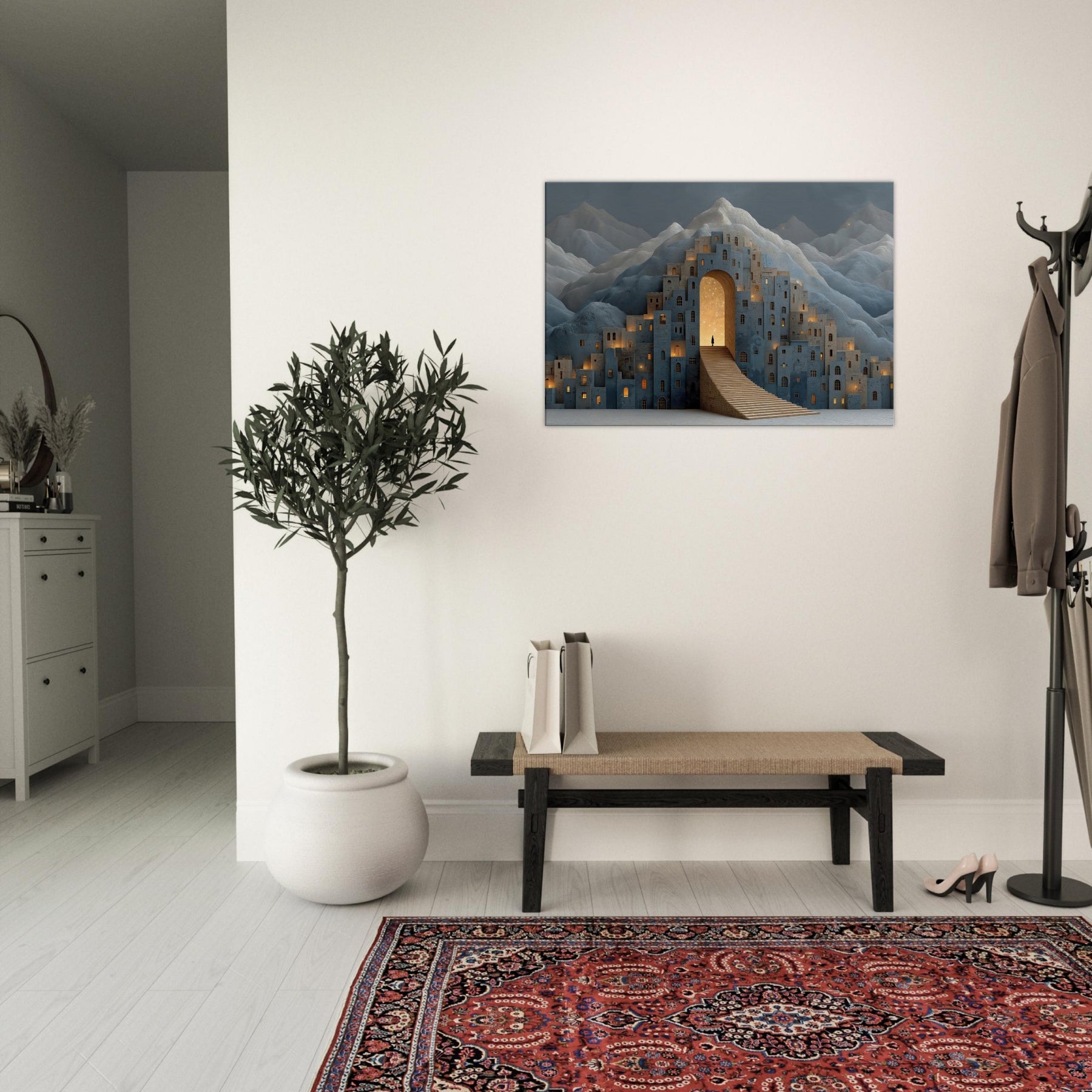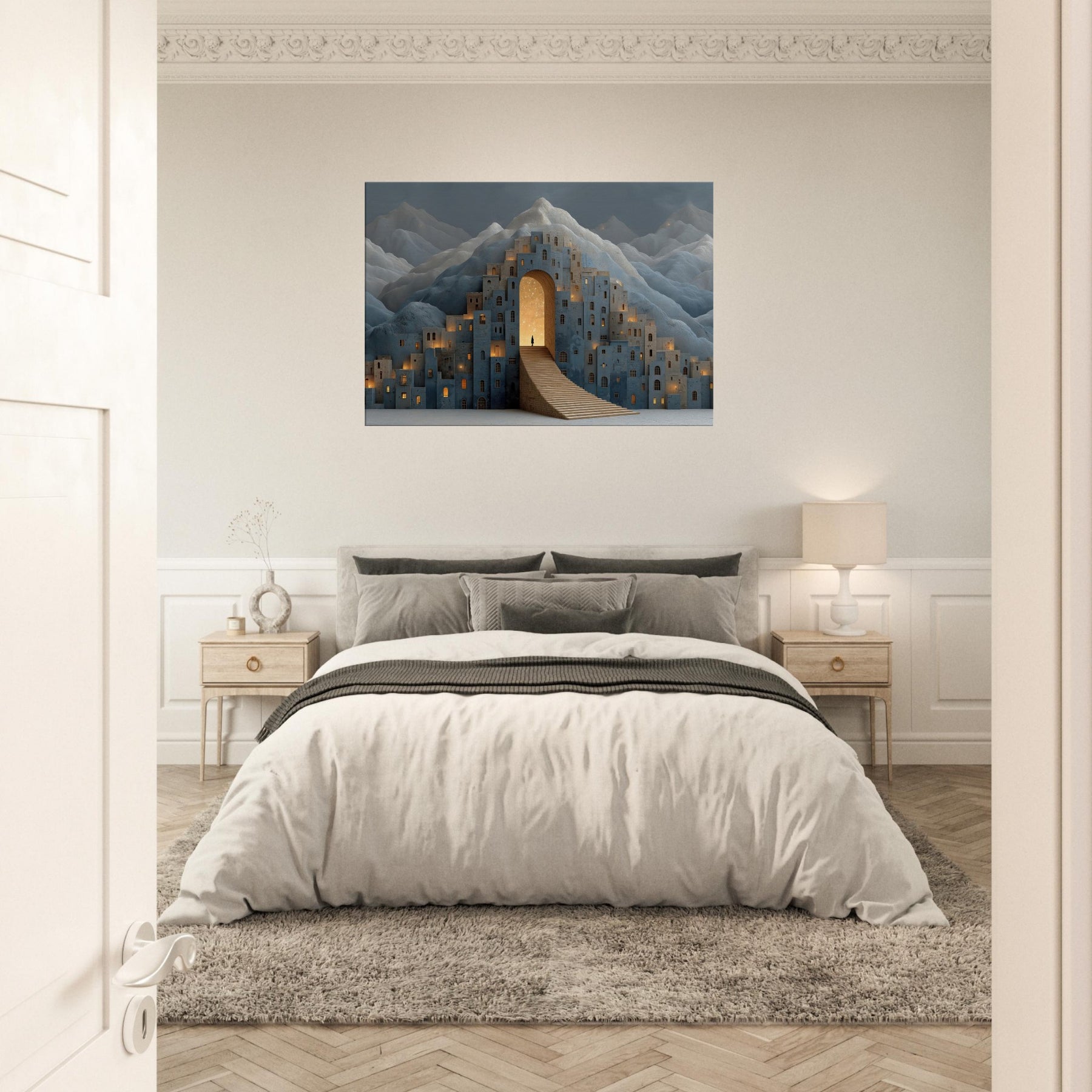 In a dreamscape of blue peaks, a Mountain Village rises as if carved from twilight itself. An arched doorway spills gold light into a chill, stair stepped ascent, inviting quiet reveries and conversations with distant horizons. The surreal composition balances architectural intimacy with sublime scale, turning a living space into a horizon tethered sanctuary. This artwork swells with warmth amid cool tones, its glow echoing candlelit evenings, while the misty mountains cradle the scene like a whispered memory, elevating any room.
