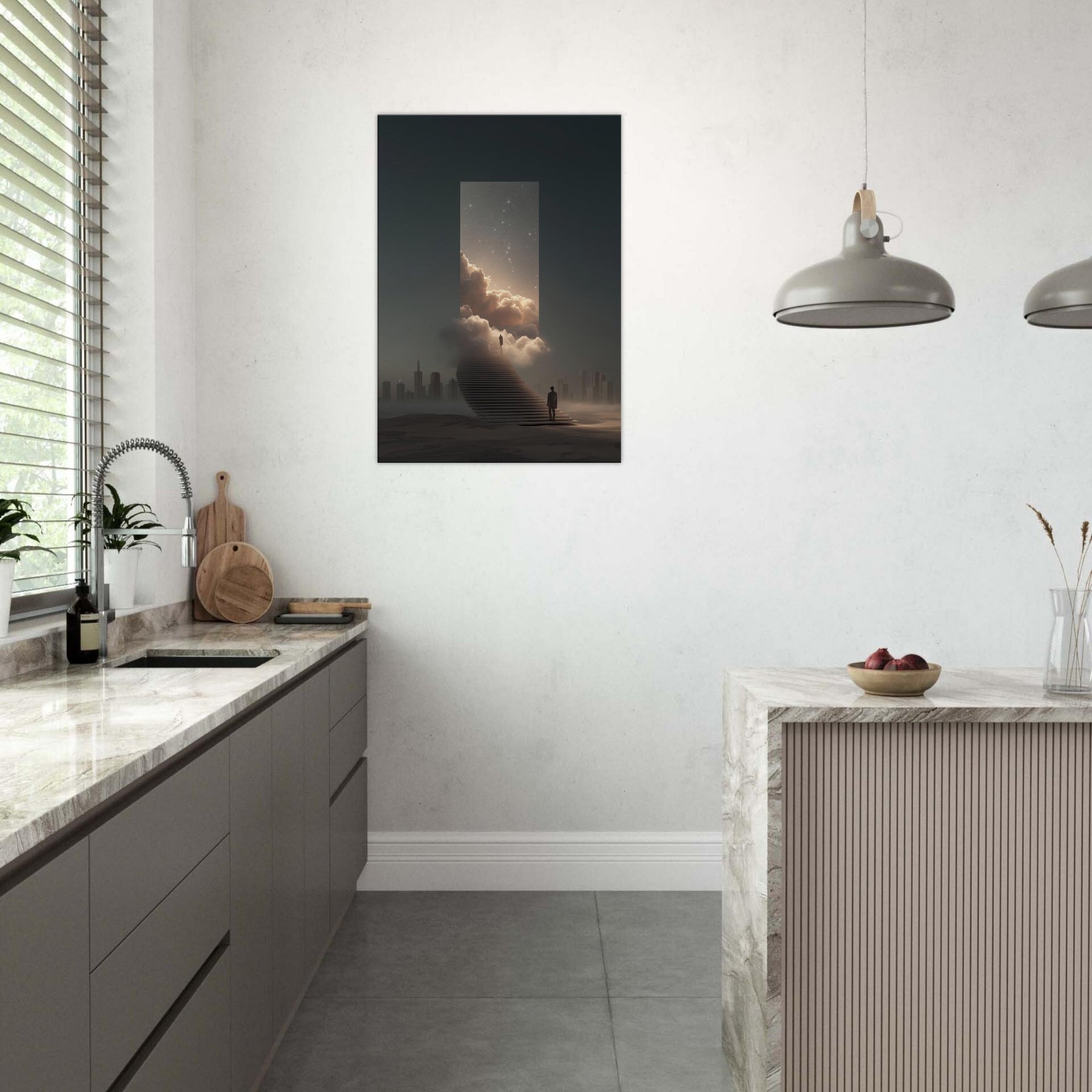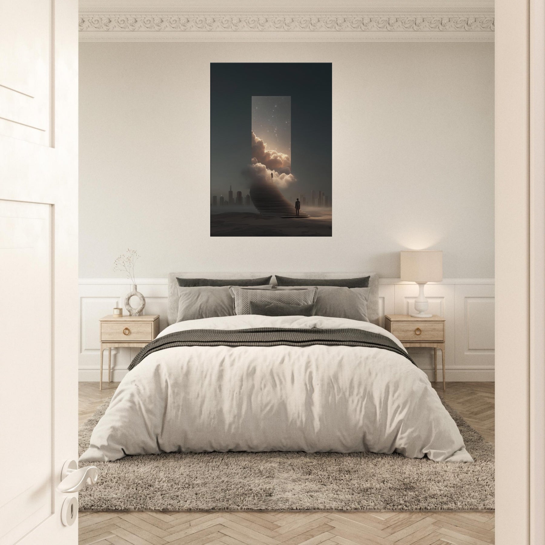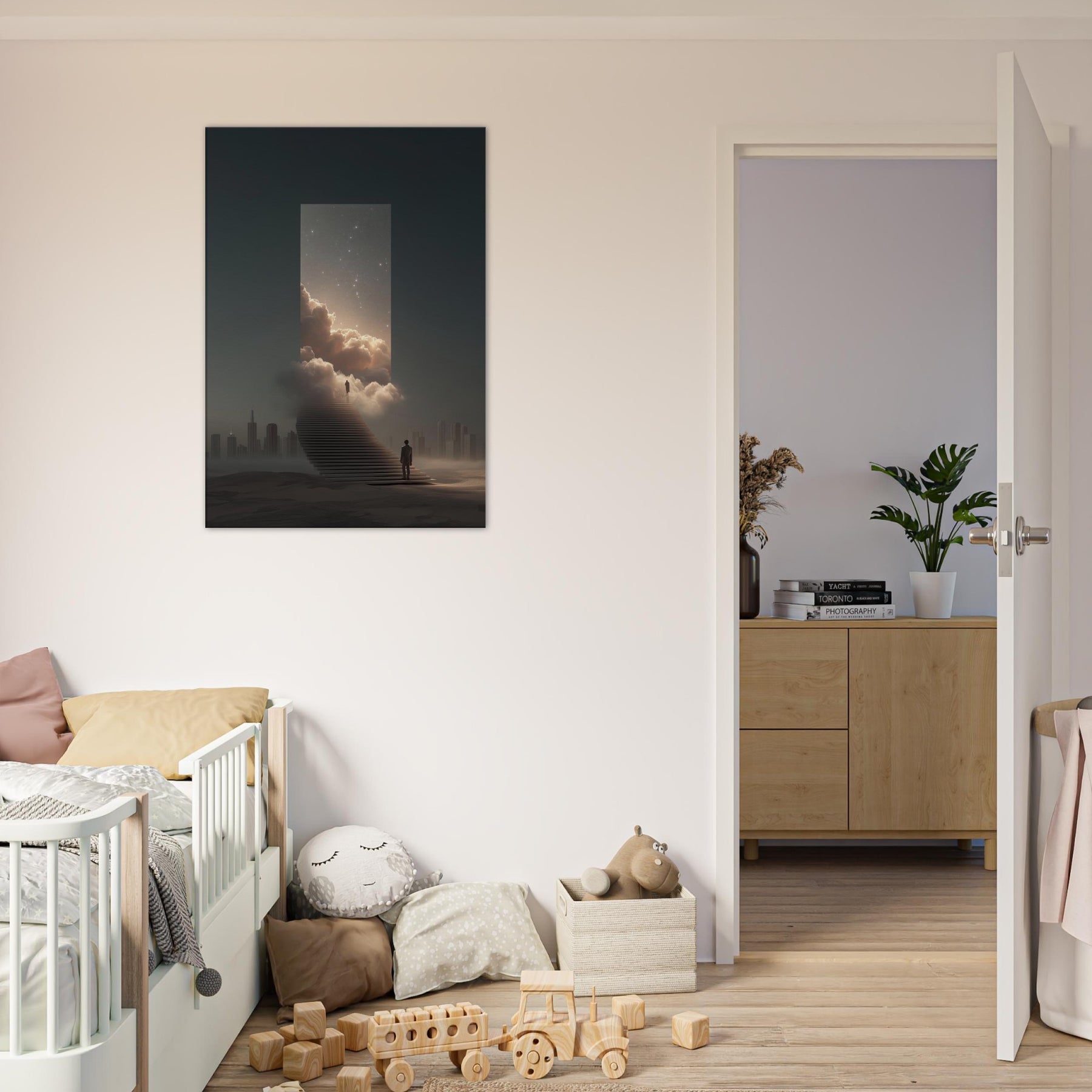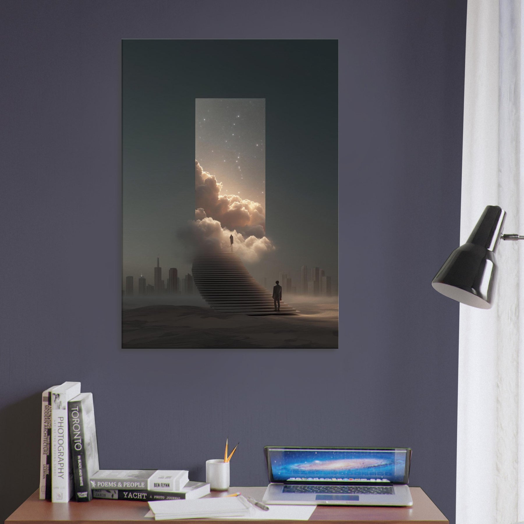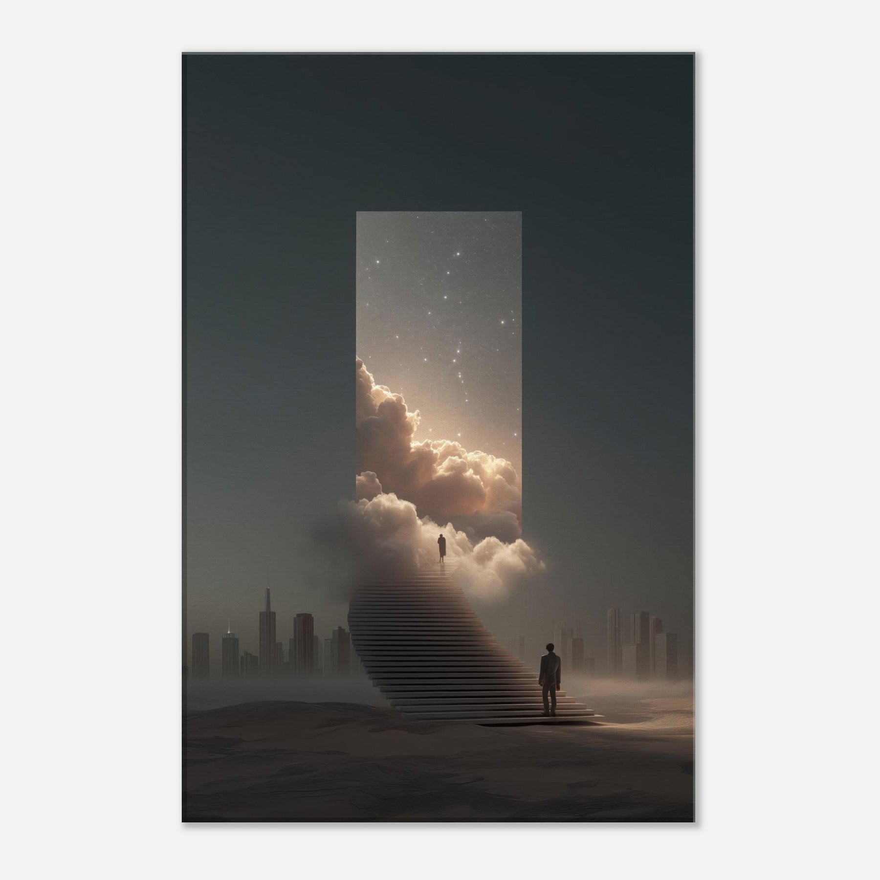 Vancouver rises as a dream bridged metropolis in this surreal meditation, where a moonlit staircase dissolves into a luminous portal framed by clouds and star dusted skies. The air feels electric with possibility, the distant skyline softened into silhouette, and a lone traveler steps toward wonder. This artwork invites contemplation its quiet glow, velvet mist, and cinematic scale bringing spacious calm to a living room or study. Vancouver becomes more than a place; it becomes a doorway to imagination, a horizon you can inhabit daily.
