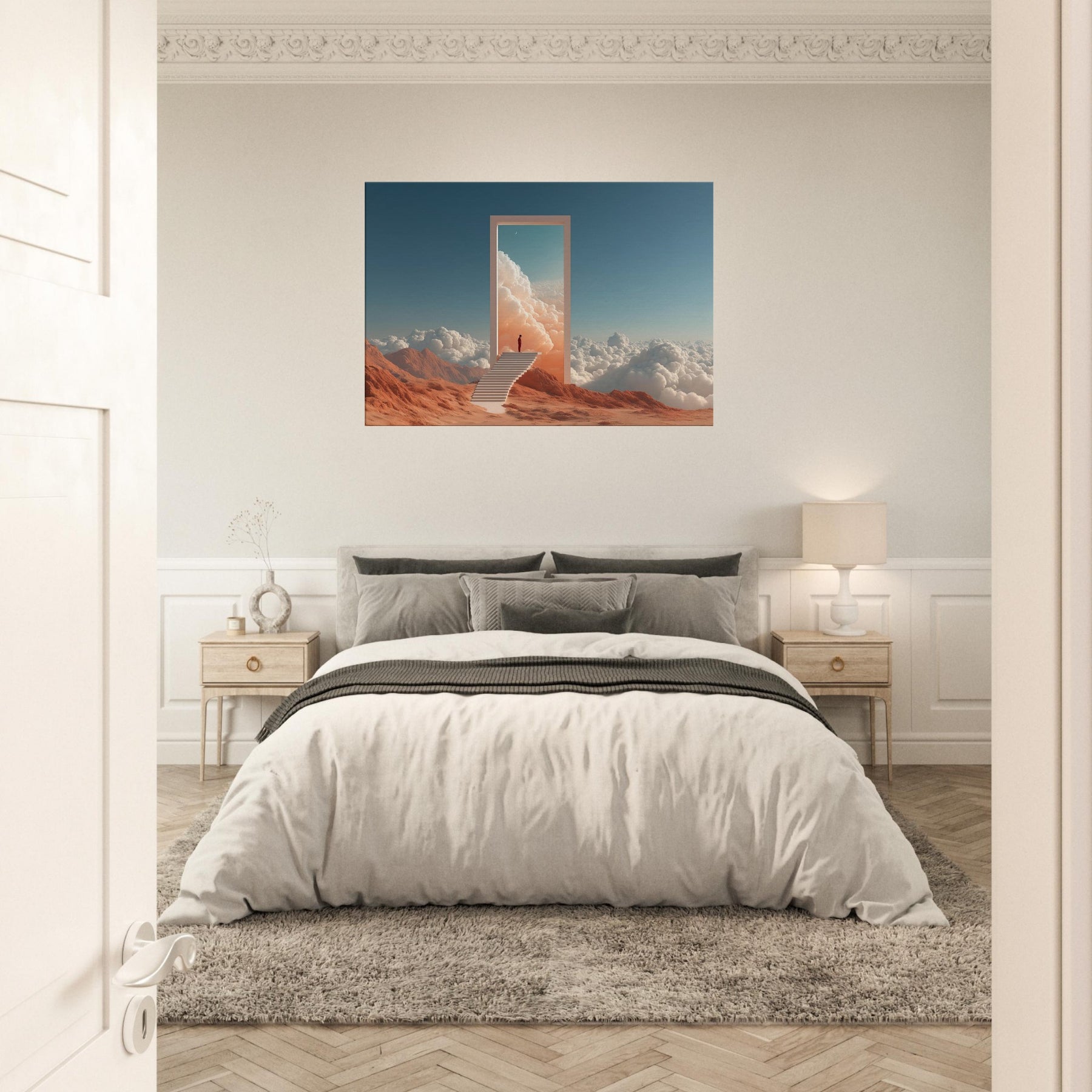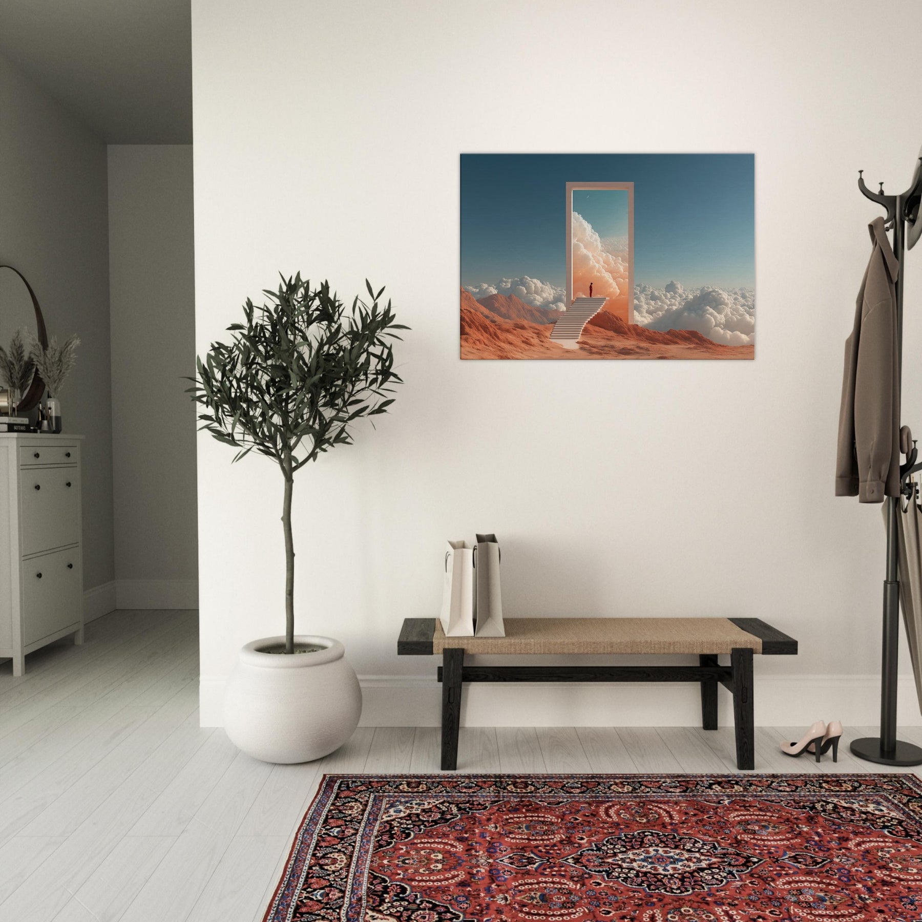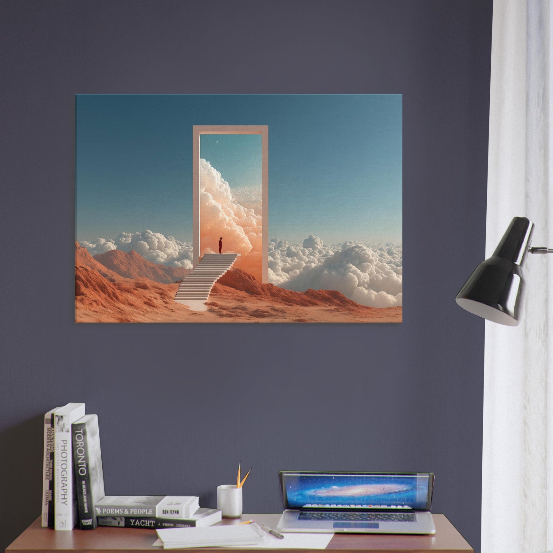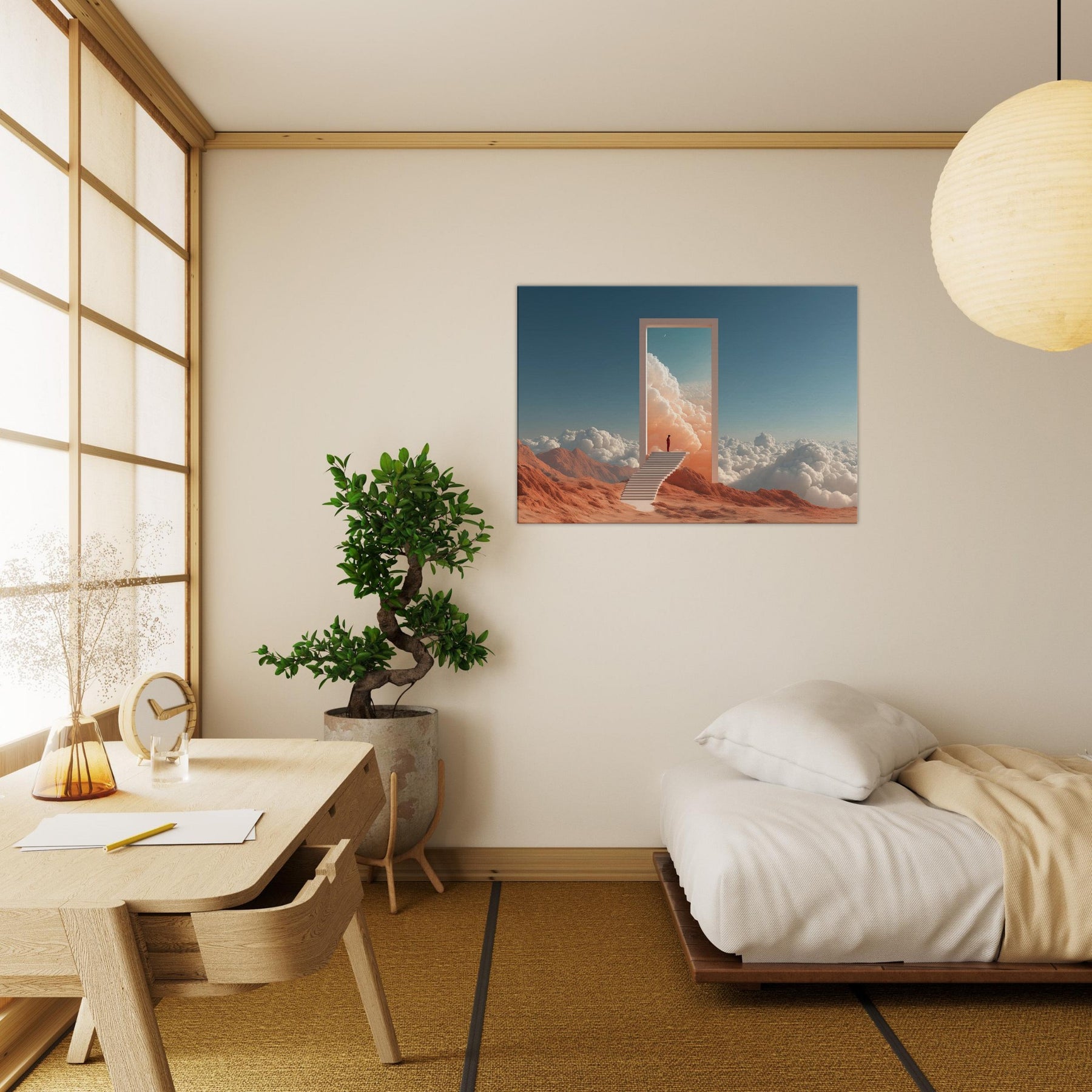 Step into a harbor between desert and sky where Futuristic Skyscrapers rise as dreamlike monoliths. This surreal composition invites a solitary figure to ascend a radiant stair, passing through a door framed by soft clouds and a warm horizon. The cinematic light lends a quiet, contemplative mood perfect for a living room, hallway, or home office. It expands your wall into an expansive horizon, stirring curiosity and a gentle sense of ascent, while keeping space airy, elegant, and deeply soothing.