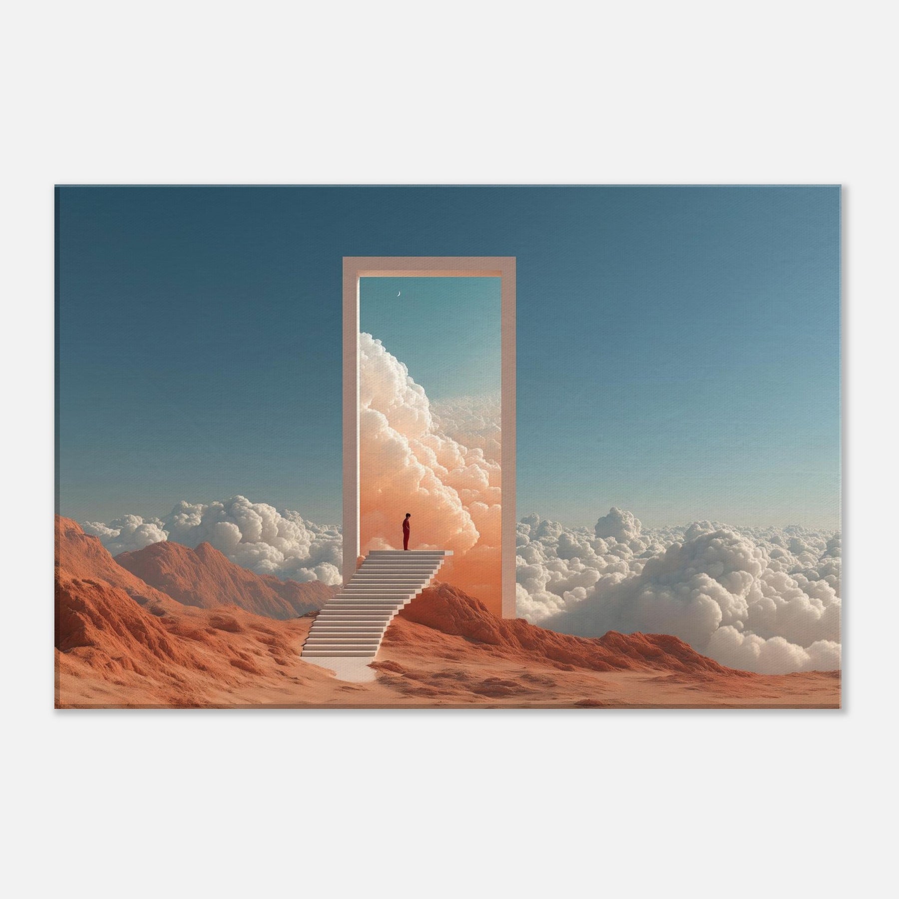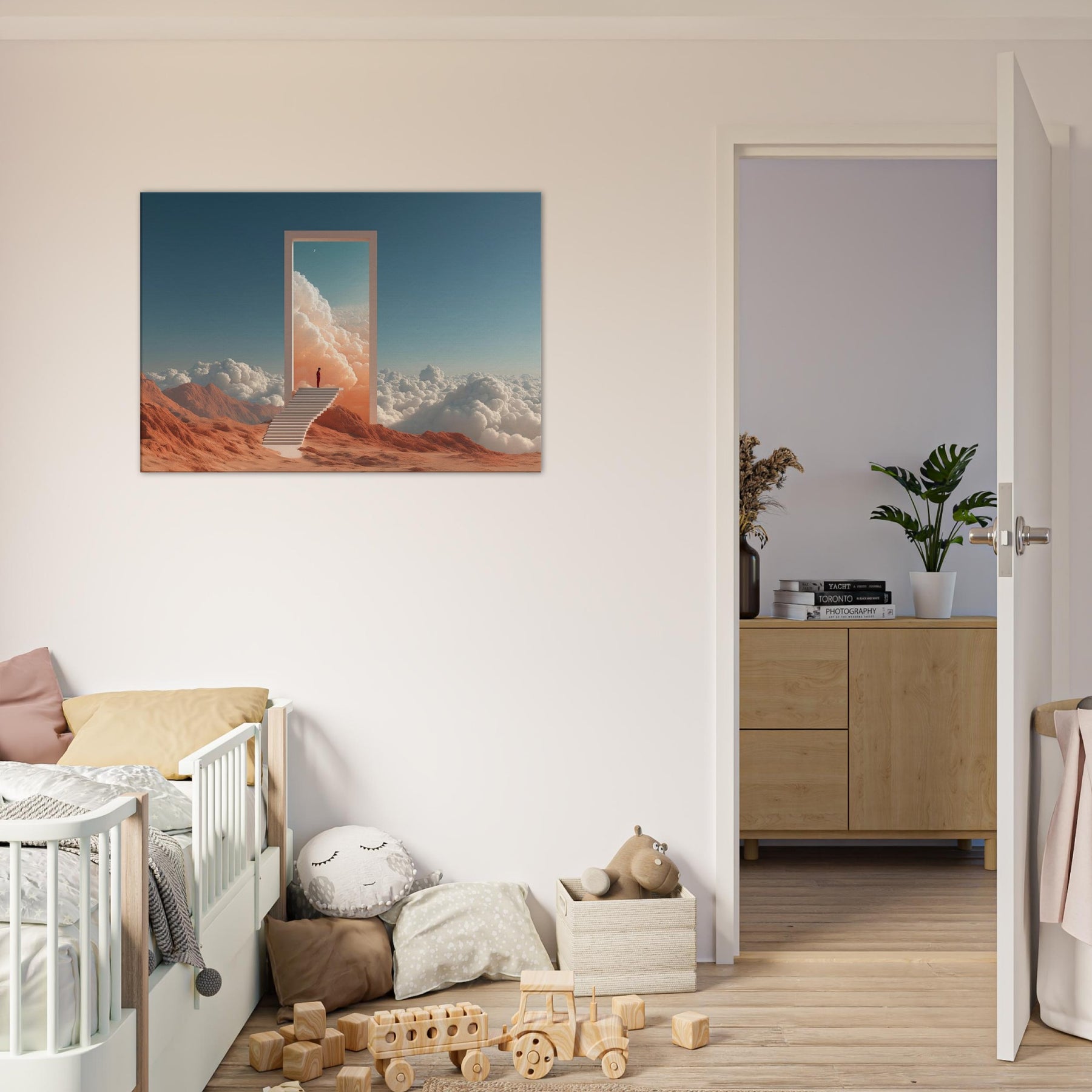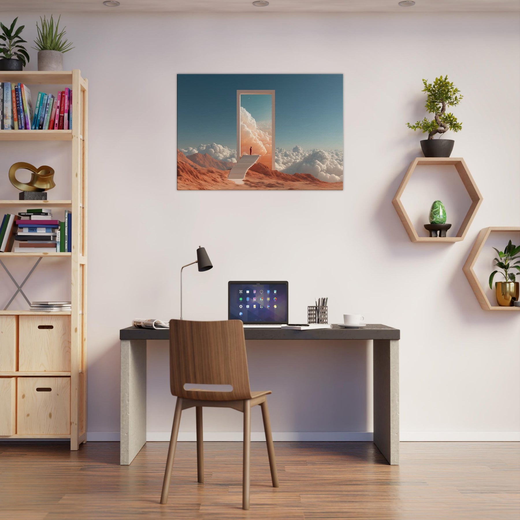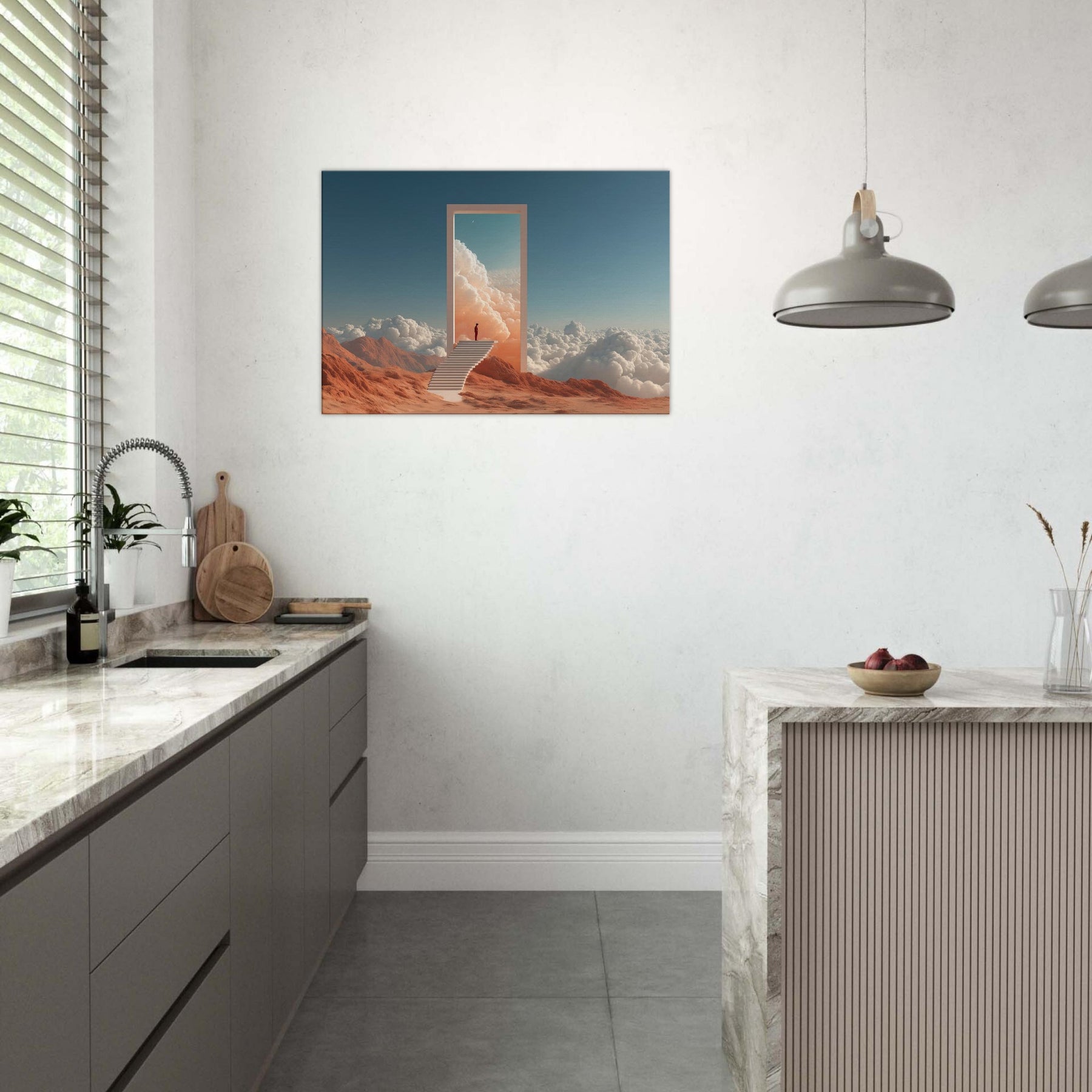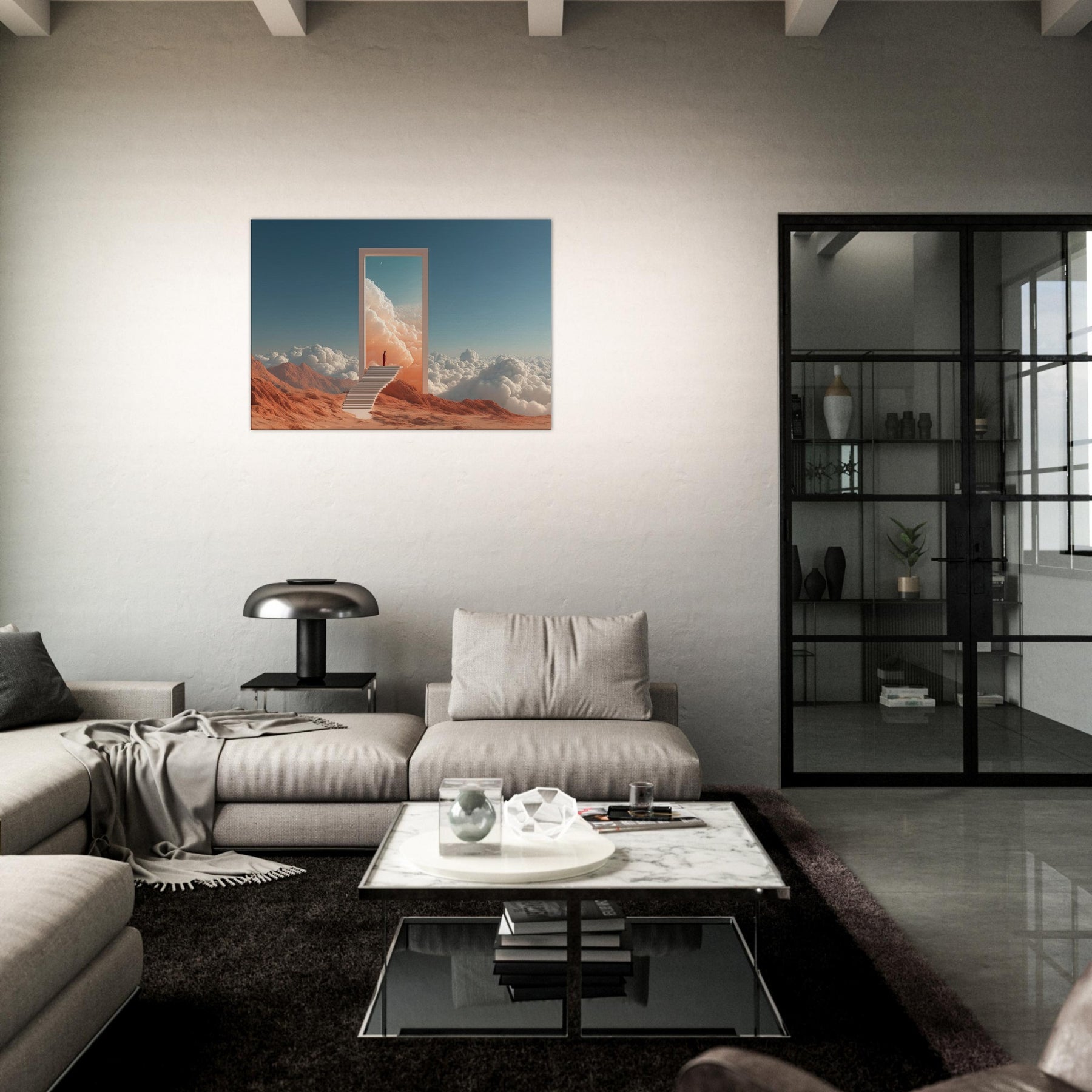 Step into a harbor between desert and sky where Futuristic Skyscrapers rise as dreamlike monoliths. This surreal composition invites a solitary figure to ascend a radiant stair, passing through a door framed by soft clouds and a warm horizon. The cinematic light lends a quiet, contemplative mood perfect for a living room, hallway, or home office. It expands your wall into an expansive horizon, stirring curiosity and a gentle sense of ascent, while keeping space airy, elegant, and deeply soothing.