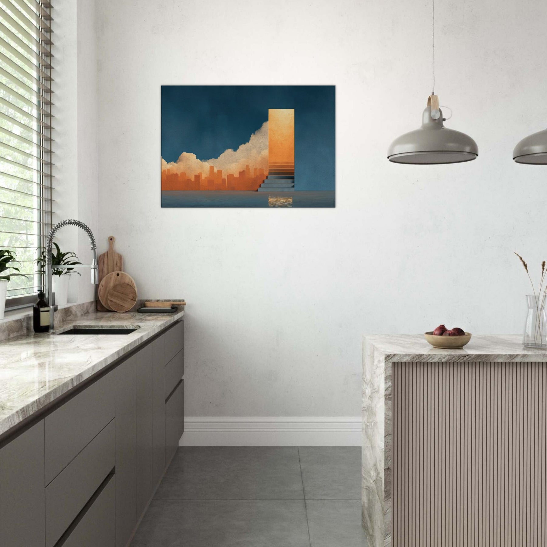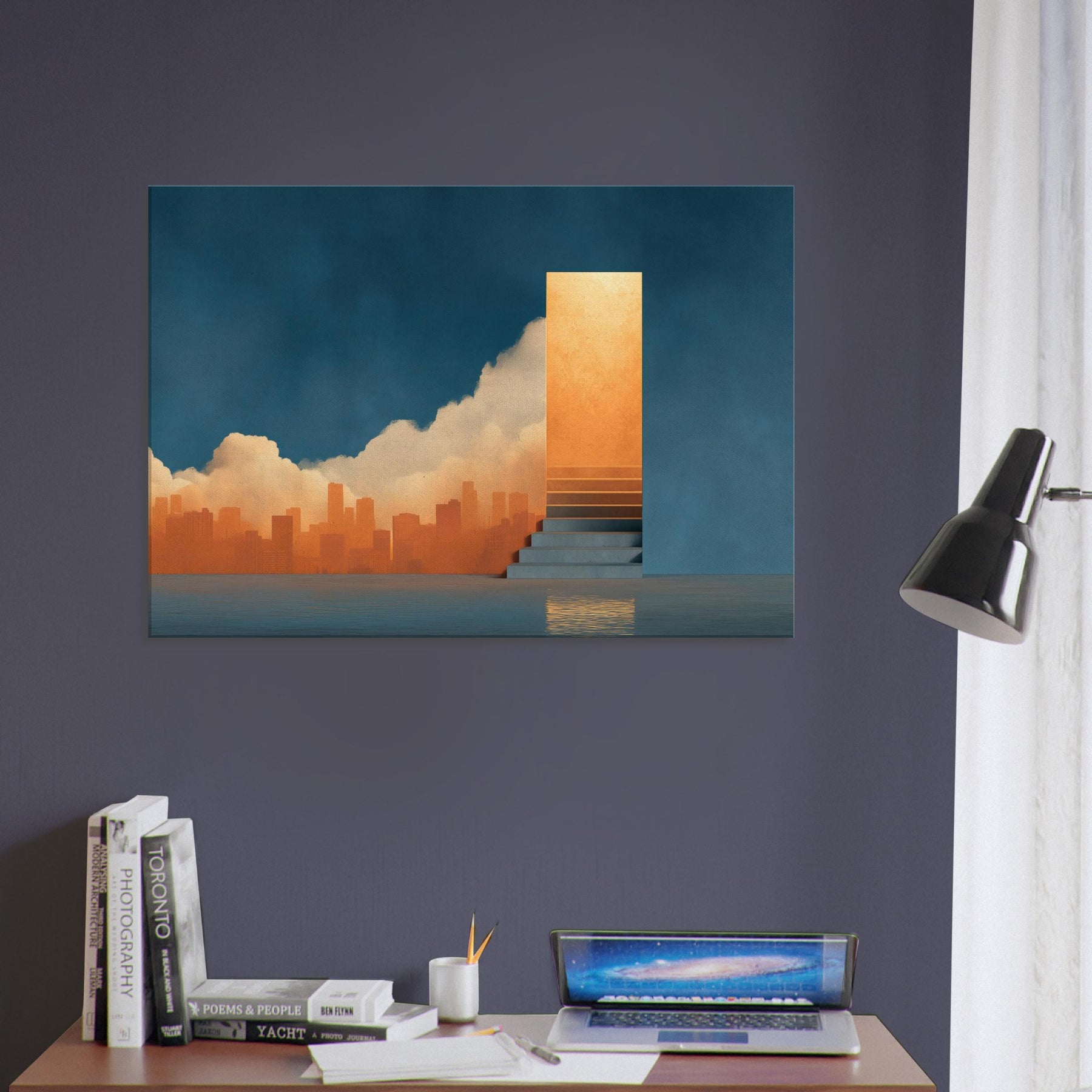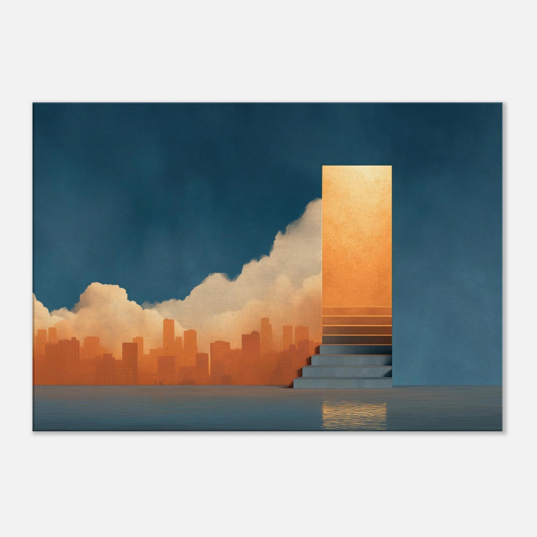 Harbor unfolds as a dreamscape where the city sighs into a glowing horizon. The surreal composition threads a warm orange skyline through a deep blue wall, while a solitary staircase ascends to a shimmering portal, as if inviting a voyage of the mind. This piece bathes a room in luminous calm, echoing the hush before twilight and the promise of new routes. Perfect for contemporary living spaces seeking atmosphere, depth, and a touch of poetic spectacle.