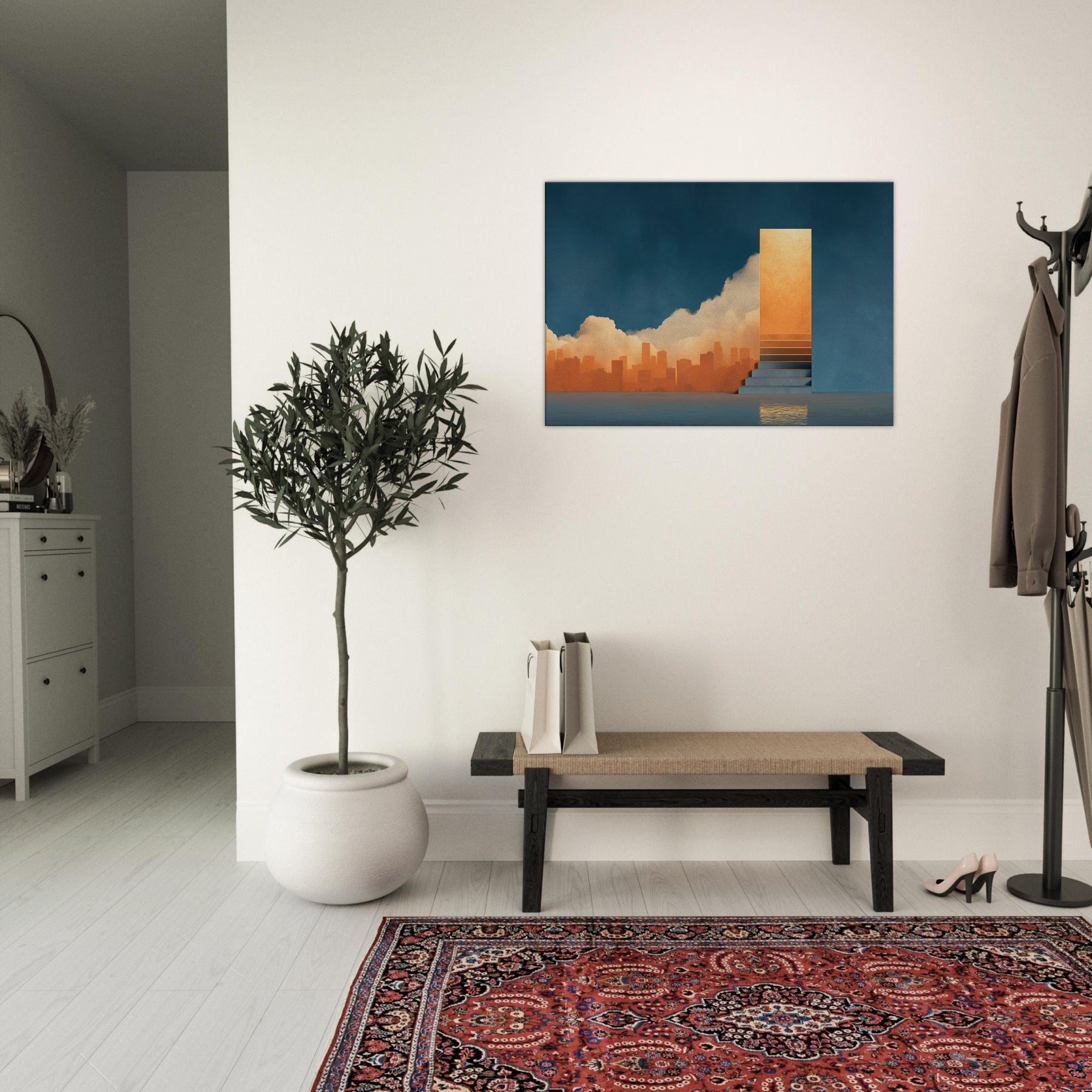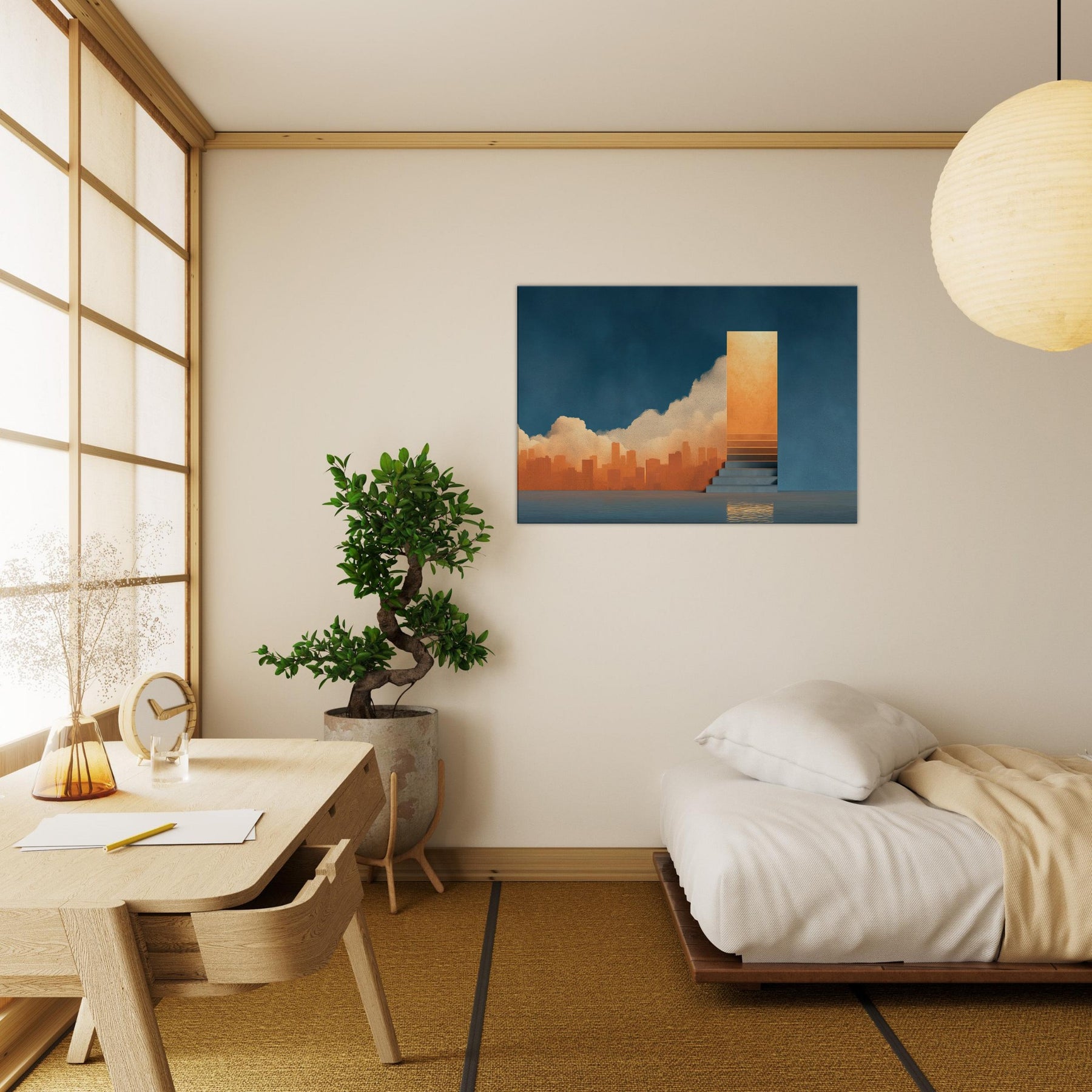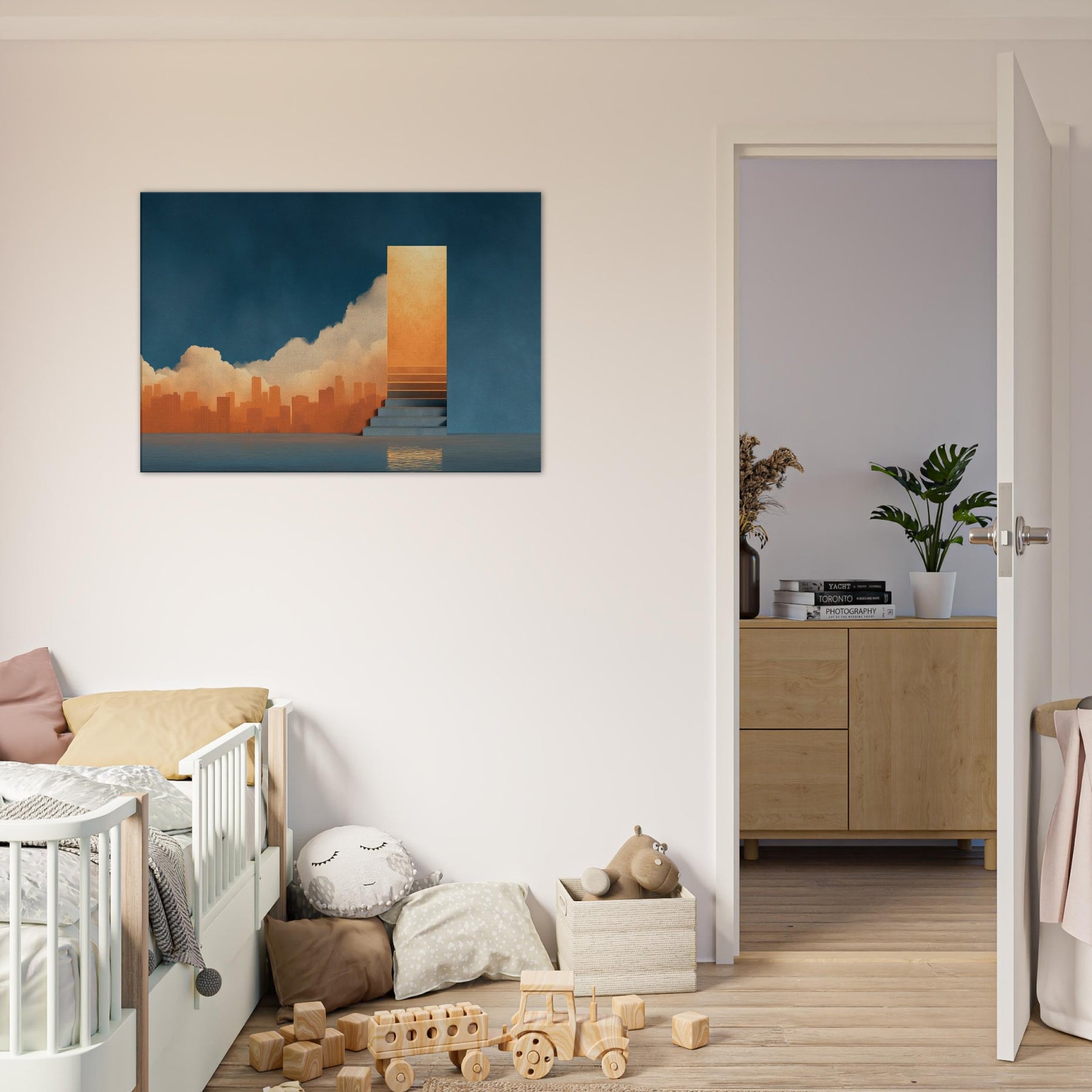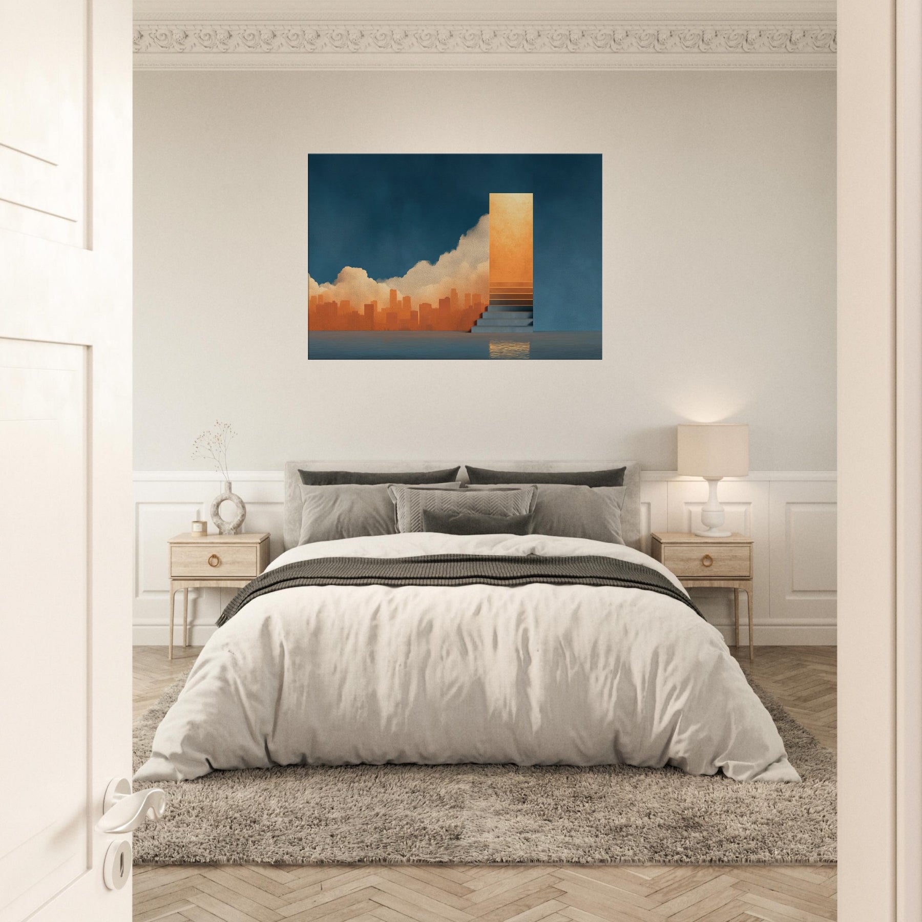 Harbor unfolds as a dreamscape where the city sighs into a glowing horizon. The surreal composition threads a warm orange skyline through a deep blue wall, while a solitary staircase ascends to a shimmering portal, as if inviting a voyage of the mind. This piece bathes a room in luminous calm, echoing the hush before twilight and the promise of new routes. Perfect for contemporary living spaces seeking atmosphere, depth, and a touch of poetic spectacle.