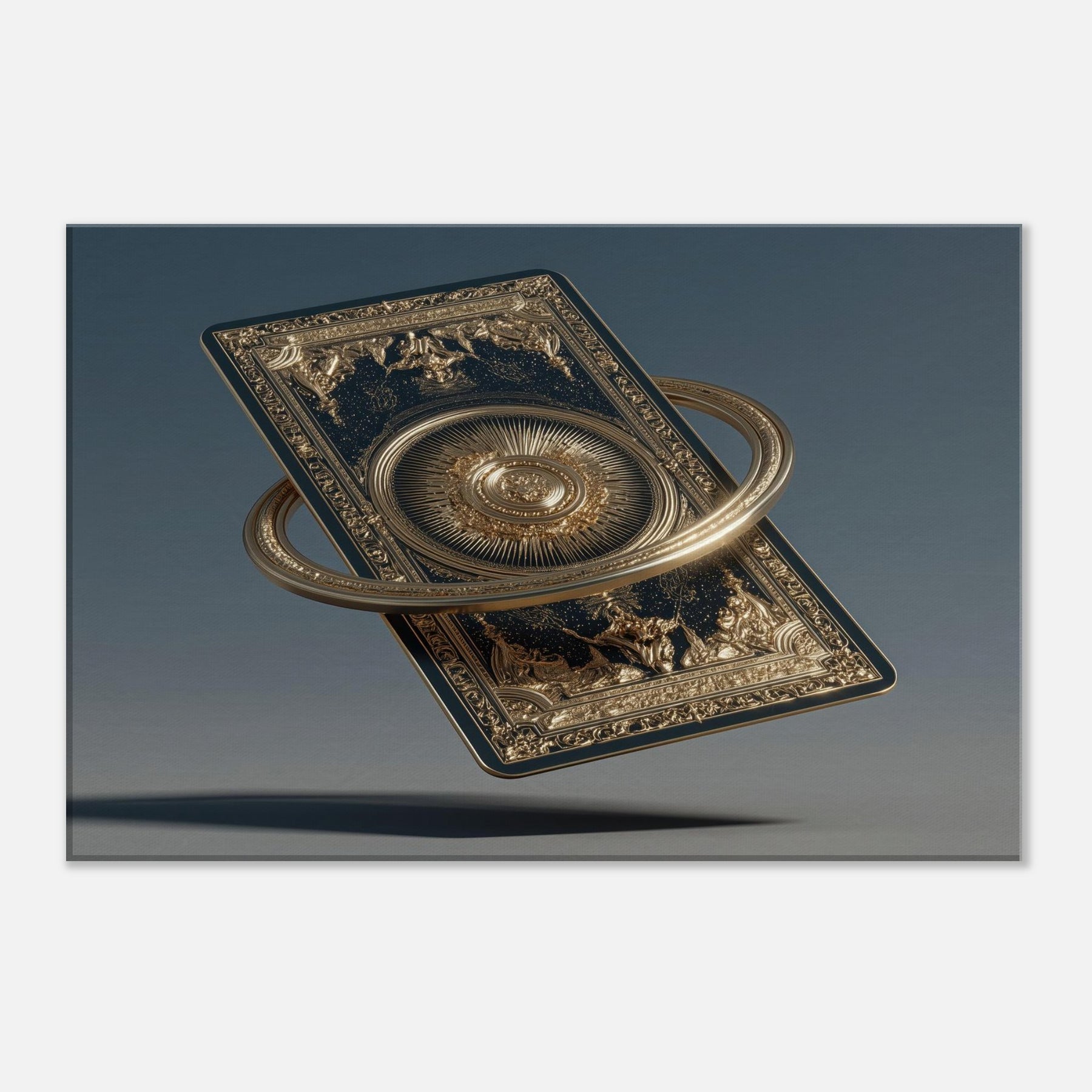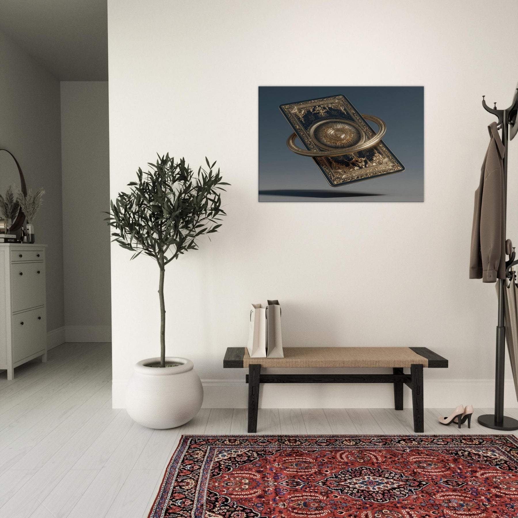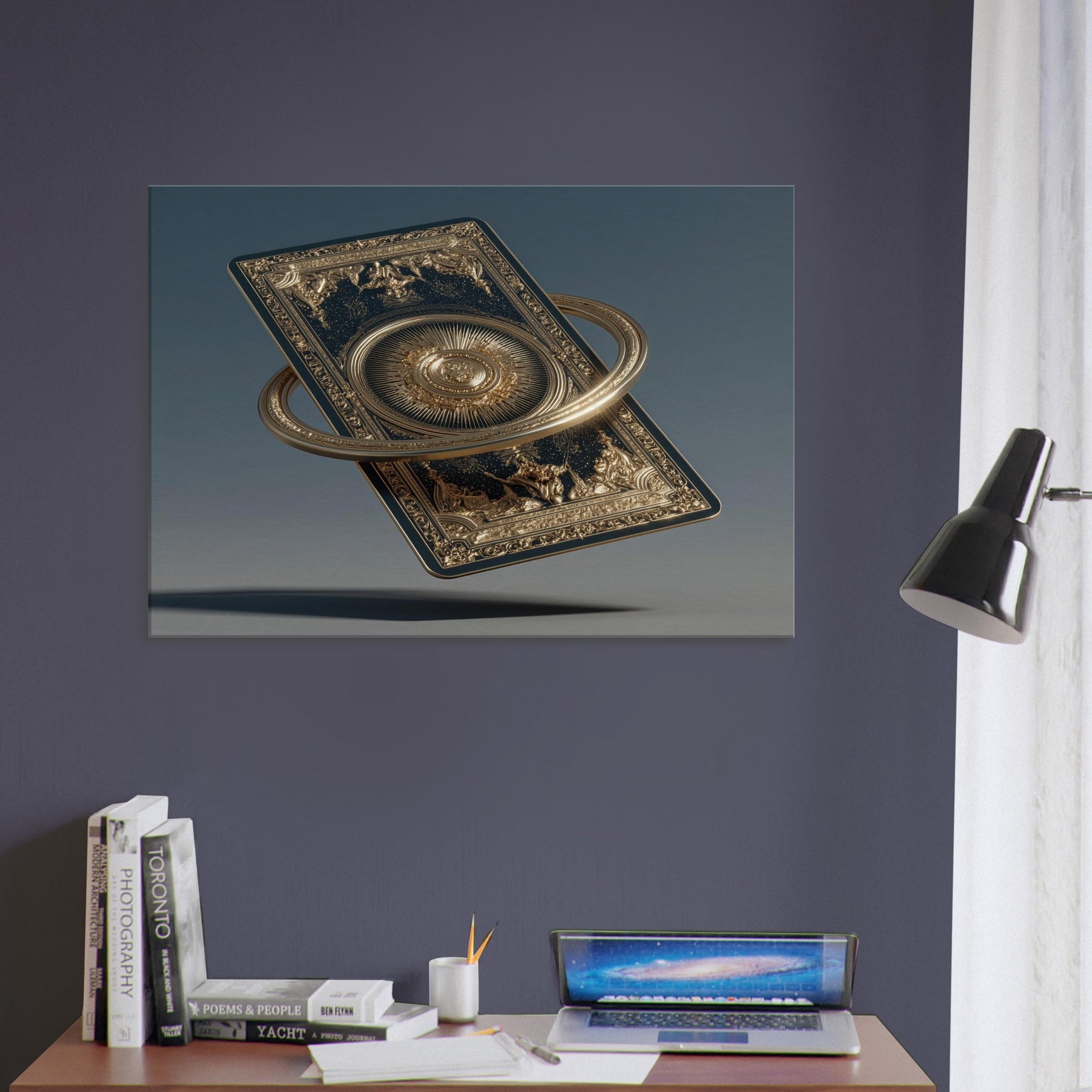 Bathed in a molten gold radiance, this piece translates Tarot Cards into a dreamscape where time loops and symbols whisper. The surreal composition invites a hush of contemplation, a space to pause and breathe as night descends within daylight walls. The ornate deck, suspended and spiraling, anchors a living room with ritual calm, turning everyday moments into a portal of imagination. Let the mystical atmosphere soften edges, invite quiet conversation, and transform your space into a sanctuary of wonder.