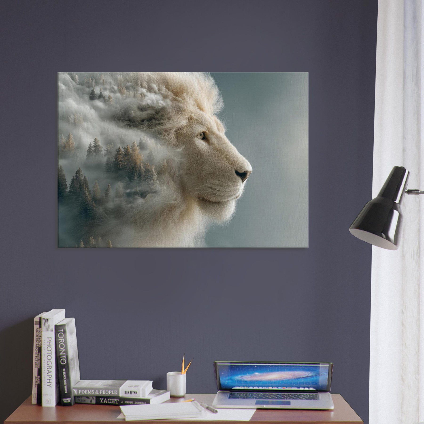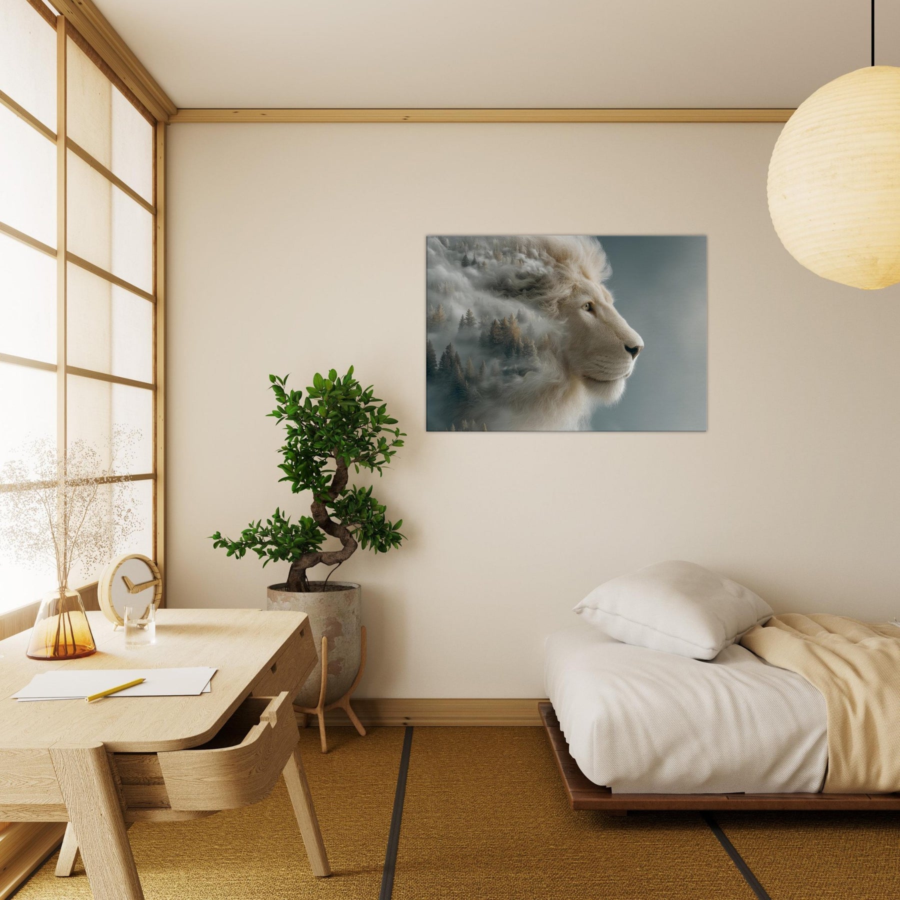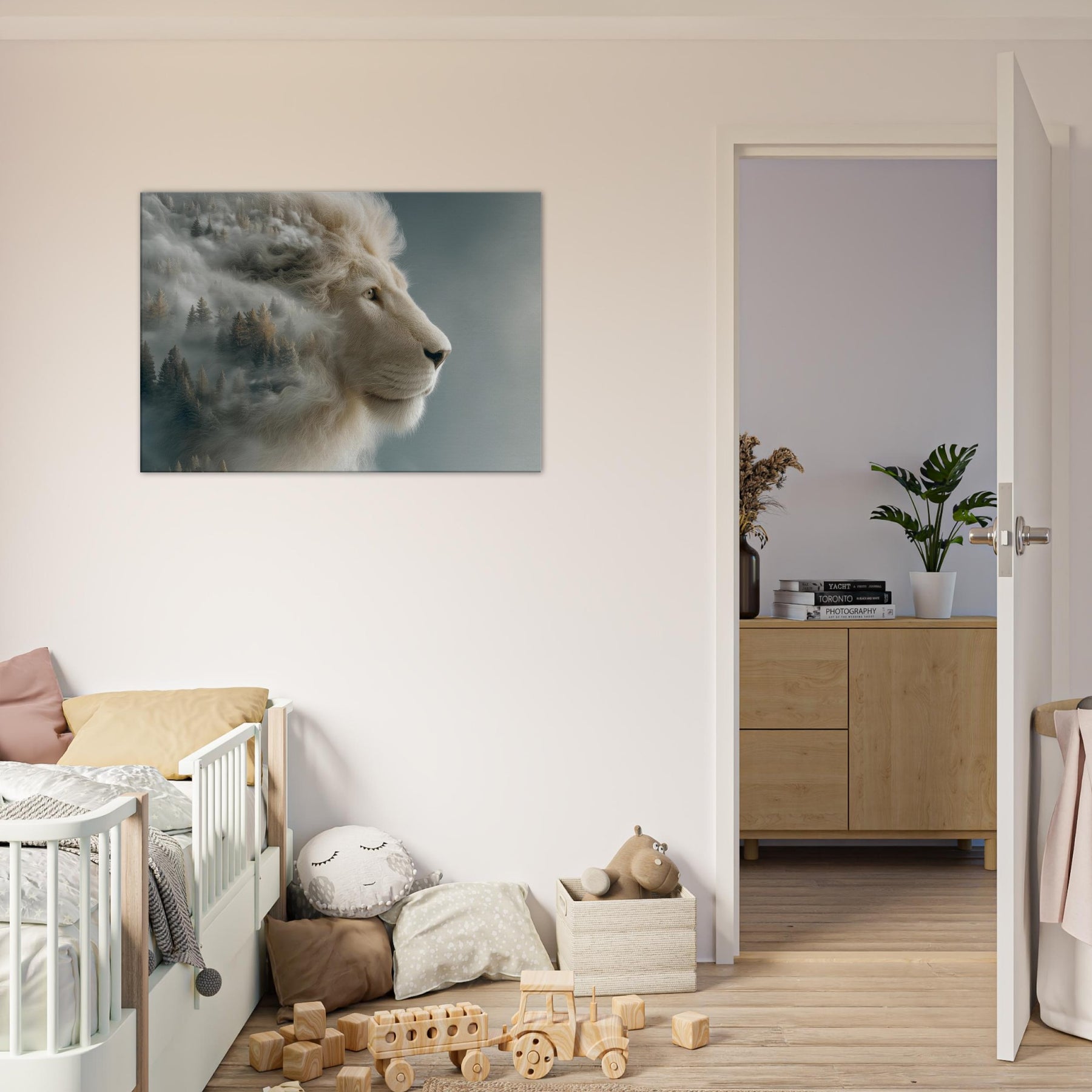 As the Primary Subject, the Lion emerges from a dreamscape where fog and evergreen silhouettes melt into one luminous horizon. The painting’s tactile fur, wind swept and serene, carries the hush of a forest at dawn, inviting touch and contemplation. This surreal fusion of creature and canopy textures creates a slow, meditative atmosphere a focal point that warms a living room or study with quiet authority, depth, and a hint of mystery.