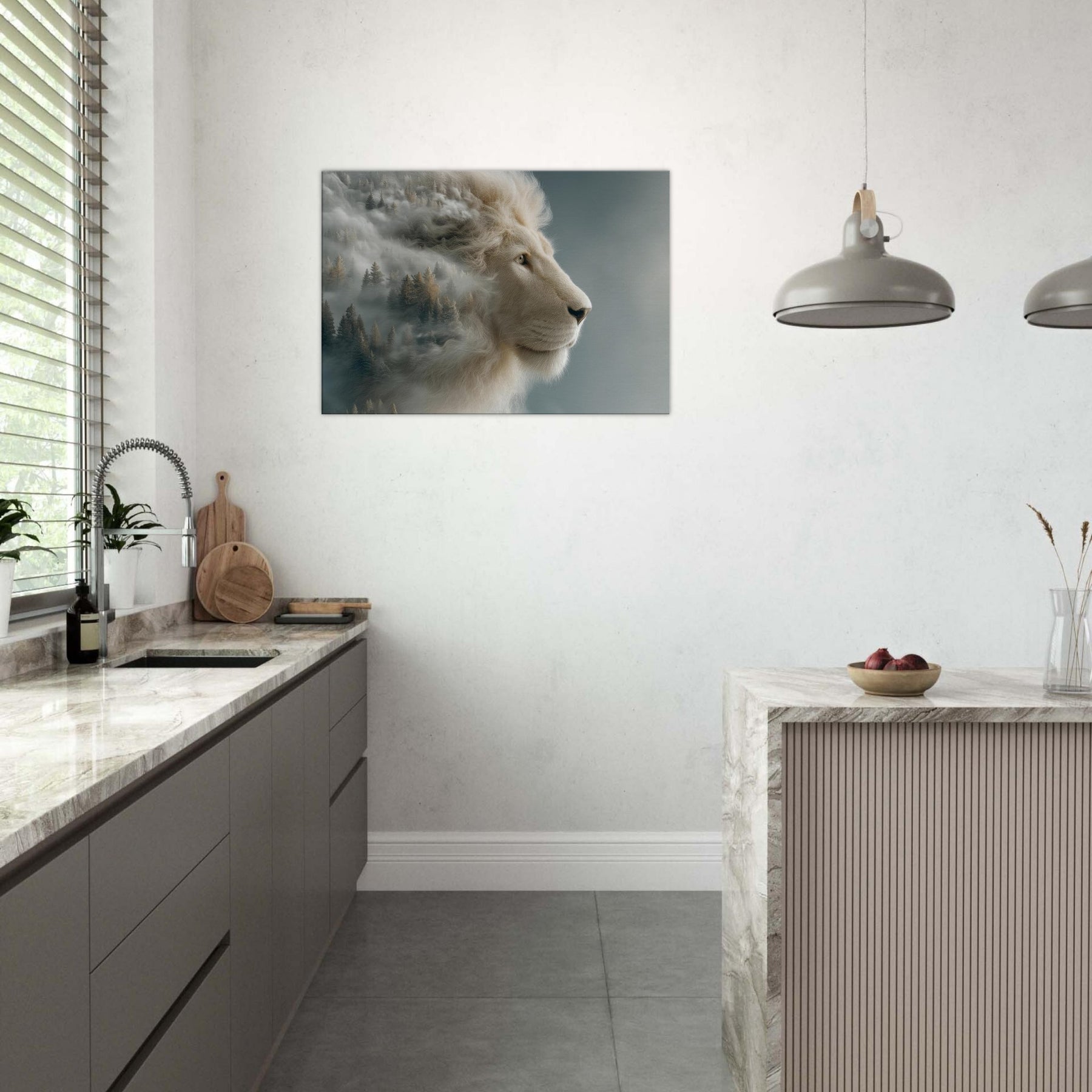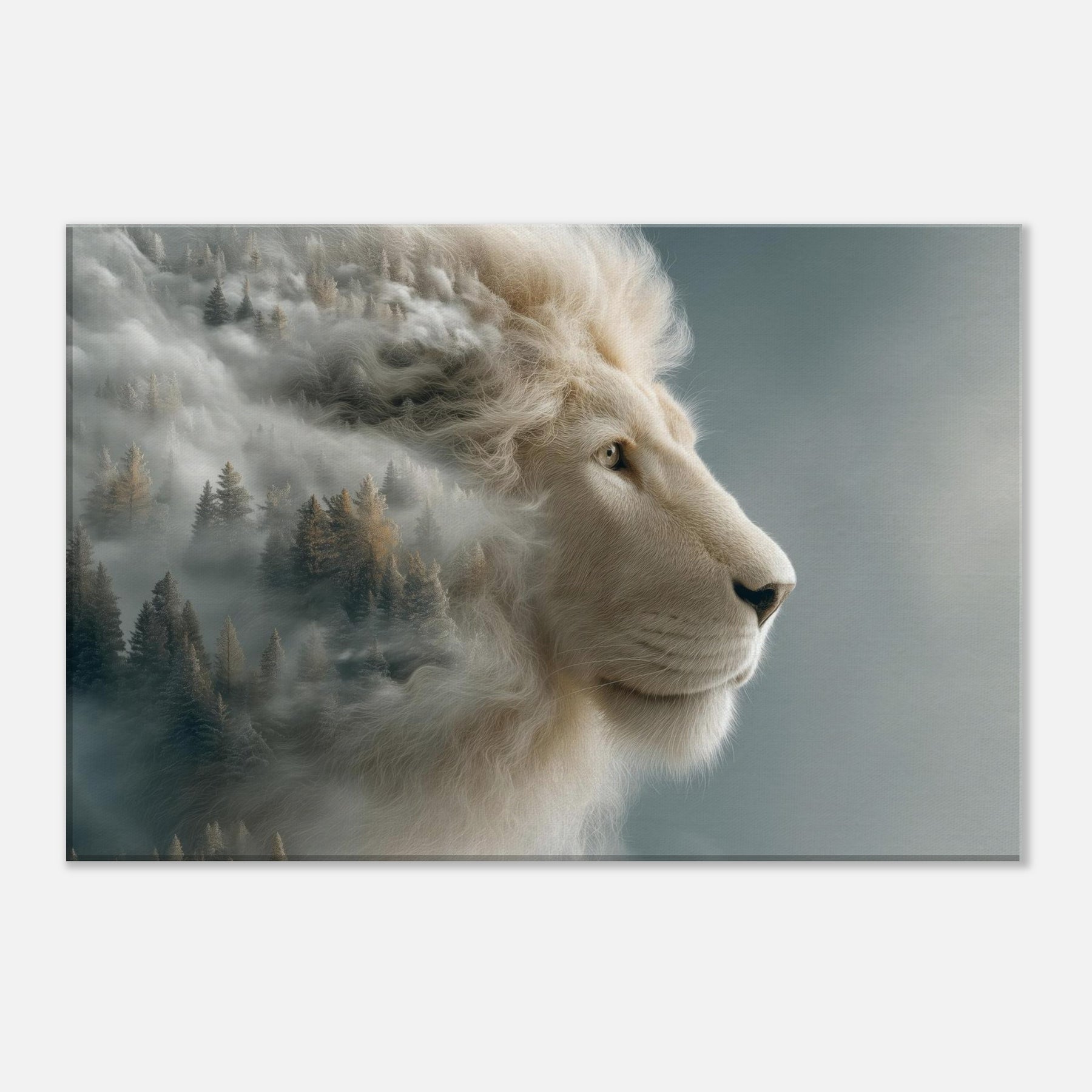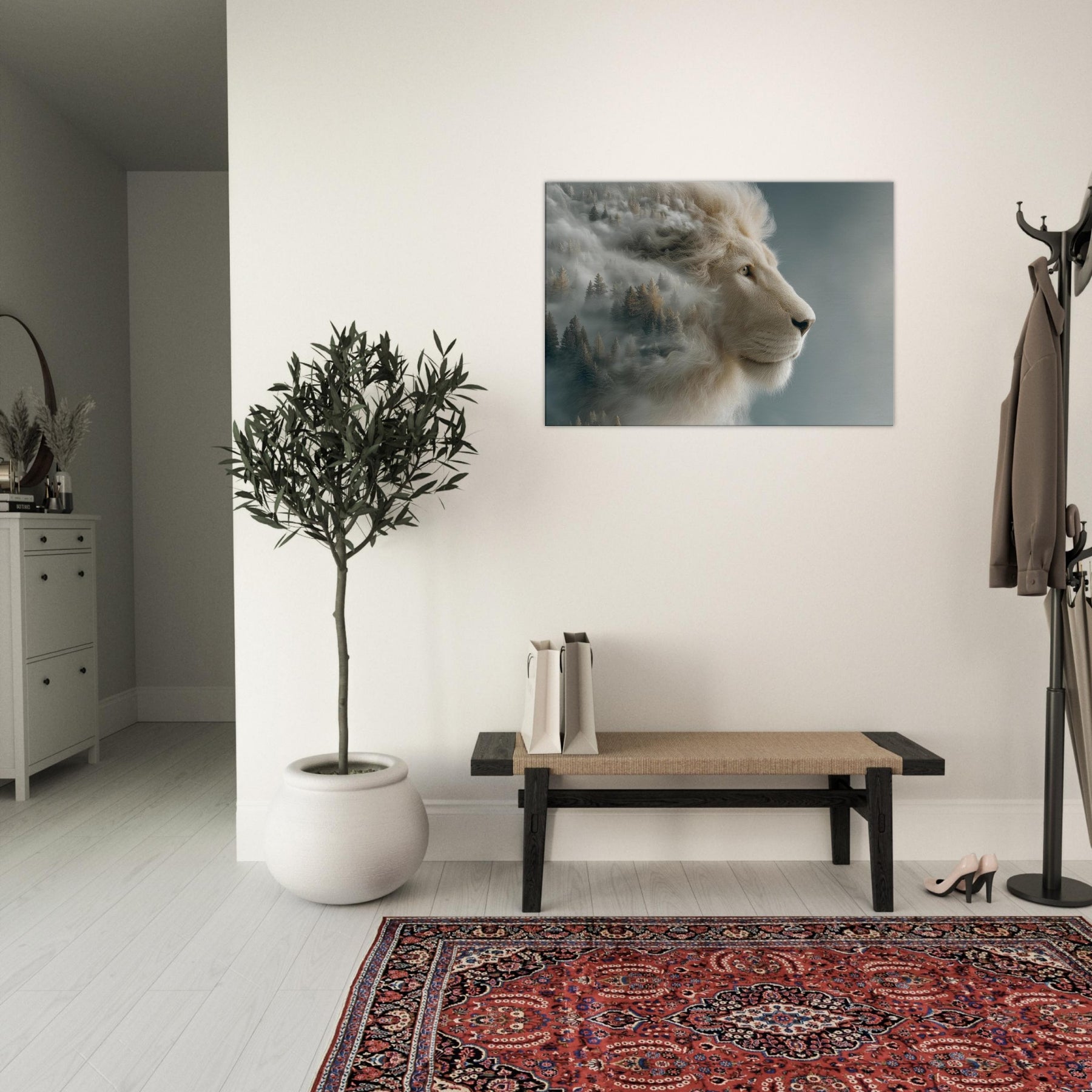 As the Primary Subject, the Lion emerges from a dreamscape where fog and evergreen silhouettes melt into one luminous horizon. The painting’s tactile fur, wind swept and serene, carries the hush of a forest at dawn, inviting touch and contemplation. This surreal fusion of creature and canopy textures creates a slow, meditative atmosphere a focal point that warms a living room or study with quiet authority, depth, and a hint of mystery.