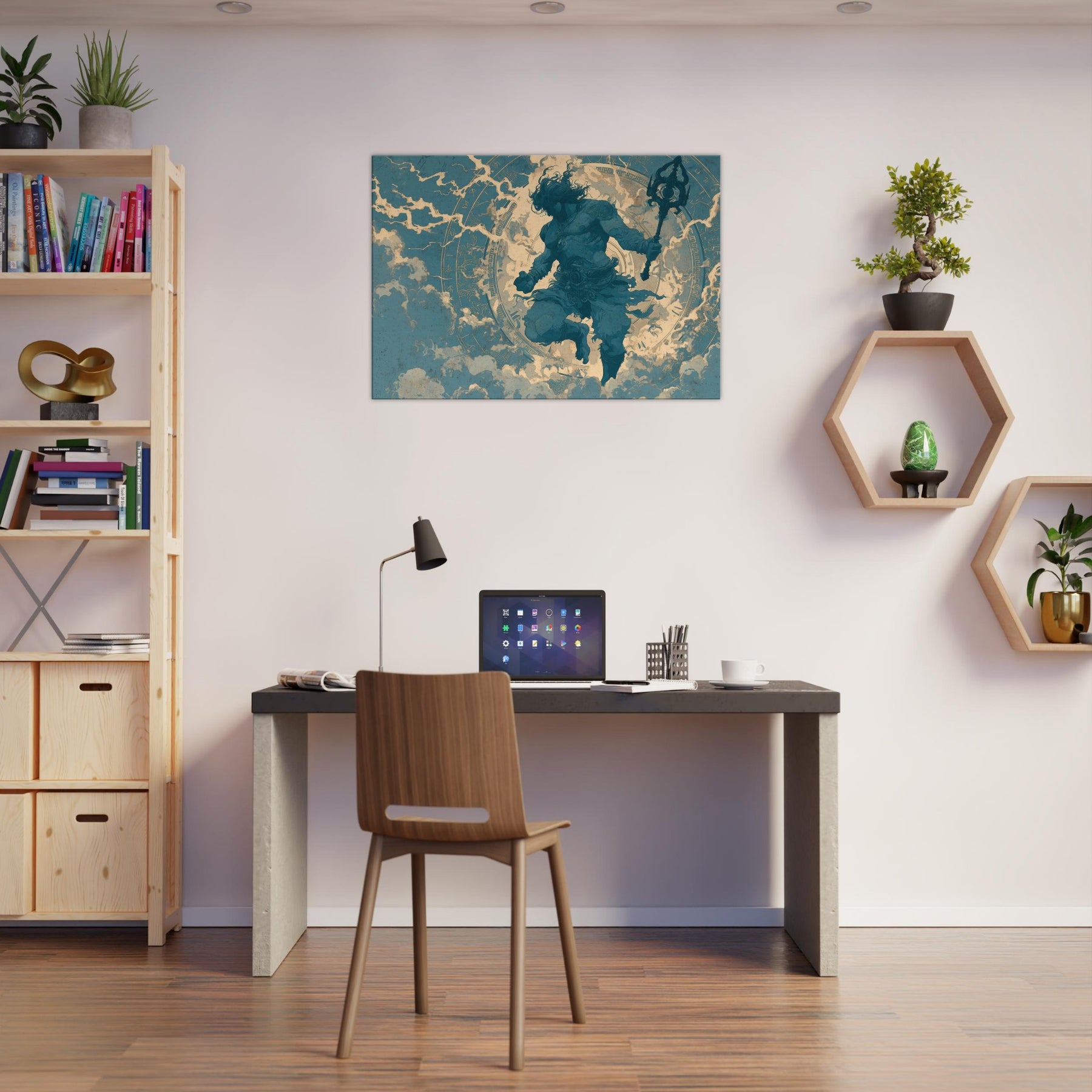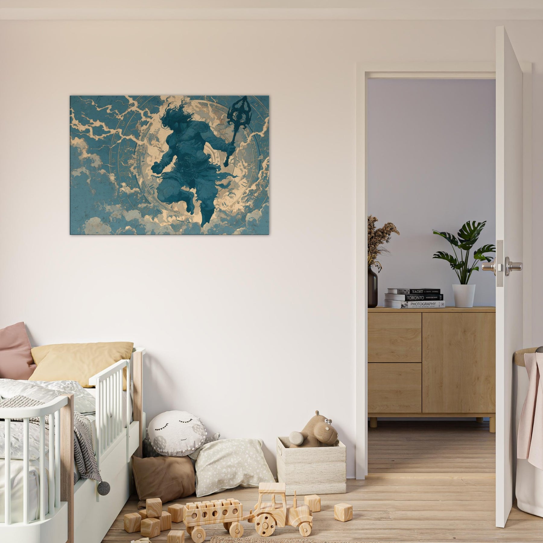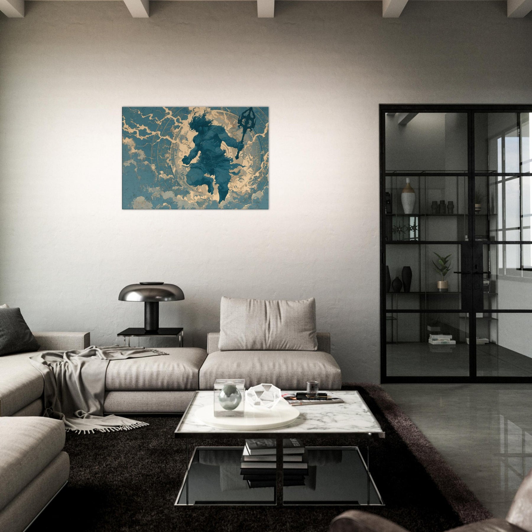 Zeus soars through a celestial clockwork in this dreamlike vision, where thunder becomes wind and the heavens breathe in two tones of teal and ochre. The Surrealist arrangement folds mythic power into a living room whisper: statuesque and intimate, storm light tracing the muscles of his form, the trident like staff cracking the air. This painting invites contemplation as it charges your space with awe, courage, and a hint of mythic play, turning everyday walls into an epic atmosphere. The central subject is Zeus, God of Thunder and Sky.