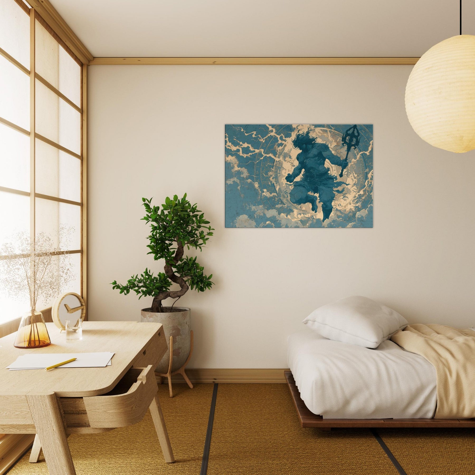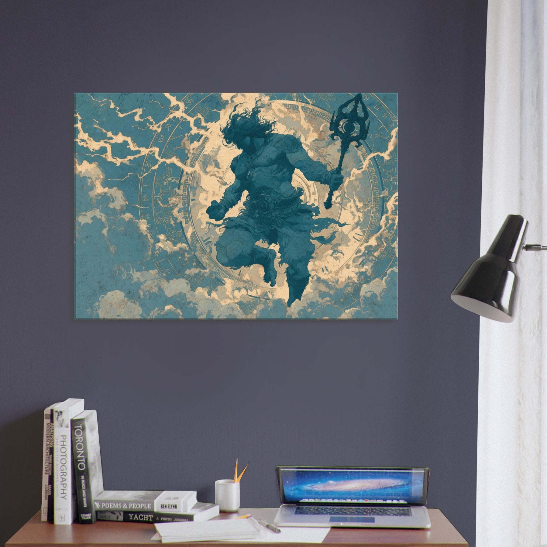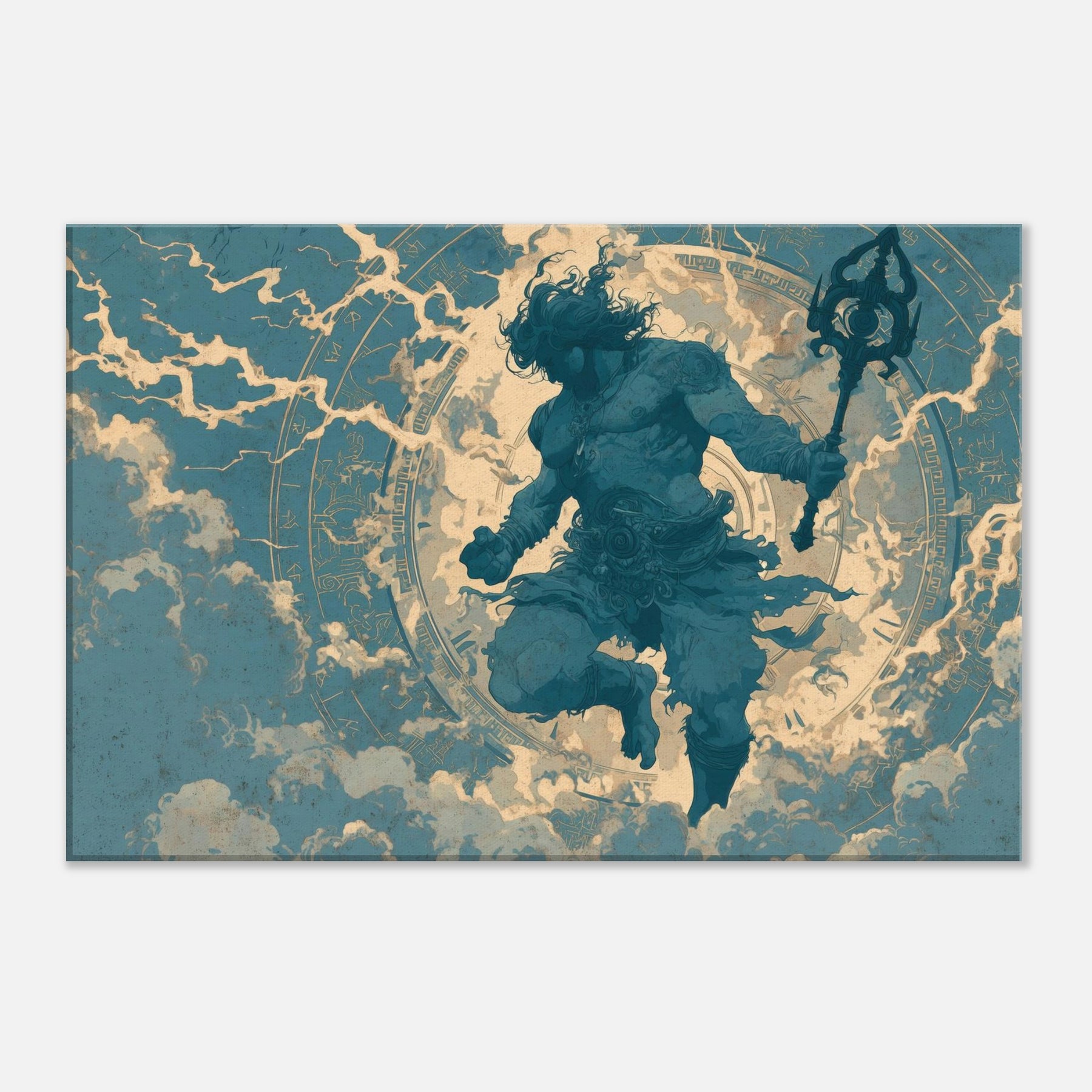 Zeus soars through a celestial clockwork in this dreamlike vision, where thunder becomes wind and the heavens breathe in two tones of teal and ochre. The Surrealist arrangement folds mythic power into a living room whisper: statuesque and intimate, storm light tracing the muscles of his form, the trident like staff cracking the air. This painting invites contemplation as it charges your space with awe, courage, and a hint of mythic play, turning everyday walls into an epic atmosphere. The central subject is Zeus, God of Thunder and Sky.