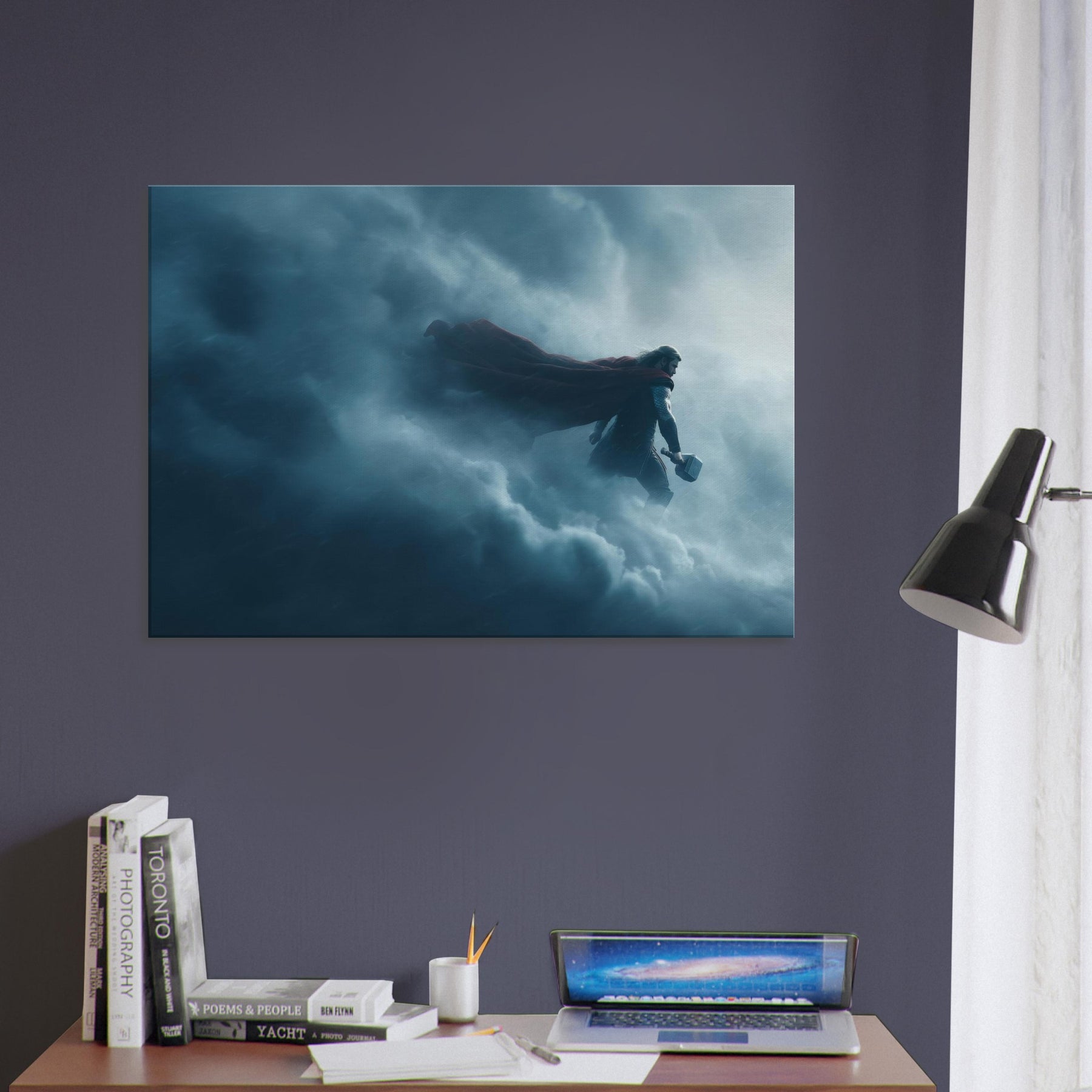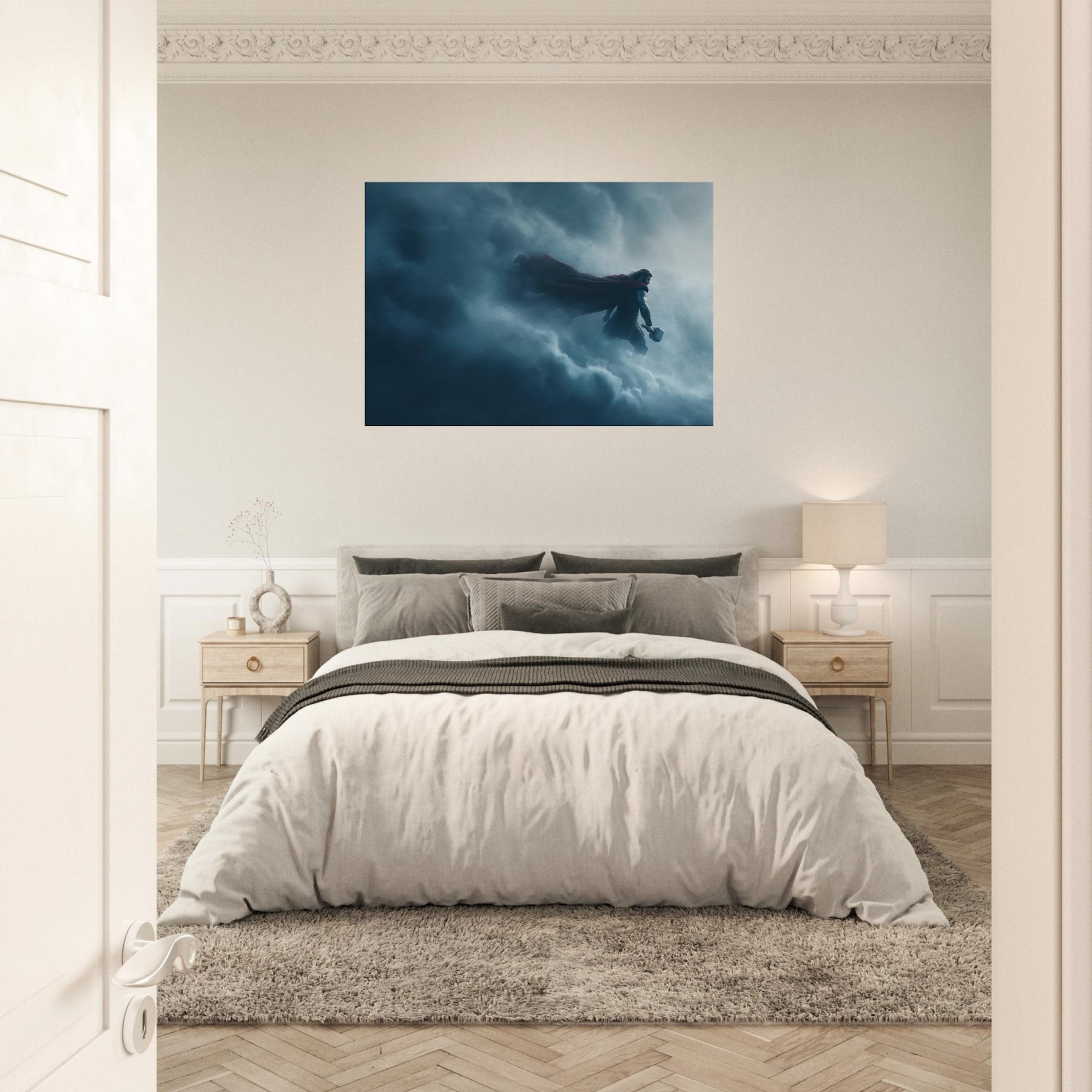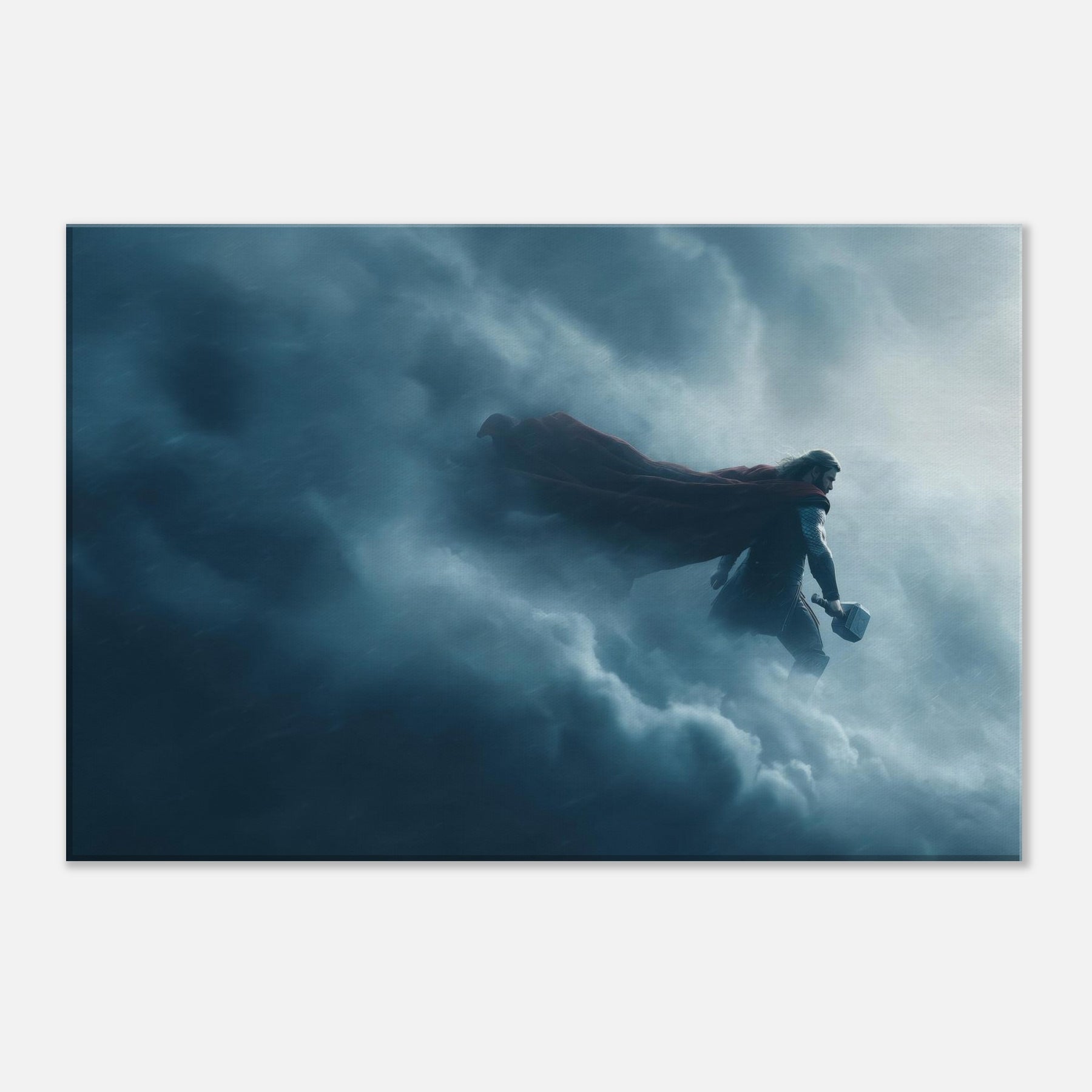 In this dreamlike tableau, Thor, God of Thunder Wielding Mjölnir stands at the edge of storm, cape billowing, suspended between lightning and silence. The surreal composition bends space, the clouds become a cathedral, the hammer a bright star. The color palette of storm blues and silver invites contemplation, turning any living space into a sanctuary of awe. A single print anchors drama and wonder in the room, inviting conversation and reverence.