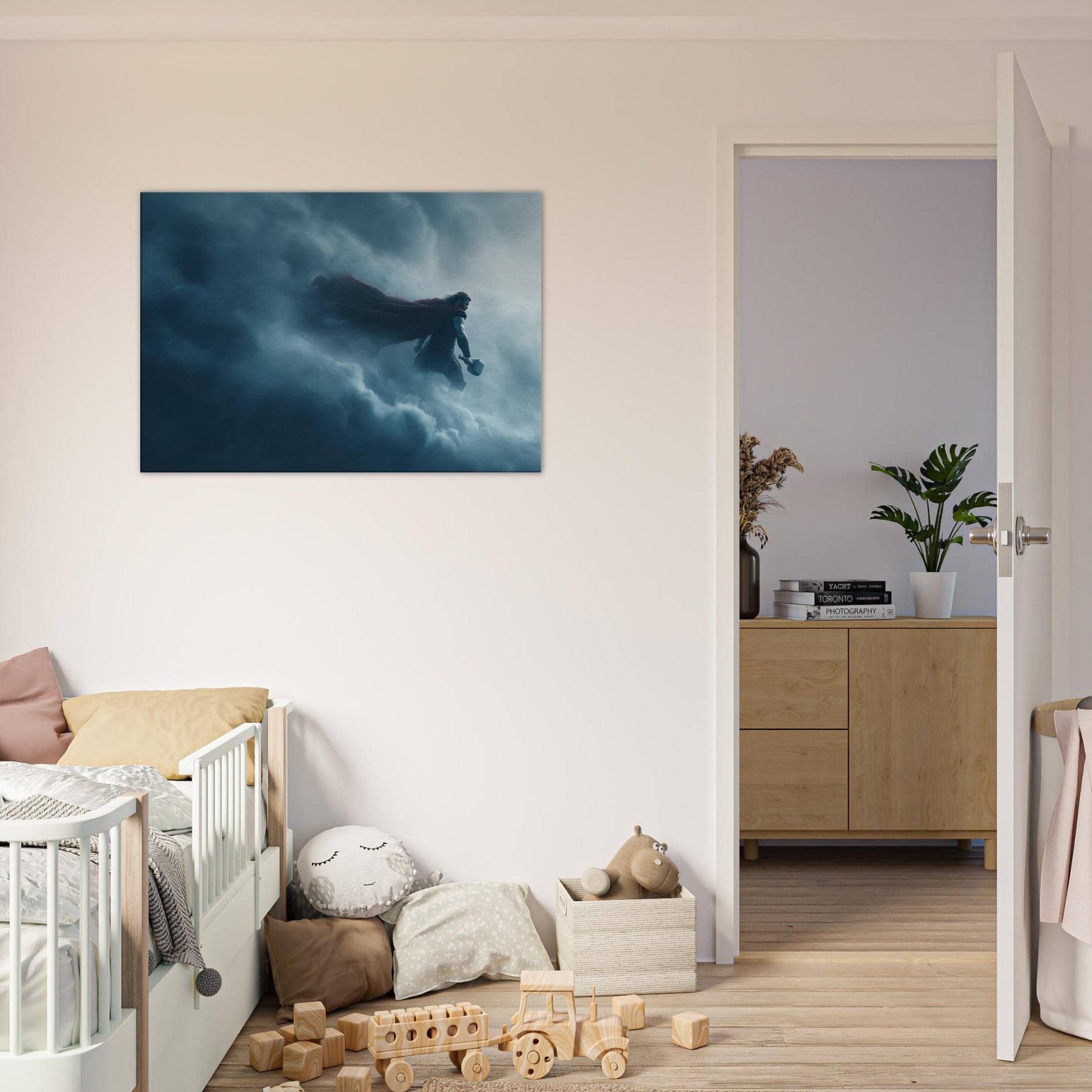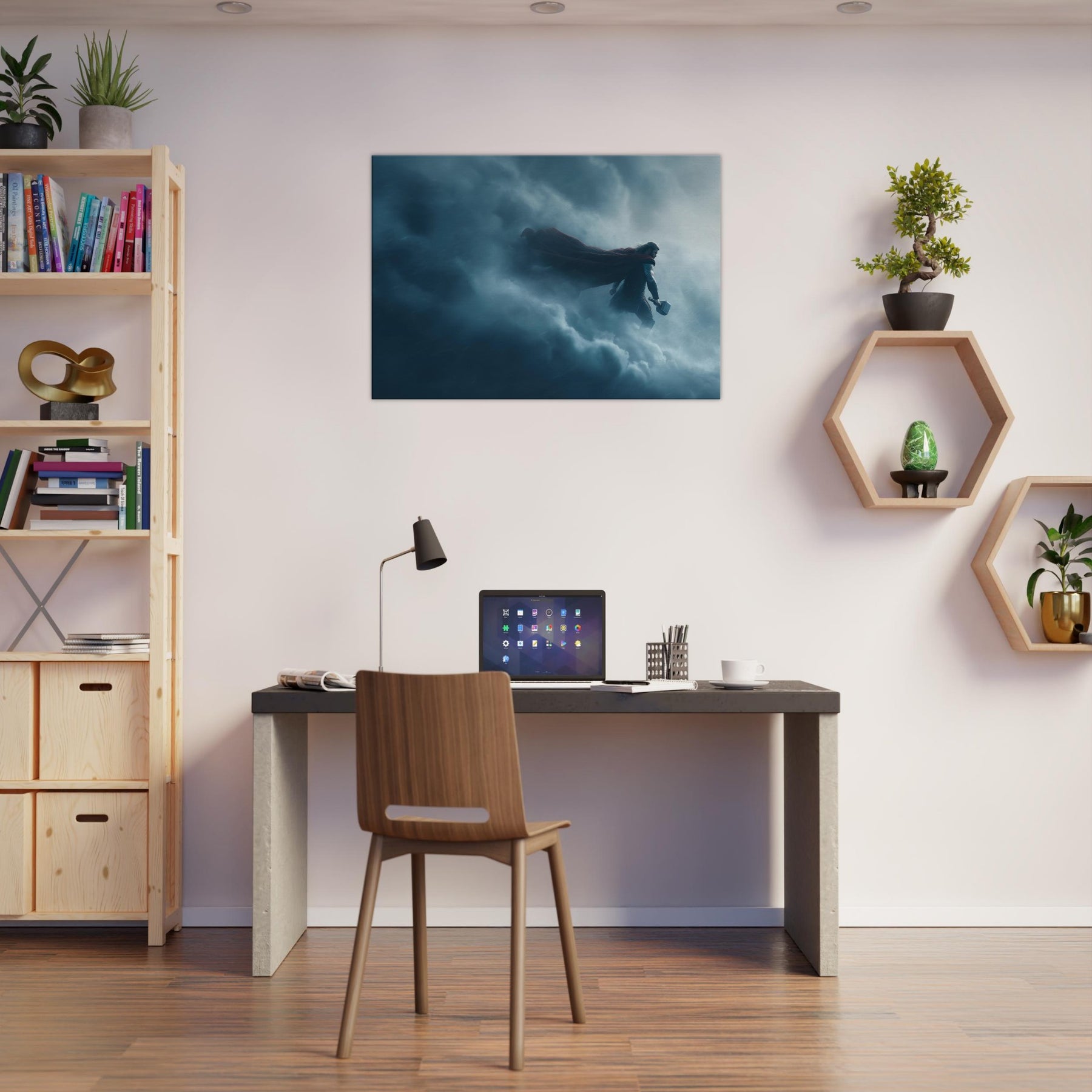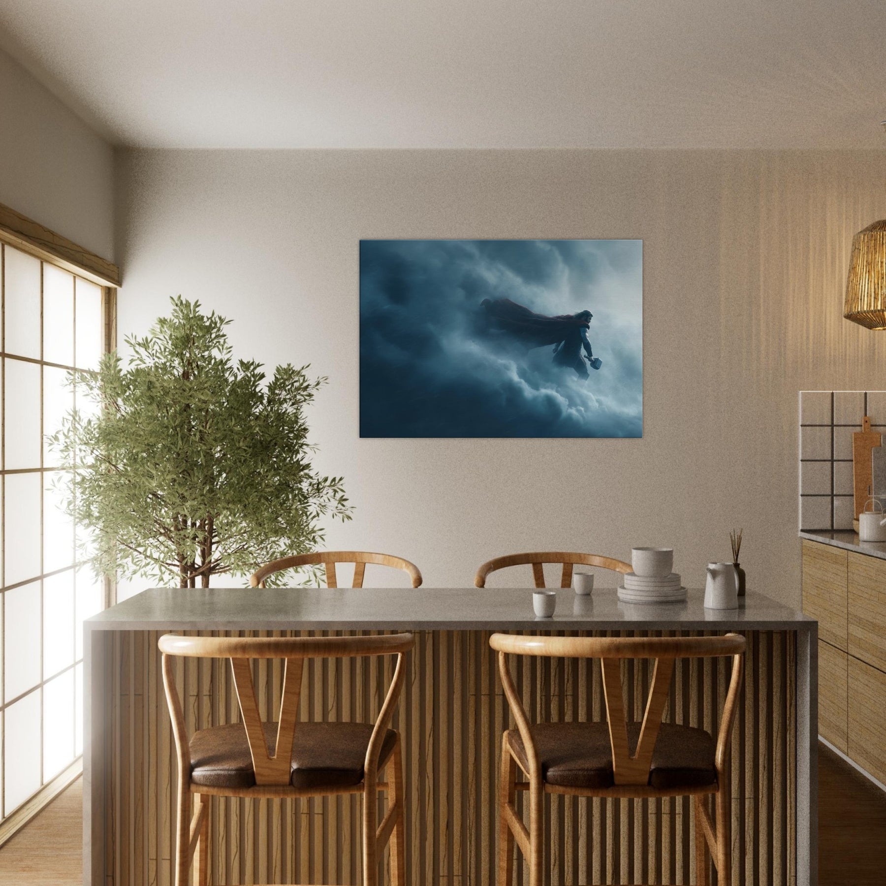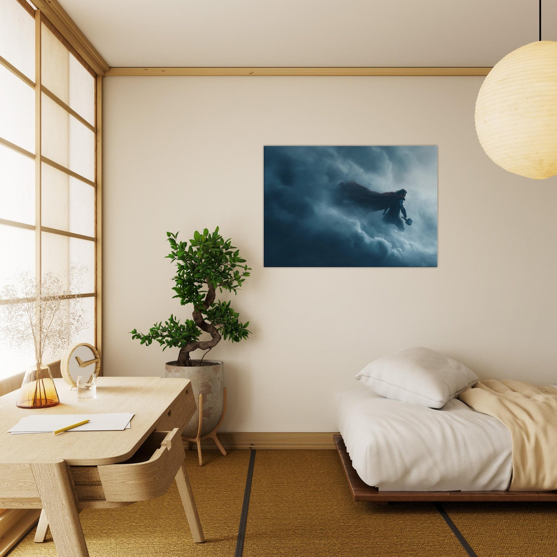In this dreamlike tableau, Thor, God of Thunder Wielding Mjölnir stands at the edge of storm, cape billowing, suspended between lightning and silence. The surreal composition bends space, the clouds become a cathedral, the hammer a bright star. The color palette of storm blues and silver invites contemplation, turning any living space into a sanctuary of awe. A single print anchors drama and wonder in the room, inviting conversation and reverence.
