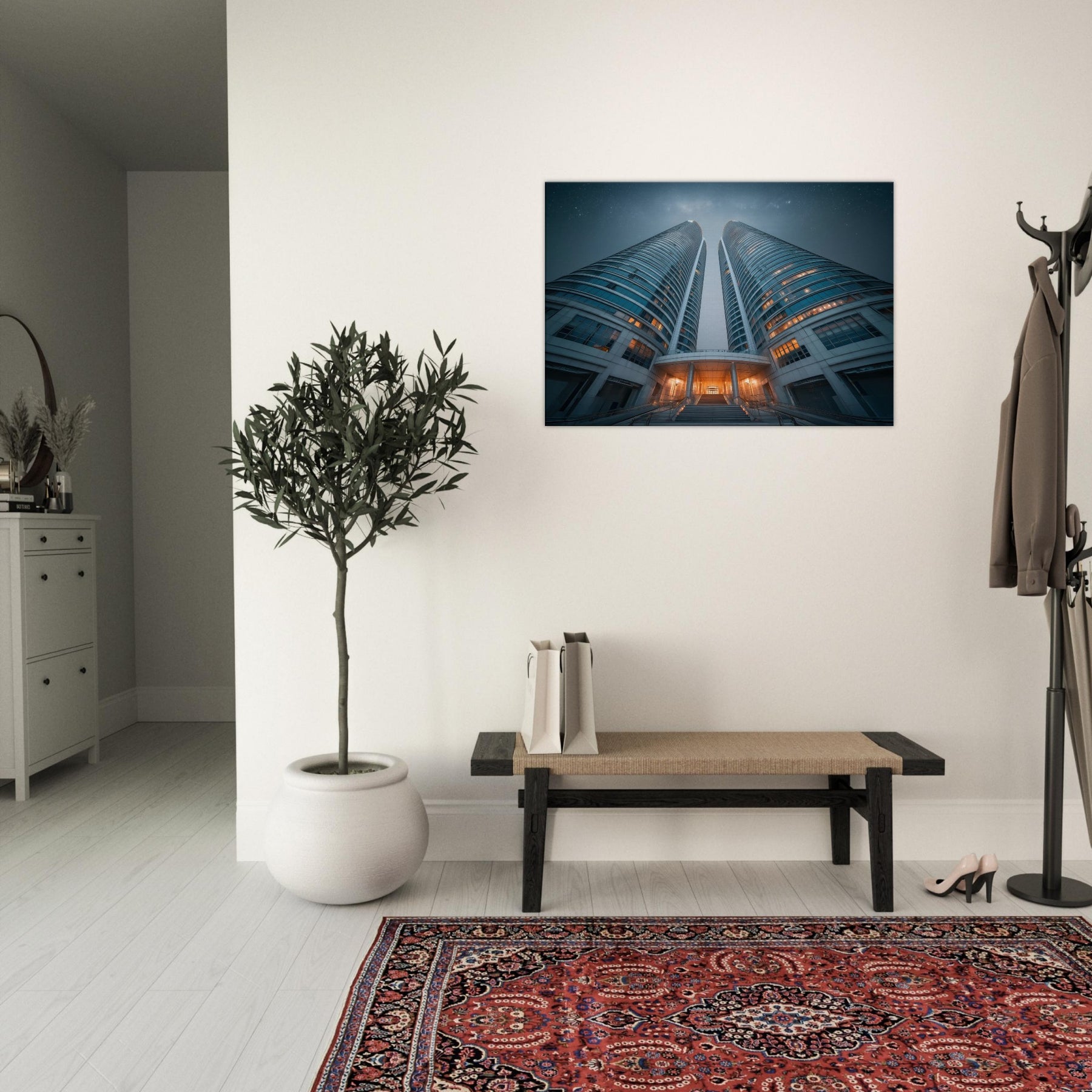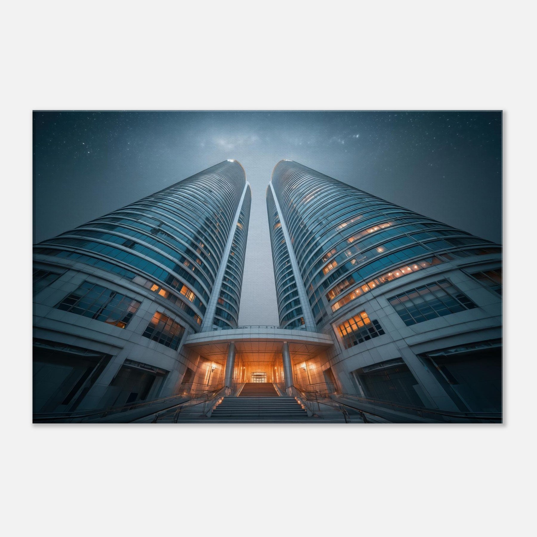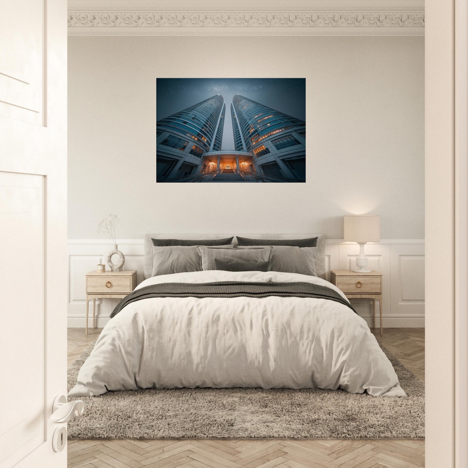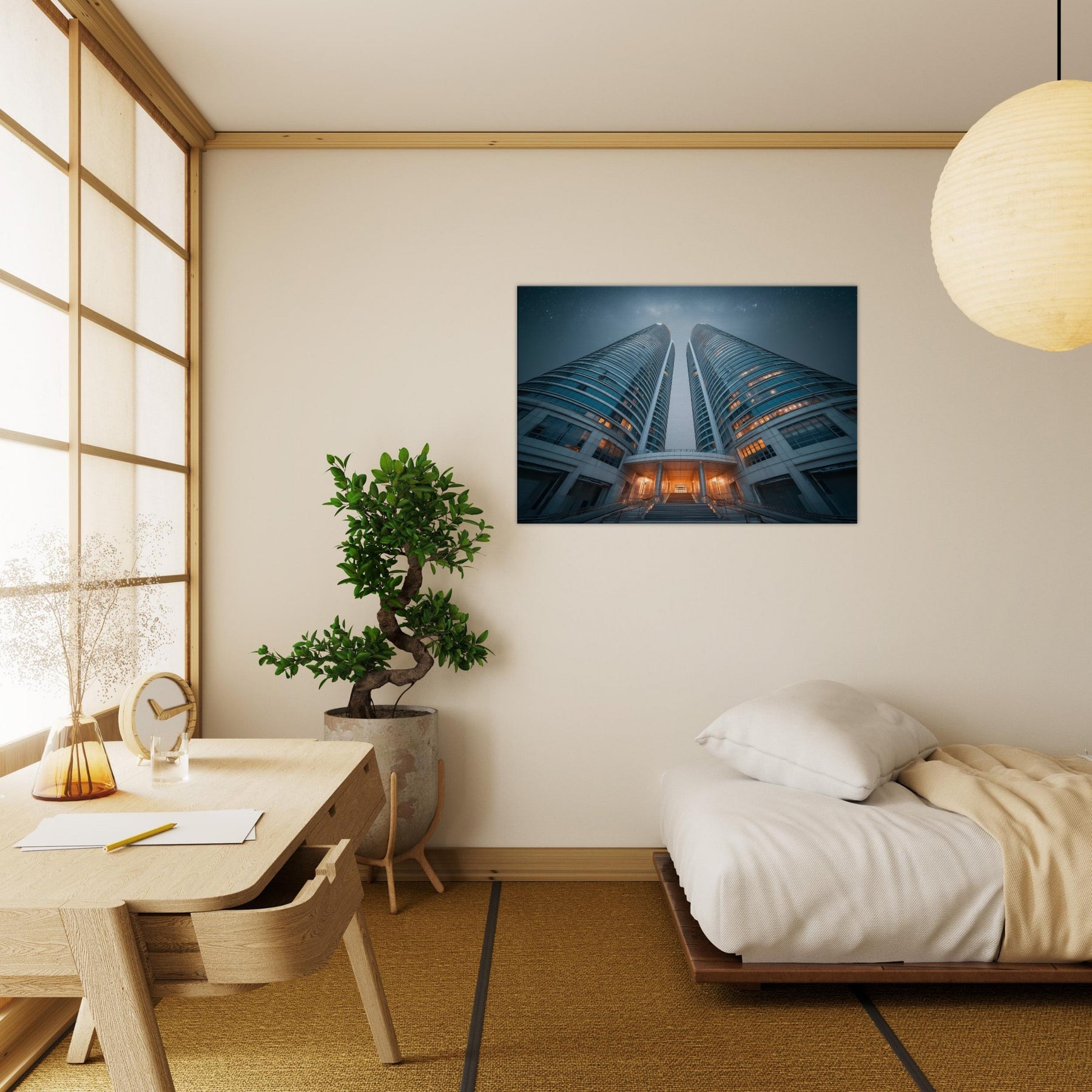 Awaiting at the edge of night, this wall piece reimagines Tokyo as a dreamscape of converging towers and glowing doorways. The twin curves rise like celestial beacons, their glass skin catching a star dusted sky and a warm, amber pulse from the lobby below. As you stand before it, the room inhales softly and time stretches, turning a corridor into a sanctuary where urban grandeur and intimate wonder mingle. A striking centerpiece that lends depth, warmth, and a sense of translucent infinity to any living space.