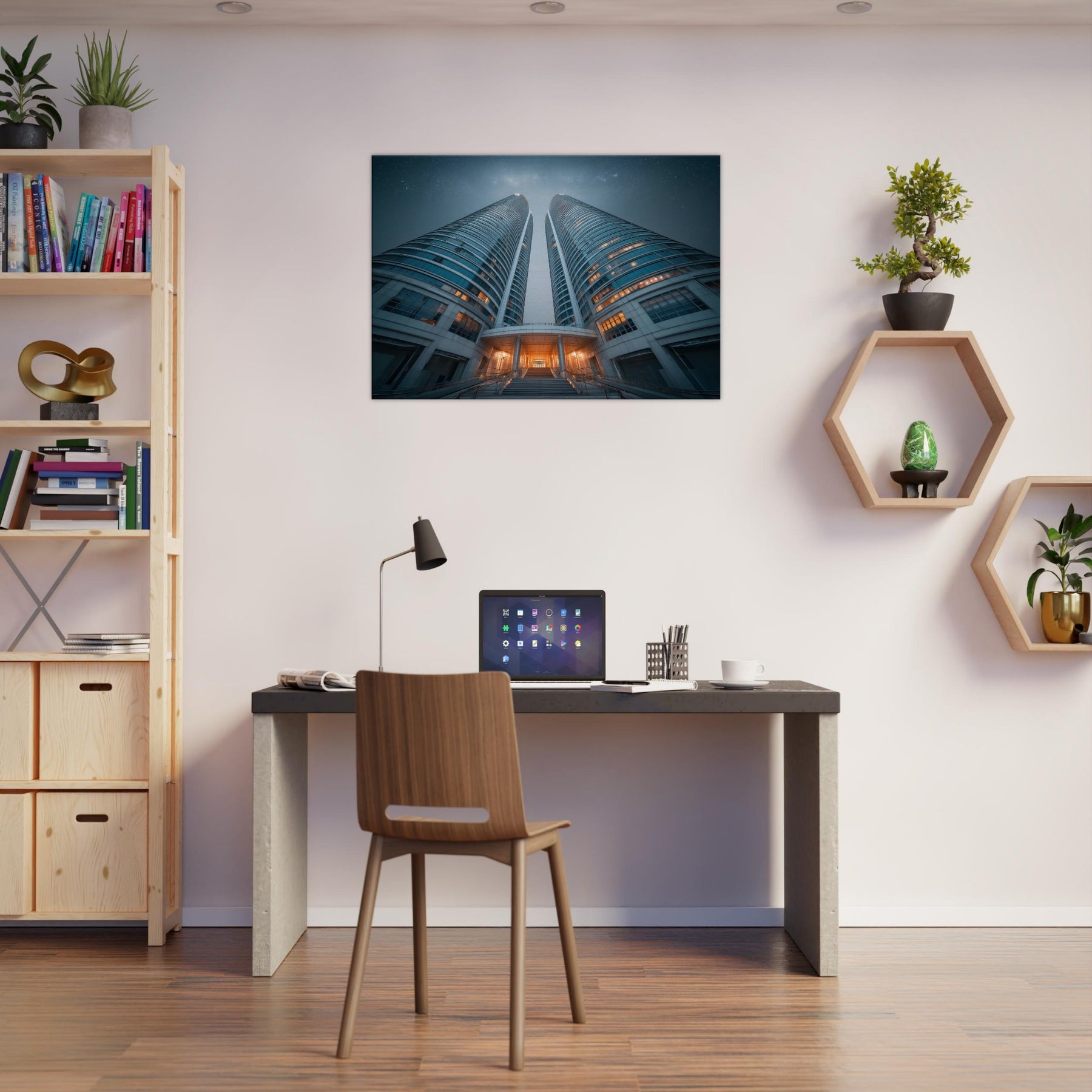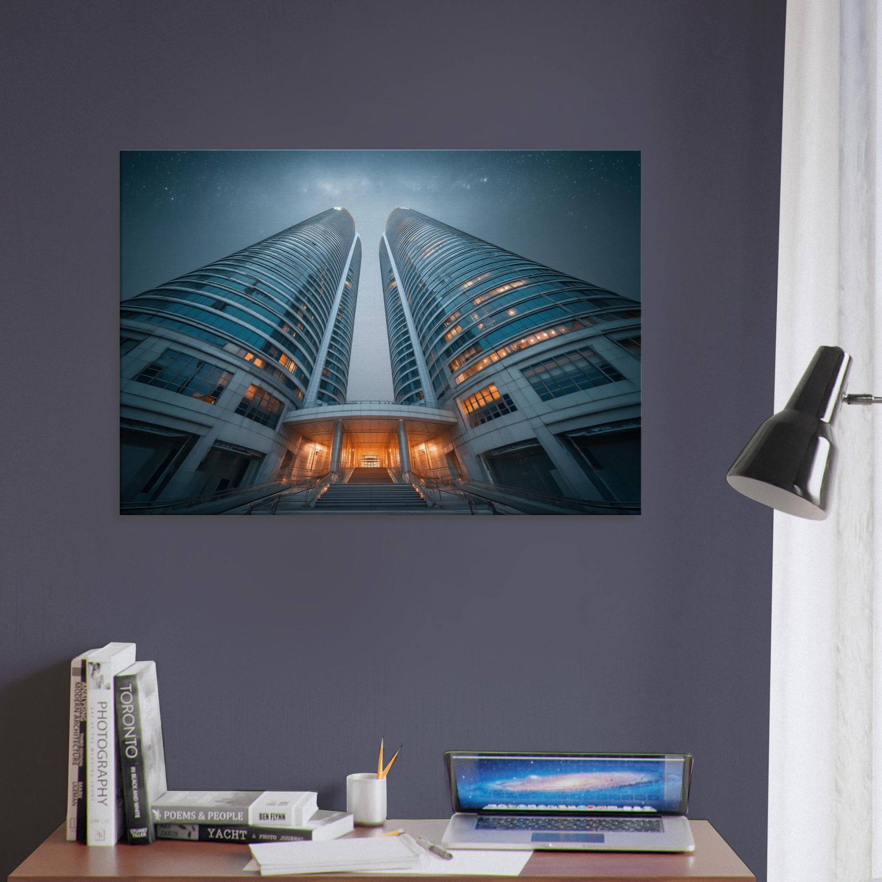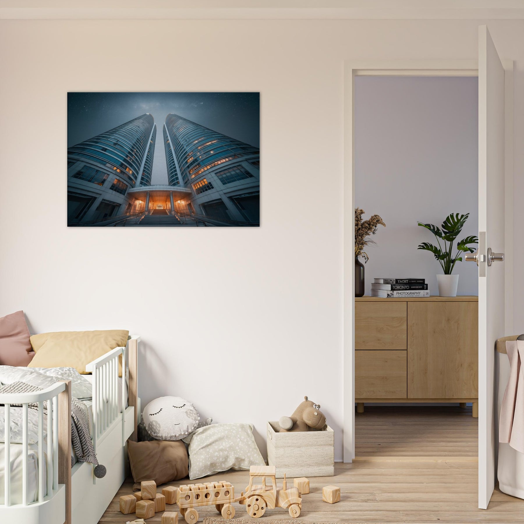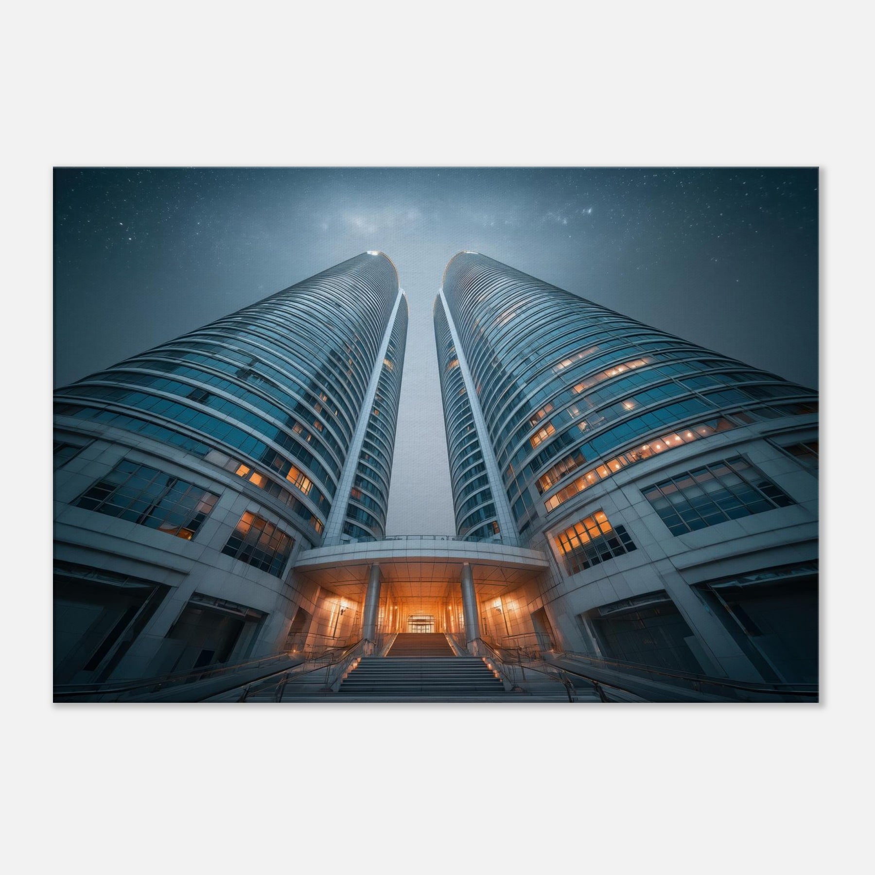 Awaiting at the edge of night, this wall piece reimagines Tokyo as a dreamscape of converging towers and glowing doorways. The twin curves rise like celestial beacons, their glass skin catching a star dusted sky and a warm, amber pulse from the lobby below. As you stand before it, the room inhales softly and time stretches, turning a corridor into a sanctuary where urban grandeur and intimate wonder mingle. A striking centerpiece that lends depth, warmth, and a sense of translucent infinity to any living space.