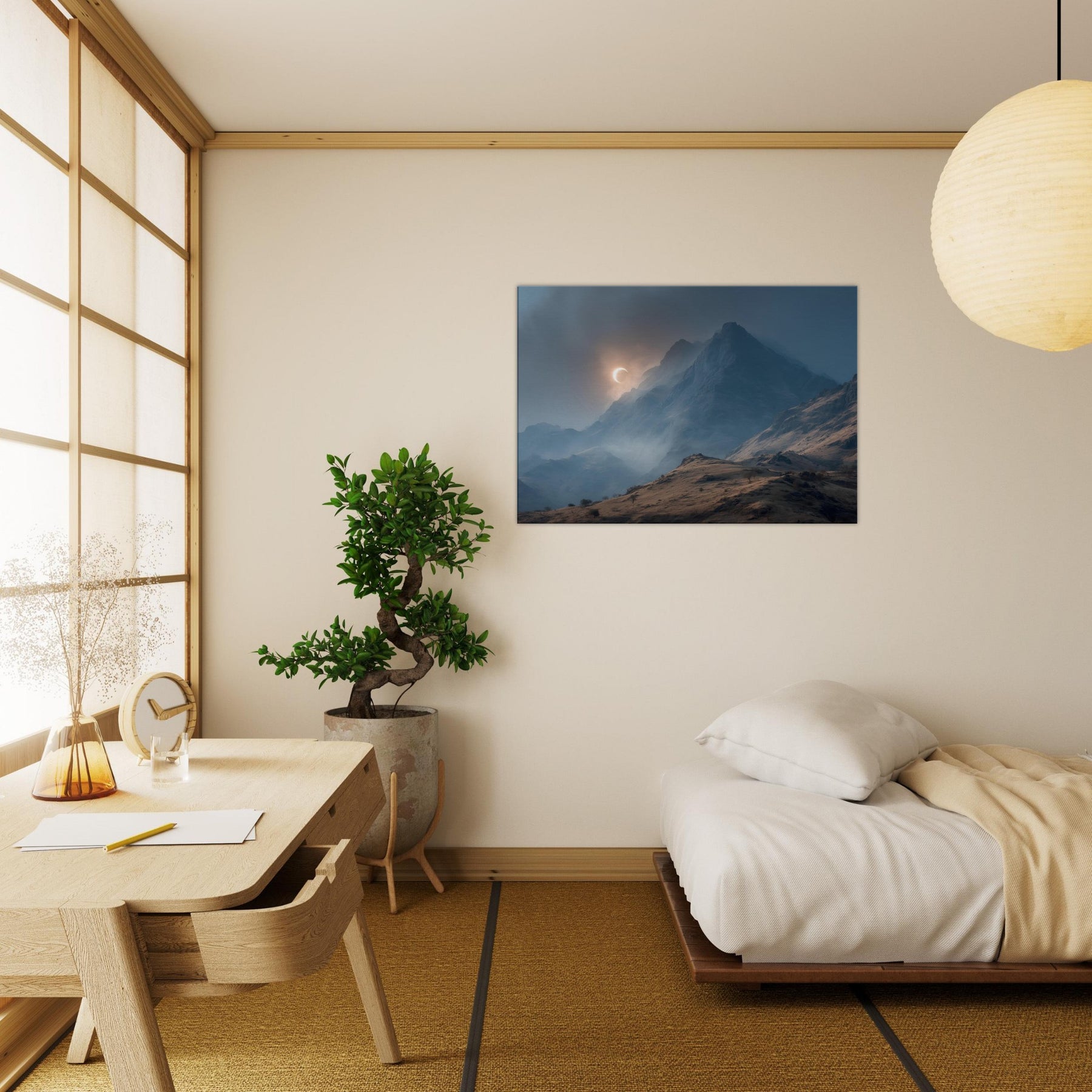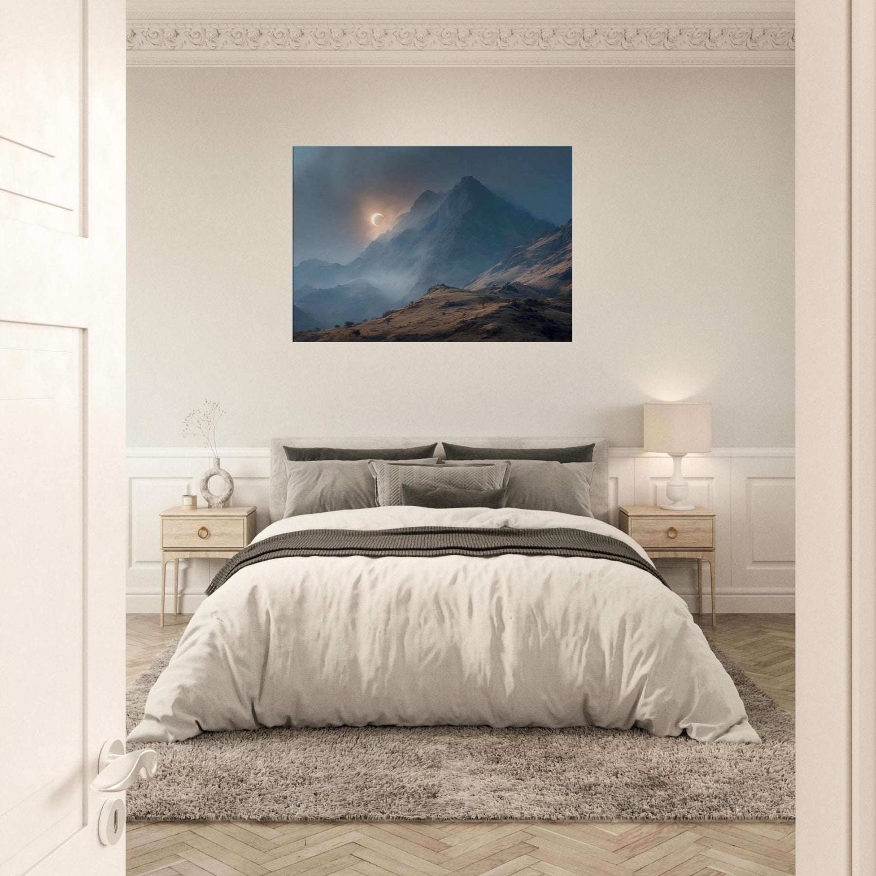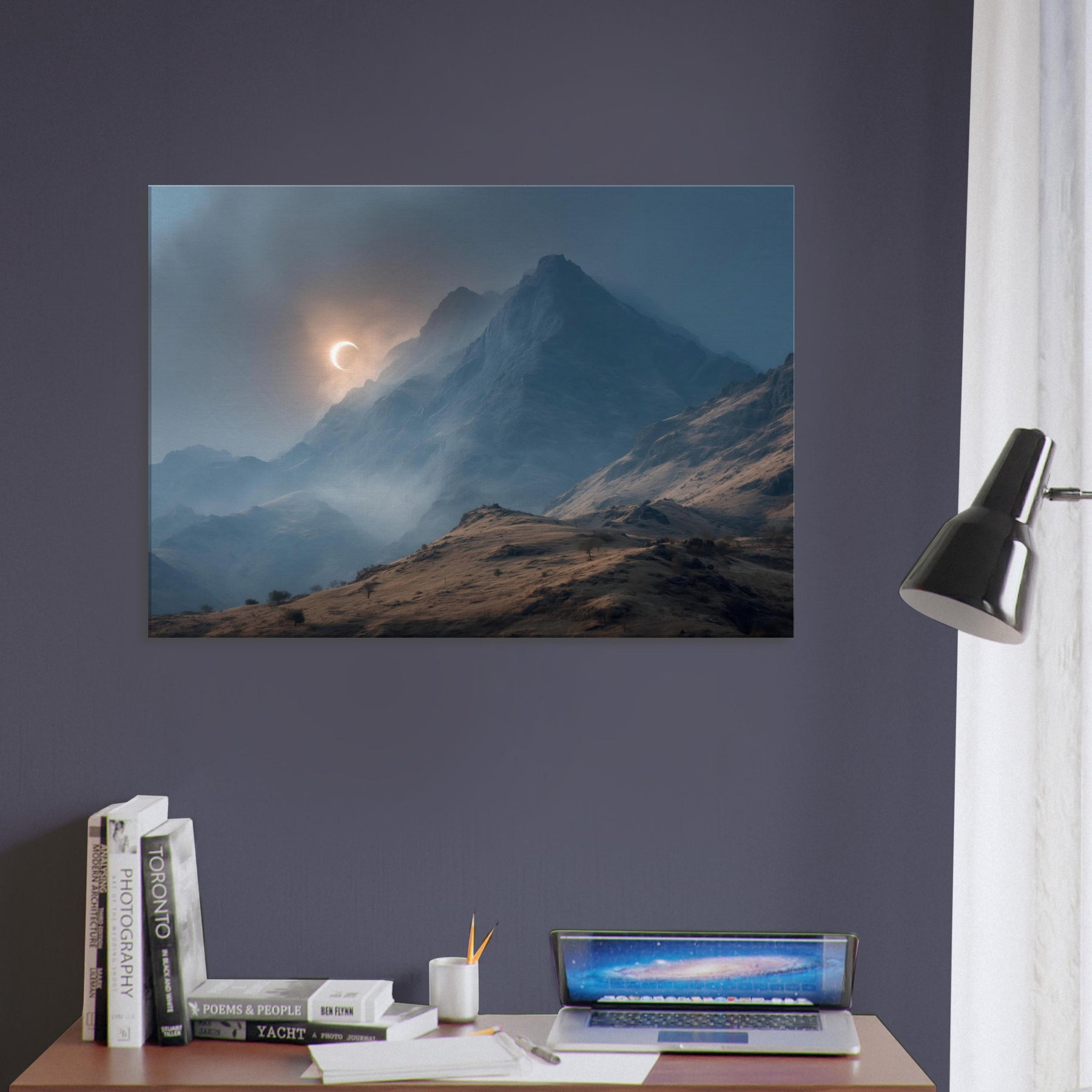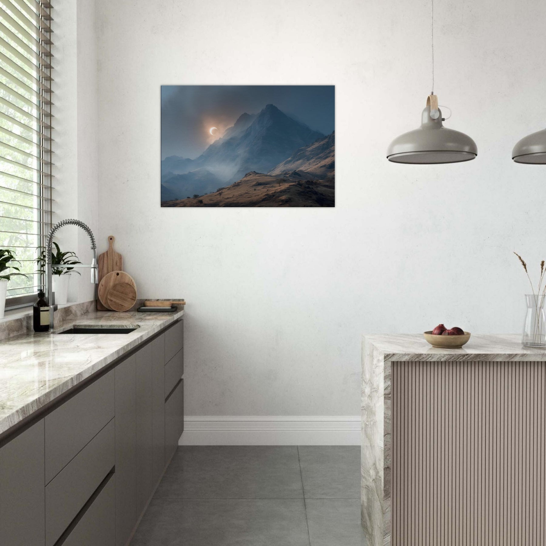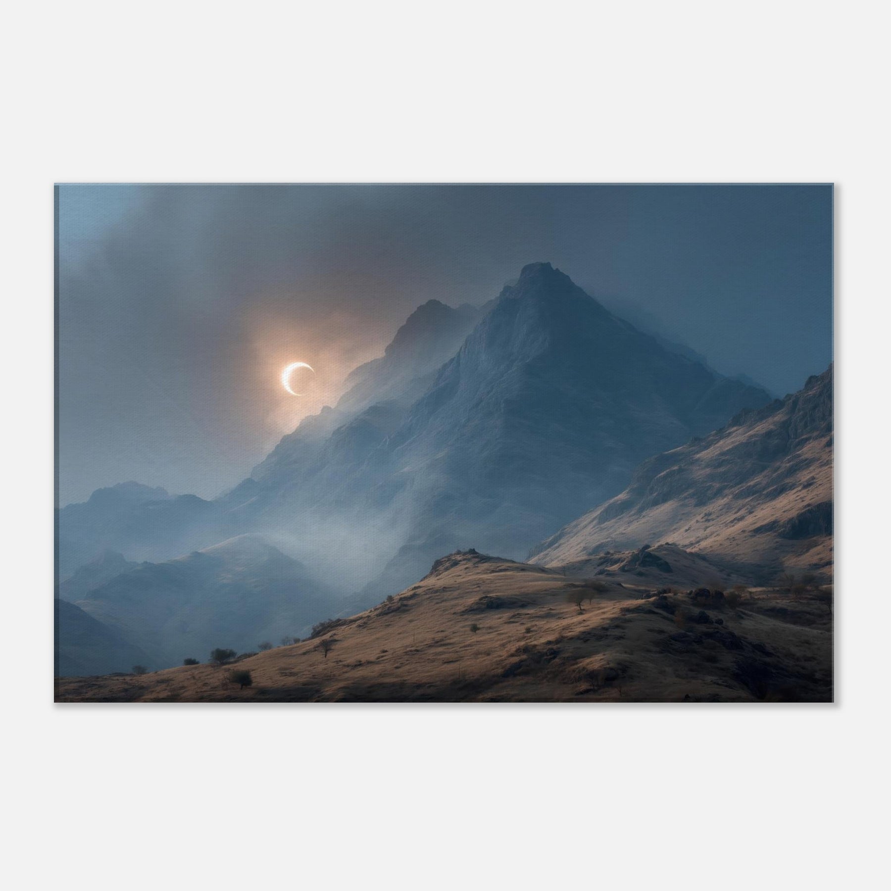 Moon over Mountains drifts across a glacial quiet, a lunar arc skimming jagged peaks as mist threads through the valley. In this minimal, surreal vision, darkness and light converse in a hushed palette of blues and copper; it invites a moment of breath and wonder. Hang it in a living room or study to slow the day, encouraging thoughtful evenings and soft conversations. The artwork becomes a doorway to quiet landscapes, turning walls into a sanctuary of calm and mystery. The central subject is Moon over Mountains (Minimal).