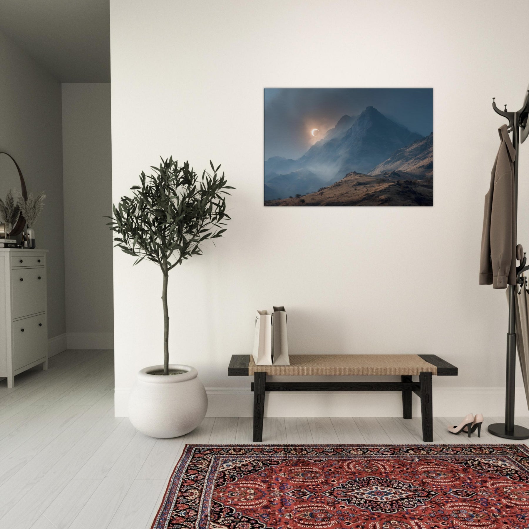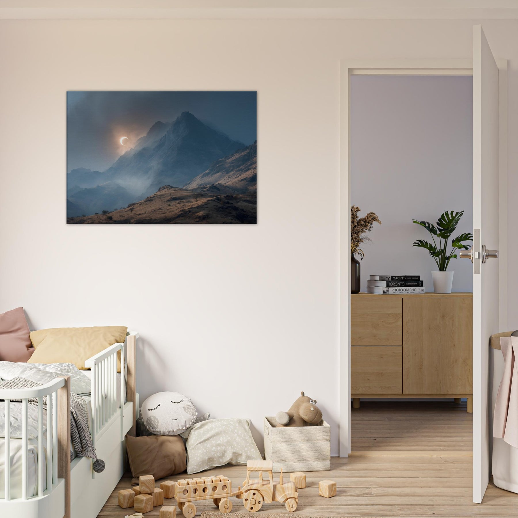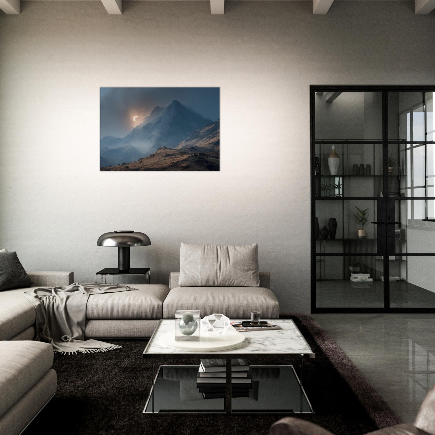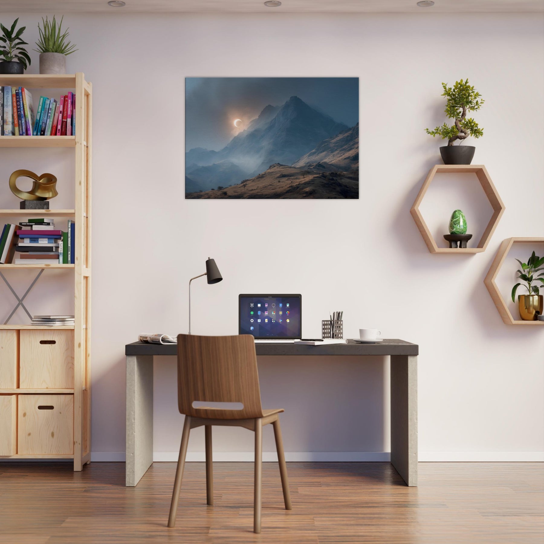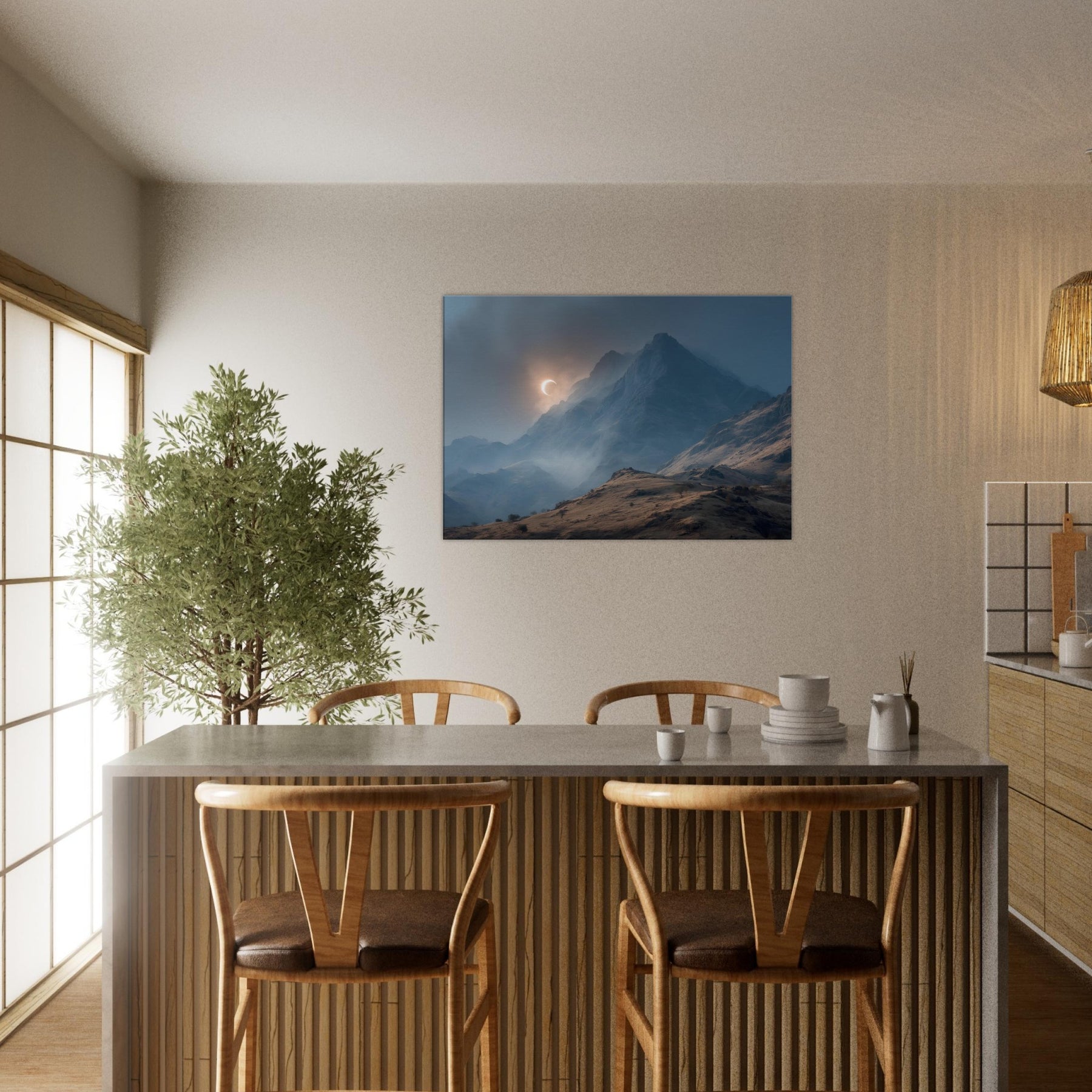 Moon over Mountains drifts across a glacial quiet, a lunar arc skimming jagged peaks as mist threads through the valley. In this minimal, surreal vision, darkness and light converse in a hushed palette of blues and copper; it invites a moment of breath and wonder. Hang it in a living room or study to slow the day, encouraging thoughtful evenings and soft conversations. The artwork becomes a doorway to quiet landscapes, turning walls into a sanctuary of calm and mystery. The central subject is Moon over Mountains (Minimal).