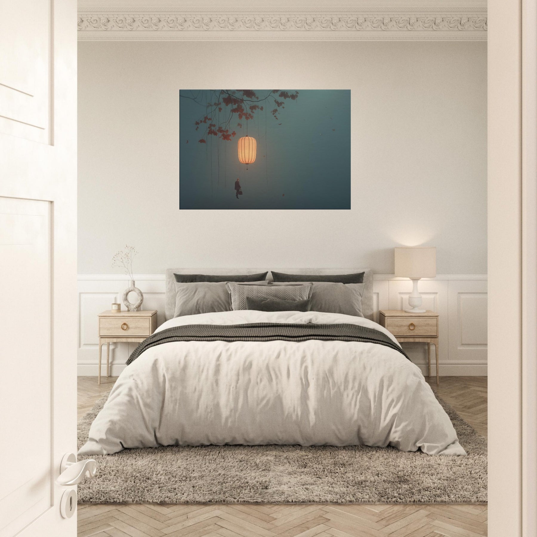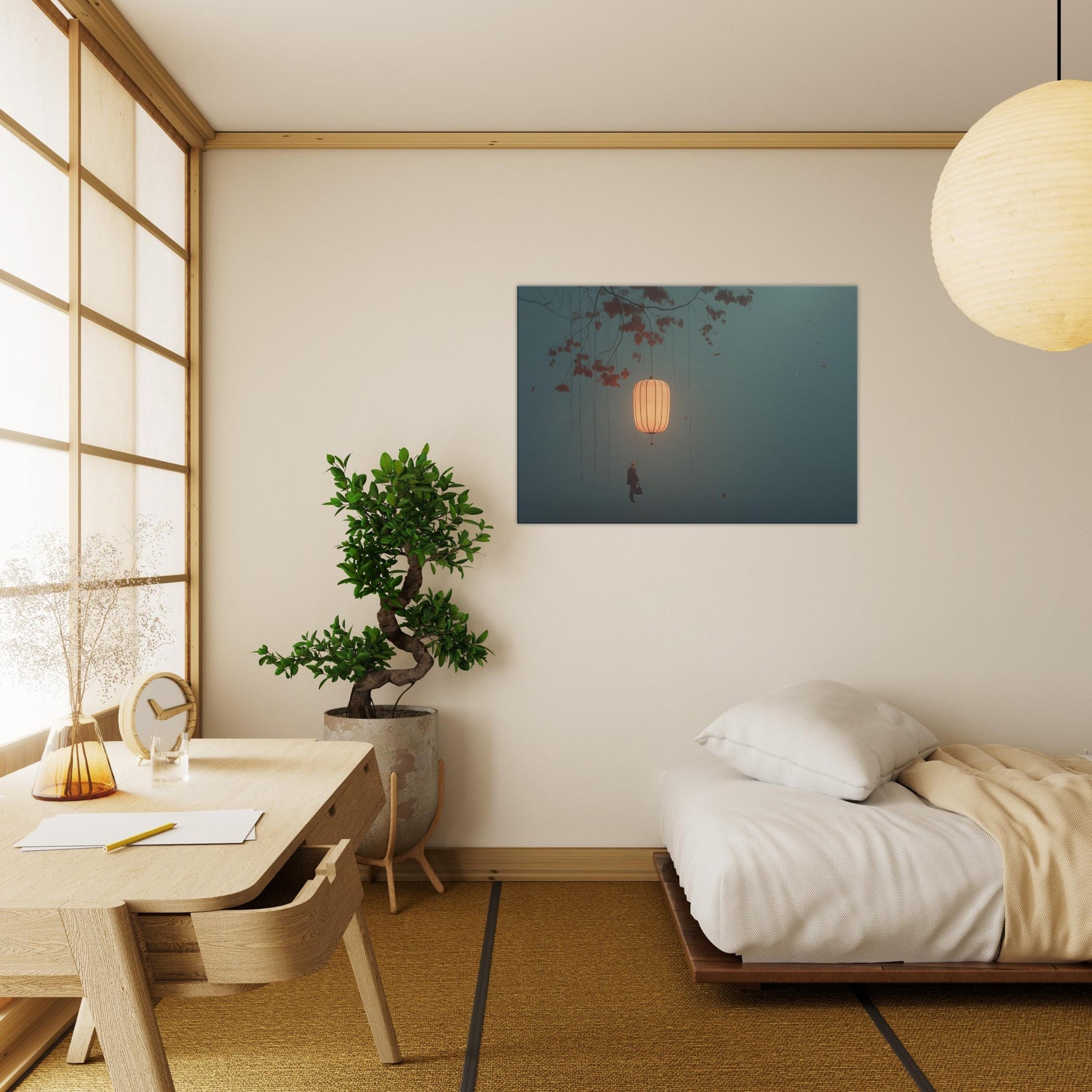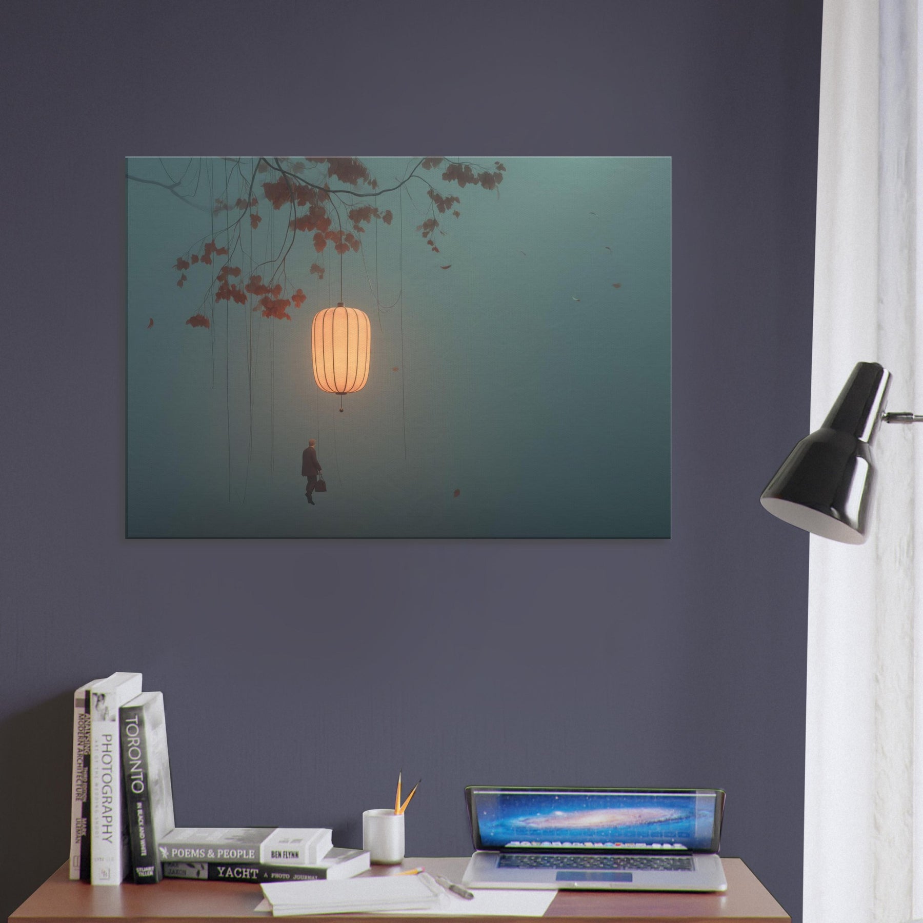 Suspended between dream and city light, this scene renders a solitary Paper Lantern as a gentle beacon inside a misty room. A diminutive figure hovers below, a silhouette of intention carrying a briefcase a quiet meeting with memory. The lantern's warm glow carves soft edges in the otherwise cool air, turning space into a hush of possibilities. In a Surrealist, spellbound way, the ordinary becomes emblematic, inviting reflection and calm; the piece enhances living spaces with a meditative glow and a hint of urban fairytale.