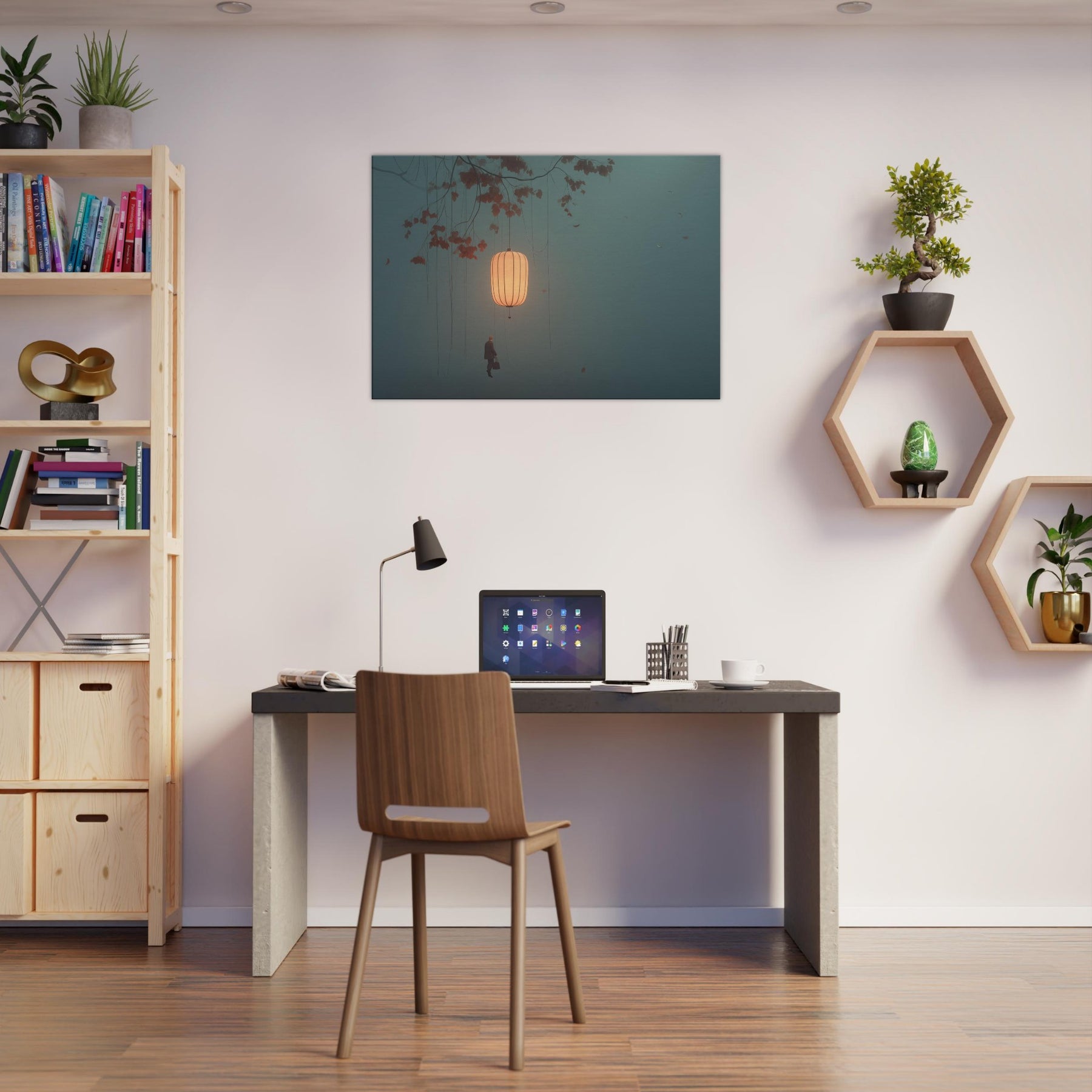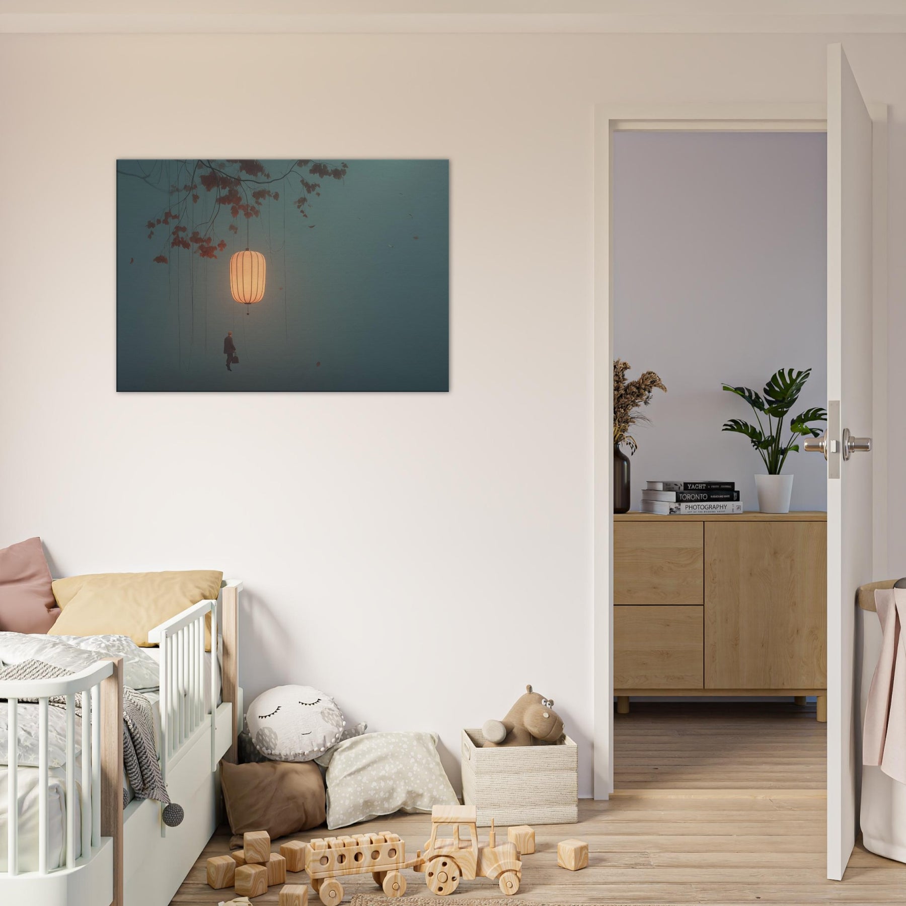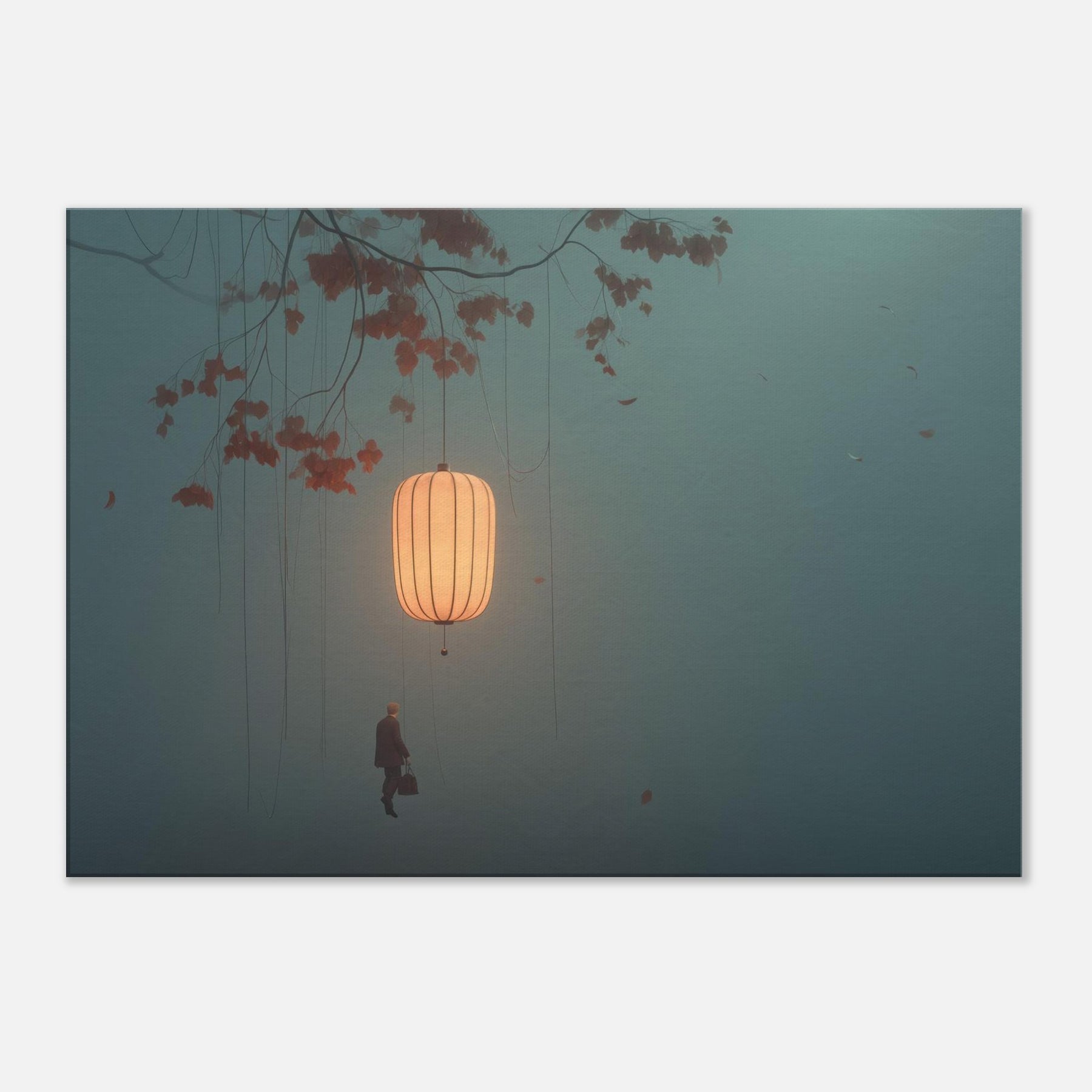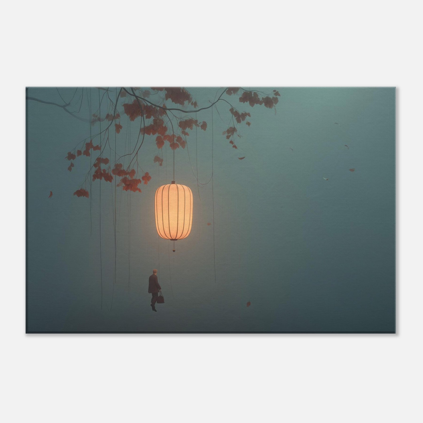 Suspended between dream and city light, this scene renders a solitary Paper Lantern as a gentle beacon inside a misty room. A diminutive figure hovers below, a silhouette of intention carrying a briefcase a quiet meeting with memory. The lantern's warm glow carves soft edges in the otherwise cool air, turning space into a hush of possibilities. In a Surrealist, spellbound way, the ordinary becomes emblematic, inviting reflection and calm; the piece enhances living spaces with a meditative glow and a hint of urban fairytale.