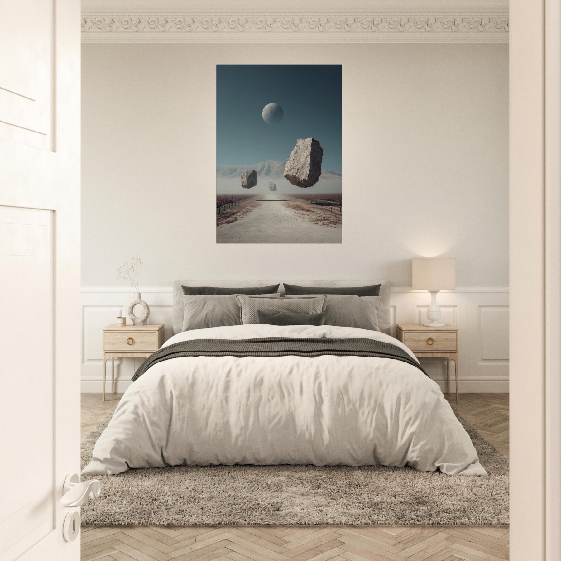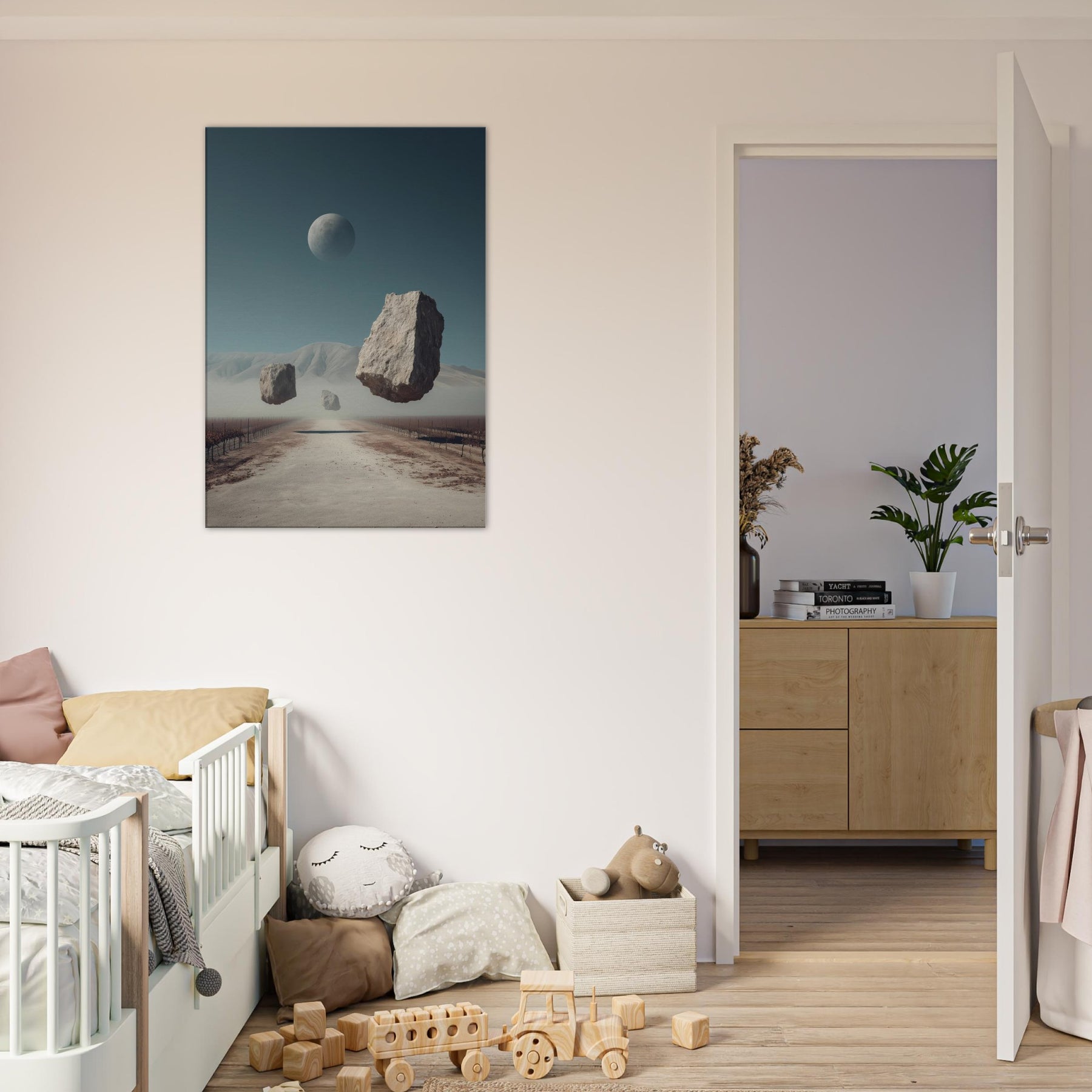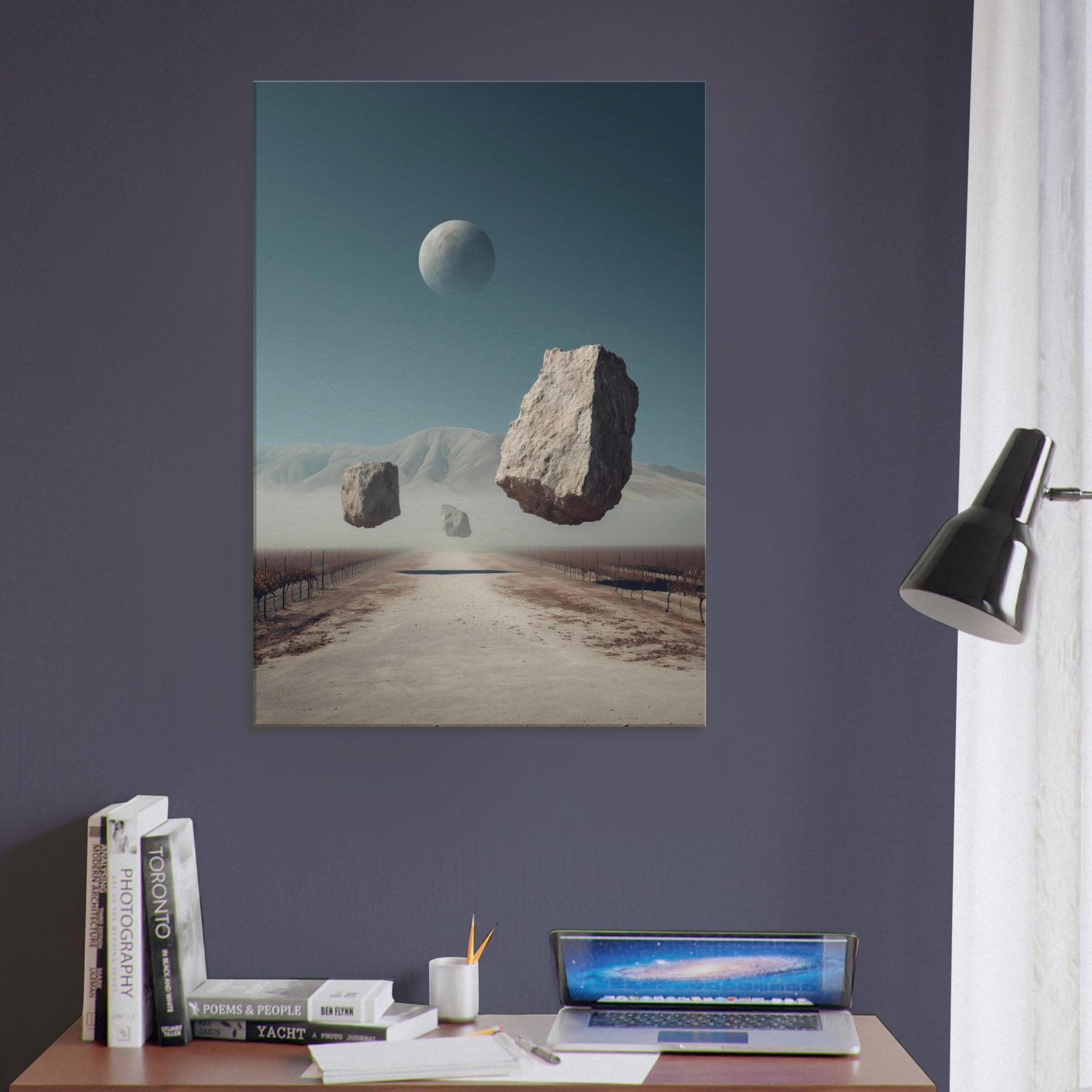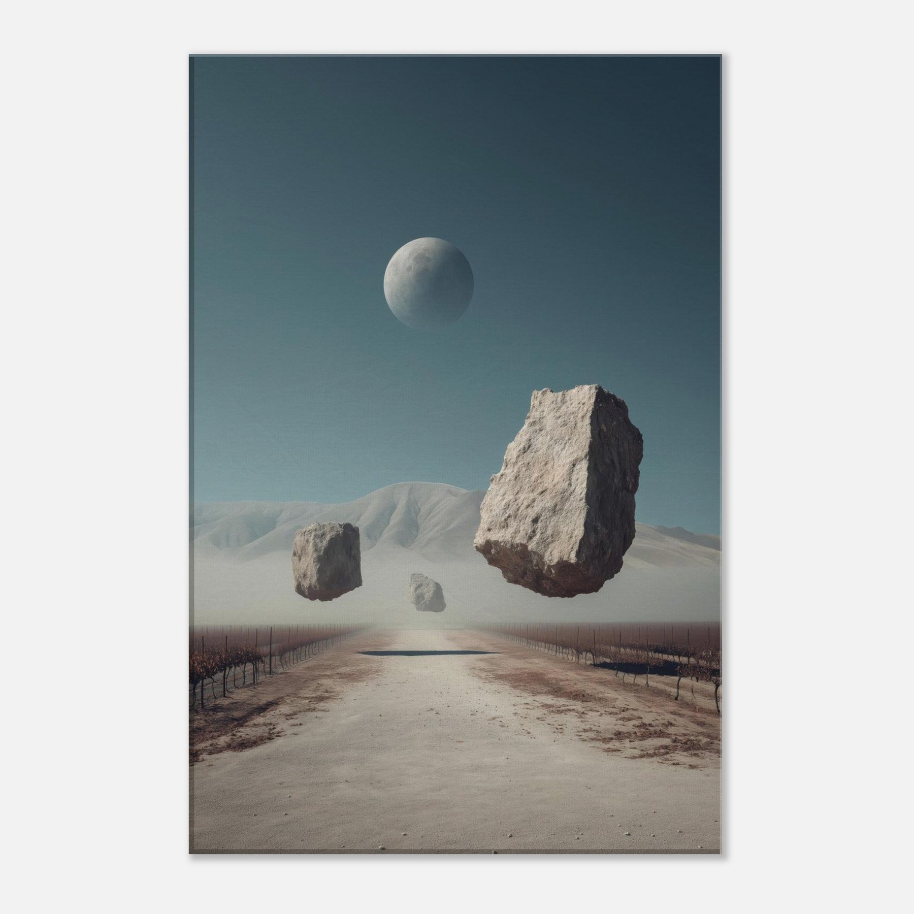 Within a dream tinged , the Vineyard reveals itself as a quiet cosmos: levitating boulders hover above a pale road, a distant vineyard row recedes into fog, and a cool moon sinks into a velvet sky. The scene bathes a room in ethereal light, inviting stillness, curiosity, and spaciousness. This surreal composition turns everyday space into a portal of wonder, perfect for a living room or study where conversation drifts like wind between rock and vine.